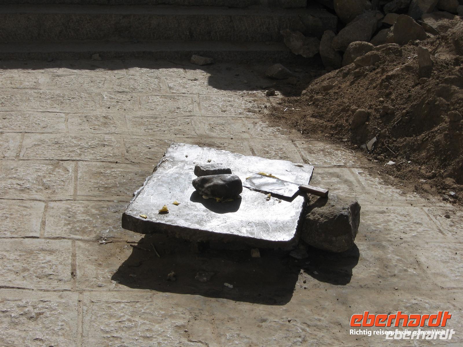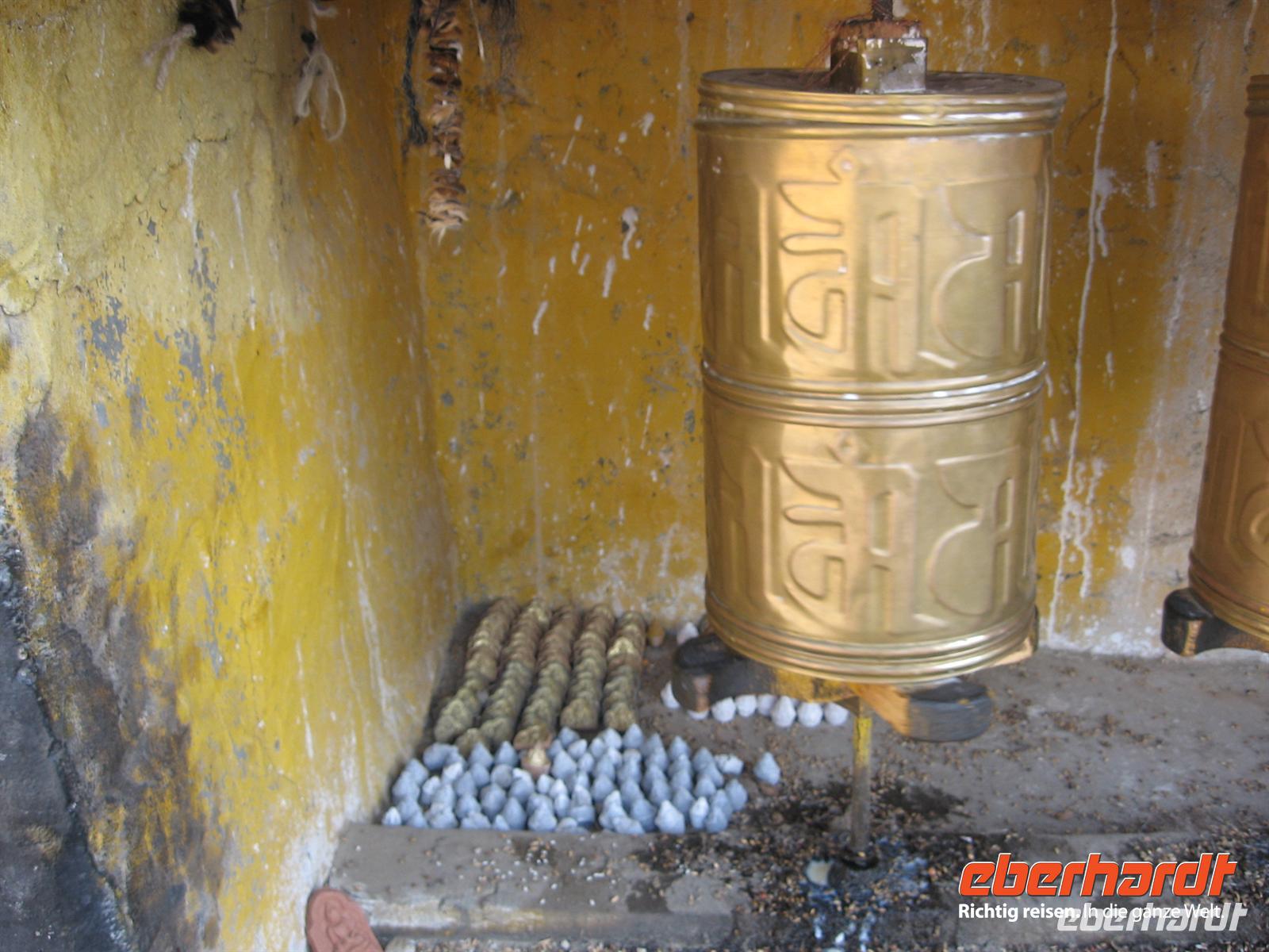Vom Drepung-Kloster ist es nur ein kurzer Weg zum im 14. Jahrhundert gegründeten Nechung-Kloster. Hier ist seit dem 17. Jahrhundert der Sitz des Tibetischen Staatsorakels. Das Orakelwesen stammt aus der Volksreligion und wird vom Buddhismus geduldet. Im Innenhof gibt es drei Große Brennstellen für Räucherstäbchen. Gleich daneben sitzen drei Frauen und putzen Behälter für Butterlämpchen. Butterlampen befinden sich in jeden Kloster eine ganze Menge. Die Gläubigen füllen diese immer wieder mit Butter auf, entweder in geschmolzener Form oder in Stücken. Diese Butter ist allerdings nicht mit unserer Butter zu Hause zu vergleichen. Es handelt sich um Jakbutter und diese ist in ihrer Verpackung steinhart.