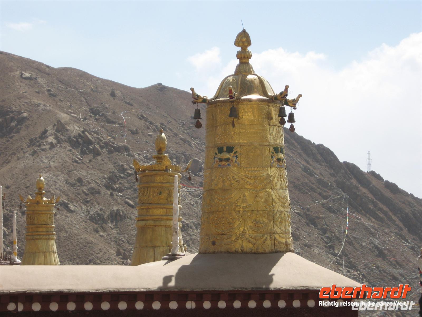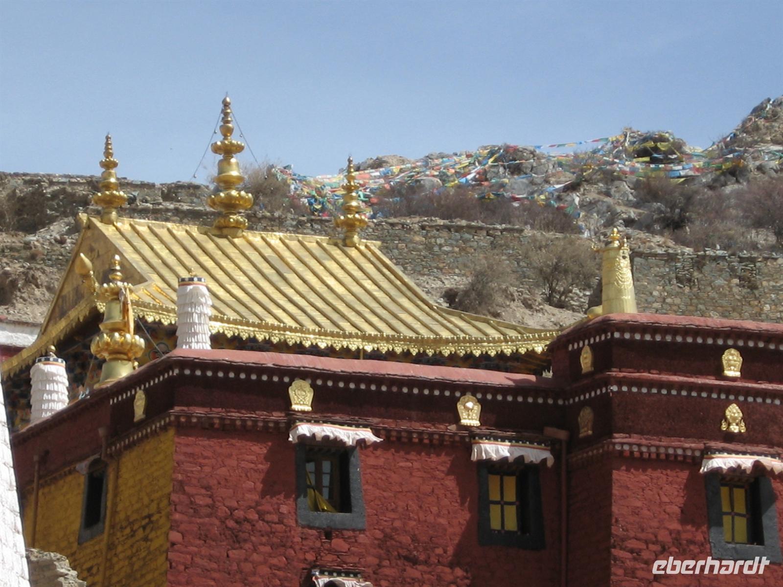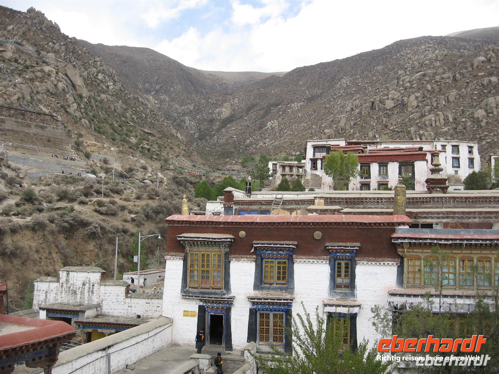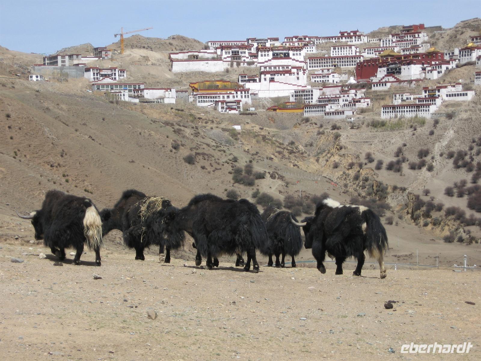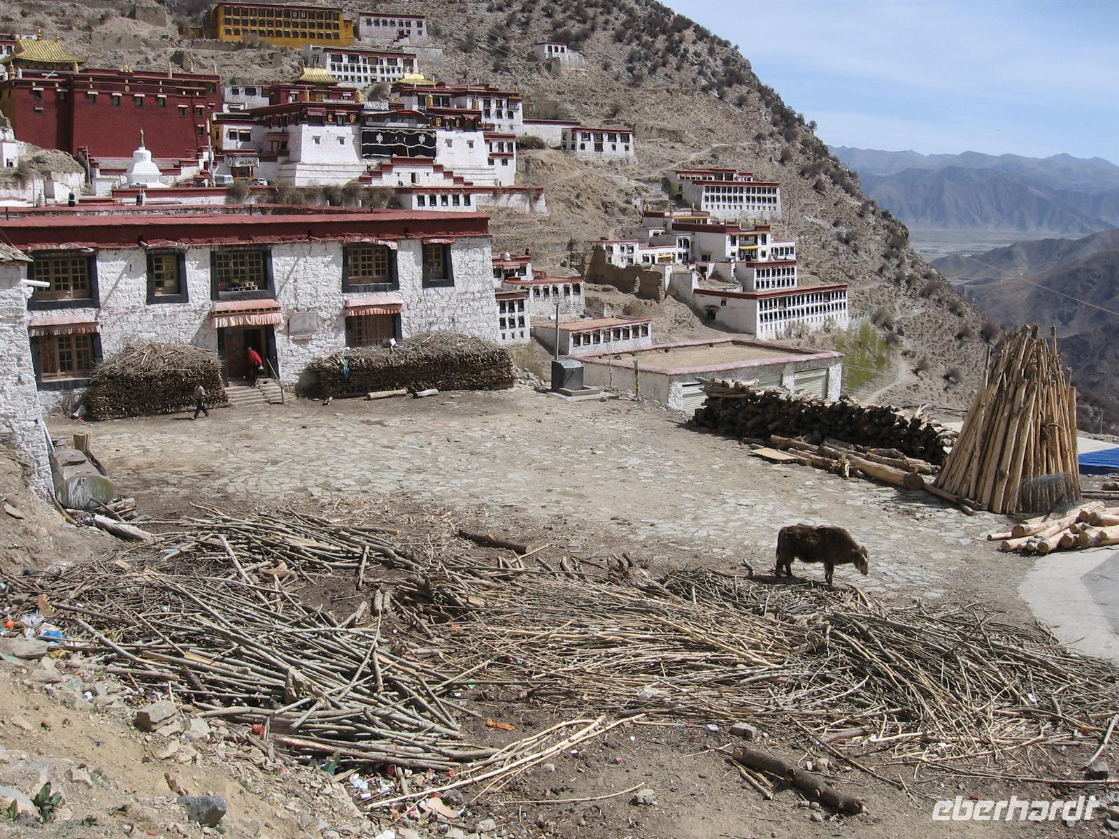 Die Auffahrt zum Kloster erfolgt über eine gut ausgebaute Serpentinenstraße, welche einen tollen Blick in die tibetische Tiefebene erlaubt. Umrahmt von Bergen, die zwischen 4.000 und 5.000 Metern hoch sind, genießen wir bei strahlendem Sonnenschein den Ausblick. Bei einem Fotostopp haben wir endlich auch Gelegenheit Jak's aus der Nähe zu betrachten. Diese Tiere gelten den Tibetern als heilig und sind in der Viehhaltung weit verbreitet. Sie dienen auch als Nahrung und aus ihrer Milch wird Jakbutter hergestellt. Mit dieser werden die zahlreichen Butterlämpchen in den Klöstern betrieben. Über uns am Berghang liegt auch schon das 1416 gegründete Ganden-Kloster. Außer dem Hauptgebäude handelt es sich heute um neu gebaute Gebäude. Das Kloster zeigt deutlich seine Wunden, welche ihm in der Kulturrevolution beigebracht wurden. Einstmals gab es hier 10.000 Mönche, heute sind es noch 600. Es befinden sich auch fast keine alten Kunstschätze mehr hier. Wir besichtigen neben verschiedenen Kapellen auch die Privaträume und das Sterbezimmer des Klostergründers Tsongkhapas. Zum Ende der Besichtigung beobachten wir die Mönche in der Versammlungshalle bei einer Zeremonie für die Erdbebenopfer im Süden der Provinz Qinghai.