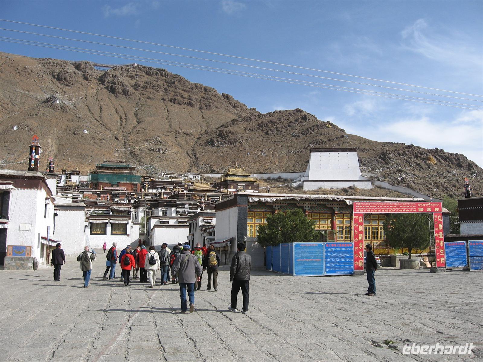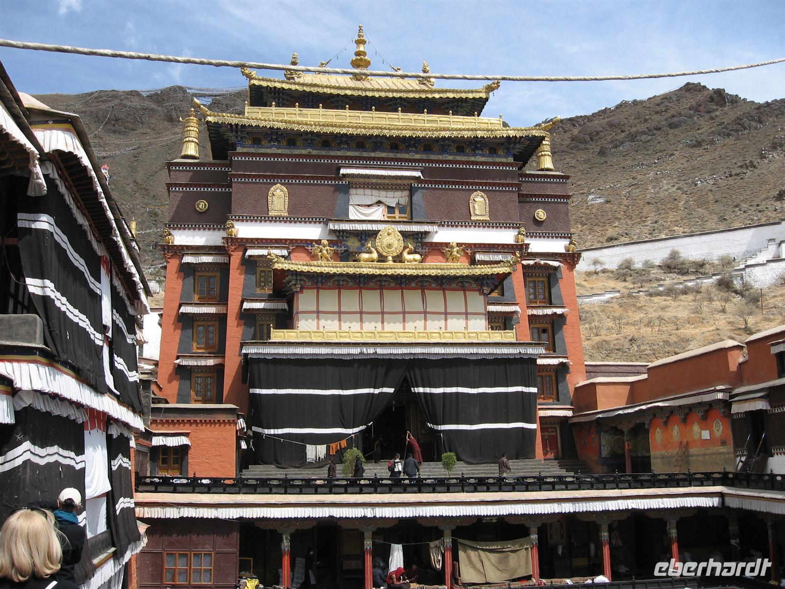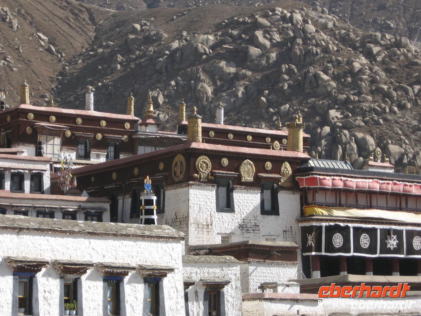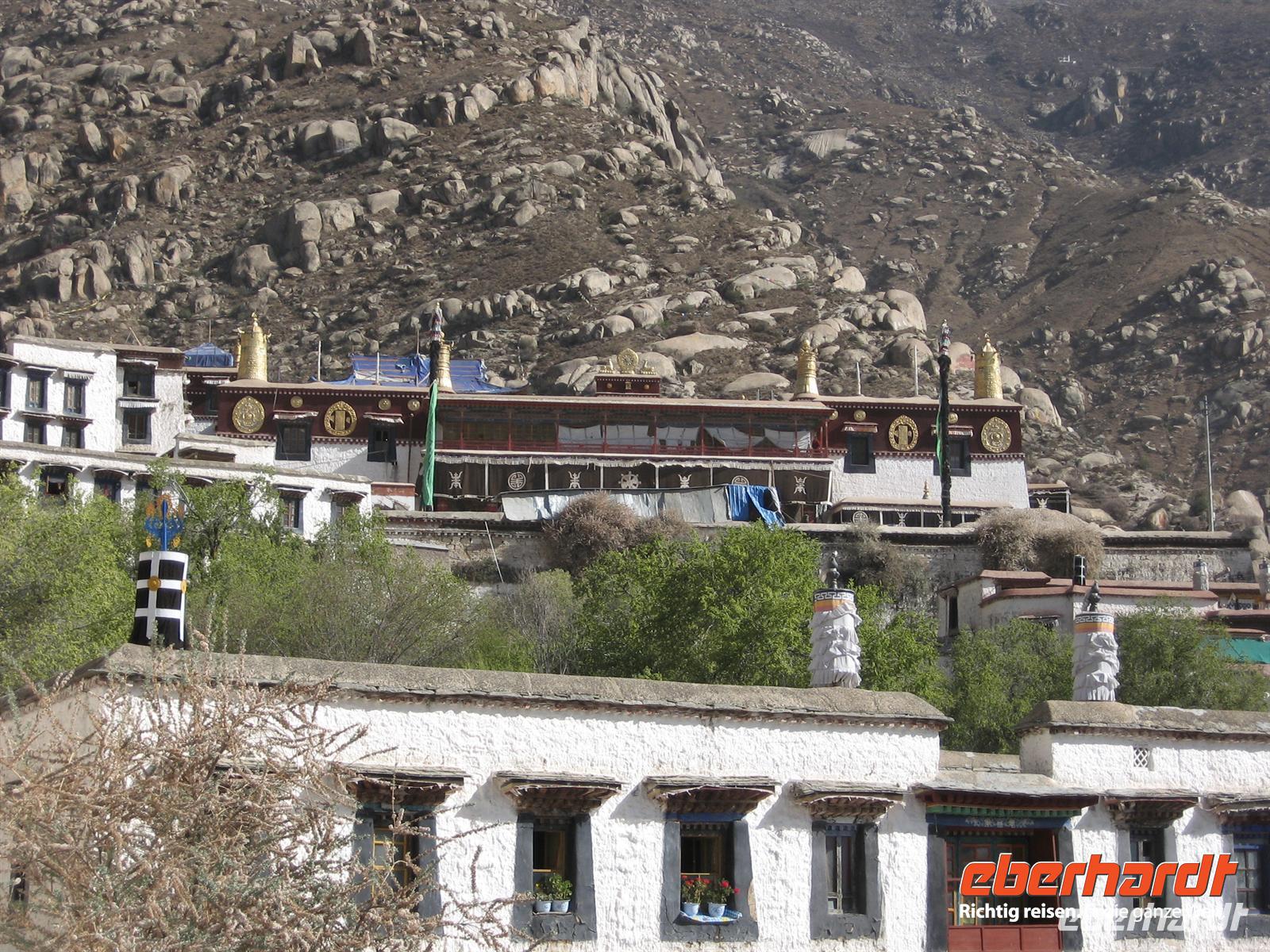 Die Auffahrt zum Kloster erfolgt über eine gut ausgebaute Serpentinenstraße, welche einen tollen Blick in die tibetische Tiefebene erlaubt. Umrahmt von Bergen, die zwischen 4.000 und 5.000 Metern hoch sind, genießen wir bei strahlendem Sonnenschein den Ausblick. Bei einem Fotostopp haben wir endlich auch Gelegenheit Jak's aus der Nähe zu betrachten. Diese Tiere gelten den Tibetern als heilig und sind in der Viehhaltung weit verbreitet. Sie dienen auch als Nahrung und aus ihrer Milch wird Jakbutter hergestellt. Mit dieser werden die zahlreichen Butterlämpchen in den Klöstern betrieben. Über uns am Berghang liegt auch schon das 1416 gegründete Ganden-Kloster. Außer dem Hauptgebäude handelt es sich heute um neu gebaute Gebäude. Das Kloster zeigt deutlich seine Wunden, welche ihm in der Kulturrevolution beigebracht wurden. Einstmals gab es hier 10.000 Mönche, heute sind es noch 600. Es befinden sich auch fast keine alten Kunstschätze mehr hier. Wir besichtigen neben verschiedenen Kapellen auch die Privaträume und das Sterbezimmer des Klostergründers Tsongkhapas. Zum Ende der Besichtigung beobachten wir die Mönche in der Versammlungshalle bei einer Zeremonie für die Erdbebenopfer im Süden der Provinz Qinghai.