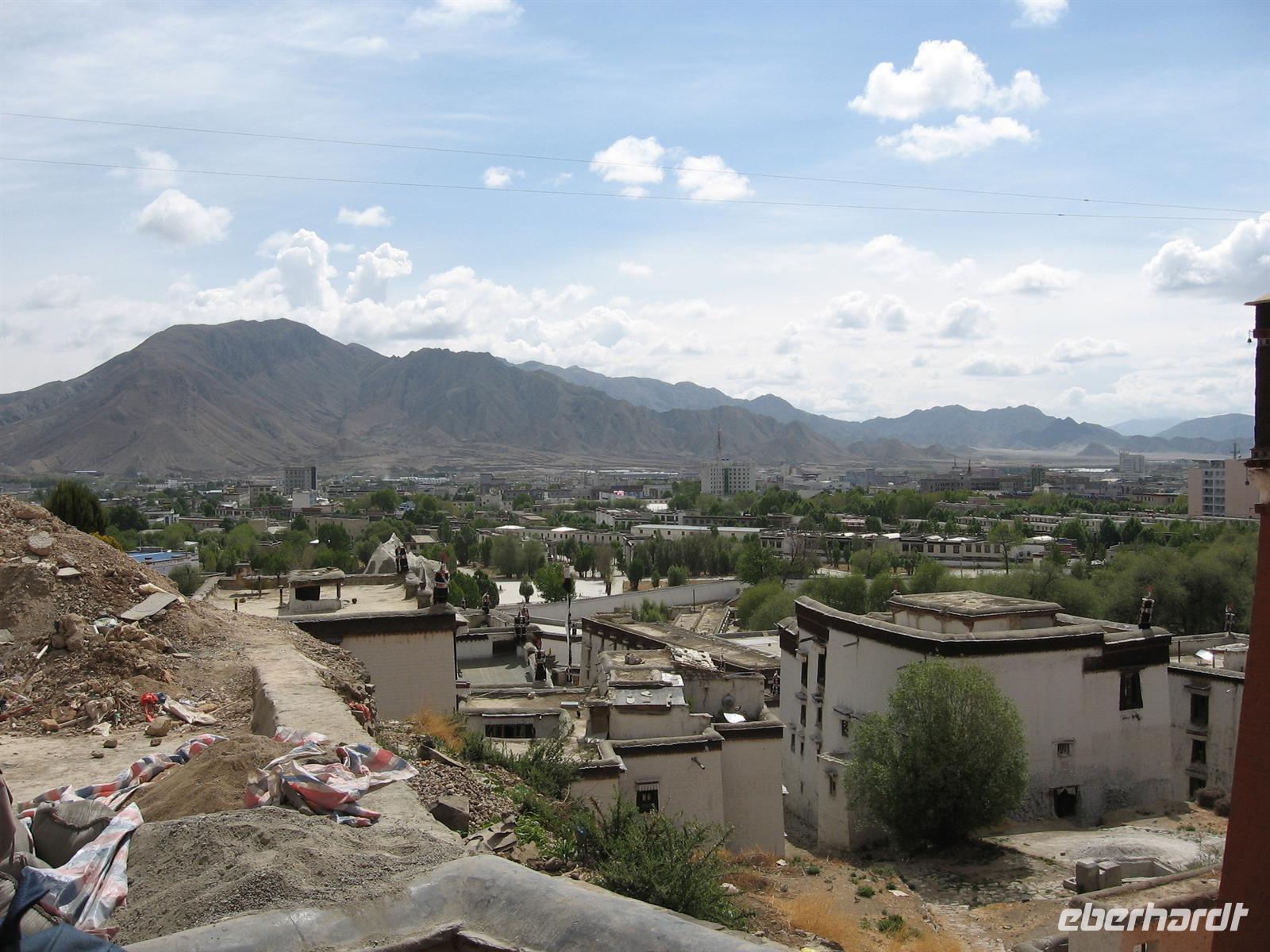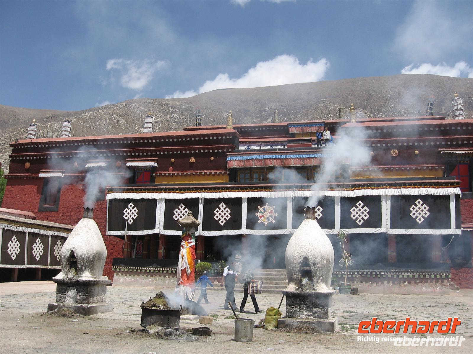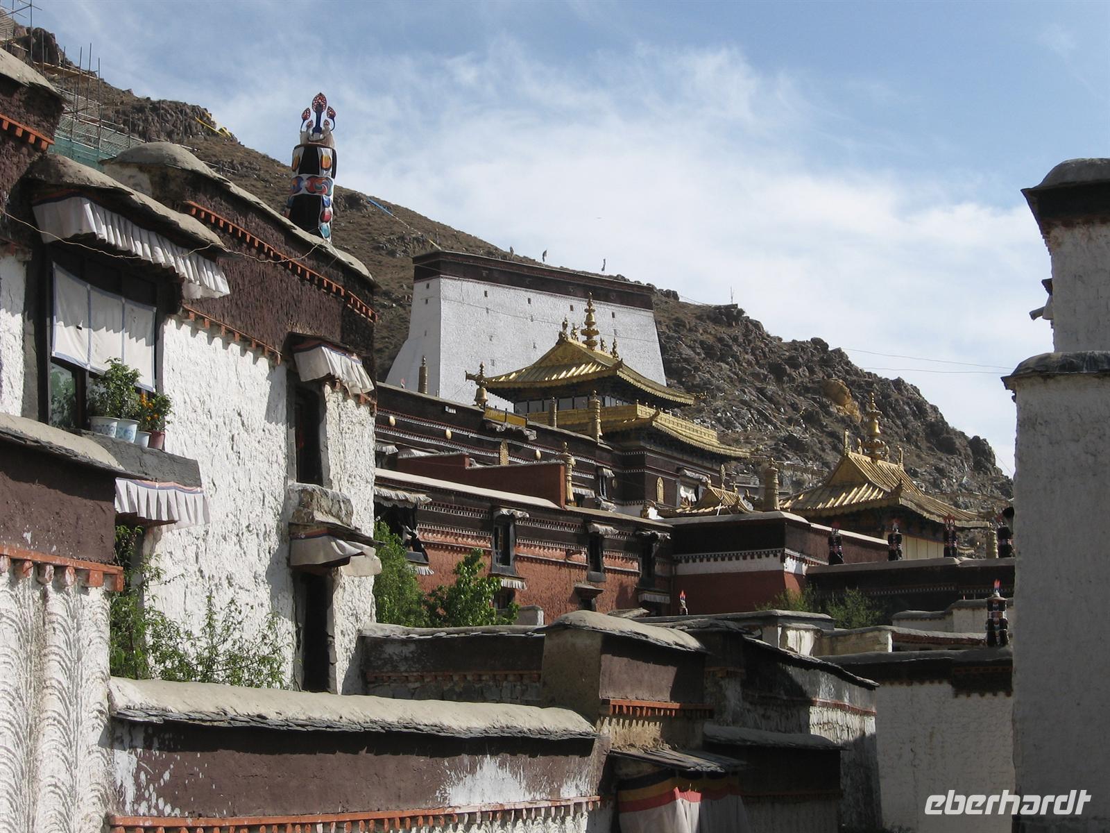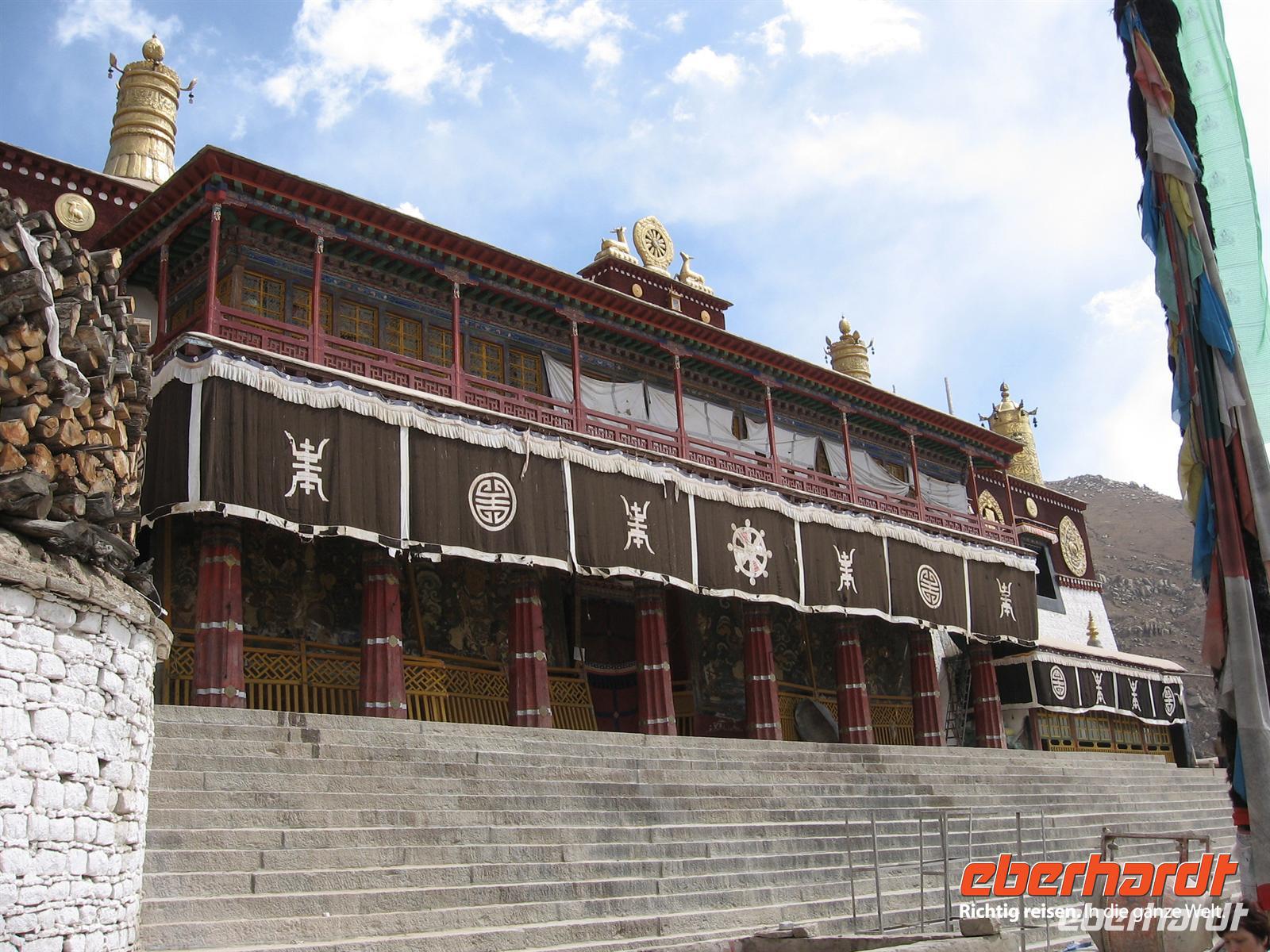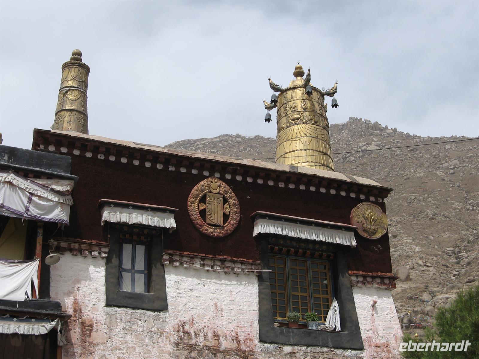 Die Auffahrt zum Kloster erfolgt über eine gut ausgebaute Serpentinenstraße, welche einen tollen Blick in die tibetische Tiefebene erlaubt. Umrahmt von Bergen, die zwischen 4.000 und 5.000 Metern hoch sind, genießen wir bei strahlendem Sonnenschein den Ausblick. Bei einem Fotostopp haben wir endlich auch Gelegenheit Jak's aus der Nähe zu betrachten. Diese Tiere gelten den Tibetern als heilig und sind in der Viehhaltung weit verbreitet. Sie dienen auch als Nahrung und aus ihrer Milch wird Jakbutter hergestellt. Mit dieser werden die zahlreichen Butterlämpchen in den Klöstern betrieben. Über uns am Berghang liegt auch schon das 1416 gegründete Ganden-Kloster. Außer dem Hauptgebäude handelt es sich heute um neu gebaute Gebäude. Das Kloster zeigt deutlich seine Wunden, welche ihm in der Kulturrevolution beigebracht wurden. Einstmals gab es hier 10.000 Mönche, heute sind es noch 600. Es befinden sich auch fast keine alten Kunstschätze mehr hier. Wir besichtigen neben verschiedenen Kapellen auch die Privaträume und das Sterbezimmer des Klostergründers Tsongkhapas. Zum Ende der Besichtigung beobachten wir die Mönche in der Versammlungshalle bei einer Zeremonie für die Erdbebenopfer im Süden der Provinz Qinghai.