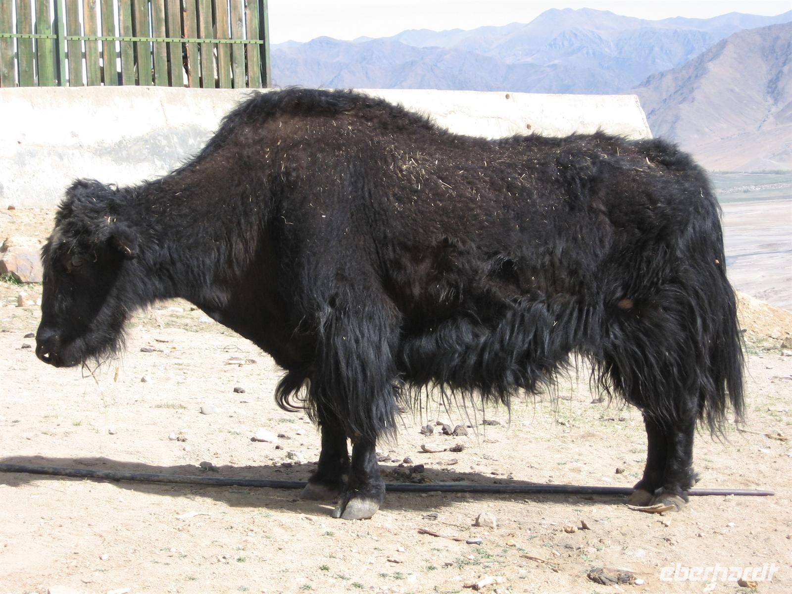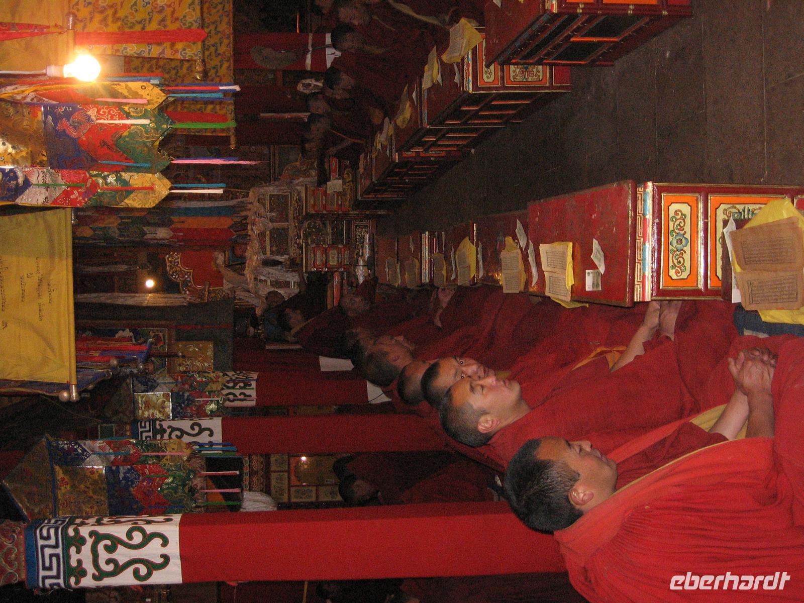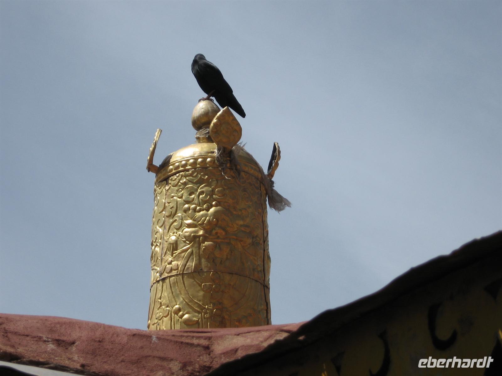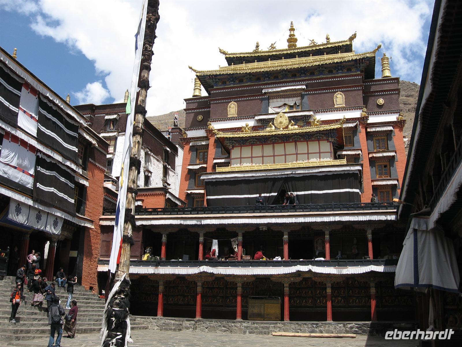 Die Auffahrt zum Kloster erfolgt über eine gut ausgebaute Serpentinenstraße, welche einen tollen Blick in die tibetische Tiefebene erlaubt. Umrahmt von Bergen, die zwischen 4.000 und 5.000 Metern hoch sind, genießen wir bei strahlendem Sonnenschein den Ausblick. Bei einem Fotostopp haben wir endlich auch Gelegenheit Jak's aus der Nähe zu betrachten. Diese Tiere gelten den Tibetern als heilig und sind in der Viehhaltung weit verbreitet. Sie dienen auch als Nahrung und aus ihrer Milch wird Jakbutter hergestellt. Mit dieser werden die zahlreichen Butterlämpchen in den Klöstern betrieben. Über uns am Berghang liegt auch schon das 1416 gegründete Ganden-Kloster. Außer dem Hauptgebäude handelt es sich heute um neu gebaute Gebäude. Das Kloster zeigt deutlich seine Wunden, welche ihm in der Kulturrevolution beigebracht wurden. Einstmals gab es hier 10.000 Mönche, heute sind es noch 600. Es befinden sich auch fast keine alten Kunstschätze mehr hier. Wir besichtigen neben verschiedenen Kapellen auch die Privaträume und das Sterbezimmer des Klostergründers Tsongkhapas. Zum Ende der Besichtigung beobachten wir die Mönche in der Versammlungshalle bei einer Zeremonie für die Erdbebenopfer im Süden der Provinz Qinghai.