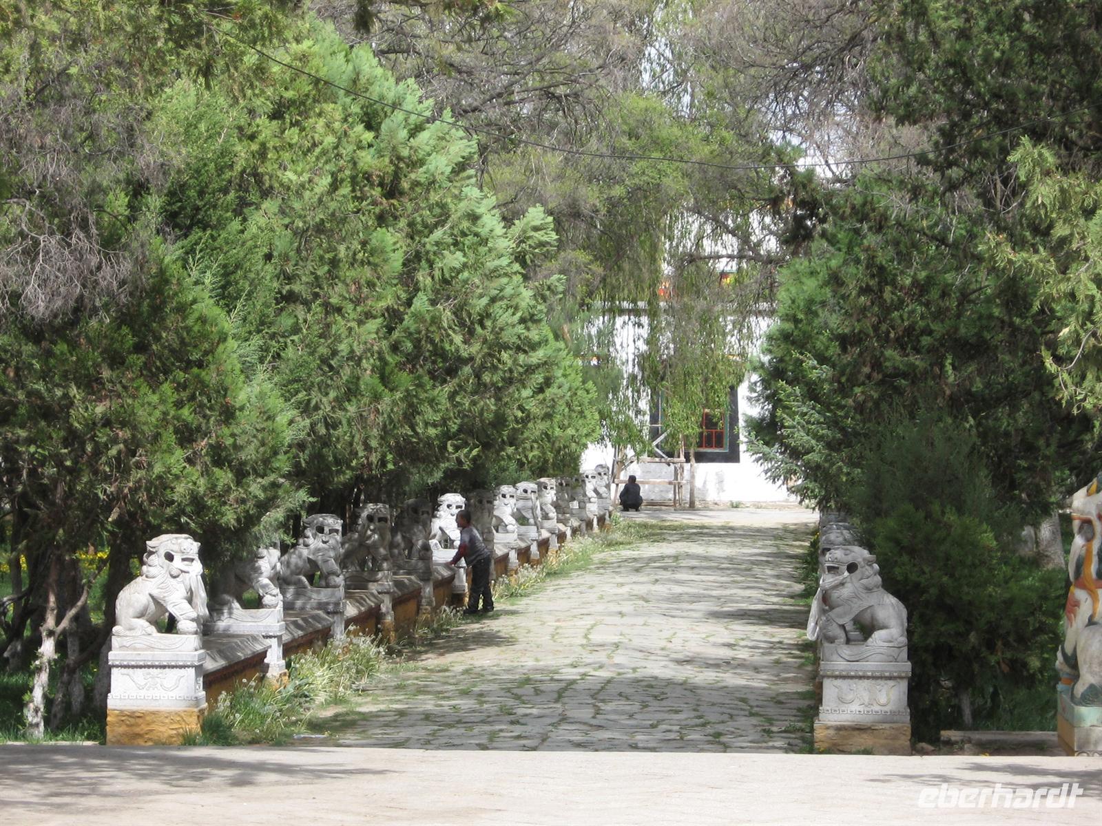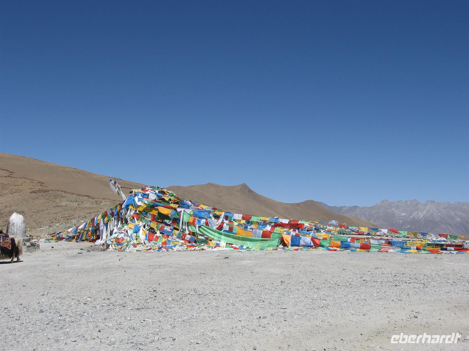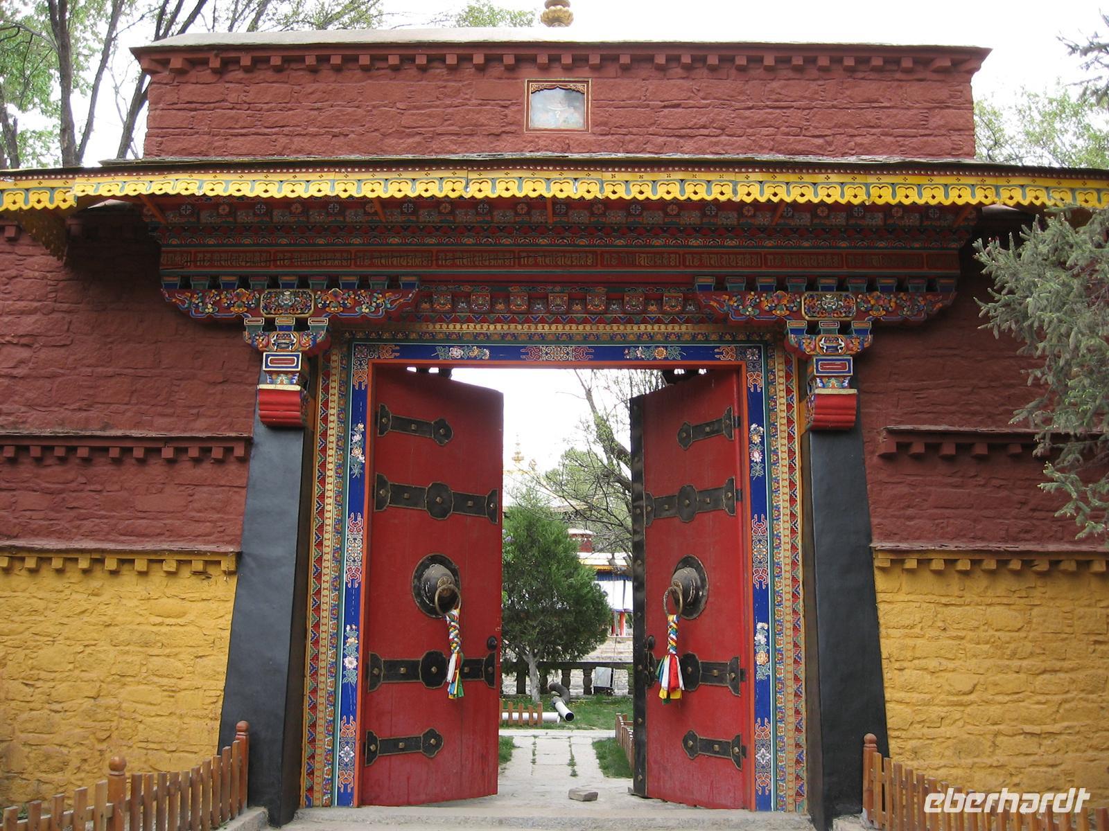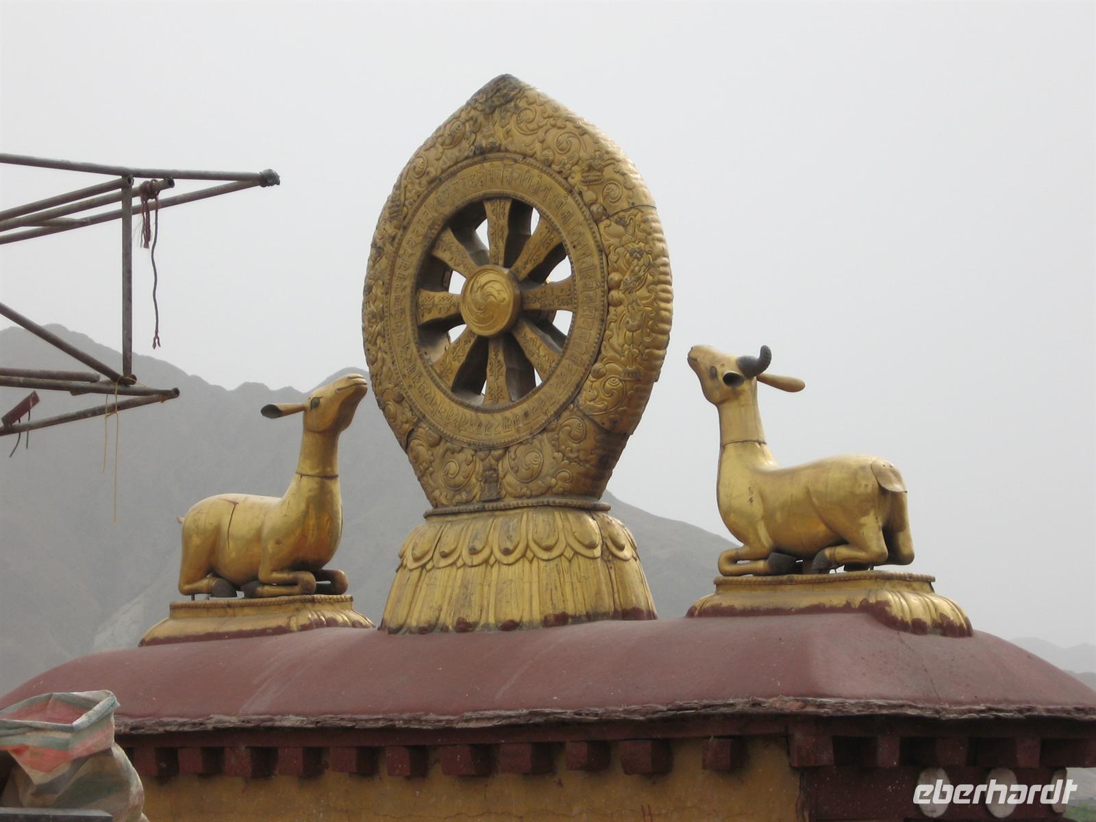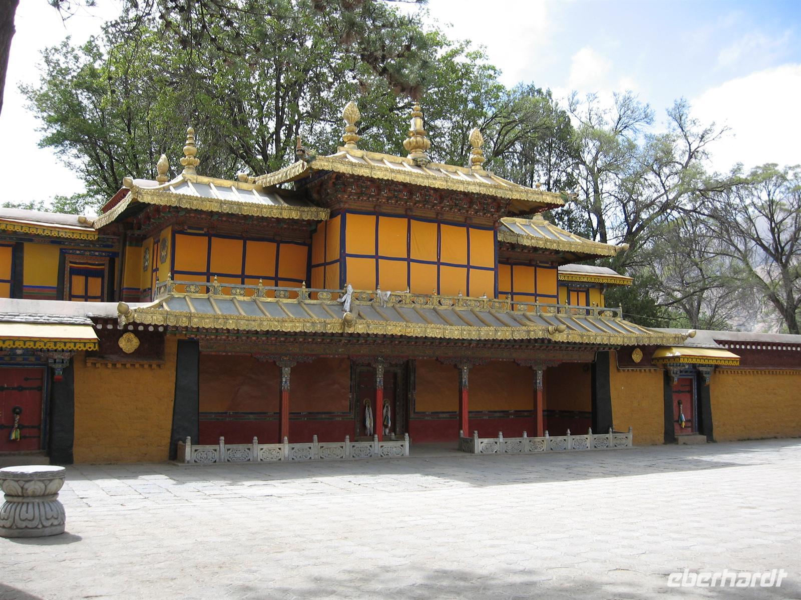 Die Auffahrt zum Kloster erfolgt über eine gut ausgebaute Serpentinenstraße, welche einen tollen Blick in die tibetische Tiefebene erlaubt. Umrahmt von Bergen, die zwischen 4.000 und 5.000 Metern hoch sind, genießen wir bei strahlendem Sonnenschein den Ausblick. Bei einem Fotostopp haben wir endlich auch Gelegenheit Jak's aus der Nähe zu betrachten. Diese Tiere gelten den Tibetern als heilig und sind in der Viehhaltung weit verbreitet. Sie dienen auch als Nahrung und aus ihrer Milch wird Jakbutter hergestellt. Mit dieser werden die zahlreichen Butterlämpchen in den Klöstern betrieben. Über uns am Berghang liegt auch schon das 1416 gegründete Ganden-Kloster. Außer dem Hauptgebäude handelt es sich heute um neu gebaute Gebäude. Das Kloster zeigt deutlich seine Wunden, welche ihm in der Kulturrevolution beigebracht wurden. Einstmals gab es hier 10.000 Mönche, heute sind es noch 600. Es befinden sich auch fast keine alten Kunstschätze mehr hier. Wir besichtigen neben verschiedenen Kapellen auch die Privaträume und das Sterbezimmer des Klostergründers Tsongkhapas. Zum Ende der Besichtigung beobachten wir die Mönche in der Versammlungshalle bei einer Zeremonie für die Erdbebenopfer im Süden der Provinz Qinghai.