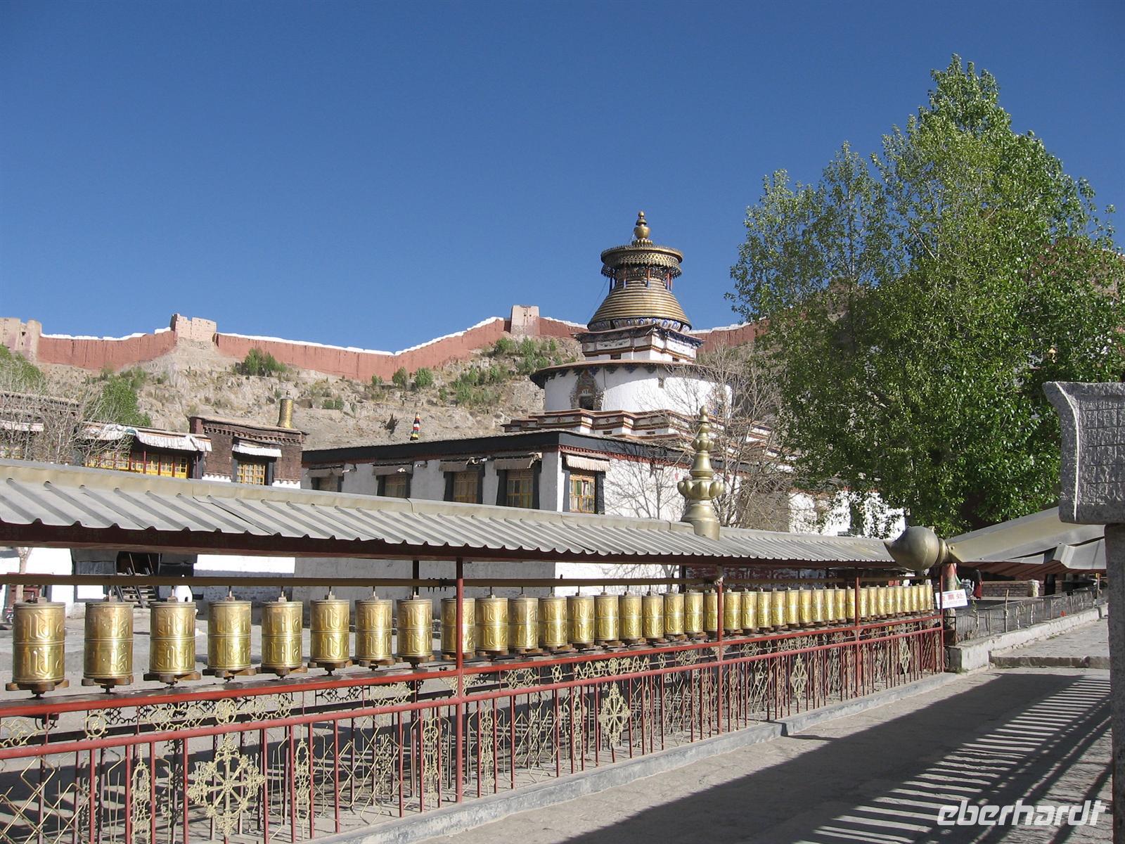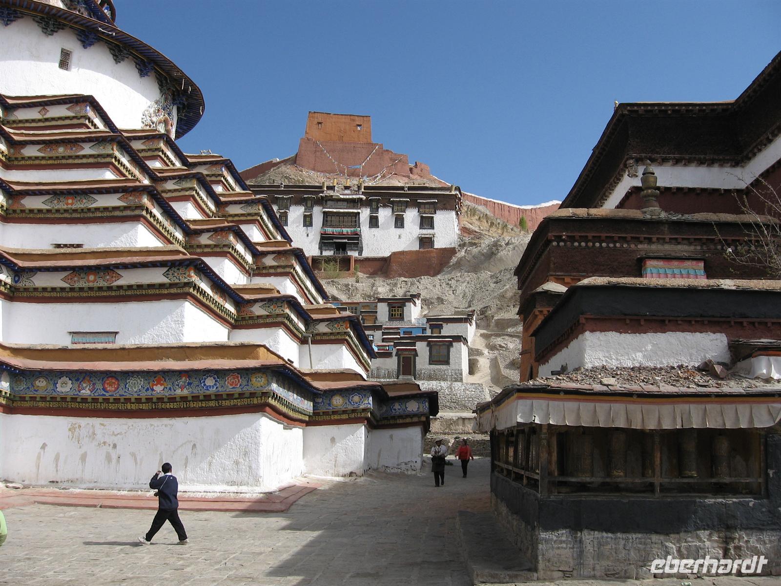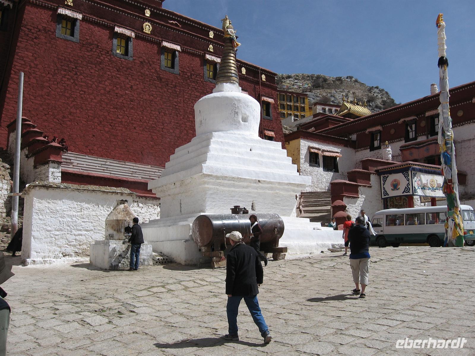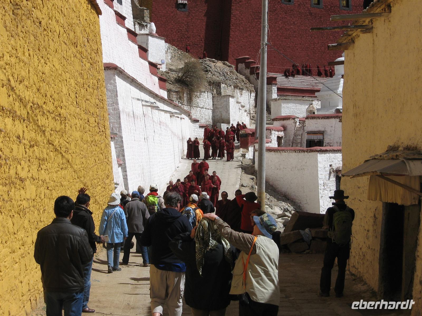 Nach einer kalten Nacht, Gyantse liegt auf 4.070 Metern Höhe, besuchen wir zuerst das Kloster Pälkhor Chöde. Sehr interessant ist, das die gesamte Anlage von einer Mauer umgeben ist. Innerhalb dieser Mauer gab es einmal 16 autonome Klöster. Alle Mönche benutzten zusammen die Große Versammlungshalle. Auch heute war ein großer Teil der 90 im Kloster lebenden Mönche bei einer Zeremonie zu erleben. Beeindruckend ist die im Gelände liegende Stupa.