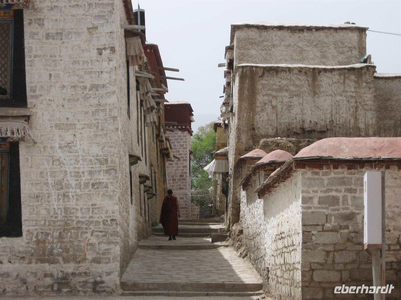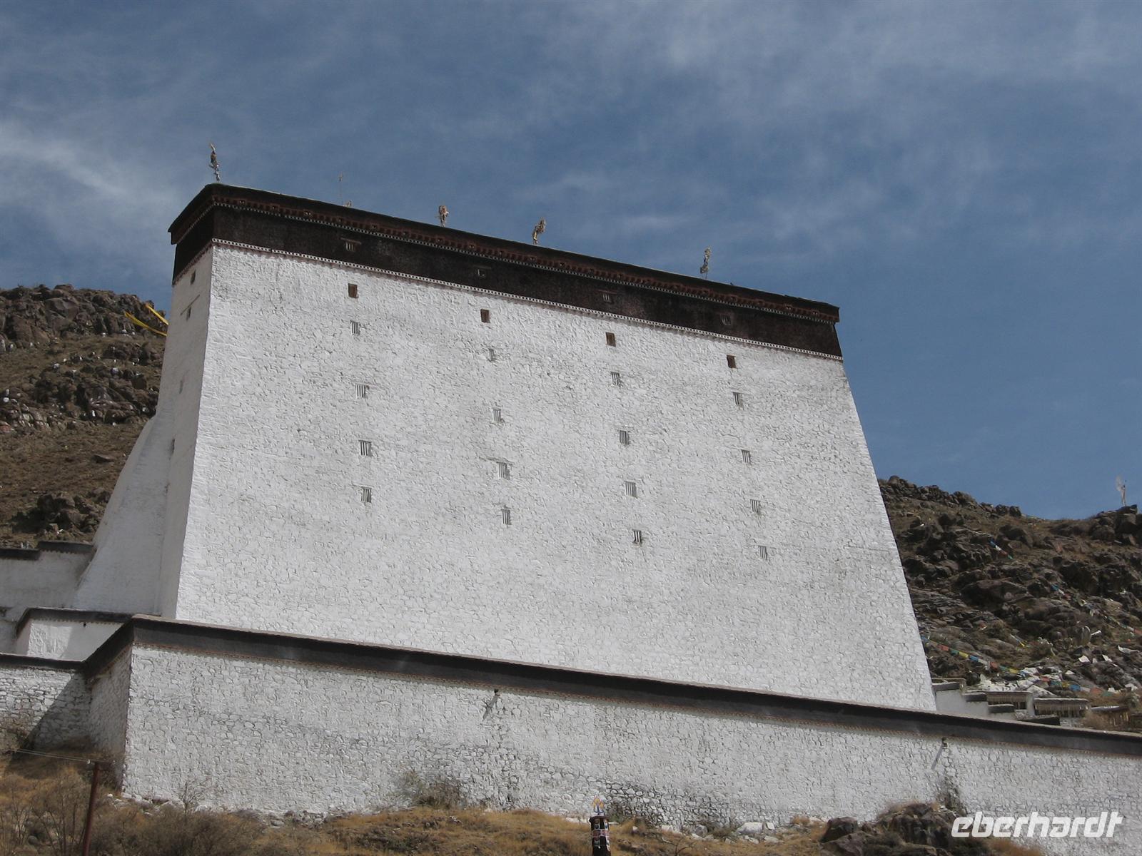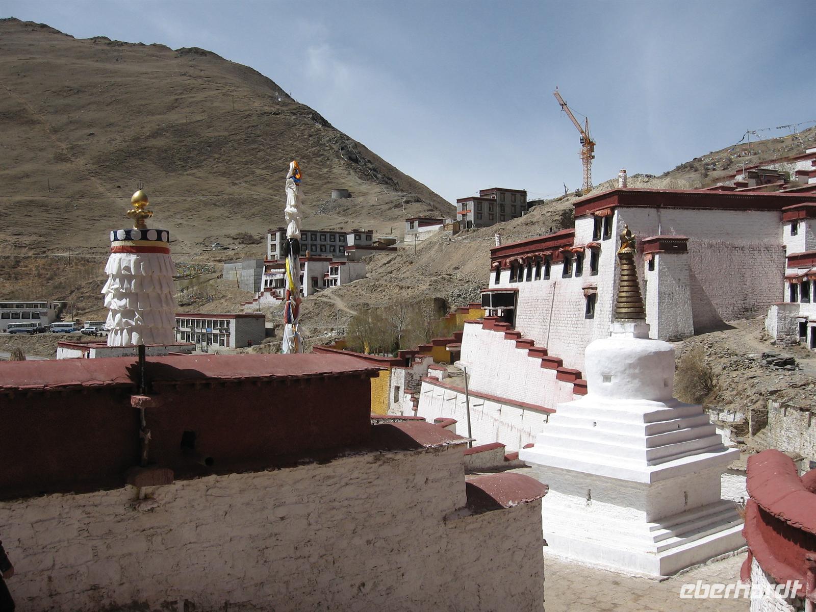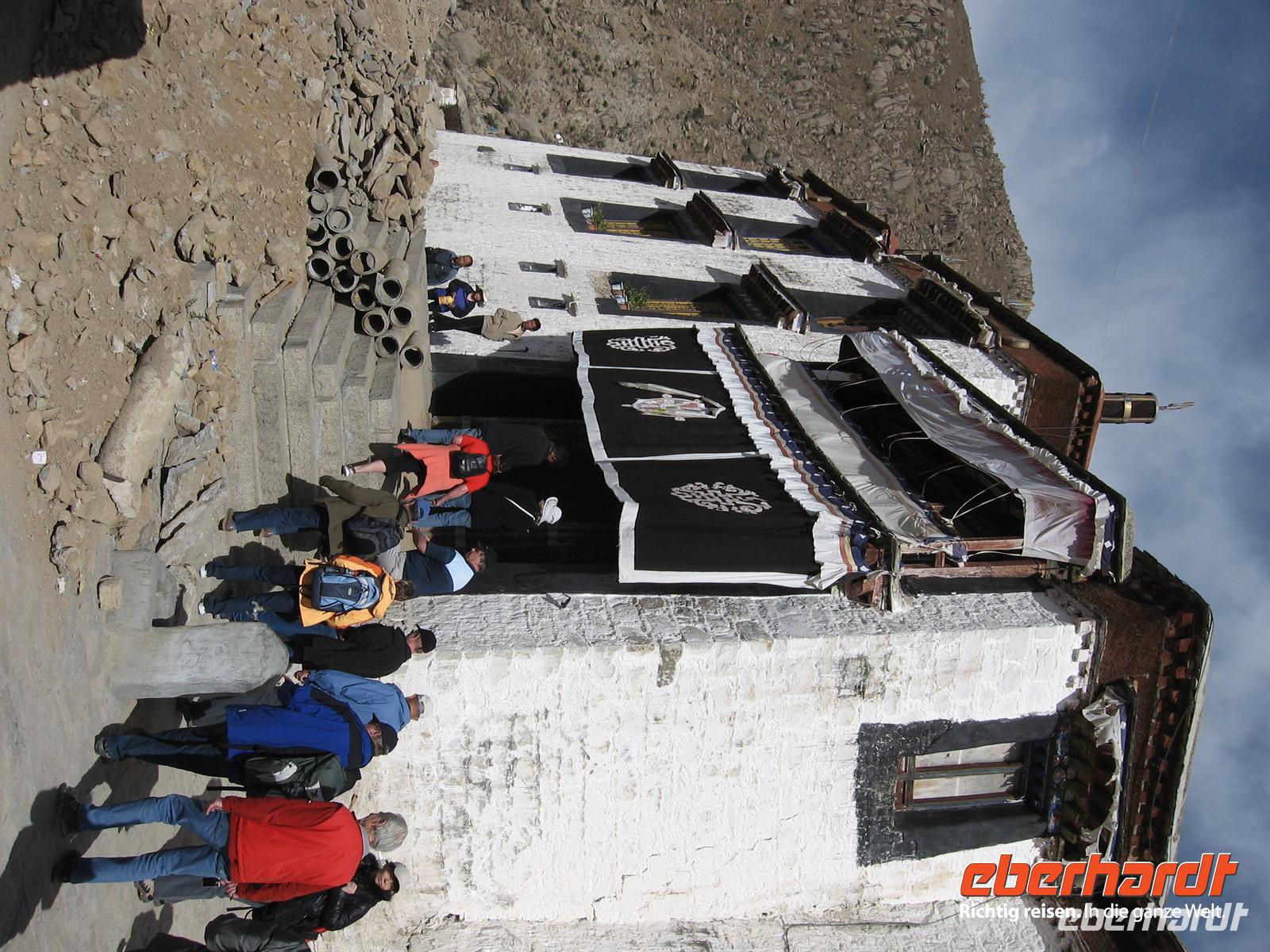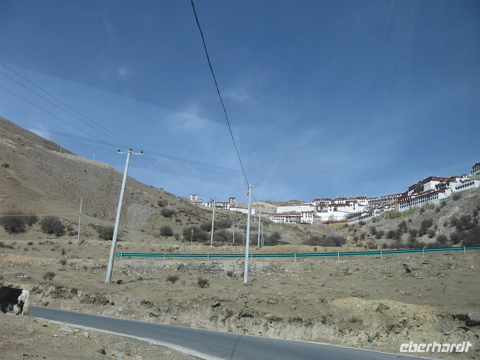 Nach einer kalten Nacht, Gyantse liegt auf 4.070 Metern Höhe, besuchen wir zuerst das Kloster Pälkhor Chöde. Sehr interessant ist, das die gesamte Anlage von einer Mauer umgeben ist. Innerhalb dieser Mauer gab es einmal 16 autonome Klöster. Alle Mönche benutzten zusammen die Große Versammlungshalle. Auch heute war ein großer Teil der 90 im Kloster lebenden Mönche bei einer Zeremonie zu erleben. Beeindruckend ist die im Gelände liegende Stupa.
