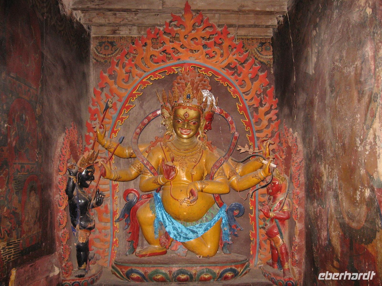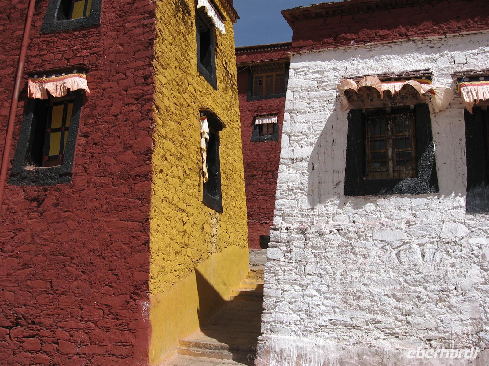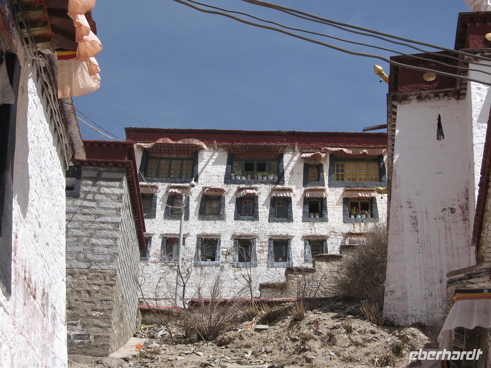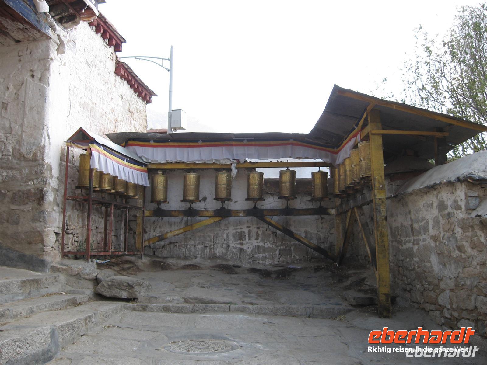 Nach einer kalten Nacht, Gyantse liegt auf 4.070 Metern Höhe, besuchen wir zuerst das Kloster Pälkhor Chöde. Sehr interessant ist, das die gesamte Anlage von einer Mauer umgeben ist. Innerhalb dieser Mauer gab es einmal 16 autonome Klöster. Alle Mönche benutzten zusammen die Große Versammlungshalle. Auch heute war ein großer Teil der 90 im Kloster lebenden Mönche bei einer Zeremonie zu erleben. Beeindruckend ist die im Gelände liegende Stupa.