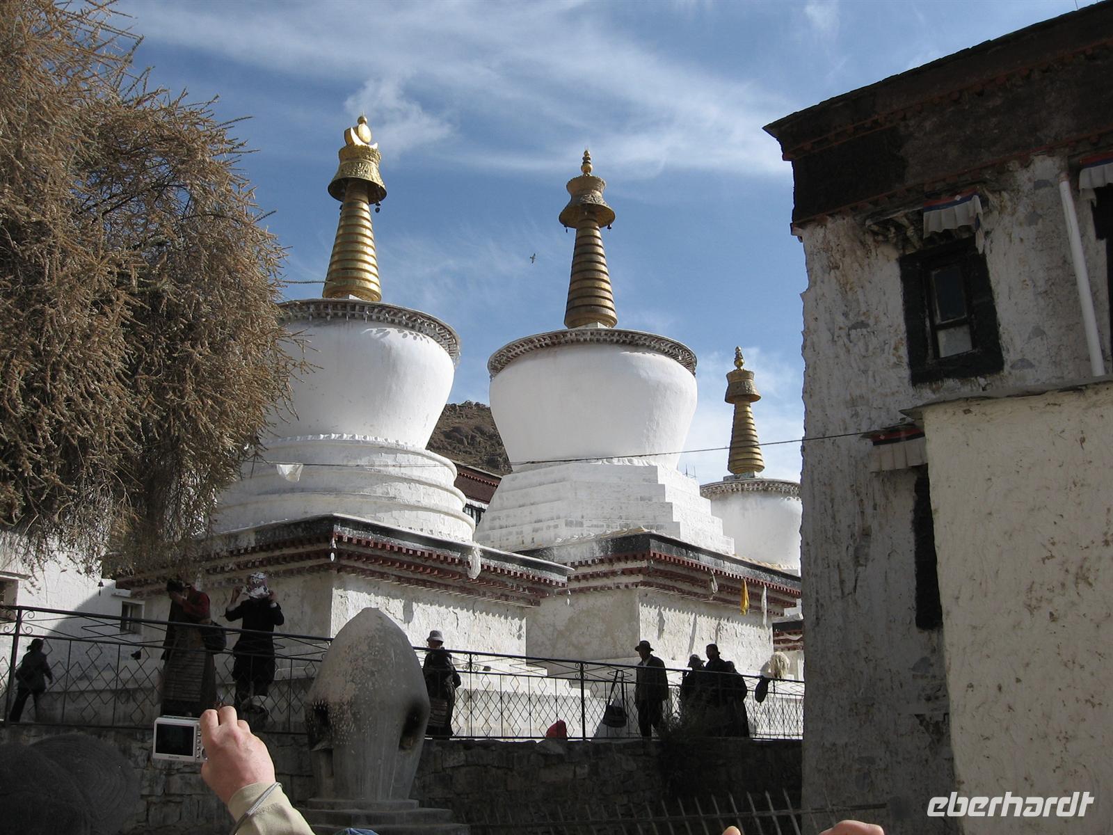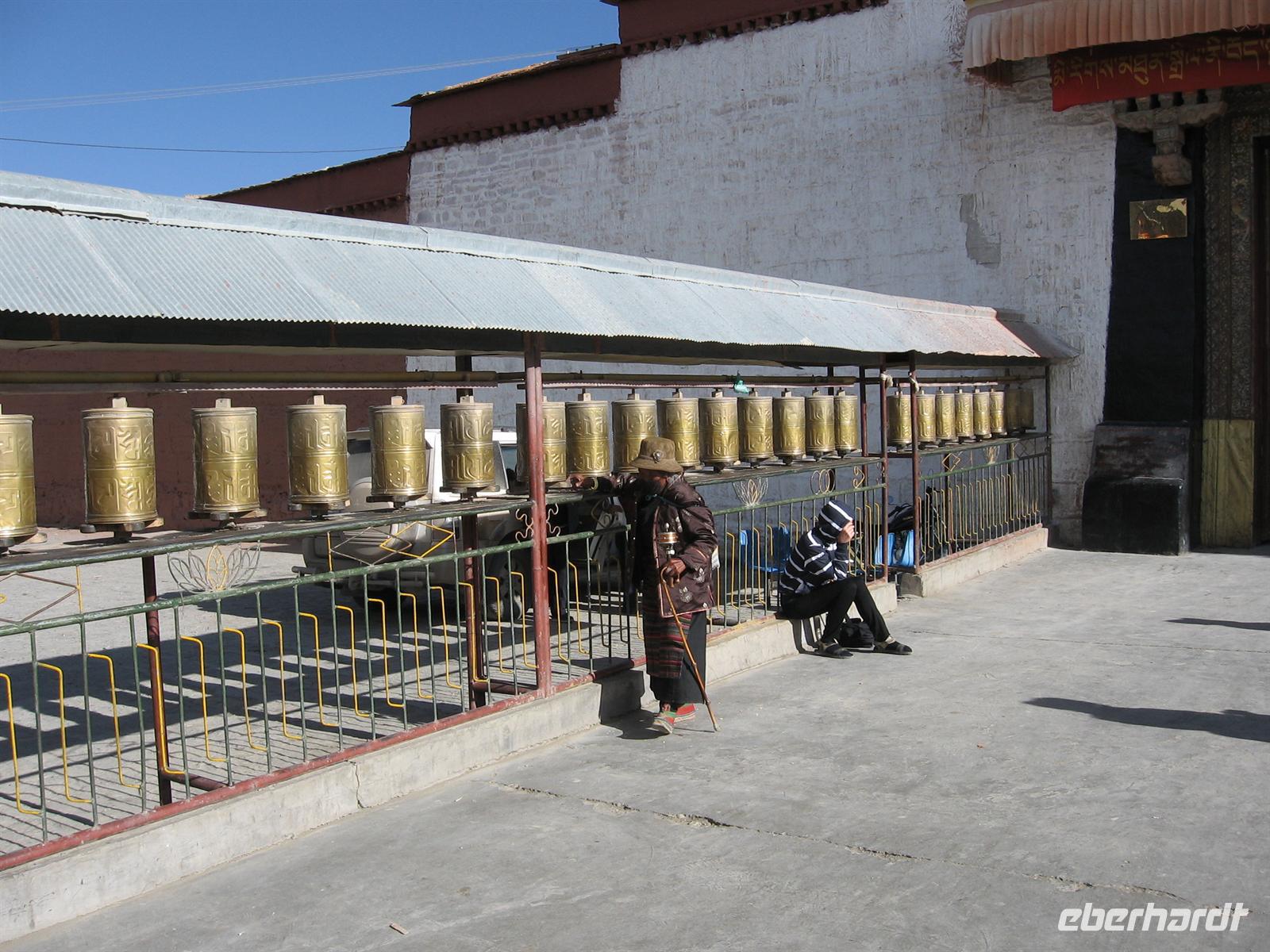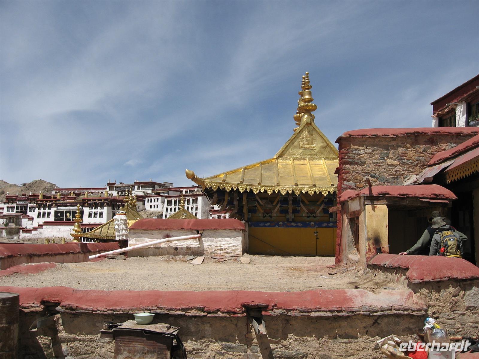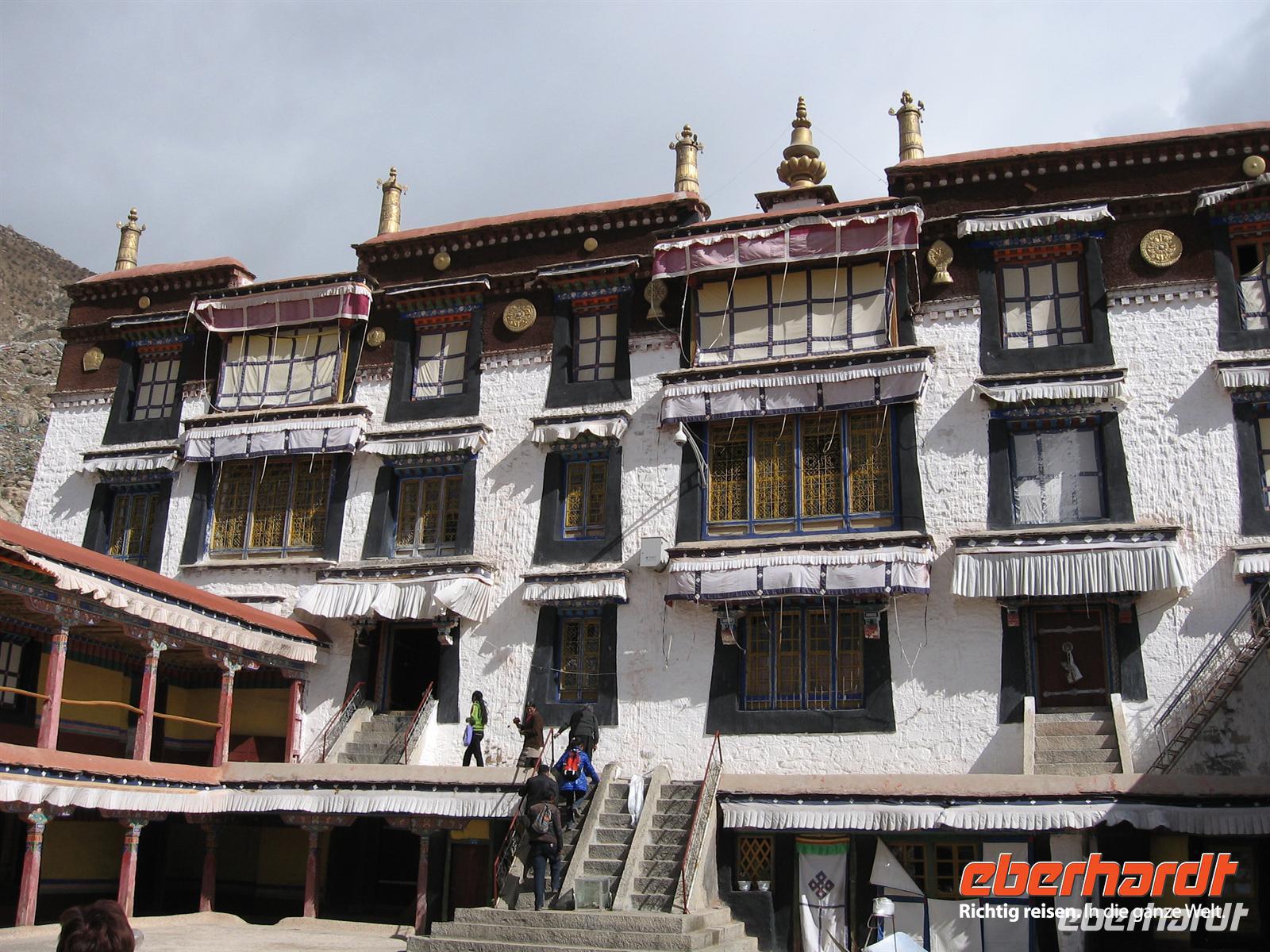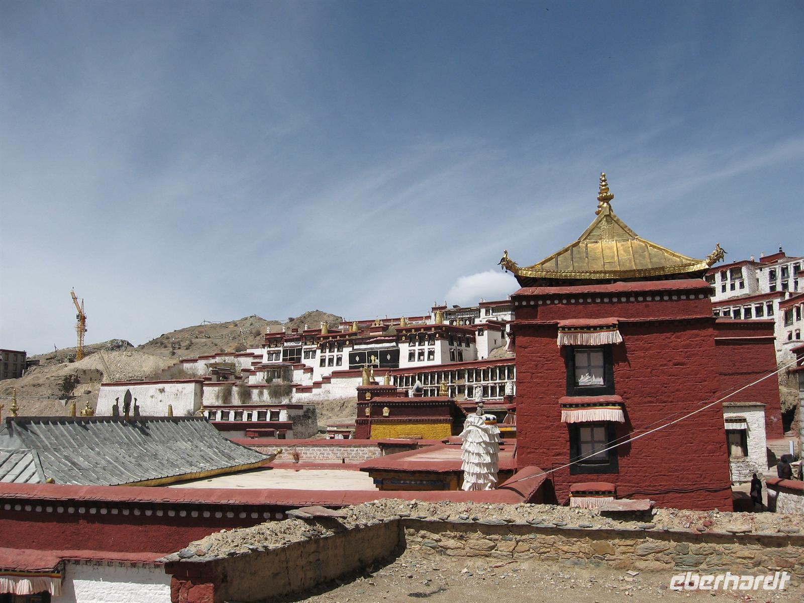 Diese Klosteranlage, in der heute 900 Mönche leben, ist die Residenz des Pänchen Lama. Der Pänchen Lama ist der zweit wichtigste Vertreter des tibetischen Buddhismus. Gegründet wurde das Kloster 1447 vom 1. Dalai Lama. Der 5. Dalai Lama verlieh den Titel Pänchen Lama (gelehrter Lama) erstmals an seinen Lehrer und gab ihm das Kloster als seine Residenz. In der Kulturrevolution wurden Teile des Klosters zerstört und nach der Wiedereröffnung des Klosters 1980 zum Teil wieder aufgebaut. Im Kloster befinden sich auch die Stupas für die 10 Pänchen Lamas, prächtige verzierte Gräber. Der jetzige 11. Pänchen Lama ist 19 Jahre alt und lebt die meiste Zeit des Jahres in Peking. Er soll dort die Minderheit der Tibeter vertreten. Höhepunkt der Besichtigung im Kloster ist die größte Buddha-Statue Tibets. Die Statue ist über 26 Meter hoch und aus 11 Tonnen Kupfer und 229 Kilogramm Gold gefertigt. Es handelt sich um den Buddha der Zukunft, der den Betrachter milde anlächelt. Errichtet wurde die Statue 1914 unter dem 9. Pänchen Lama. Ich selbst hatte zuvor in Myanmar (Burma) solche großen Buddha-Statuen gesehen.
