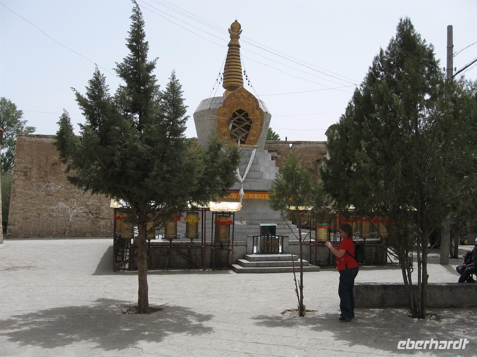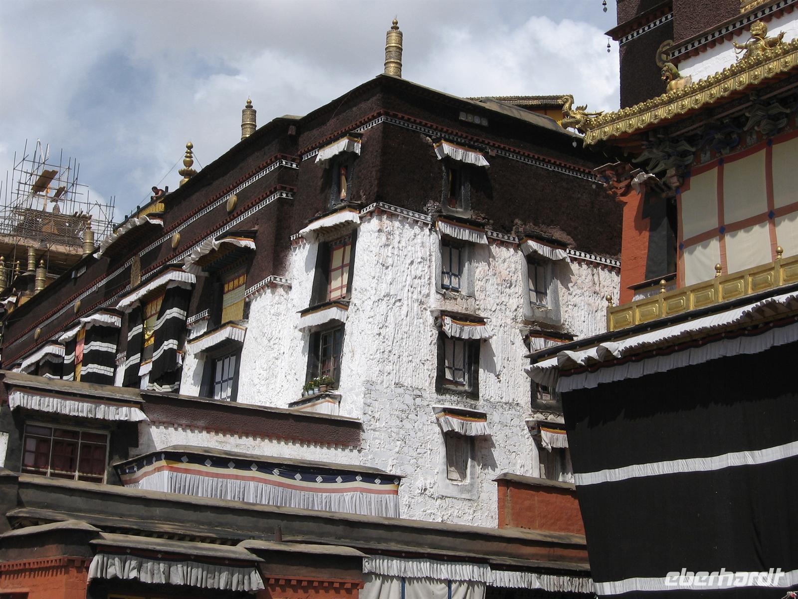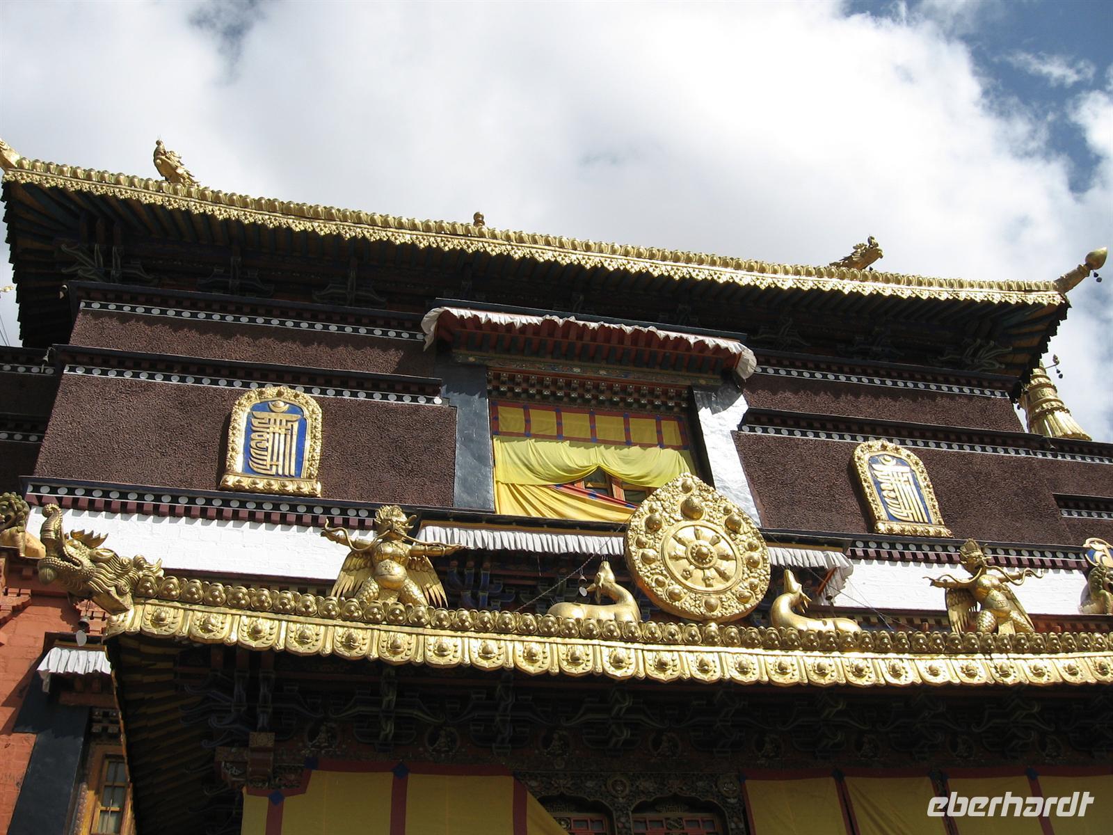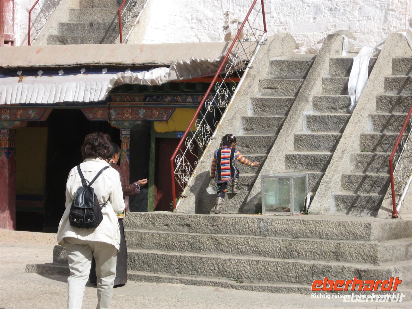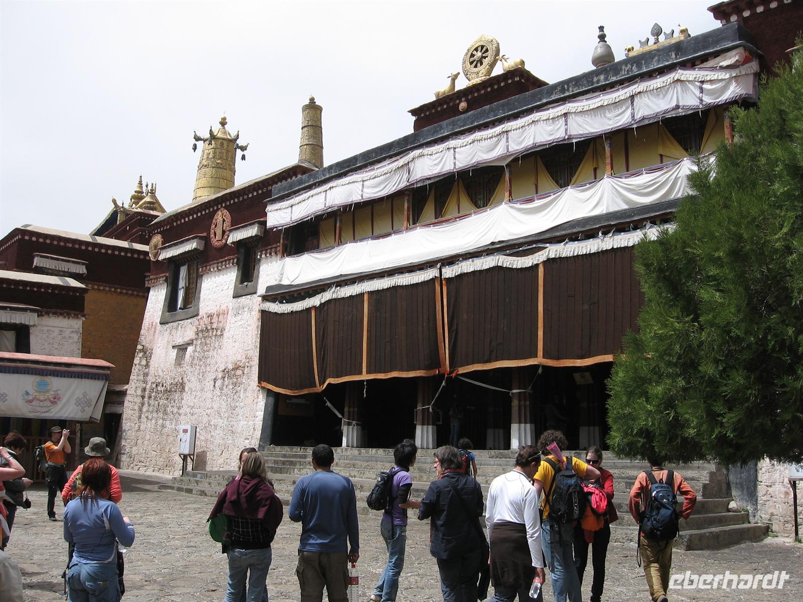 Diese Klosteranlage, in der heute 900 Mönche leben, ist die Residenz des Pänchen Lama. Der Pänchen Lama ist der zweit wichtigste Vertreter des tibetischen Buddhismus. Gegründet wurde das Kloster 1447 vom 1. Dalai Lama. Der 5. Dalai Lama verlieh den Titel Pänchen Lama (gelehrter Lama) erstmals an seinen Lehrer und gab ihm das Kloster als seine Residenz. In der Kulturrevolution wurden Teile des Klosters zerstört und nach der Wiedereröffnung des Klosters 1980 zum Teil wieder aufgebaut. Im Kloster befinden sich auch die Stupas für die 10 Pänchen Lamas, prächtige verzierte Gräber. Der jetzige 11. Pänchen Lama ist 19 Jahre alt und lebt die meiste Zeit des Jahres in Peking. Er soll dort die Minderheit der Tibeter vertreten. Höhepunkt der Besichtigung im Kloster ist die größte Buddha-Statue Tibets. Die Statue ist über 26 Meter hoch und aus 11 Tonnen Kupfer und 229 Kilogramm Gold gefertigt. Es handelt sich um den Buddha der Zukunft, der den Betrachter milde anlächelt. Errichtet wurde die Statue 1914 unter dem 9. Pänchen Lama. Ich selbst hatte zuvor in Myanmar (Burma) solche großen Buddha-Statuen gesehen.