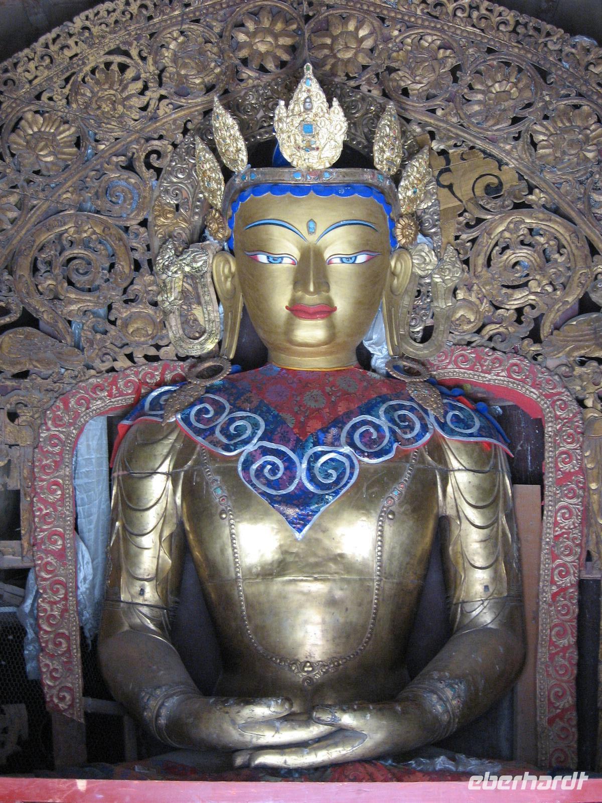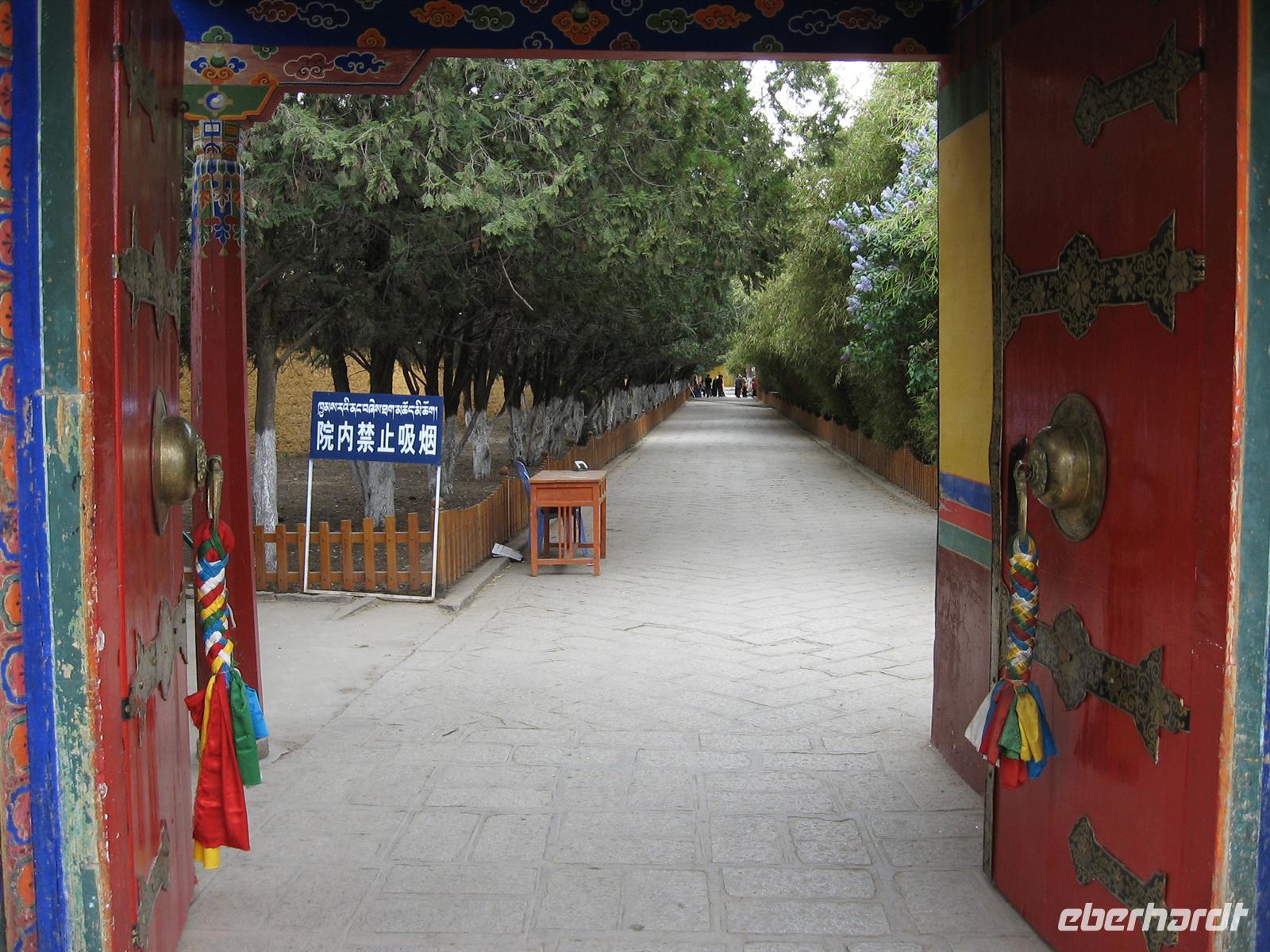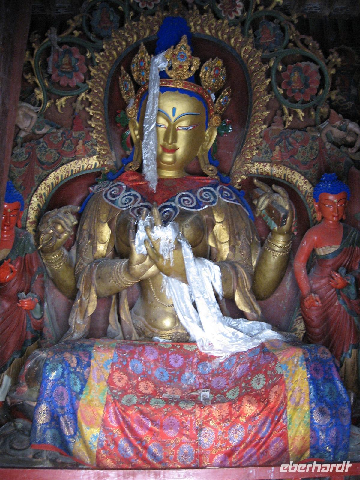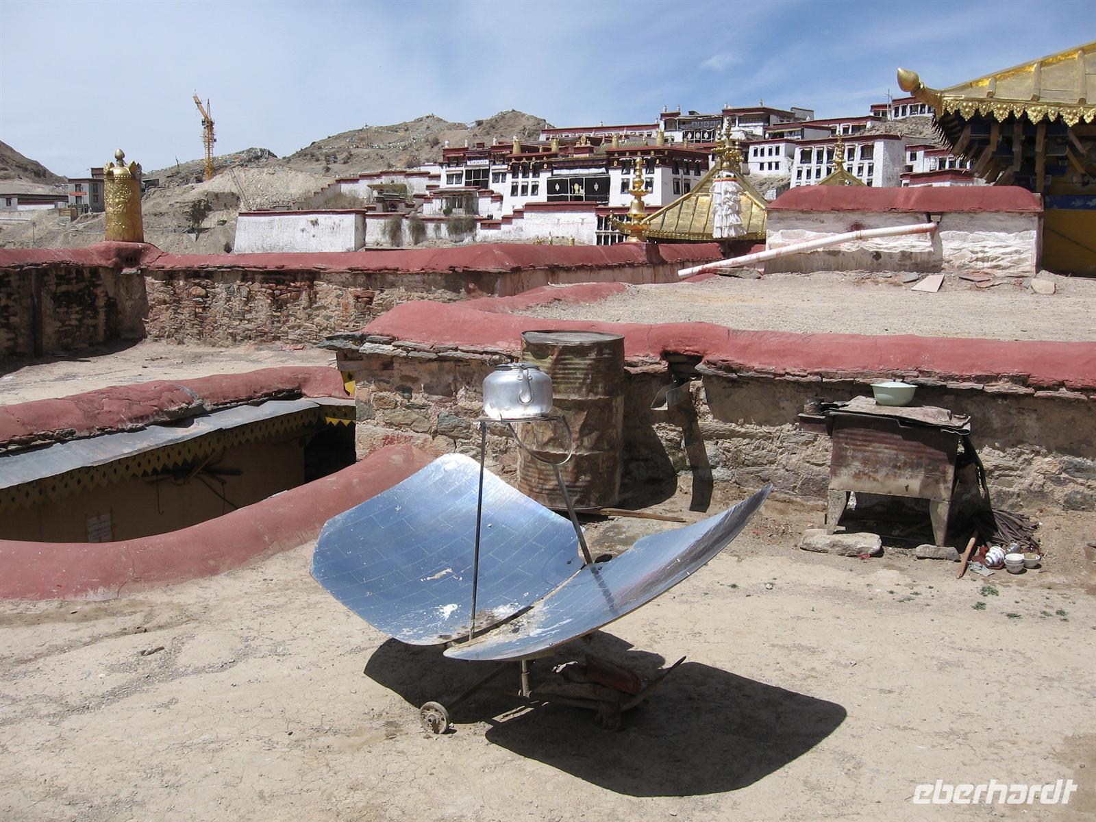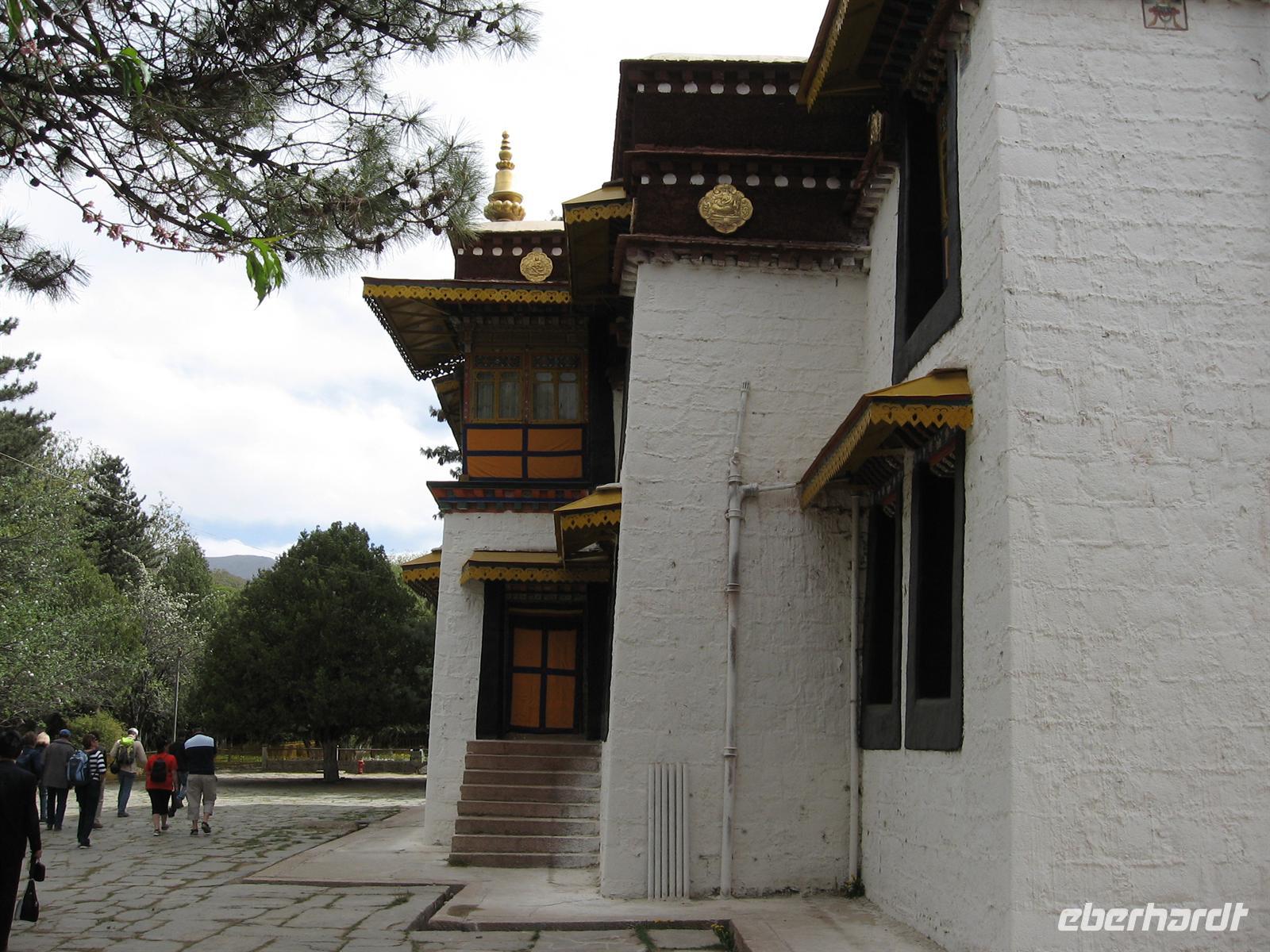 Diese Klosteranlage, in der heute 900 Mönche leben, ist die Residenz des Pänchen Lama. Der Pänchen Lama ist der zweit wichtigste Vertreter des tibetischen Buddhismus. Gegründet wurde das Kloster 1447 vom 1. Dalai Lama. Der 5. Dalai Lama verlieh den Titel Pänchen Lama (gelehrter Lama) erstmals an seinen Lehrer und gab ihm das Kloster als seine Residenz. In der Kulturrevolution wurden Teile des Klosters zerstört und nach der Wiedereröffnung des Klosters 1980 zum Teil wieder aufgebaut. Im Kloster befinden sich auch die Stupas für die 10 Pänchen Lamas, prächtige verzierte Gräber. Der jetzige 11. Pänchen Lama ist 19 Jahre alt und lebt die meiste Zeit des Jahres in Peking. Er soll dort die Minderheit der Tibeter vertreten. Höhepunkt der Besichtigung im Kloster ist die größte Buddha-Statue Tibets. Die Statue ist über 26 Meter hoch und aus 11 Tonnen Kupfer und 229 Kilogramm Gold gefertigt. Es handelt sich um den Buddha der Zukunft, der den Betrachter milde anlächelt. Errichtet wurde die Statue 1914 unter dem 9. Pänchen Lama. Ich selbst hatte zuvor in Myanmar (Burma) solche großen Buddha-Statuen gesehen.
