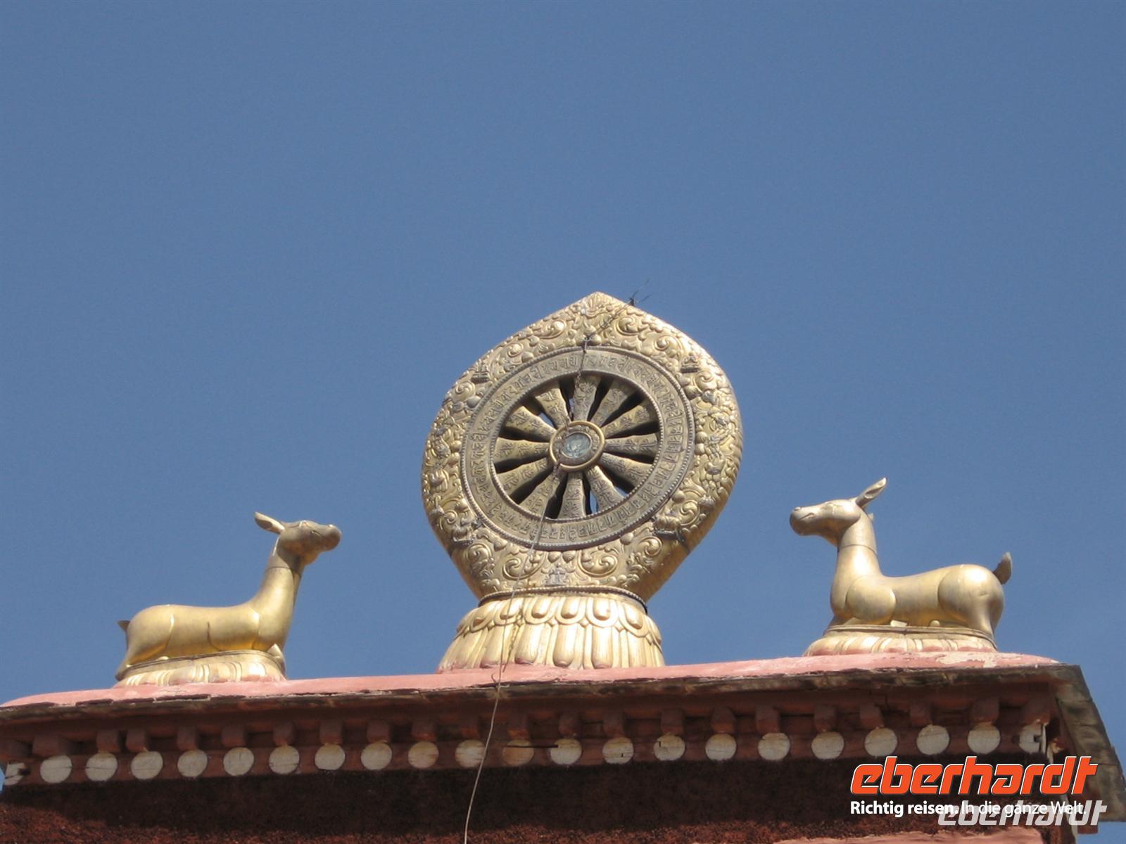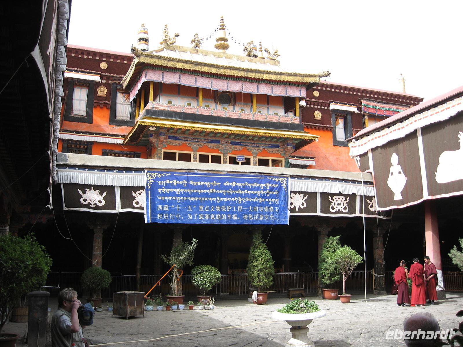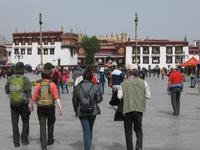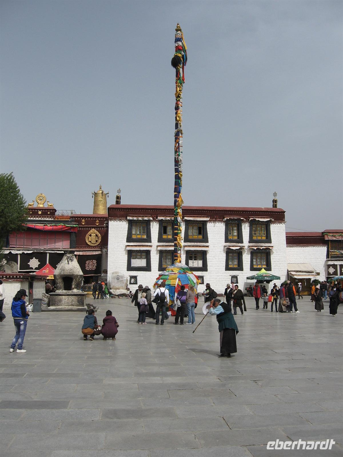 Den Abschluss des Tages bildet der Besuch von Tibets Nationalheiligtum, der Jokhang. Obwohl hier 130 Mönche leben, handelt es sich nicht um ein Kloster, sondern einen Tempel. Zur Zeit seiner Gründung im 7. Jahrhundert gab es noch keine tibetischen Mönche. Auf dem Vorplatz, dem Barkhor Platz, können wir zahlreiche Gläubige beobachten, welche sich immer wieder auf den Boden werfen und erst nach einer bestimmten Zeit das Innere betreten werden. Auf einem Pilgerweg umrunden zahlreiche Menschen mit Gebetsmühlen in der Hand den Jokhang. Jeder Tibeter sollte mindestens einmal im Leben hier gewesen sein und so ist der Andrang natürlich auch entsprechend groß. Wir besichtigen die Innenräume und haben zum Schluss die Möglichkeit, auf das Dach zu steigen. Dort begegnet uns wieder eine Gruppe Arbeiter, welche mit rhythmischen Gesang das reparierte Dach stampfen. Rund um den Johkang verläuft die Straße Barkhor, hier gibt es unzählige Stände und Geschäfte mit Souvenirs. Da wird eigentlich jeder fündig und das Handeln um einen besseren Preis macht uns auch Spaß. Zum Abendessen werden wir heute mit tibetischen Tänzen und Gesang unterhalten, was uns allen sehr gefallen hat.