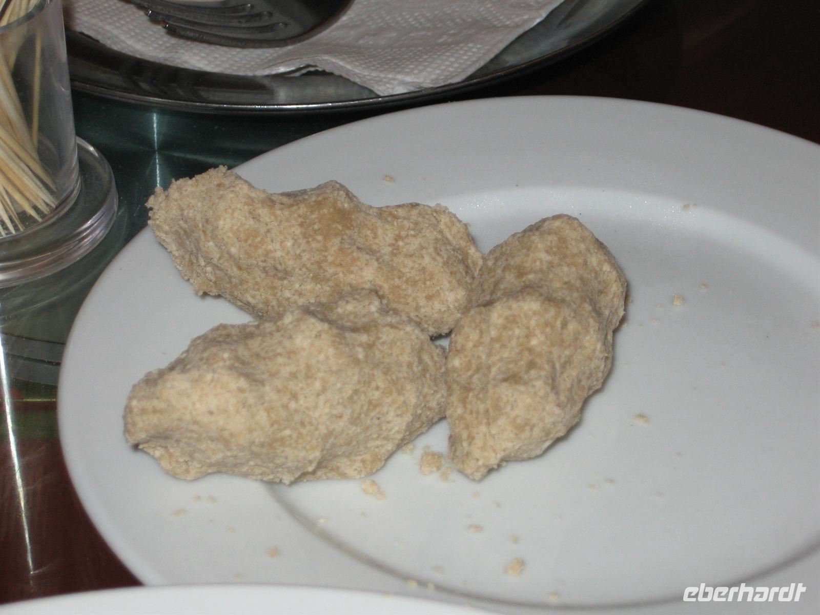 Mittags gibt es die Gelegenheit, verschiedenen tibetische Spezialitäten zu probieren. Einige Gäste nutzen das. So können wir Buttertee probieren, aber auch Momos. Das sind mit gehacktem Jakfleisch oder Gemüse gefüllte Teigtaschen. Auch Tsampa kosten wir, eines der Hauptnahrungsmittel der Tibeter. Es ist gemahlene geröstete Gerste, das Mehl wird mit Buttertee oder auch nur mit Wasser zu einem Teig gerührt. Diesen kann man dann essen. Es schmeckt am Besten mit Gemüse. Das Mehl haben übrigens auch alle Bauern oder Reisenden bei sich, damit kann man sich auch unterwegs unkompliziert etwas zu Essen zubereiten.