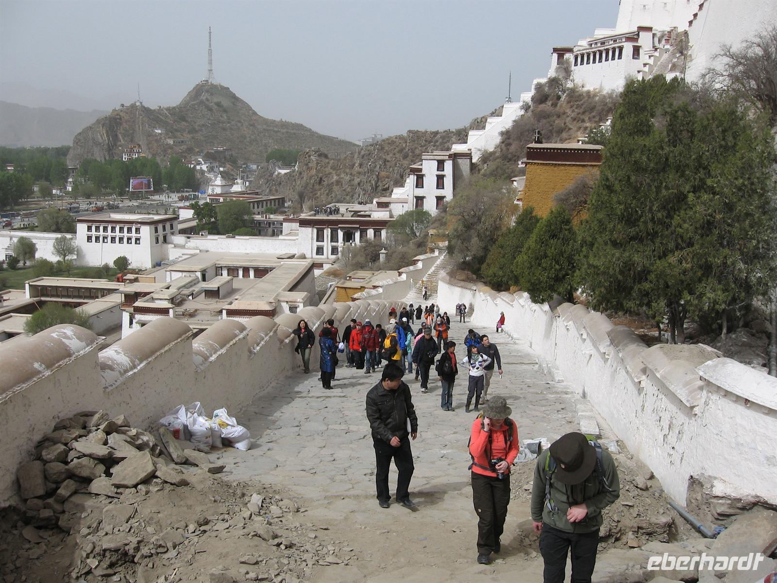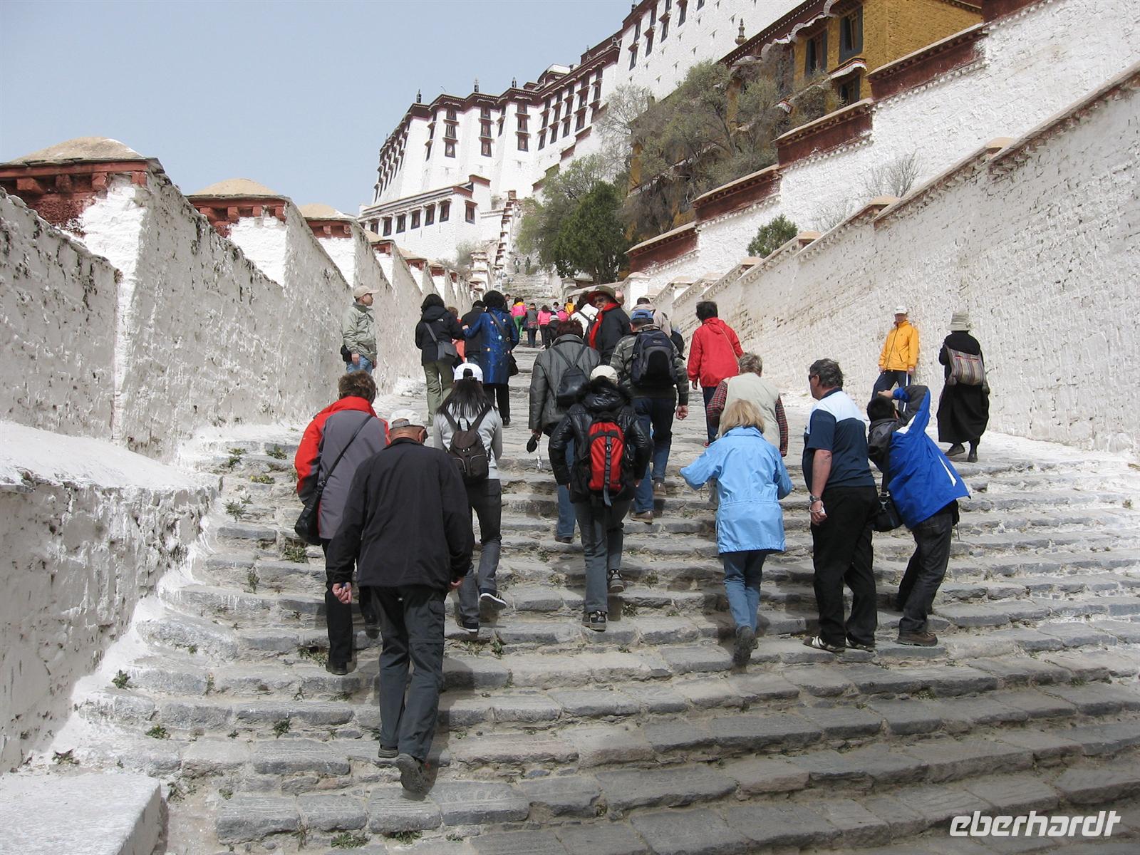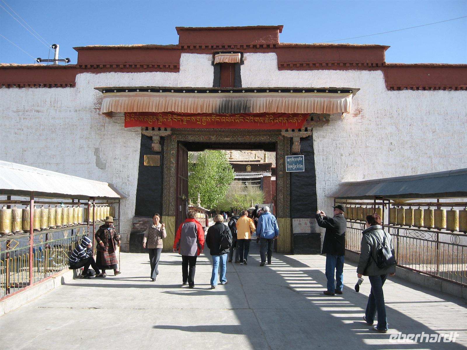 Zuerst wollen wir natürlich ein Foto machen. Das gelingt sehr gut vom durch die Regierung neu gestalteten Vorplatz. Durch einen Seiteneingang betreten wir das Gelände, alles ist streng geregelt. Wir müssen uns an Hand einer Liste aufstellen und unsere Pässe werden kontrolliert, auch später ein zweites Mal. Ebenso werden unsere Taschen durchleuchtet. Nachdem wir das alles geschafft haben, beginnt der Aufstieg über Treppen. Wir gehen langsam nach oben, denn die dünne Luft macht sich bei jeder Anstrengung bemerkbar. Dann endlich betreten wir das Gebäude. Der Potala war der Winterpalast des Dalai Lama, vom 5. Dalai Lama im 17. Jahrhundert gebaut. Er war nicht nur Sitz der Dalai Lamas, sondern dient auch als deren Begräbnisstätte. Vom 5. bis zum 13. Dalai Lama sind hier alle begraben, mit Ausnahme des 6. Dalai Lama. Wir sehen auf unserem Rundgang die Privaträume des 13. Dalai Lama, zahlreiche Gebetsräume, Kapellen und Meditationsräume und die Stupas mit den sterblichen Überresten der Dalai Lamas. Wir haben natürlich nur einen Bruchteil der 999 Räume gesehen. Auch sind längst nicht alle Räume für die Öffentlichkeit zugänglich. Nach gut einer Stunde kommen wir auf der Rückseite des Potala an und gehen über den Fahrweg wieder nach unten. Dabei haben wir einen schönen Blick über Lhasa und es lohnt sich natürlich auch immer ein Blick zurück.