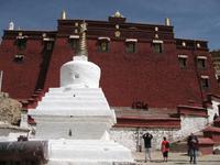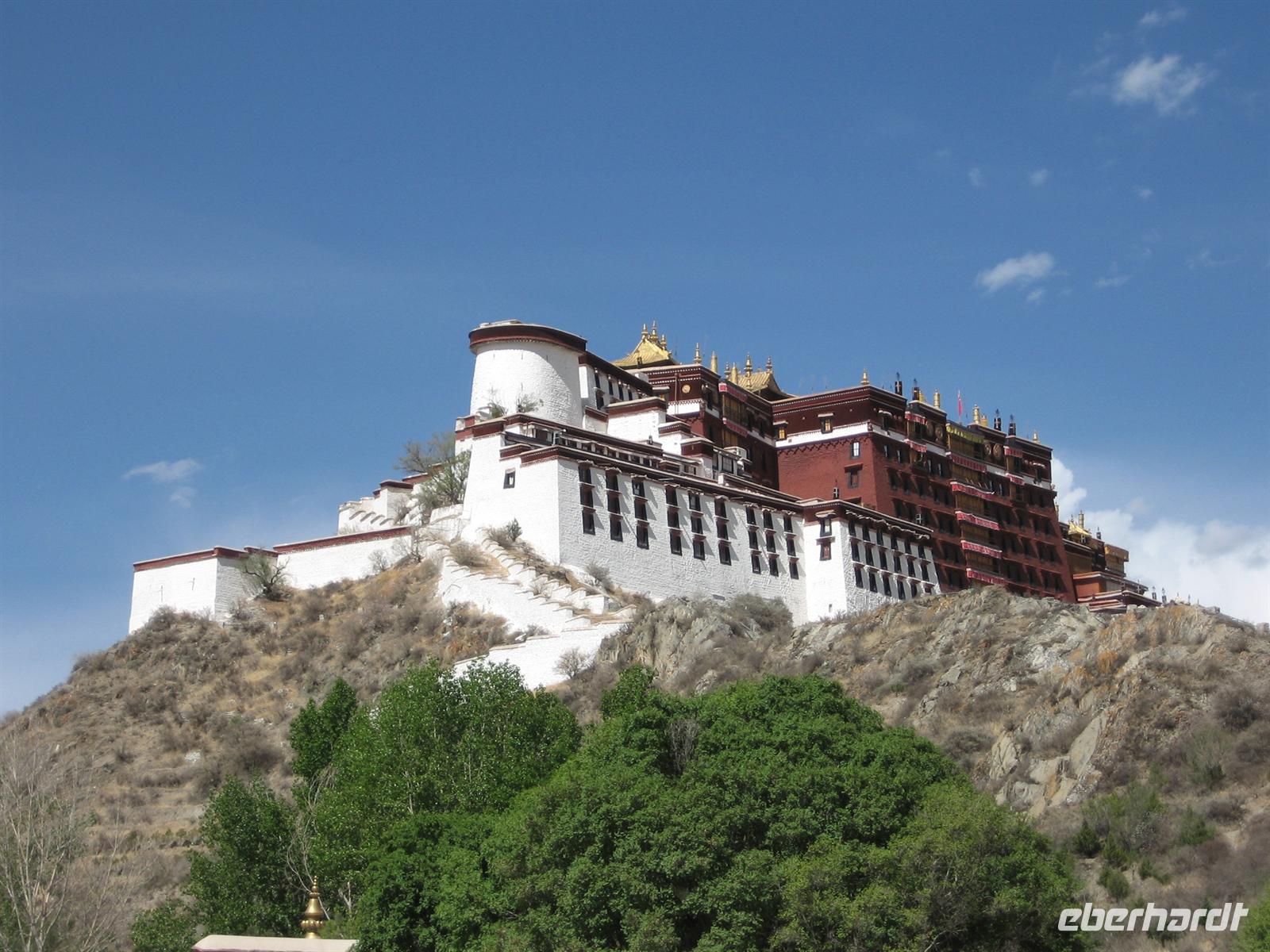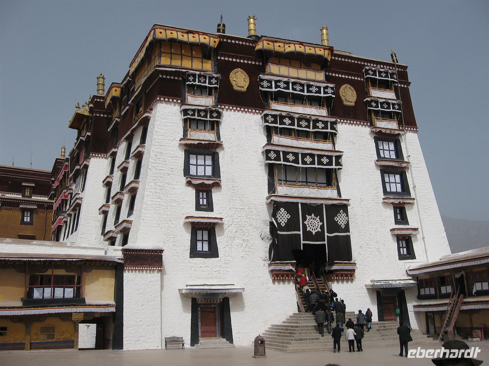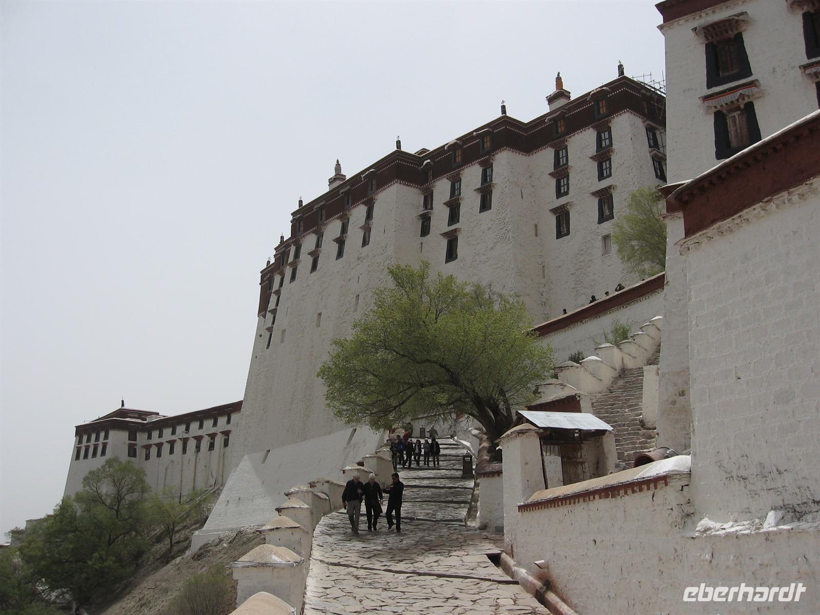 Zuerst wollen wir natürlich ein Foto machen. Das gelingt sehr gut vom durch die Regierung neu gestalteten Vorplatz. Durch einen Seiteneingang betreten wir das Gelände, alles ist streng geregelt. Wir müssen uns an Hand einer Liste aufstellen und unsere Pässe werden kontrolliert, auch später ein zweites Mal. Ebenso werden unsere Taschen durchleuchtet. Nachdem wir das alles geschafft haben, beginnt der Aufstieg über Treppen. Wir gehen langsam nach oben, denn die dünne Luft macht sich bei jeder Anstrengung bemerkbar. Dann endlich betreten wir das Gebäude. Der Potala war der Winterpalast des Dalai Lama, vom 5. Dalai Lama im 17. Jahrhundert gebaut. Er war nicht nur Sitz der Dalai Lamas, sondern dient auch als deren Begräbnisstätte. Vom 5. bis zum 13. Dalai Lama sind hier alle begraben, mit Ausnahme des 6. Dalai Lama. Wir sehen auf unserem Rundgang die Privaträume des 13. Dalai Lama, zahlreiche Gebetsräume, Kapellen und Meditationsräume und die Stupas mit den sterblichen Überresten der Dalai Lamas. Wir haben natürlich nur einen Bruchteil der 999 Räume gesehen. Auch sind längst nicht alle Räume für die Öffentlichkeit zugänglich. Nach gut einer Stunde kommen wir auf der Rückseite des Potala an und gehen über den Fahrweg wieder nach unten. Dabei haben wir einen schönen Blick über Lhasa und es lohnt sich natürlich auch immer ein Blick zurück.