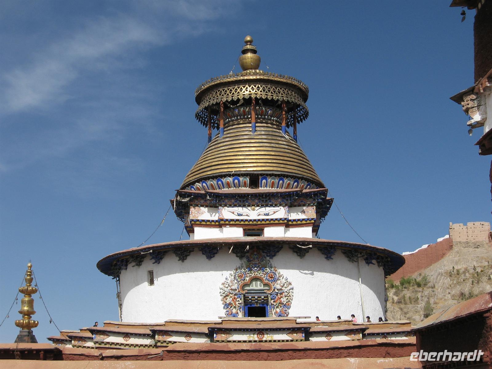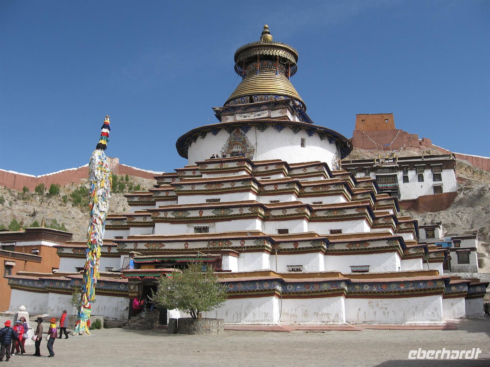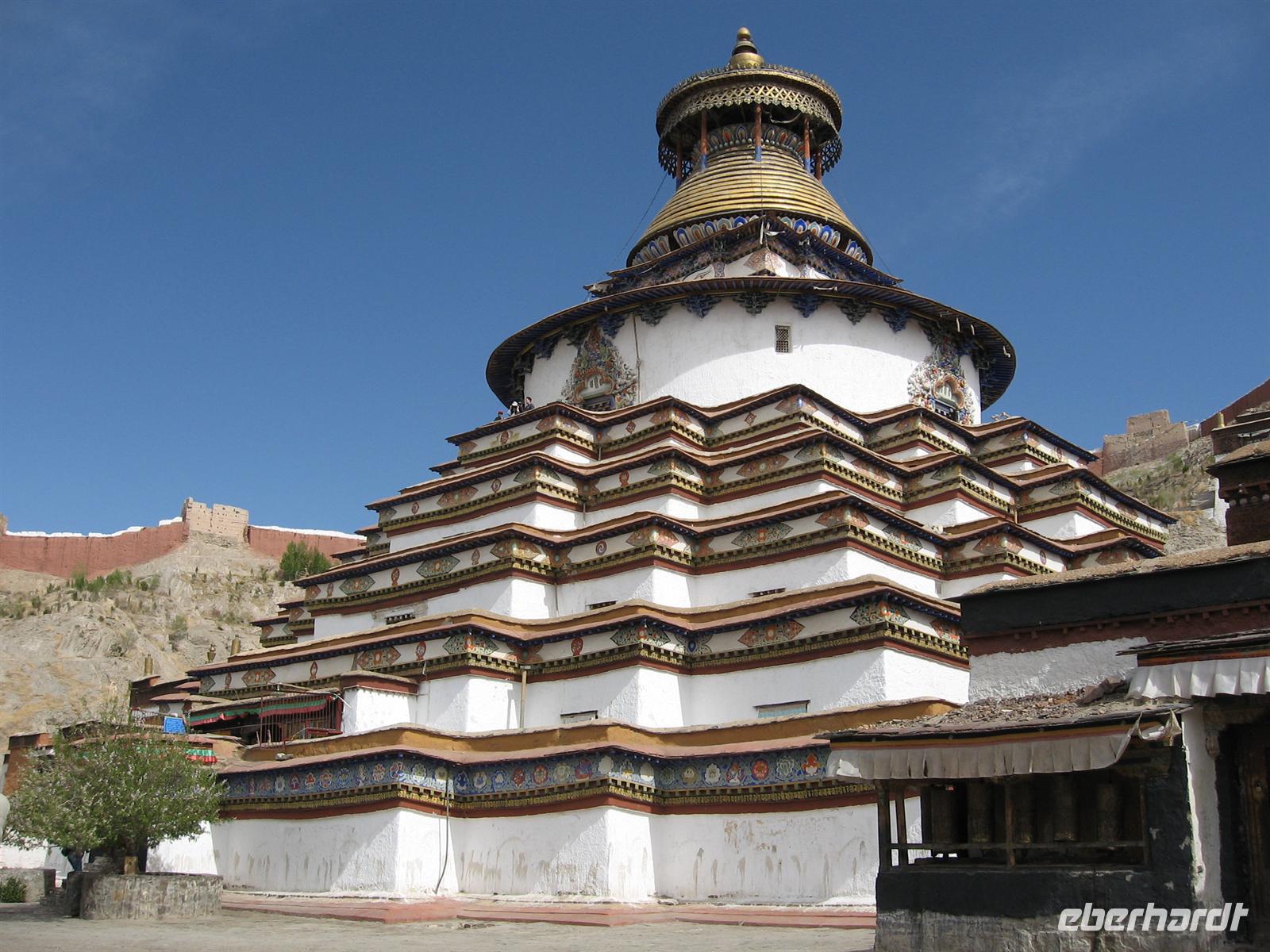Sie ist der einzige heute noch vorhandene begehbare Reliquienschrein und ein großartiges Monument tibetischer Architektur. Errichtet wurde das Gebäude 1440 vom damals regierenden Gyantse Fürsten. Ihm stand es zu 100.000 Gottheiten darzustellen. Genau genommen sind es über vier Etagen verteilt 27.529. Entlang unzähliger Gebetsmühlen können Pilger den ganzen Komplex im Uhrzeigersinn umrunden.