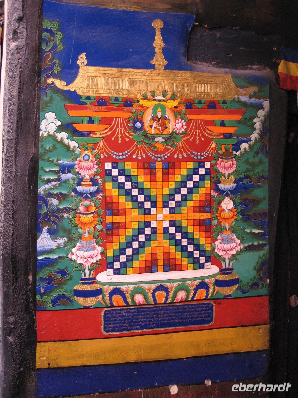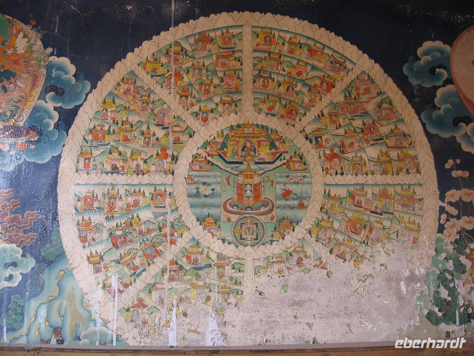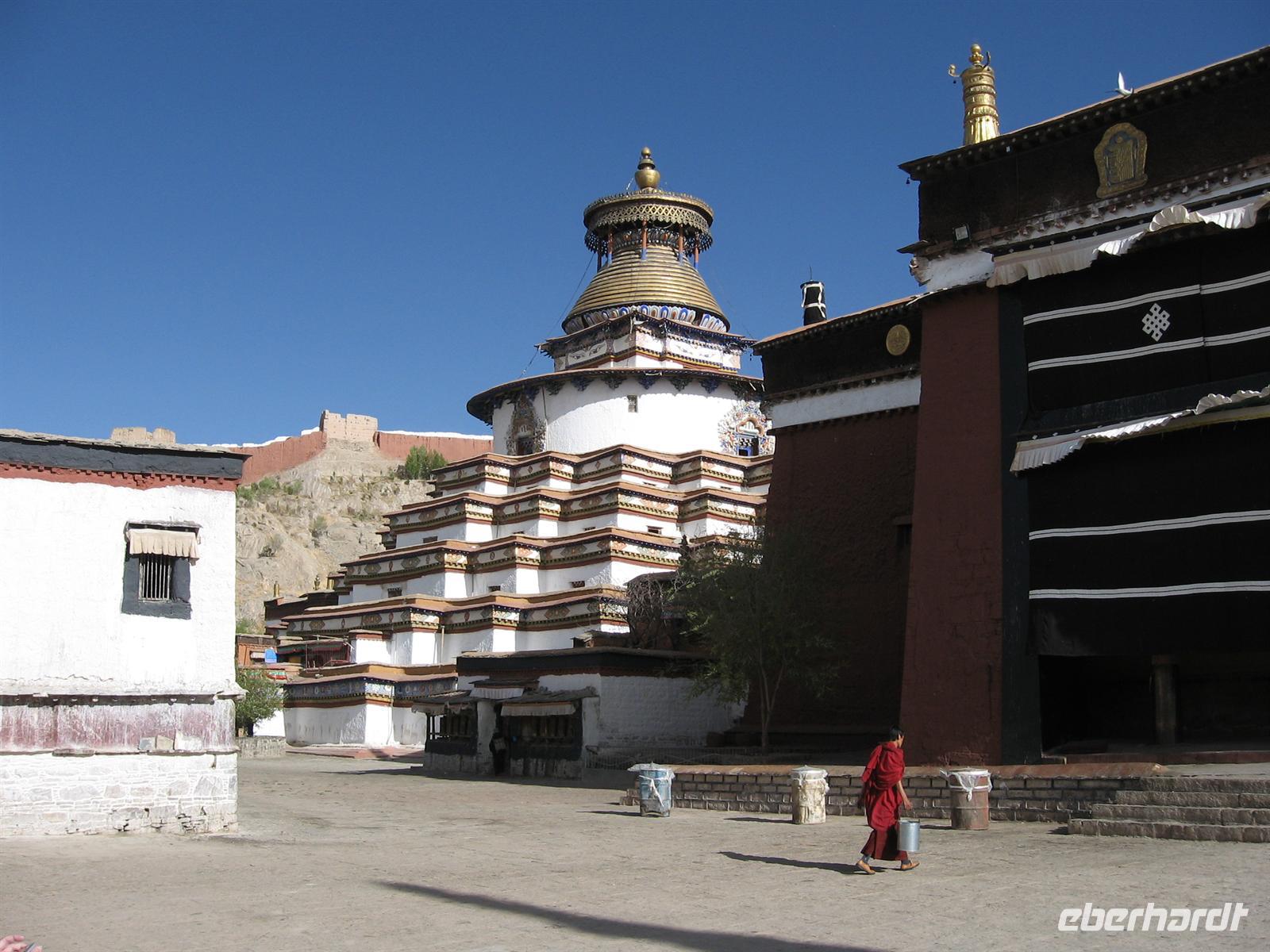 Sie ist der einzige heute noch vorhandene begehbare Reliquienschrein und ein großartiges Monument tibetischer Architektur. Errichtet wurde das Gebäude 1440 vom damals regierenden Gyantse Fürsten. Ihm stand es zu 100.000 Gottheiten darzustellen. Genau genommen sind es über vier Etagen verteilt 27.529. Entlang unzähliger Gebetsmühlen können Pilger den ganzen Komplex im Uhrzeigersinn umrunden.