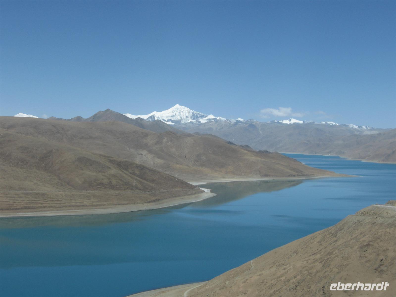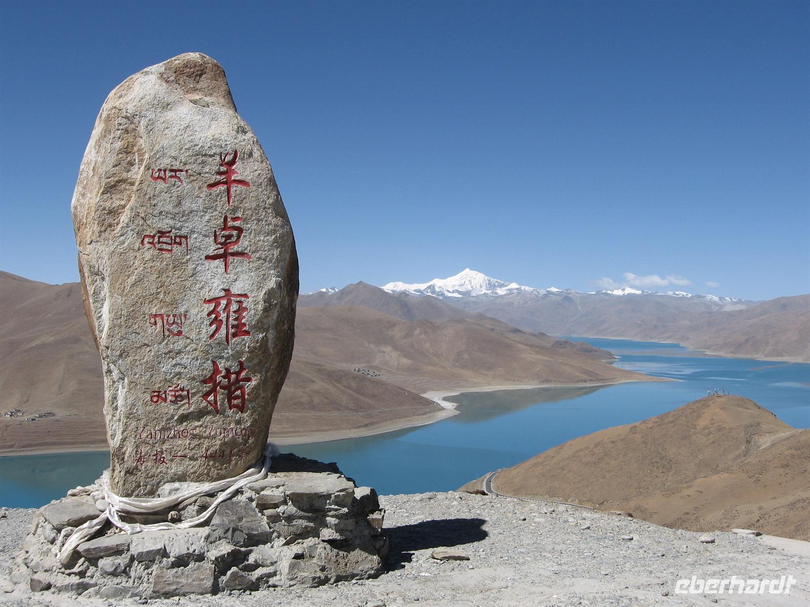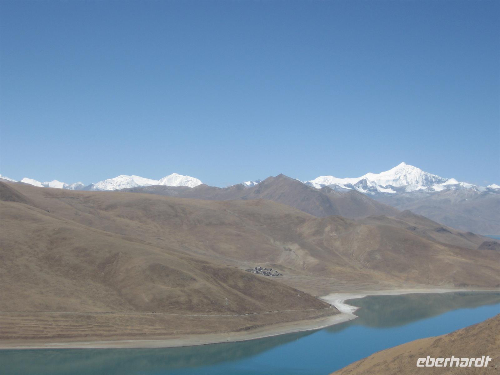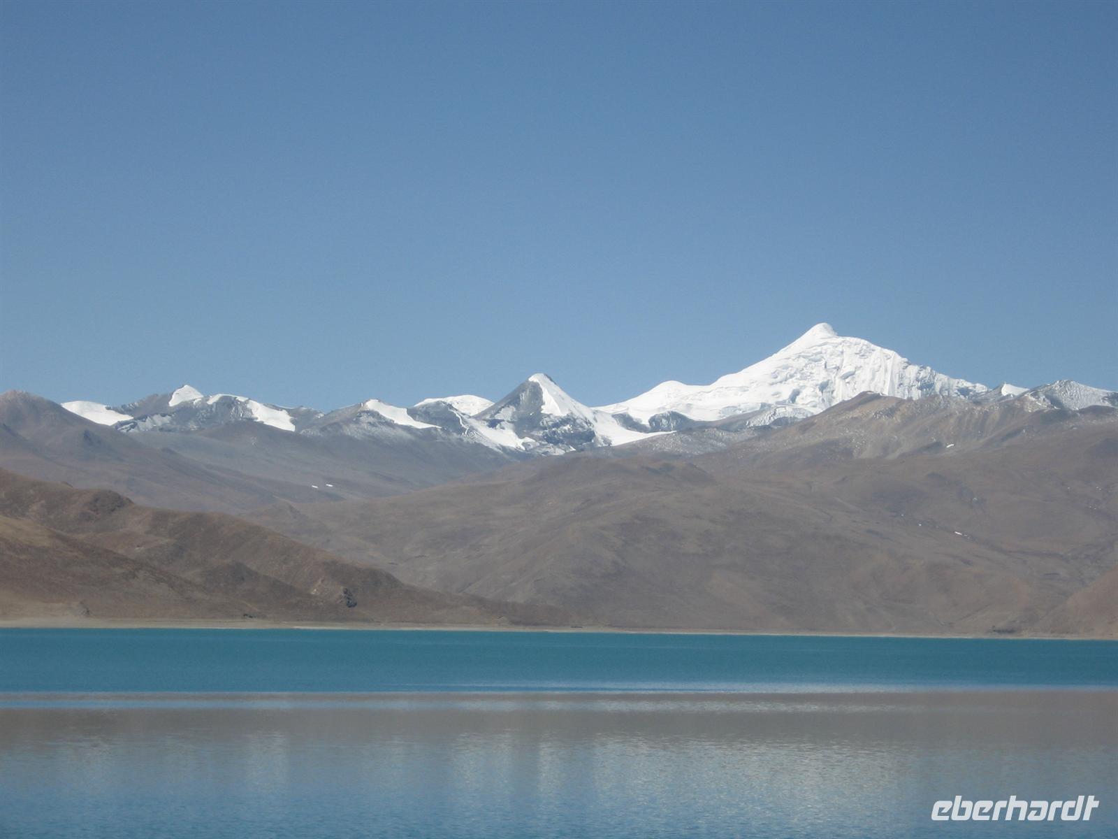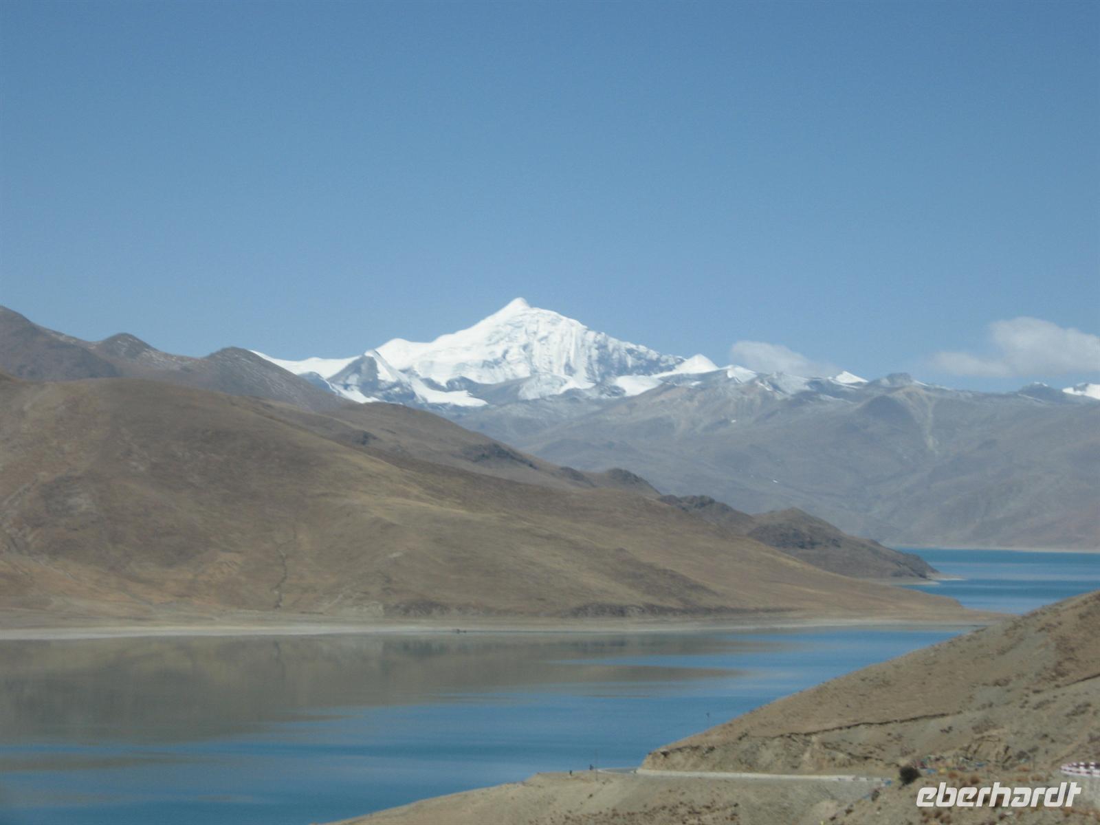 Khamba La mit 4.794 Metern. Von oben ergibt sich ein traumhafter Blick auf See Yamdok Yutsho, welcher durch seine türkis blaue Farbe besticht. Gleichzeitig sehen wir auch schon die ersten schneebedeckten Berge, zwei Spitzen mit den Namen Job und Jomo, was Herr und Herrin bedeutet. Diese Gipfel gehören zu den heiligen Bergen von Zentraltibet. In westlicher Richtung sehen wir unseren ersten 7000'er, den 7.223 Meter hohen Nnöjin-Kangsa. Bei einem Stopp am See können wir ihn vor uns liegend sehr schön fotografieren. Bei unserem Halt am Ufer fallen uns viele kleine Steinpyramiden auf. Dabei handelt es sich um „OMANI“ Steine. OMANI bedeutet: „Oh du Juwel in der Lotosblüte“. Entlang des Sees führt die Straße bis nach Langnazi, wo Zeit für eine Mittagspause ist. Anschließend geht es wieder auf einen Pass: Bei 5.050 Metern passieren wir Karo La. Unterhalb des eigentlichen Passes halten wir und vor uns liegt der ins Tal hinab ragende Gletscher des Nnöjin Kangsa. Hier leben auch einige Hirten. Nach einen Stopp fahren wir zum letzten Pass für heute, dem Semi La auf 4.330 Metern Höhe. Von der Passhöhe blicken wir über den Stausee des 1996 fertiggestellten Wasserkraftwerkes Chakwang. Am späten Nachmittag kommen wir in Gyantse an, ein 6.000 Einwohner zählendes Ackerbauernstädtchen. Es bleibt genug Zeit für einen ersten Erkundungsspaziergang.