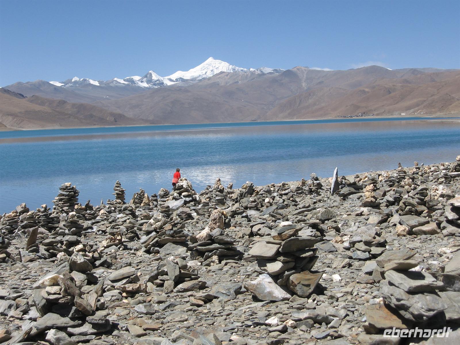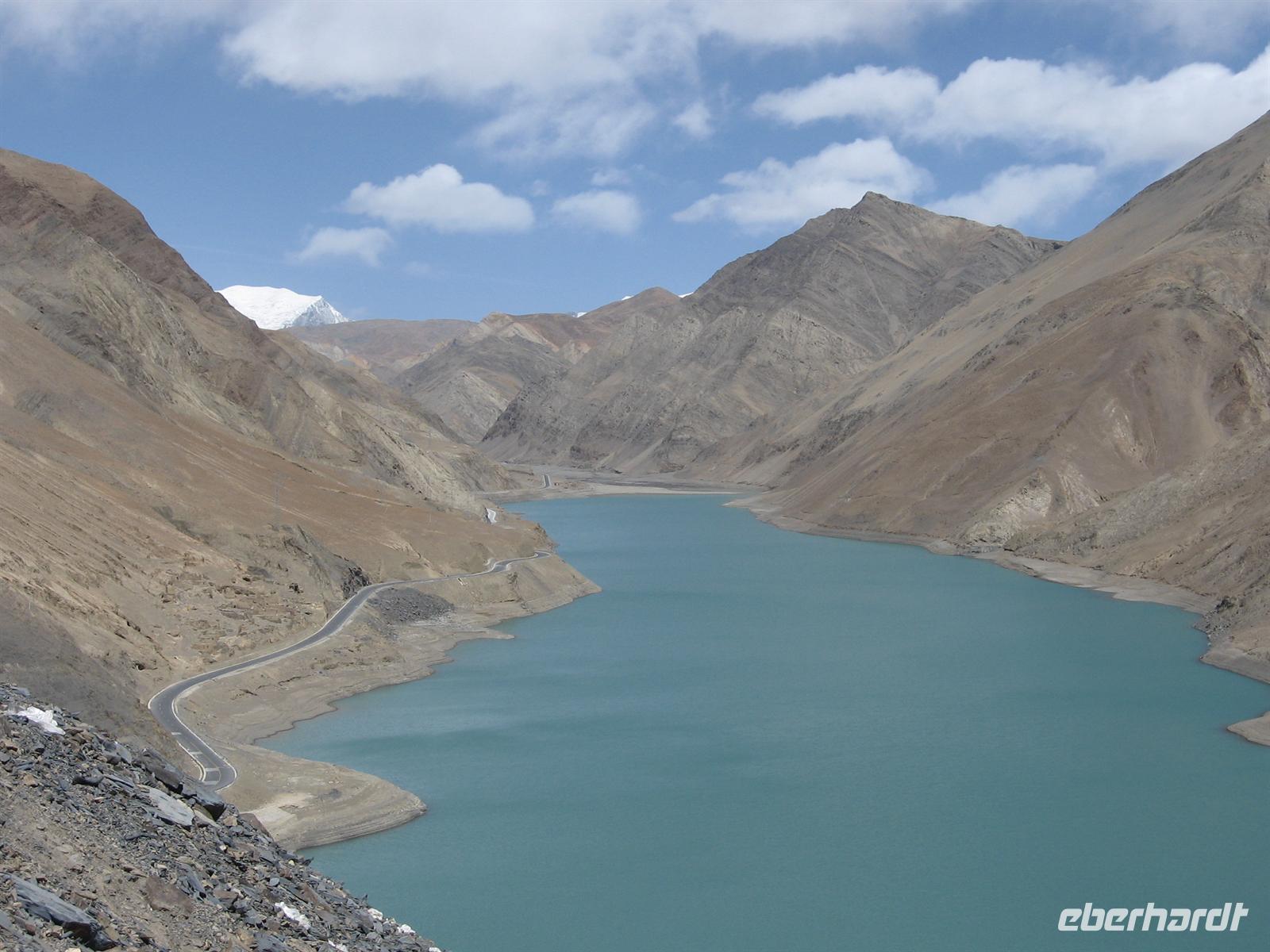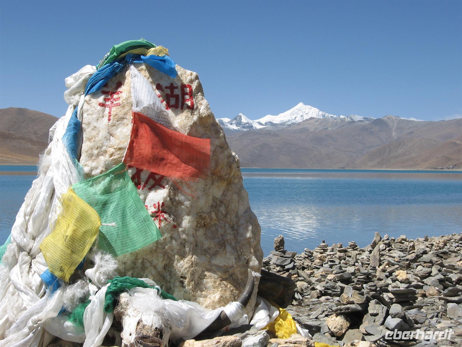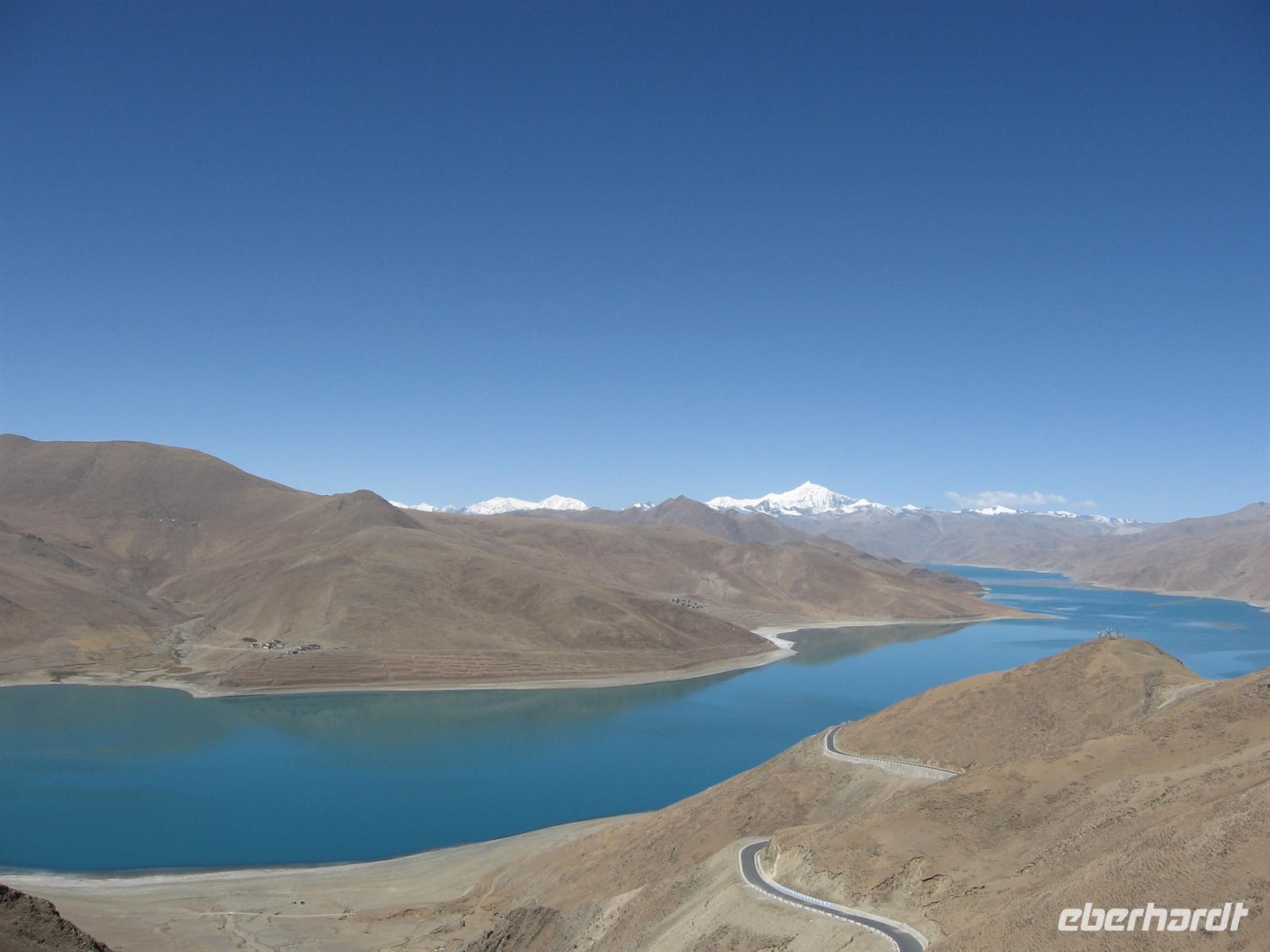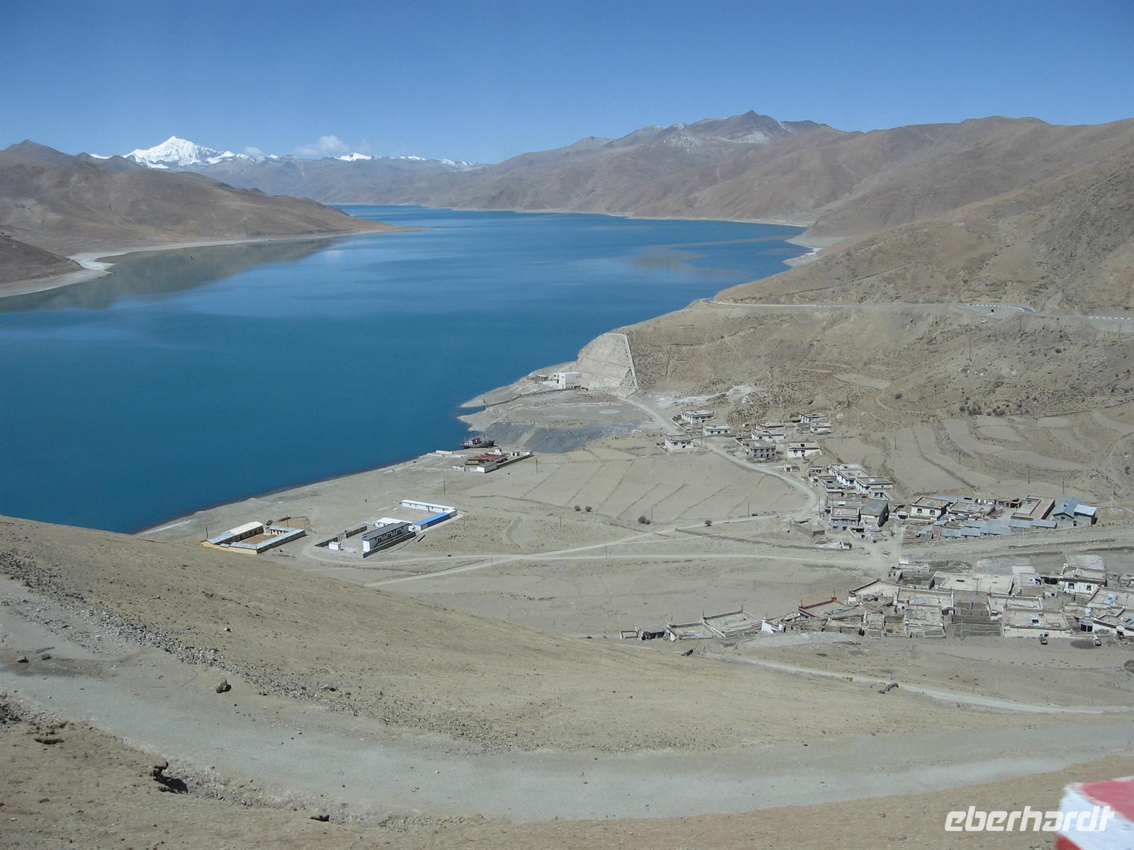 Khamba La mit 4.794 Metern. Von oben ergibt sich ein traumhafter Blick auf See Yamdok Yutsho, welcher durch seine türkis blaue Farbe besticht. Gleichzeitig sehen wir auch schon die ersten schneebedeckten Berge, zwei Spitzen mit den Namen Job und Jomo, was Herr und Herrin bedeutet. Diese Gipfel gehören zu den heiligen Bergen von Zentraltibet. In westlicher Richtung sehen wir unseren ersten 7000'er, den 7.223 Meter hohen Nnöjin-Kangsa. Bei einem Stopp am See können wir ihn vor uns liegend sehr schön fotografieren. Bei unserem Halt am Ufer fallen uns viele kleine Steinpyramiden auf. Dabei handelt es sich um „OMANI“ Steine. OMANI bedeutet: „Oh du Juwel in der Lotosblüte“. Entlang des Sees führt die Straße bis nach Langnazi, wo Zeit für eine Mittagspause ist. Anschließend geht es wieder auf einen Pass: Bei 5.050 Metern passieren wir Karo La. Unterhalb des eigentlichen Passes halten wir und vor uns liegt der ins Tal hinab ragende Gletscher des Nnöjin Kangsa. Hier leben auch einige Hirten. Nach einen Stopp fahren wir zum letzten Pass für heute, dem Semi La auf 4.330 Metern Höhe. Von der Passhöhe blicken wir über den Stausee des 1996 fertiggestellten Wasserkraftwerkes Chakwang. Am späten Nachmittag kommen wir in Gyantse an, ein 6.000 Einwohner zählendes Ackerbauernstädtchen. Es bleibt genug Zeit für einen ersten Erkundungsspaziergang.