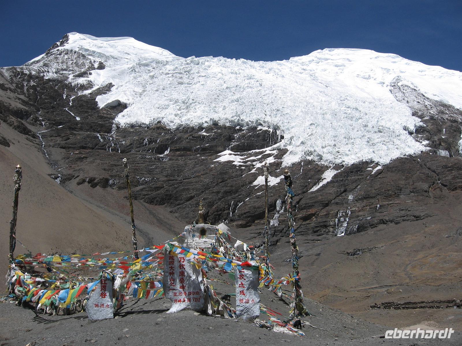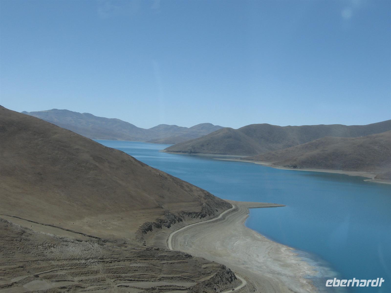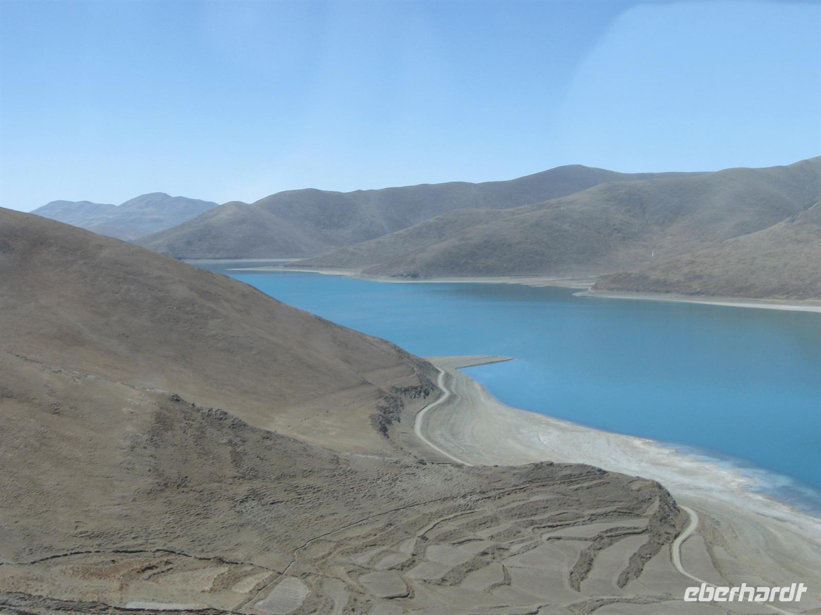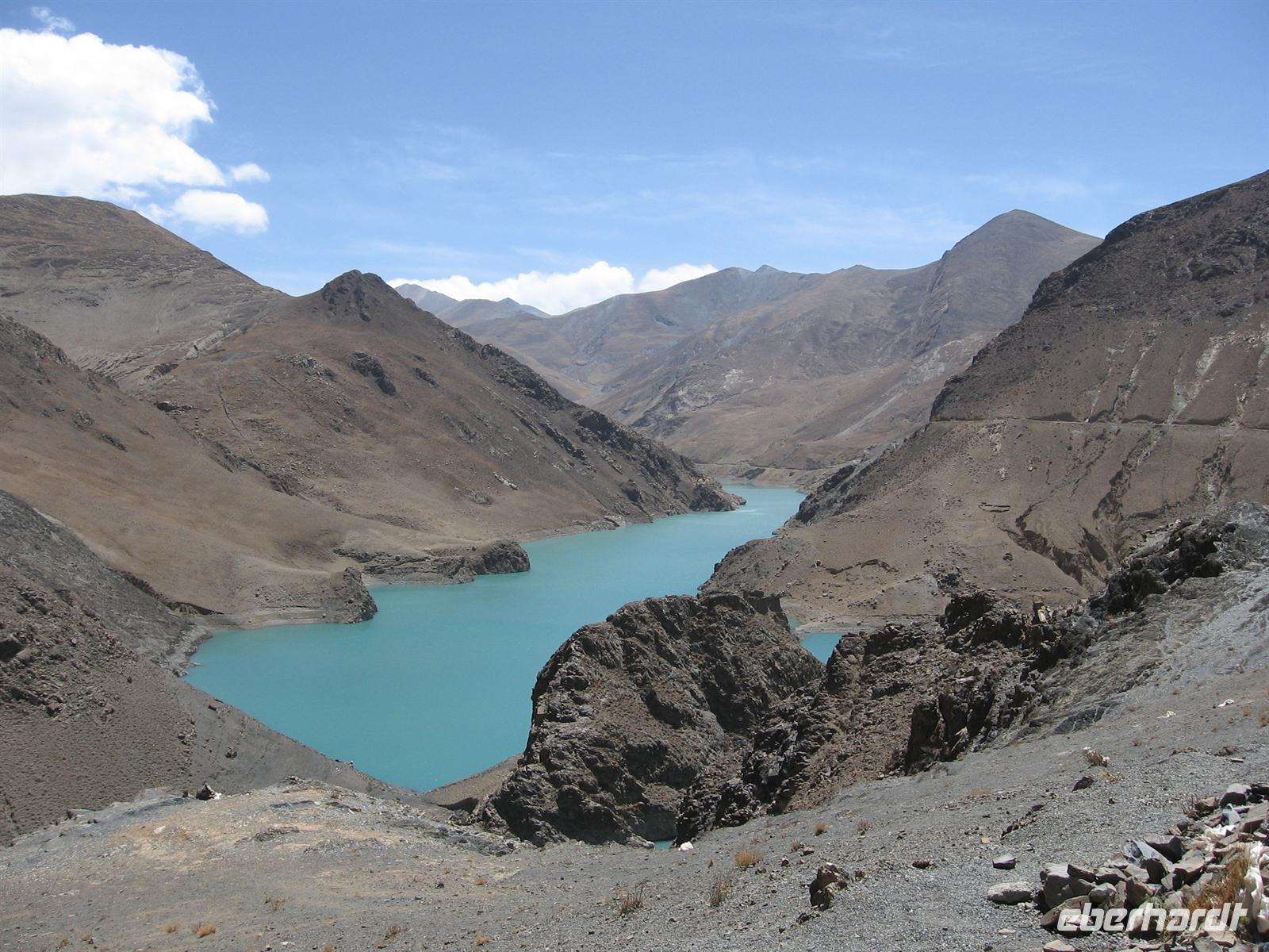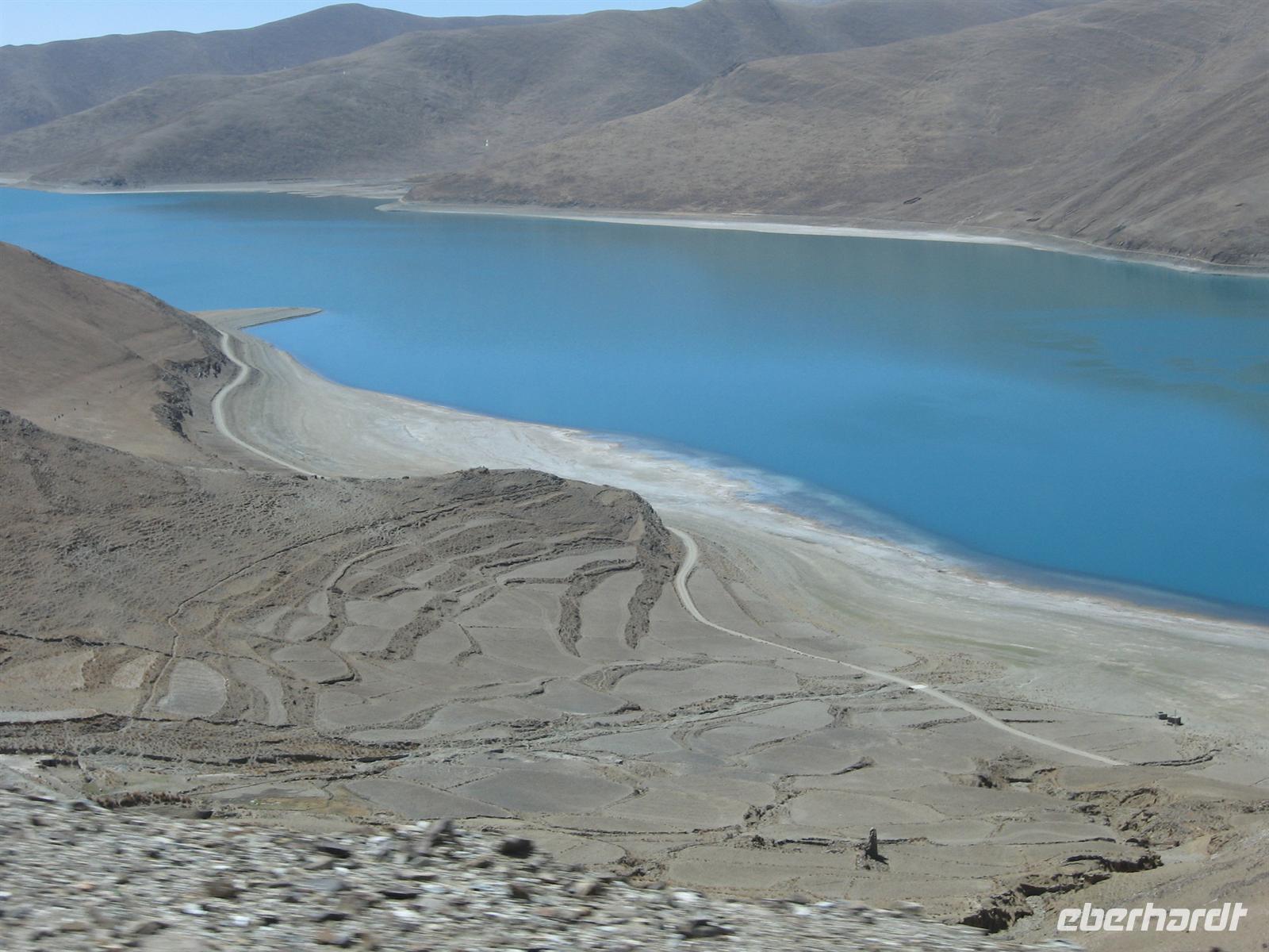 Khamba La mit 4.794 Metern. Von oben ergibt sich ein traumhafter Blick auf See Yamdok Yutsho, welcher durch seine türkis blaue Farbe besticht. Gleichzeitig sehen wir auch schon die ersten schneebedeckten Berge, zwei Spitzen mit den Namen Job und Jomo, was Herr und Herrin bedeutet. Diese Gipfel gehören zu den heiligen Bergen von Zentraltibet. In westlicher Richtung sehen wir unseren ersten 7000'er, den 7.223 Meter hohen Nnöjin-Kangsa. Bei einem Stopp am See können wir ihn vor uns liegend sehr schön fotografieren. Bei unserem Halt am Ufer fallen uns viele kleine Steinpyramiden auf. Dabei handelt es sich um „OMANI“ Steine. OMANI bedeutet: „Oh du Juwel in der Lotosblüte“. Entlang des Sees führt die Straße bis nach Langnazi, wo Zeit für eine Mittagspause ist. Anschließend geht es wieder auf einen Pass: Bei 5.050 Metern passieren wir Karo La. Unterhalb des eigentlichen Passes halten wir und vor uns liegt der ins Tal hinab ragende Gletscher des Nnöjin Kangsa. Hier leben auch einige Hirten. Nach einen Stopp fahren wir zum letzten Pass für heute, dem Semi La auf 4.330 Metern Höhe. Von der Passhöhe blicken wir über den Stausee des 1996 fertiggestellten Wasserkraftwerkes Chakwang. Am späten Nachmittag kommen wir in Gyantse an, ein 6.000 Einwohner zählendes Ackerbauernstädtchen. Es bleibt genug Zeit für einen ersten Erkundungsspaziergang.