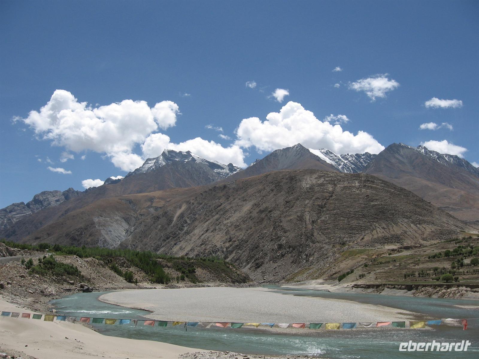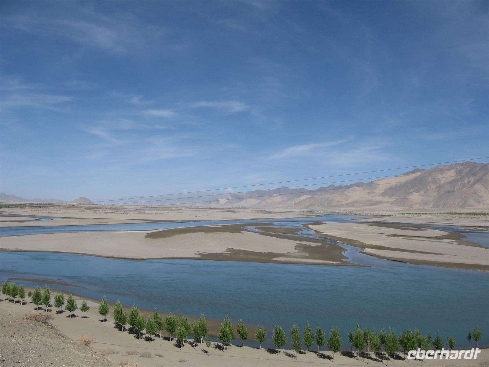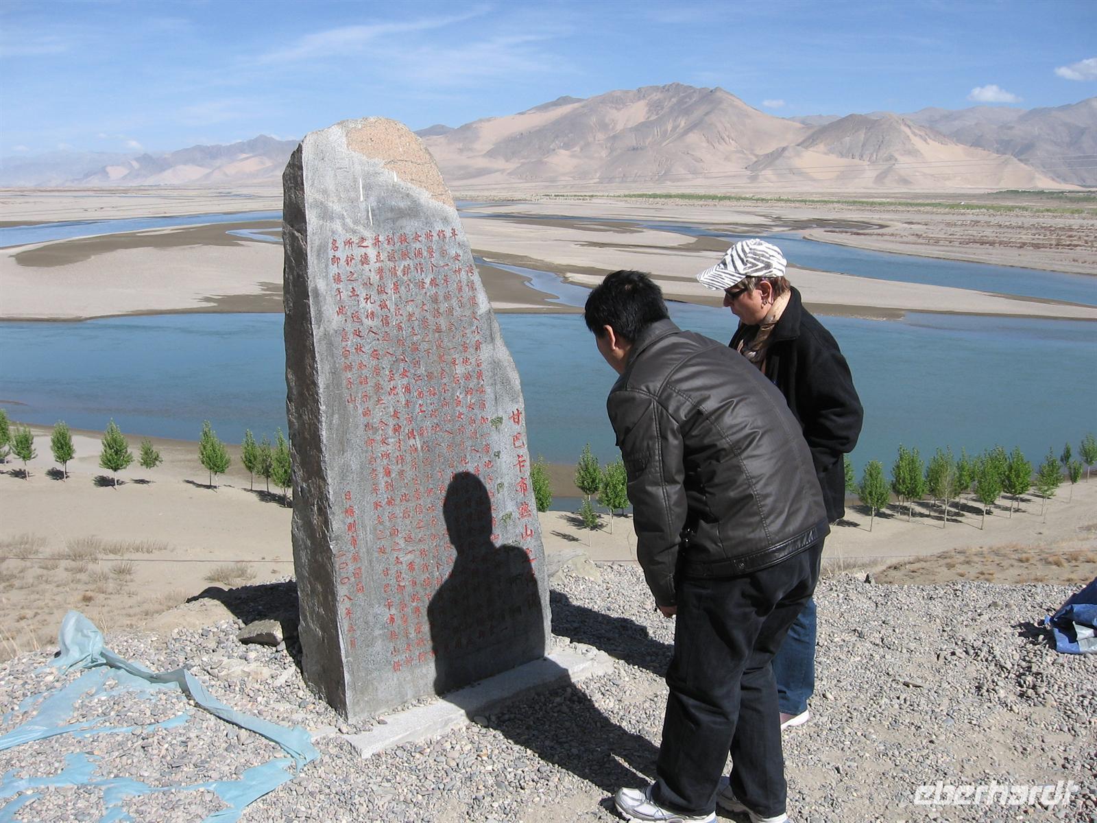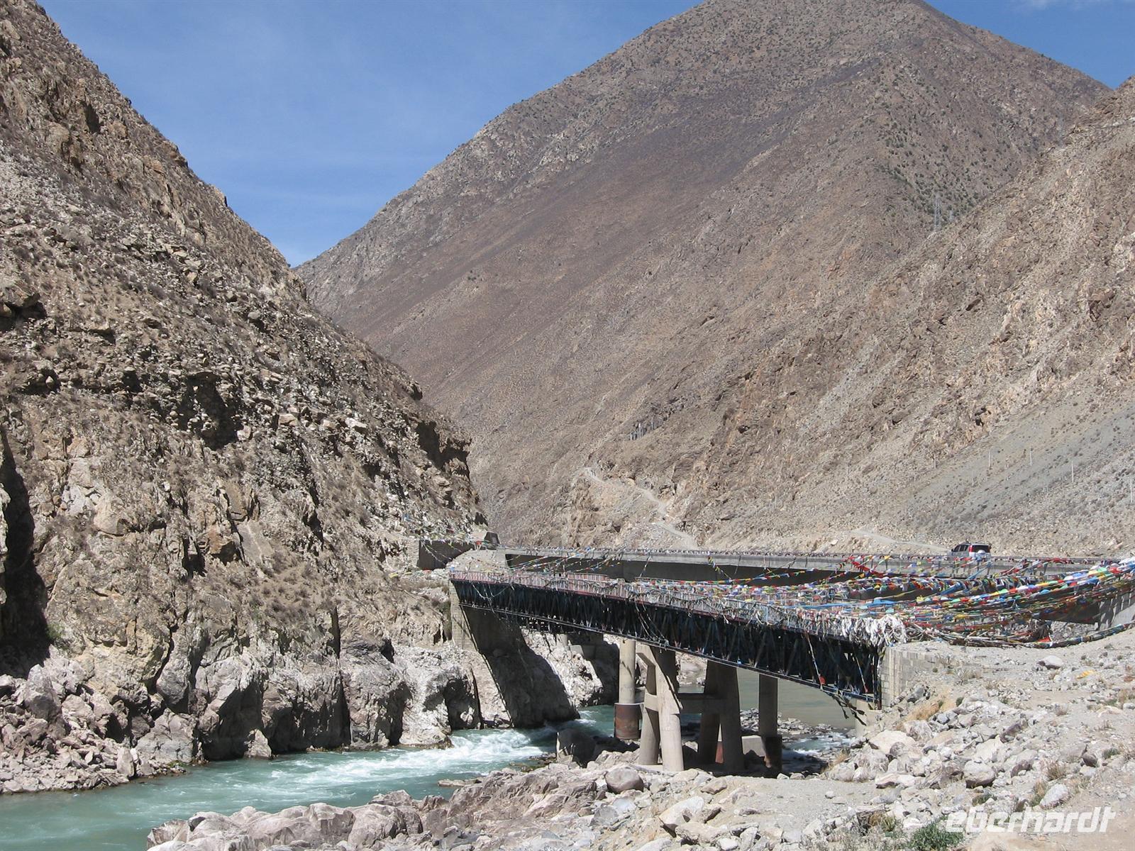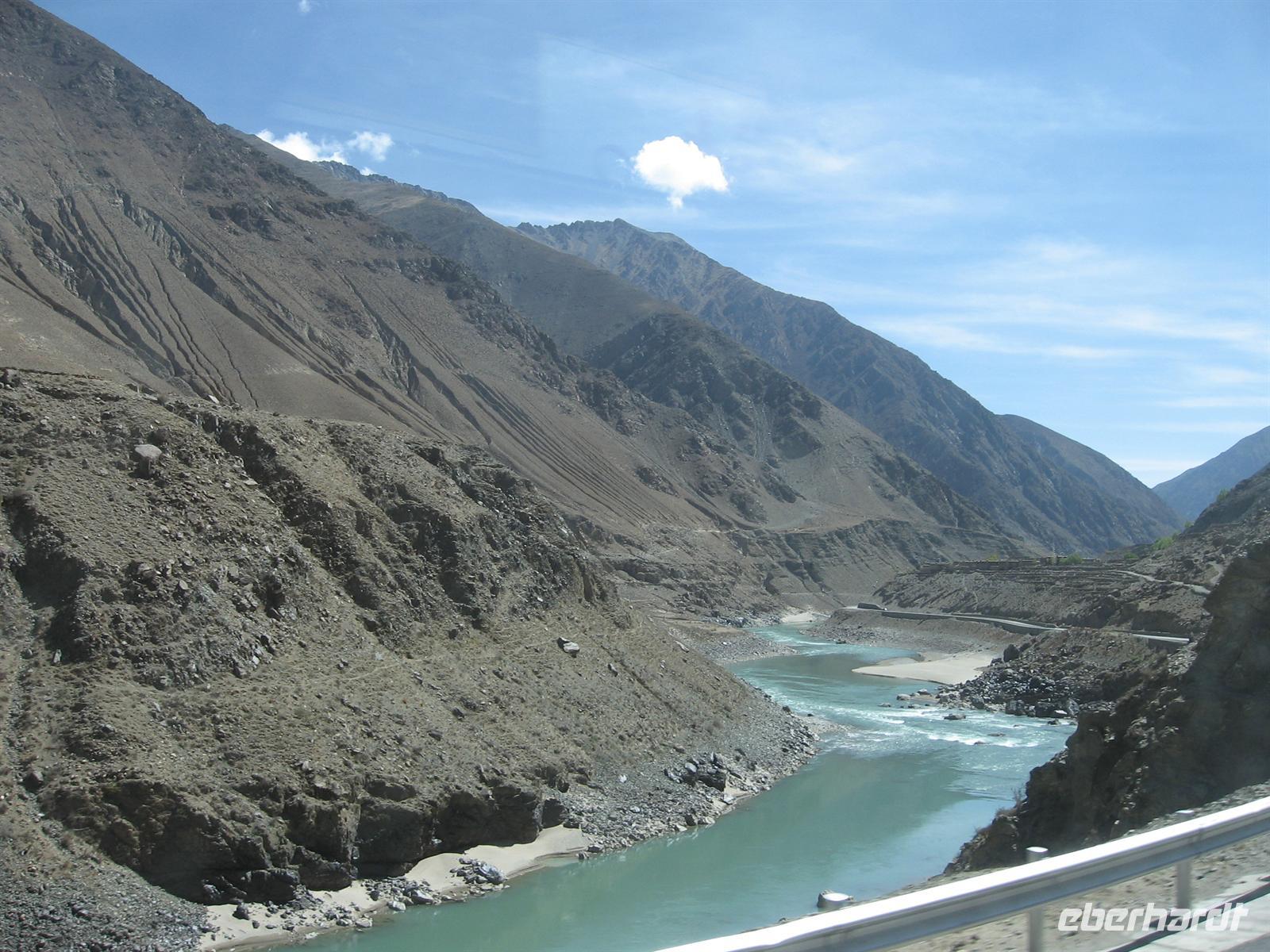 Wir fahren nach Lhasa zurück. Kurz hinter Shikaze passieren wir die erste von drei Geschwindigkeitskontrollen auf unserer Fahrt. Dazu bekommt der Fahrer einen Zettel, auf welchem die Zeit der Abfahrt an der Kontrollstelle eingetragen wird. Für eine Strecke von 90 Kilometern haben wir jetzt zwei Stunden Zeit. Diese Maßnahme dient zur Vermeidung von Unfällen. Kommt der Fahrer zu früh an der nächsten Kontrollstelle an, muss er Strafe zahlen. Die Strecke nach Lhasa führt immer entlang des Brahmaputra durch die große Schlucht.