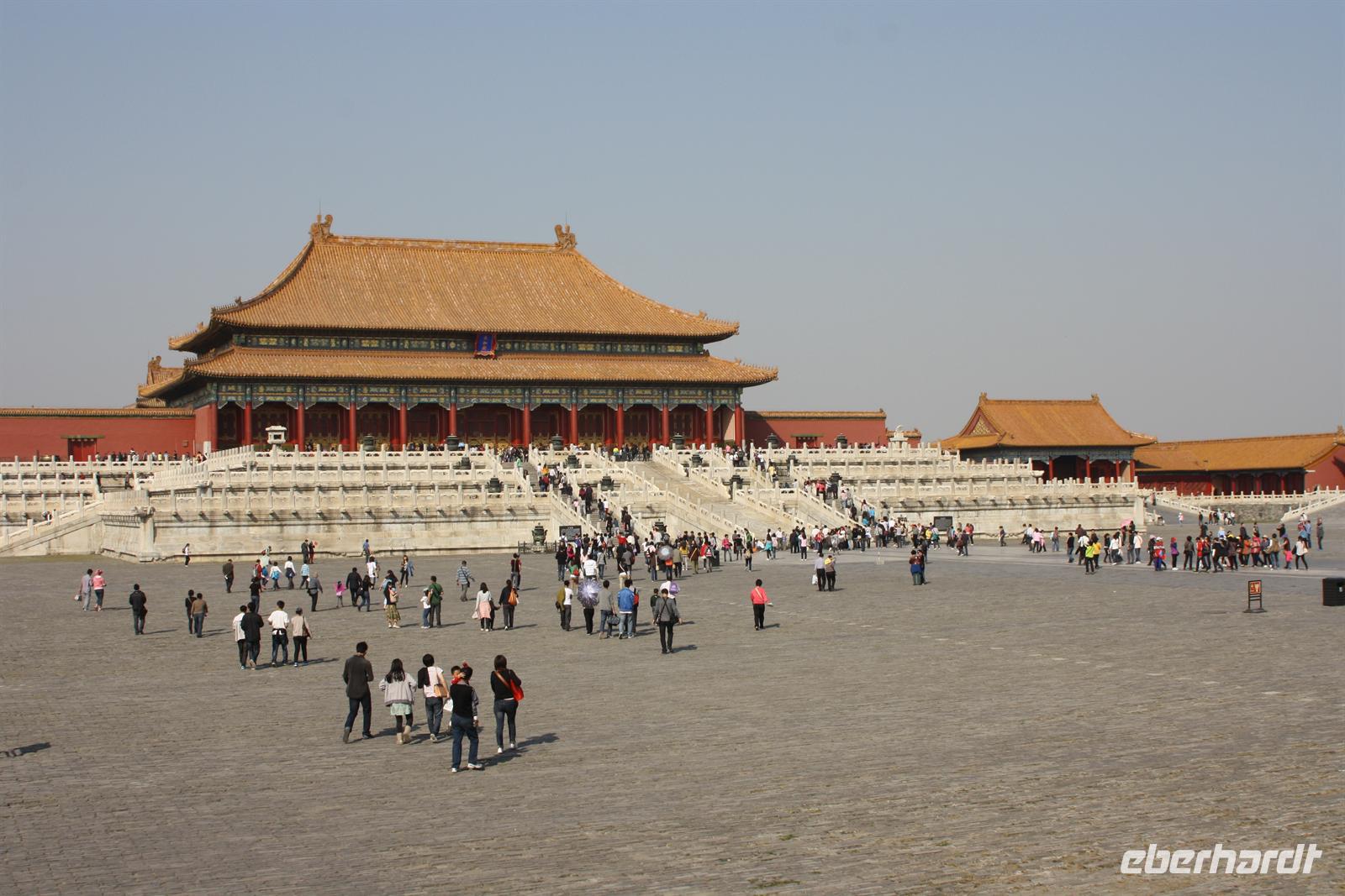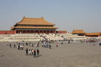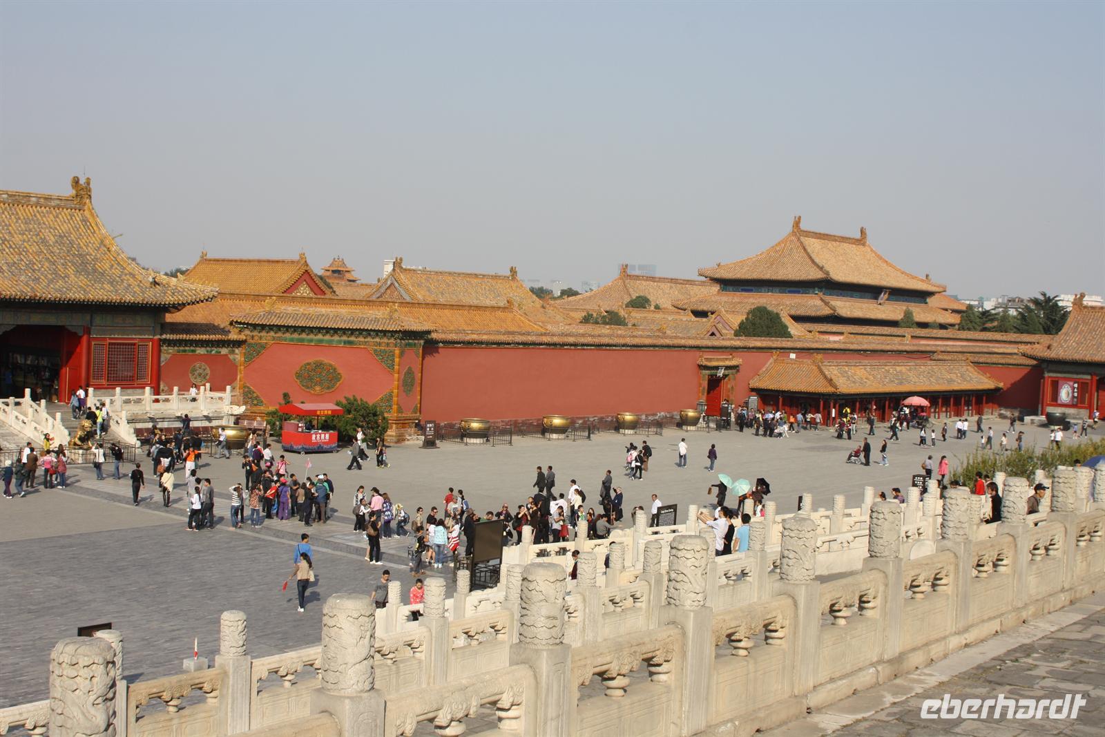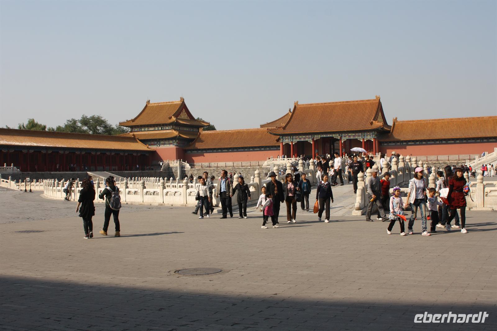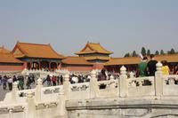 Endlich ist der lang ersehnte Tag der Abreise auf das „Dach der Welt“ gekommen! Von Dresden, Leipzig/Halle und Berlin-Tegel fliegen wir nach Frankfurt, wo uns der Superjumbo A380 von Lufthansa erwartet. Ein riesiger „Vogel“ mit über 500 Sitzplätzen! Nach knapp neun besonders ruhigen Flug-Stunden landen wir in der chinesischen Hauptstadt Peking. Mit unserem örtlichen Reiseleiter Josef fahren wir für eine kurze Erfrischungspause ins Hotel. Anschließend geht es in die „Verbotene Stadt“. Da die Chinesen „goldene Woche“ nach dem Nationalfeiertag haben, ist ganz Peking von einheimischen Touristen bevölkert. Vor den Toren der „Verbotenen Stadt“ verkaufen fliegende Händler jede Menge Klimbim, Hauptsache kitschig. Für uns sollen es wenigstens ein paar Postkarten sein. Hinter den Toren verbergen sich die drei Hallen der Harmonie mit einer beeindruckenden Architektur. Wir wandeln auf des Kaisers Spuren, auf seinen Wegen und Brücken und erfahren viel Wissenswertes über das Leben am Hofe des Kaisers, von Konkubinen und Eunuchen. Bevor wir zum Abendessen fahren, stoppen wir noch am Platz des himmlischen Friedens (Tian'anmen-Platz), der prächtig mit Blumen geschmückt ist. Am Tor des himmlischen Friedens ist das berühmte Bild von Mao Zedong zu sehen und auf dem Nationalmuseum und der Halle des Volkes zeigt China Flagge. Es war ein langer und erlebnisreicher Tag und wir freuen uns dach dem leckeren chinesischen Abendessen auf unser Bett!