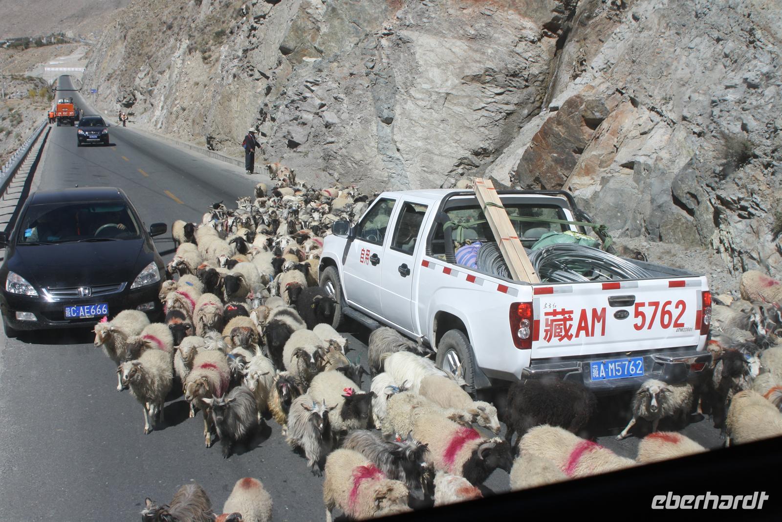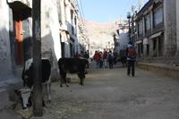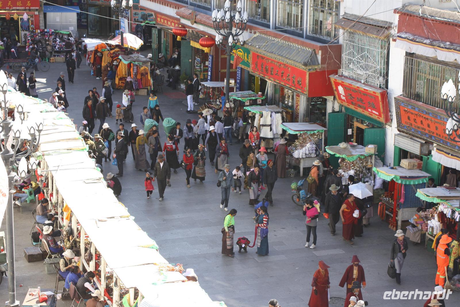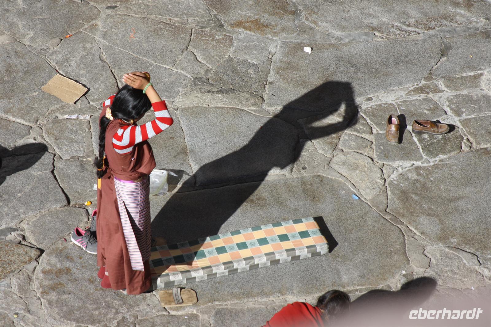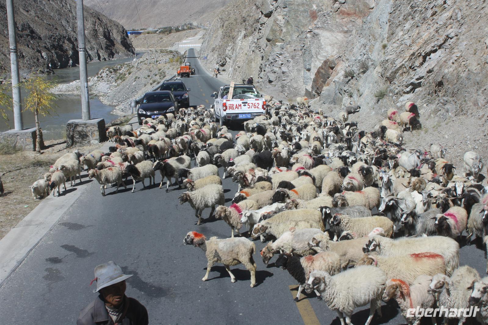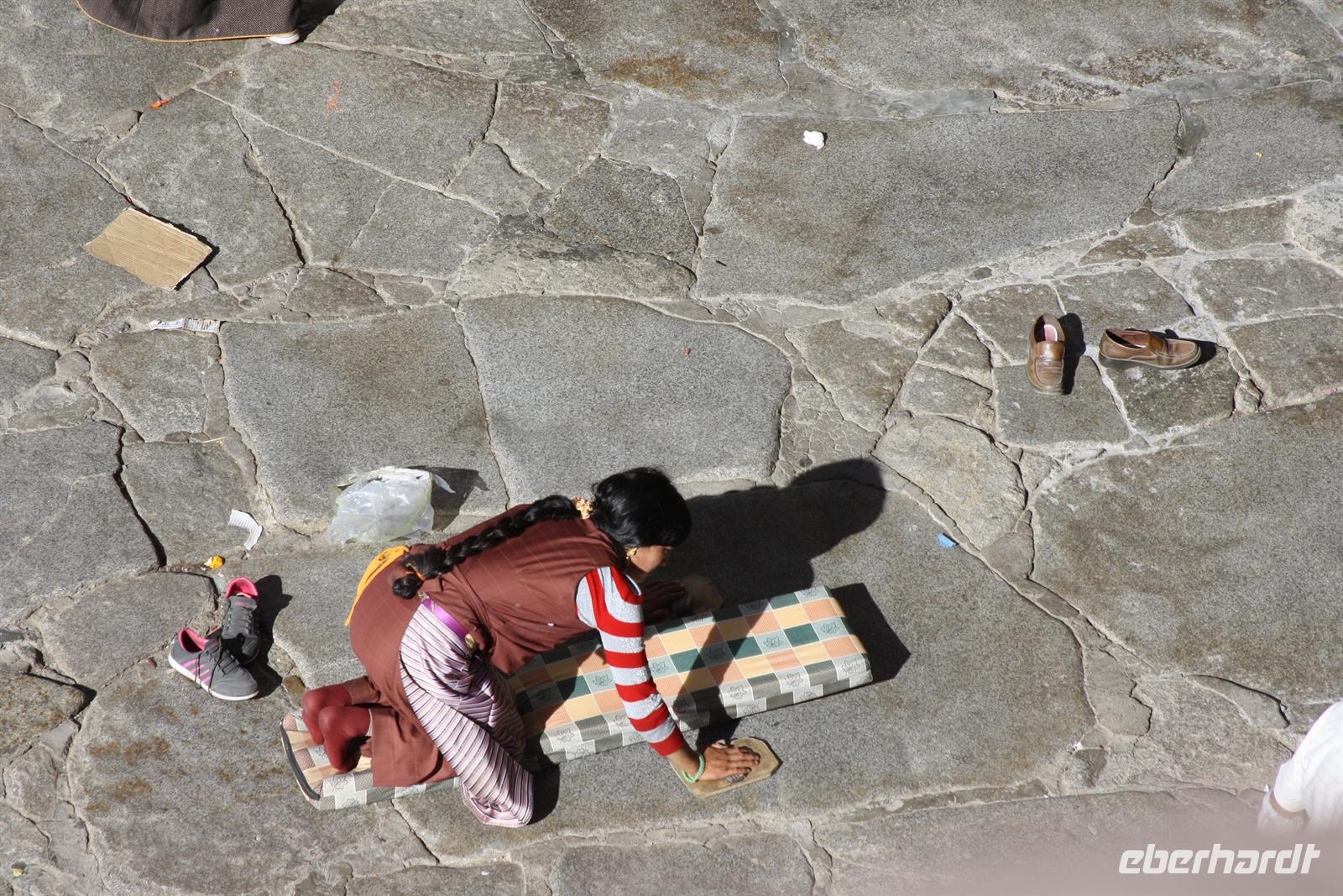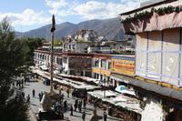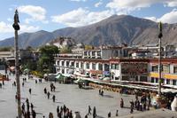 Über die Nordroute fahren wir heute zurück in die Hauptstadt. Entlang der Straße sehen wir des öfteren Pilger und wir geraten auch mal mitten in eine Rinder- oder Schafherde. Nahe eines Hügels legen wir einen Stopp ein - es gibt Geier in dieser Region und somit auch die Möglichkeit für die traditionelle (teure) Himmelsbestattung. Neben der Straße verläuft die zukünftige Bahnstrecke von Lhasa nach Shigatse. Überall sind Baustellen zu sehen, denn bereits in 3 Jahren soll diese Etappe fertig gestellt sein. Über diverse Checkpoints inklusive Passkontrolle erreichen wir schließlich Lhasa. Am Nachmittag besteht noch einmal die Gelegenheit für einen letzten Bummel auf der Barkhor Straße.