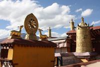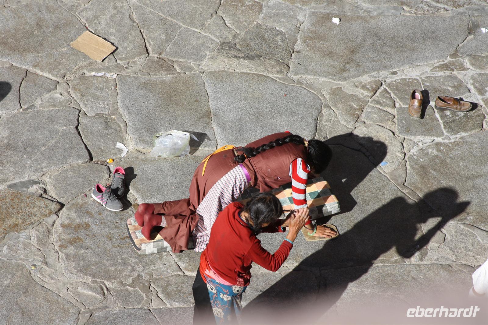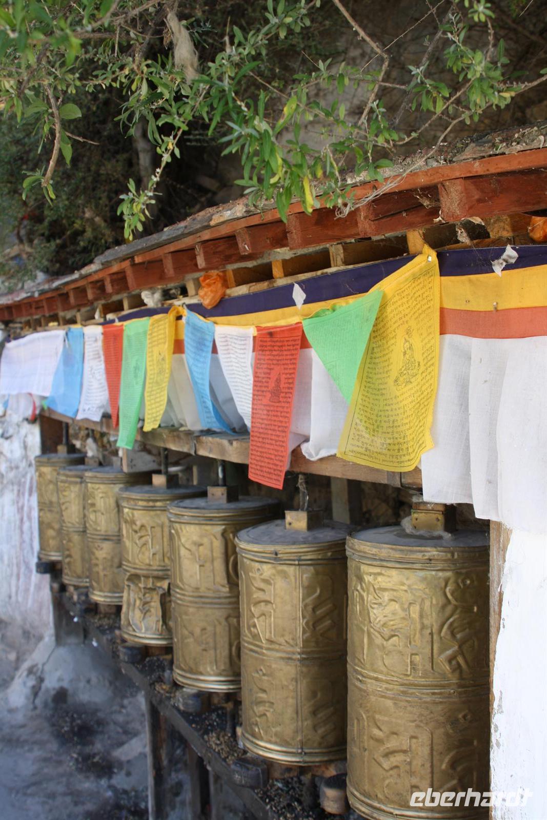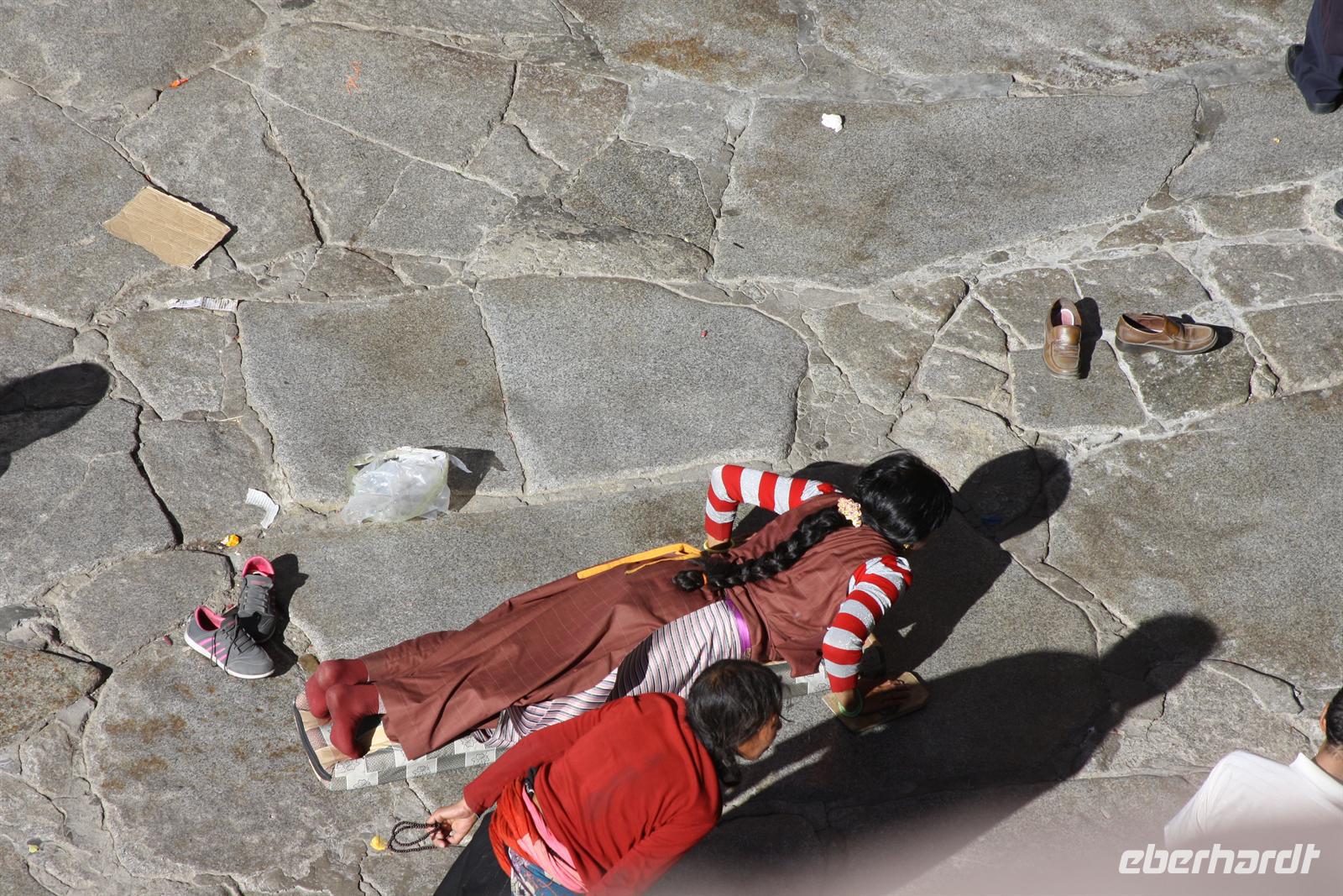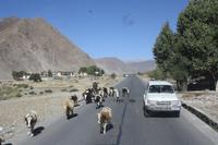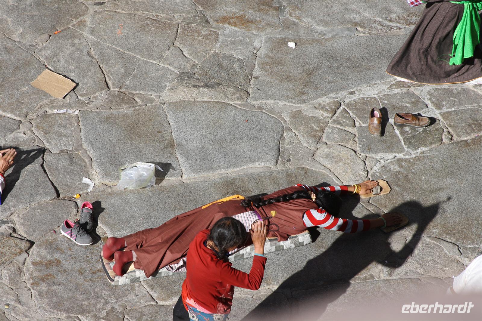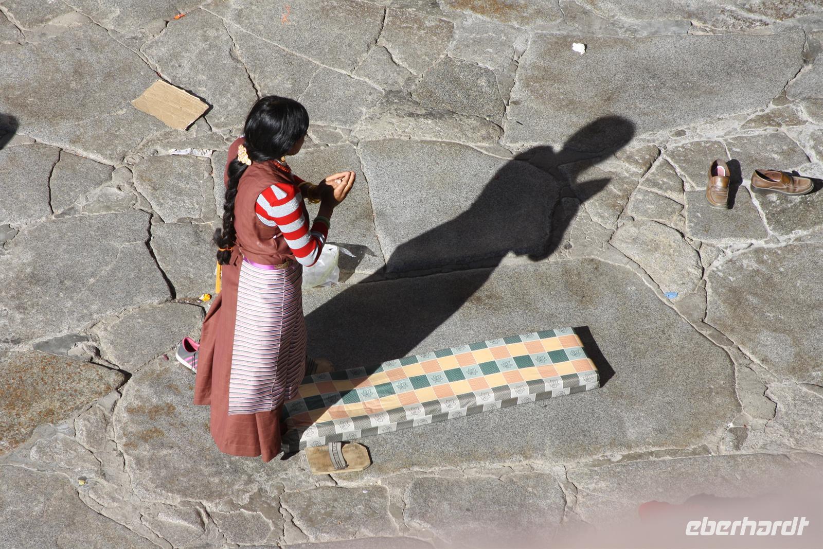 Über die Nordroute fahren wir heute zurück in die Hauptstadt. Entlang der Straße sehen wir des öfteren Pilger und wir geraten auch mal mitten in eine Rinder- oder Schafherde. Nahe eines Hügels legen wir einen Stopp ein - es gibt Geier in dieser Region und somit auch die Möglichkeit für die traditionelle (teure) Himmelsbestattung. Neben der Straße verläuft die zukünftige Bahnstrecke von Lhasa nach Shigatse. Überall sind Baustellen zu sehen, denn bereits in 3 Jahren soll diese Etappe fertig gestellt sein. Über diverse Checkpoints inklusive Passkontrolle erreichen wir schließlich Lhasa. Am Nachmittag besteht noch einmal die Gelegenheit für einen letzten Bummel auf der Barkhor Straße.