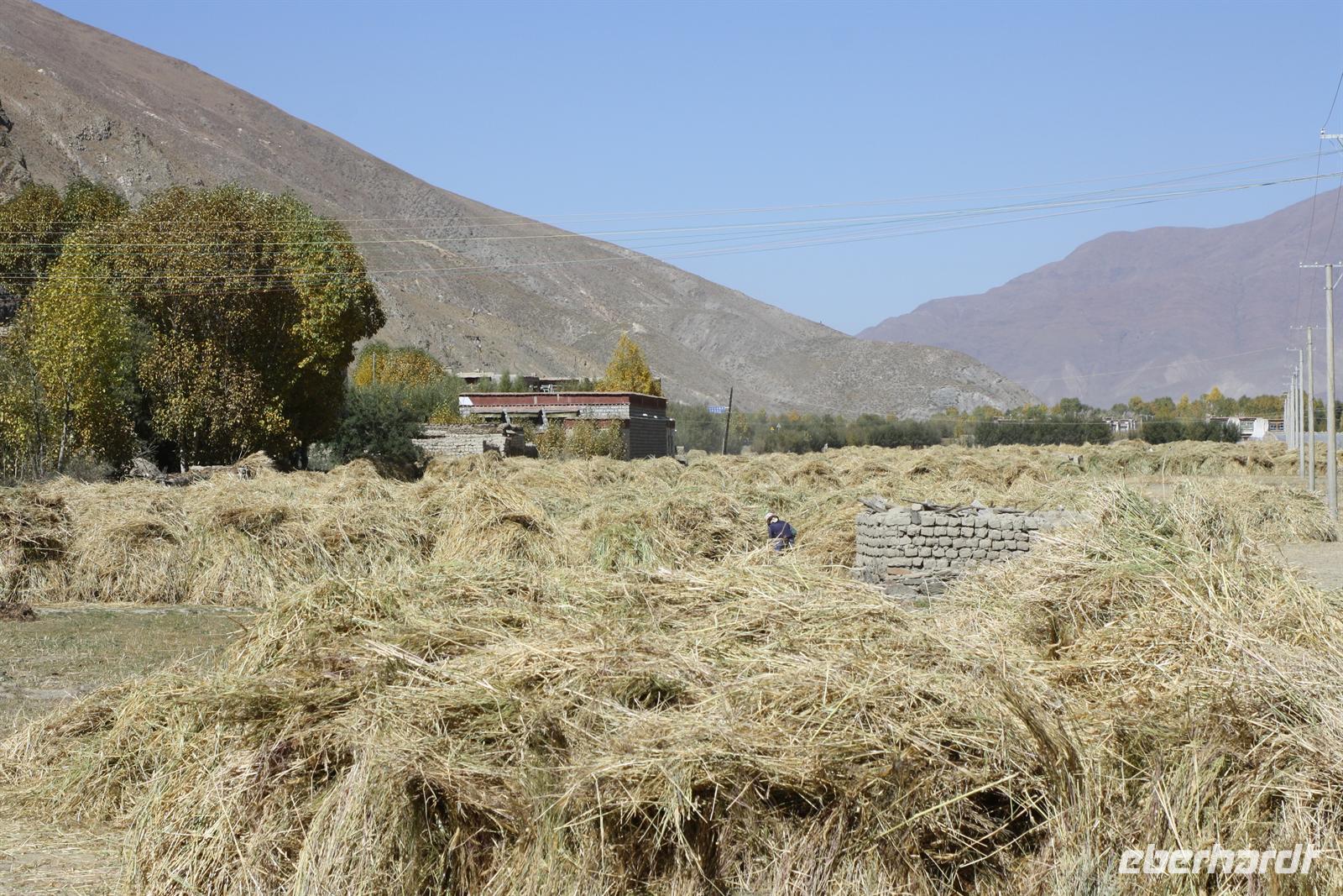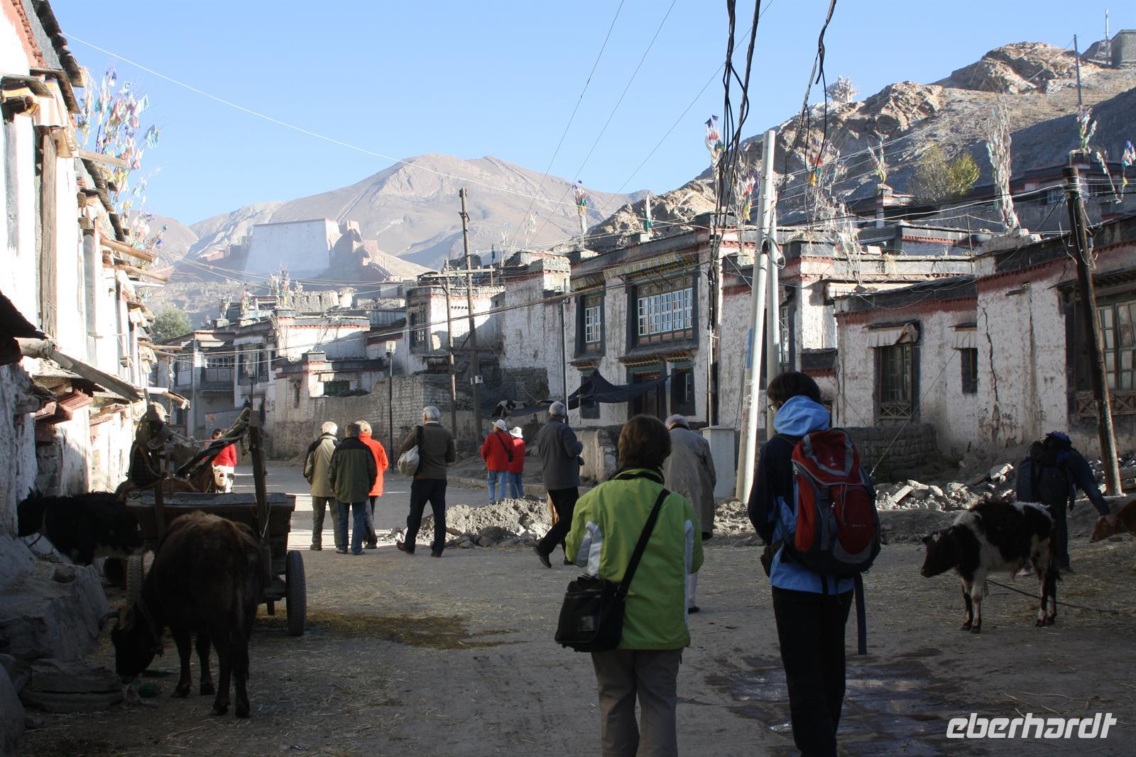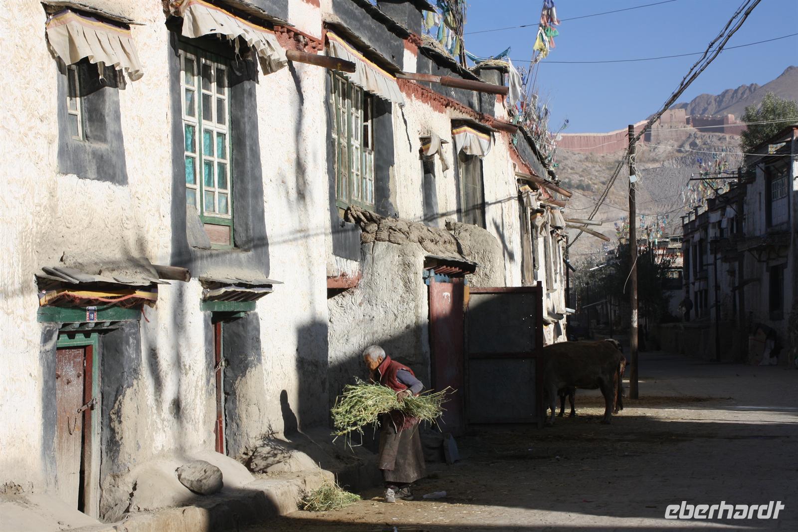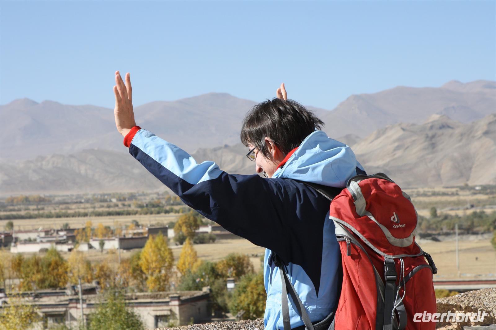 Es war eine frostige Nacht in der Höhe. Nach einem leckeren Frühstück ist unser erster Fotostopp die Festung von Gyantse. Danach spazieren wir durch die Altstadt, die langsam zum Leben erwacht. Im original erhaltenen Palchor Tempel erklärt uns Liu das "Rad des Lebens": Gutes tun und Schlechtes vermeiden ist der Grundgedanke für ein gutes Karma. Besonders selten ist, dass hier drei verschiedene Sekten vereint sind. Schließlich erklimmen einige noch den größten Stupa Tibets, der in Form eines Mandala gebaut wurde. Es sollen 100.000 Buddhas sein, tatsächlich sind es aber nur circa 20.000! Auf dem Weg nach Shigatse durchqueren wir die „Kornkammer“ Tibets. Da gerade Erntezeit ist, herrscht reges Treiben auf den Feldern. Die ganze Familie hilft bei der Ernte der Gerste. In einem kleinen Dorf stoppen wir und können uns die traditionellen Häuser näher anschauen. Der Dung der Yaks wird an den Hausmauern getrocknet und im Winter als Brennmaterial verwendet.