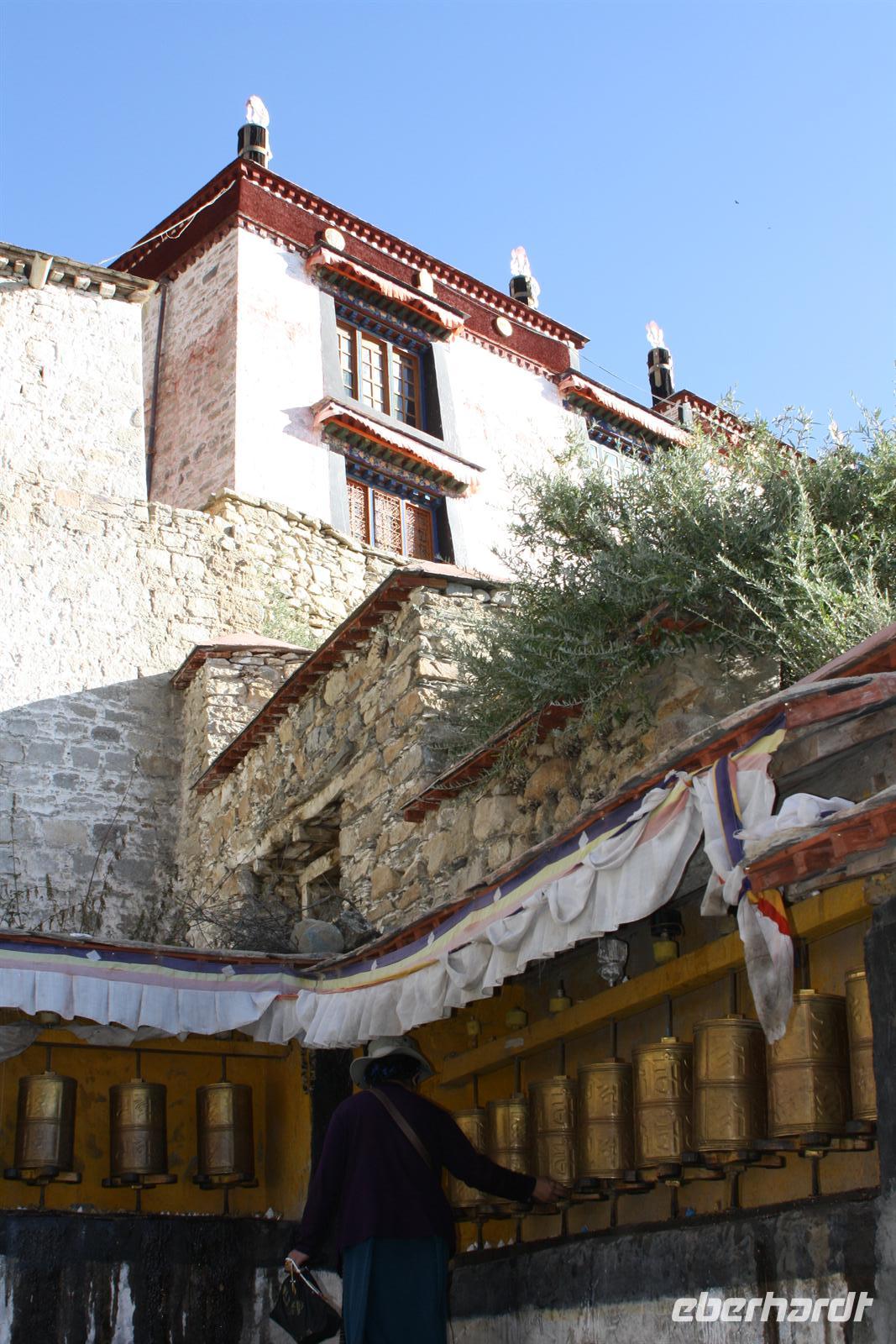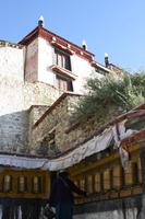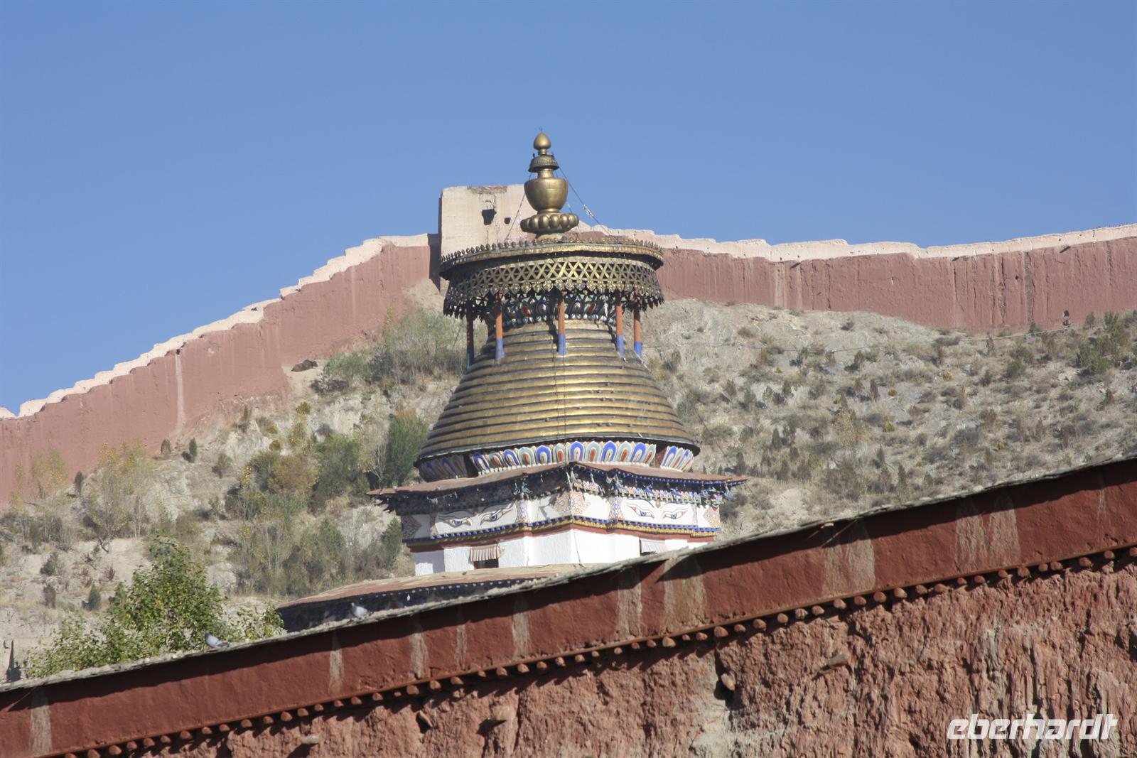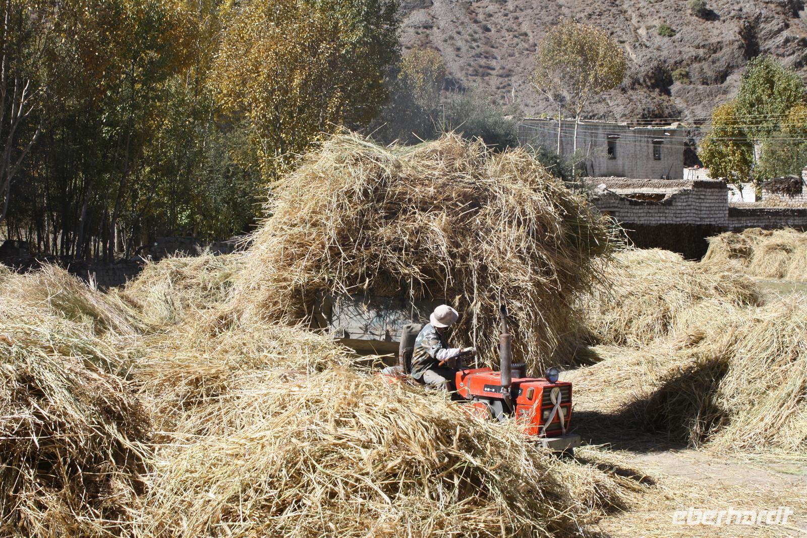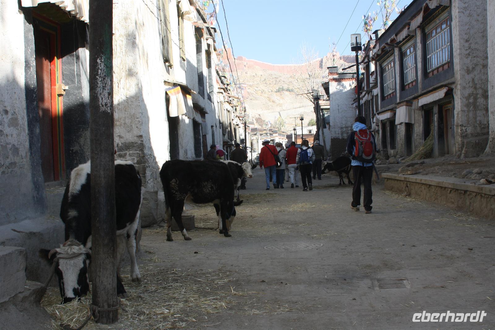 Es war eine frostige Nacht in der Höhe. Nach einem leckeren Frühstück ist unser erster Fotostopp die Festung von Gyantse. Danach spazieren wir durch die Altstadt, die langsam zum Leben erwacht. Im original erhaltenen Palchor Tempel erklärt uns Liu das "Rad des Lebens": Gutes tun und Schlechtes vermeiden ist der Grundgedanke für ein gutes Karma. Besonders selten ist, dass hier drei verschiedene Sekten vereint sind. Schließlich erklimmen einige noch den größten Stupa Tibets, der in Form eines Mandala gebaut wurde. Es sollen 100.000 Buddhas sein, tatsächlich sind es aber nur circa 20.000! Auf dem Weg nach Shigatse durchqueren wir die „Kornkammer“ Tibets. Da gerade Erntezeit ist, herrscht reges Treiben auf den Feldern. Die ganze Familie hilft bei der Ernte der Gerste. In einem kleinen Dorf stoppen wir und können uns die traditionellen Häuser näher anschauen. Der Dung der Yaks wird an den Hausmauern getrocknet und im Winter als Brennmaterial verwendet.