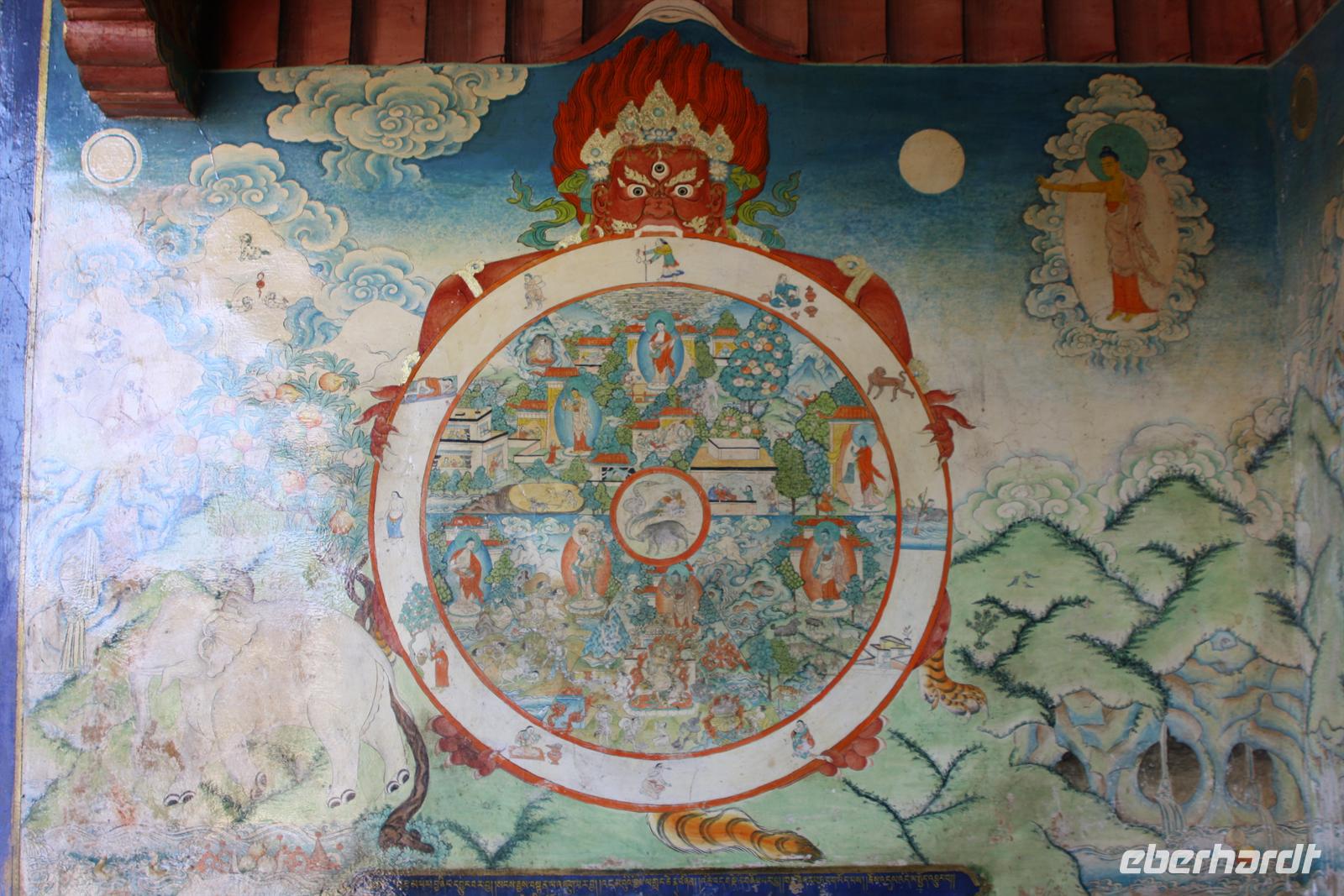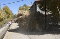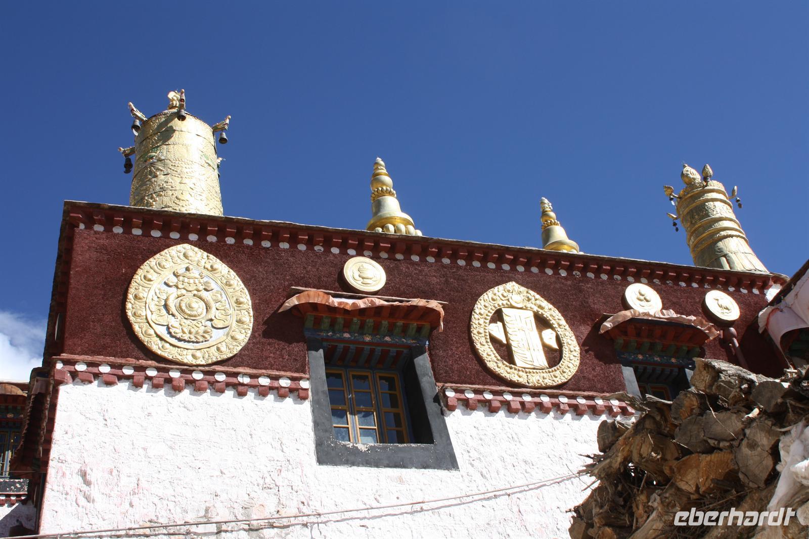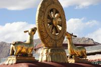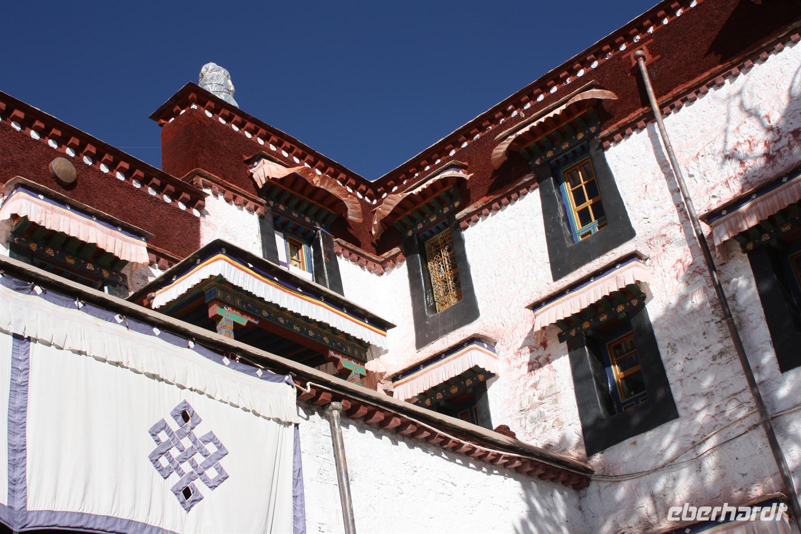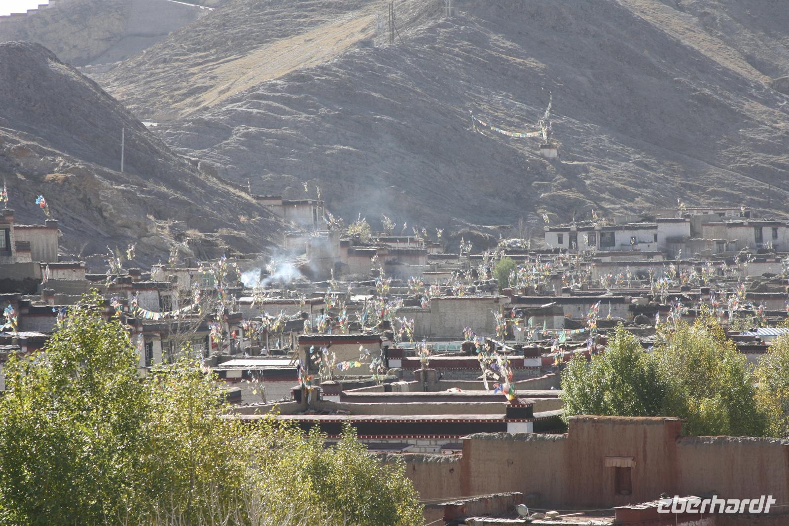 Es war eine frostige Nacht in der Höhe. Nach einem leckeren Frühstück ist unser erster Fotostopp die Festung von Gyantse. Danach spazieren wir durch die Altstadt, die langsam zum Leben erwacht. Im original erhaltenen Palchor Tempel erklärt uns Liu das "Rad des Lebens": Gutes tun und Schlechtes vermeiden ist der Grundgedanke für ein gutes Karma. Besonders selten ist, dass hier drei verschiedene Sekten vereint sind. Schließlich erklimmen einige noch den größten Stupa Tibets, der in Form eines Mandala gebaut wurde. Es sollen 100.000 Buddhas sein, tatsächlich sind es aber nur circa 20.000! Auf dem Weg nach Shigatse durchqueren wir die „Kornkammer“ Tibets. Da gerade Erntezeit ist, herrscht reges Treiben auf den Feldern. Die ganze Familie hilft bei der Ernte der Gerste. In einem kleinen Dorf stoppen wir und können uns die traditionellen Häuser näher anschauen. Der Dung der Yaks wird an den Hausmauern getrocknet und im Winter als Brennmaterial verwendet.