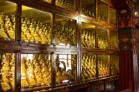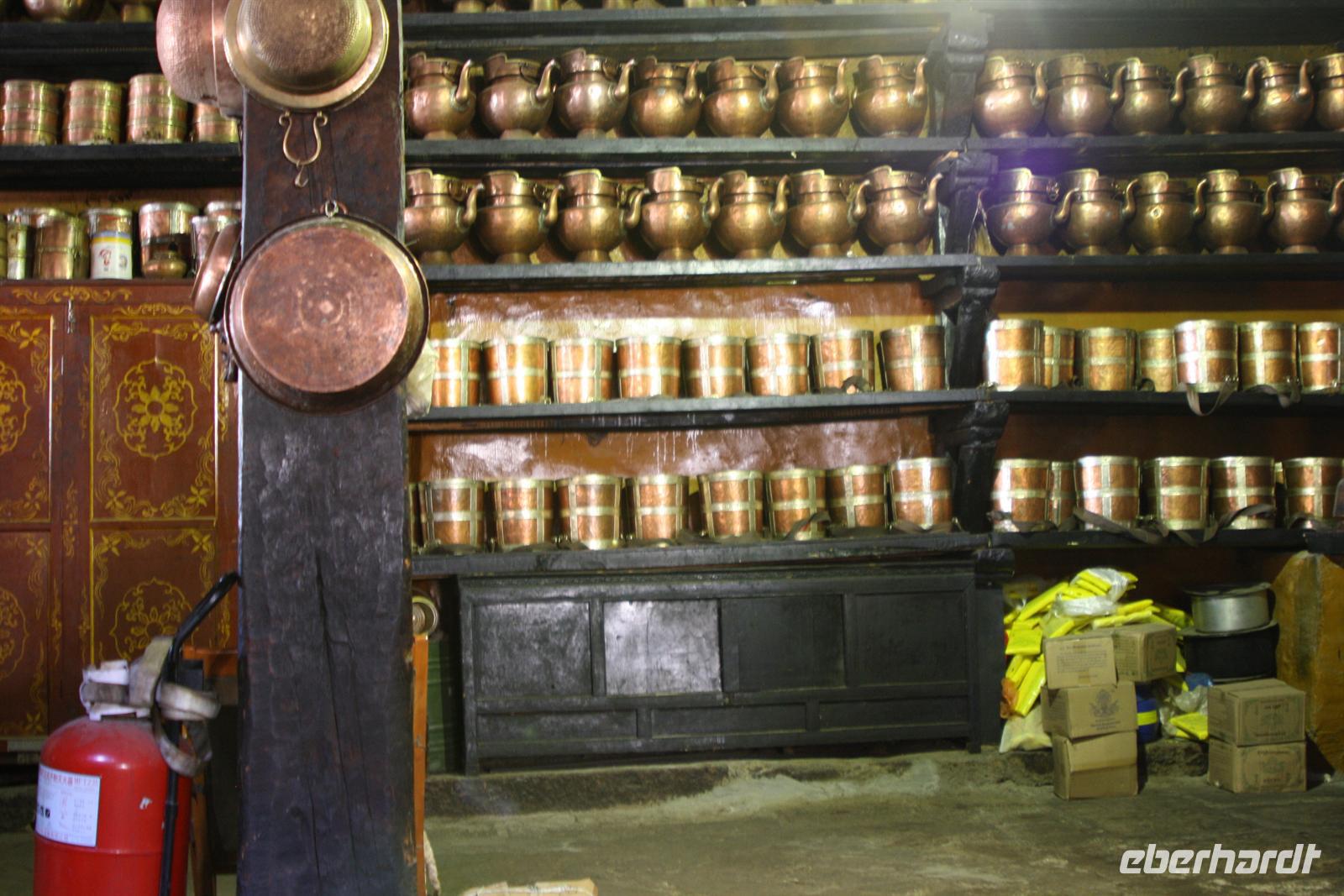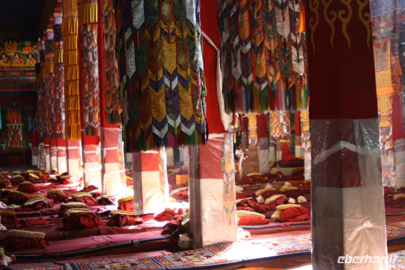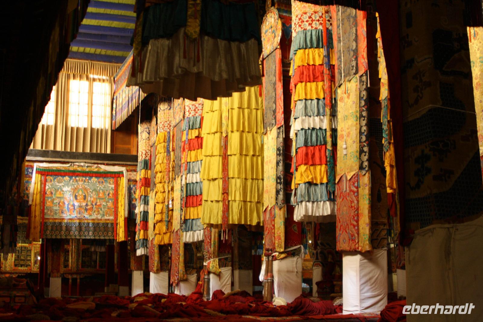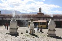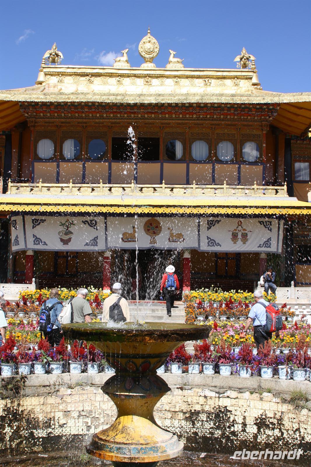 Die Nacht war für die meisten von uns recht kurz, denn die Höhe macht sich doch oft durch Kopfschmerzen bemerkbar. Bei aller Harmonie der Tibeter, im Straßenverkehr ist davon nicht viel zu merken, denn auch das abendliche Hupkonzert auf der Straße raubt uns die Nachtruhe. Nach dem europäischen Frühstück fahren wir mit dem Bus zunächst in das größte Kloster Tibets - das Drepung Kloster. Die günstige Lage zwischen Bergen und Fluss verleiht diesem Kloster der Gelugpa-Sekte ein besonders gutes Feng Shui! Auf dem Weg zum Kloster sehen wir, wie Händler ihre Souvenirstände aufbauen - alles erwacht langsam zum Leben. Nun heißt es tief Luft holen und vor allem langsam gehen! Jede Treppenstufe ist anstrengend, aber die ersten Eindrücke lassen uns nur staunen. Schon jetzt sind viele Pilger unterwegs und murmeln das Mantra „Om mani padme hum“, was soviel heißt wie „Oh du Kleinod in der Lotusblüte“. Durch das Drehen der Gebetsmühlen im Uhrzeigersinn werden ebenfalls die Mantras frei gesetzt. Für uns ist es ein schönes Bild, für die Tibeter ist es Tradition und Teil ihres tiefen Glaubens. Vom Kloster aus haben wir einen fantastischen Blick auf Lhasa und das atemberaubende Gebirgspanorama unter dem strahlend blauen Himmel Tibets. Die goldenen Stupa und Verzierungen glänzen in der Sonne - ein wundervoll harmonisches Fleckchen Erde! In den verschiedenen Hallen brennen die Butterlampen, die für unsere Nasen doch recht gewöhnungsbedürftig sind. Oft beobachten wir die Tibeter mit Thermoskannen, um die Lampen mit flüssiger Butter aufzufüllen. Es befinden sich zahlreiche große und kleine Buddha-Statuen in den Hallen, die von den vielen Pilgern verehrt werden. Es darf gern gespendet werden. Wir tun dies in Form der Fotoerlaubnis . Jede Halle wird im Uhrzeigersinn durchschritten und jeder Schritt kostet uns Kraft. Nach dem Drepung Kloster besuchen wir noch das nahe gelegene Nechung Kloster. Eine Mittagspause im Hotel lässt uns wieder Energie tanken für den Nachmittagsausflug zum Sera Kloster. Besonders eindrucksvoll sind hier die drei kunstvoll gestalteten Sand-Mandalas. Und alsbald begegnen wir vielen glücklichen Kindern mit einem schwarzen Strich auf der Nase. Mit Opfergaben und Spenden bitten die Pilger um diese Geste der Mönche, denn es soll Glück bringen! Im Sera Kloster üben sich die jungen Mönche im Debattieren und wir können zusehen. Am Abend gibt es wieder ein hervorragendes Essen in einem örtlichen Restaurant.
