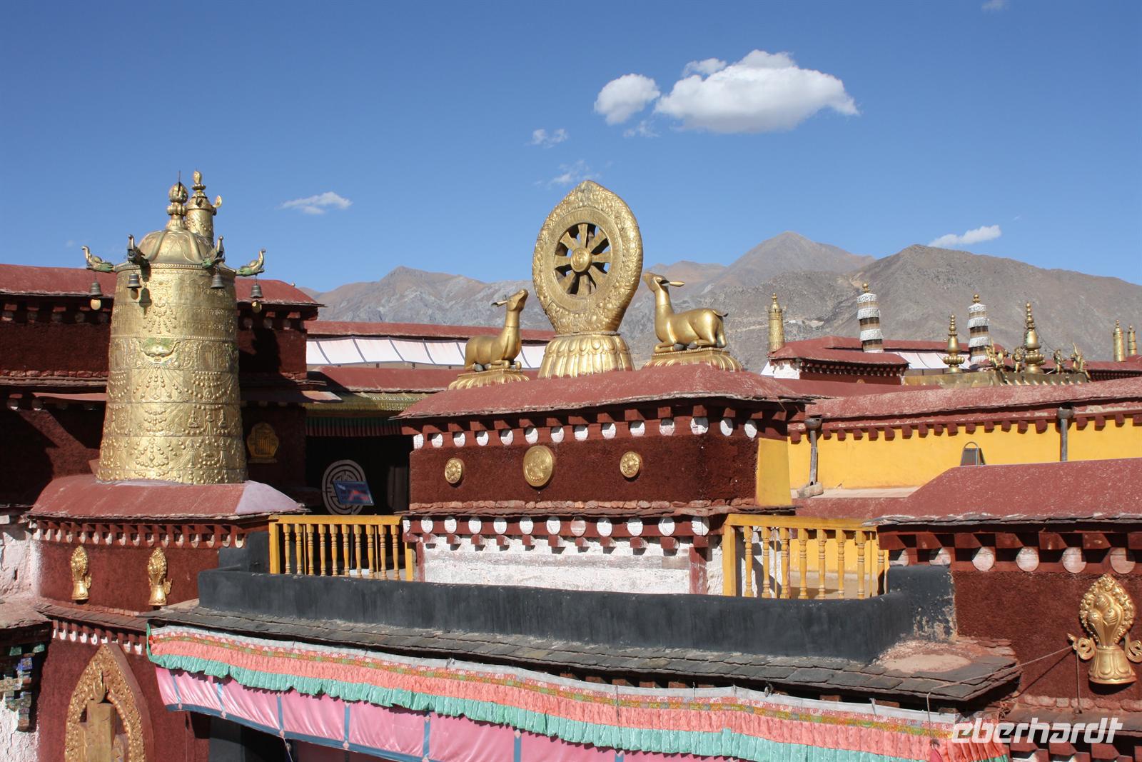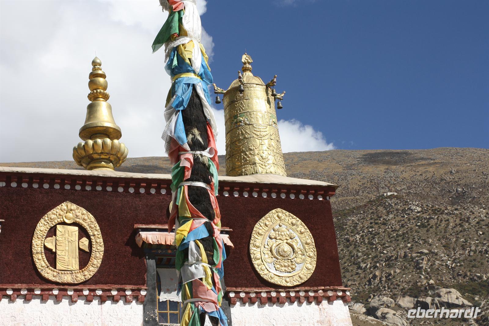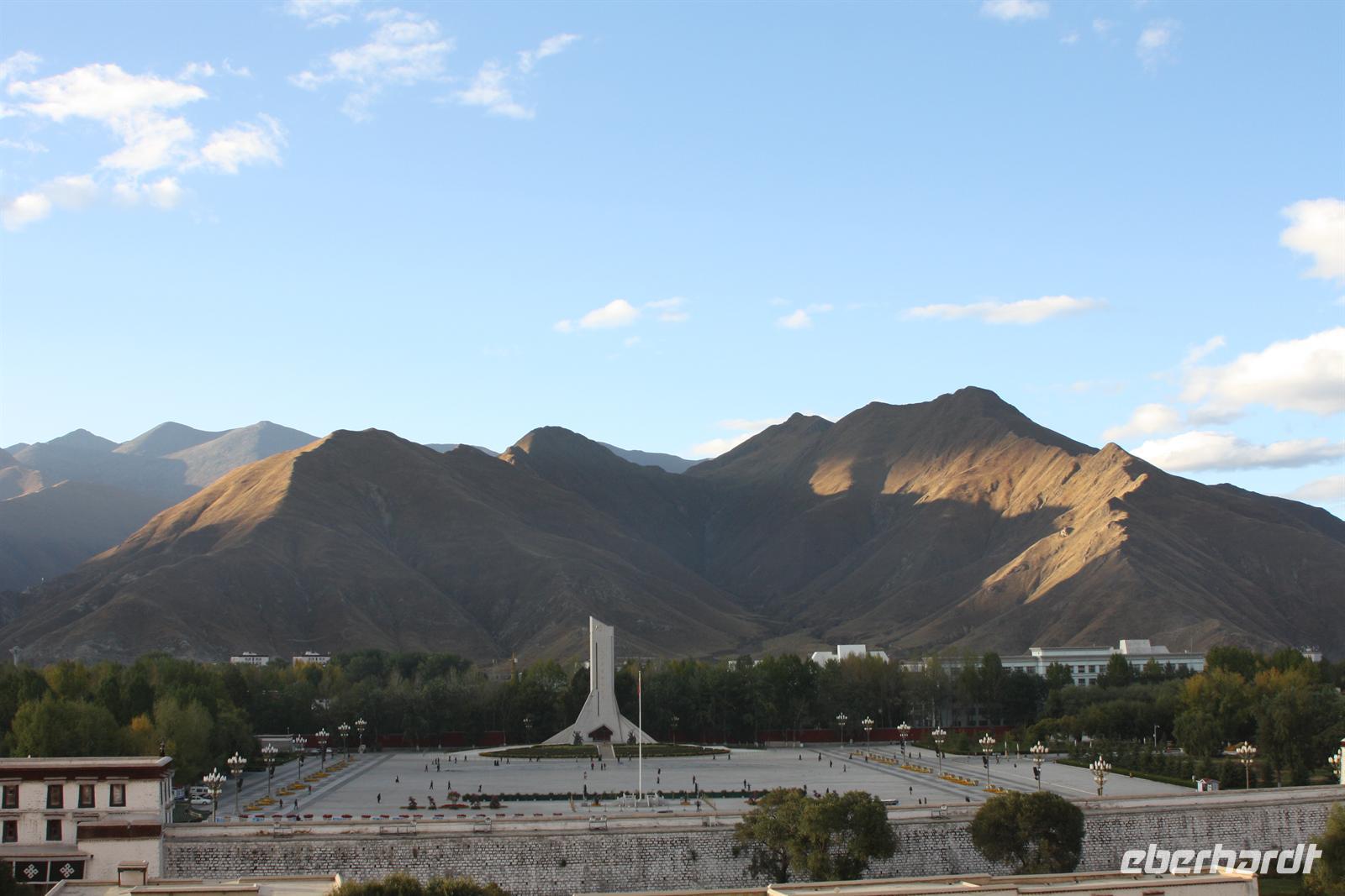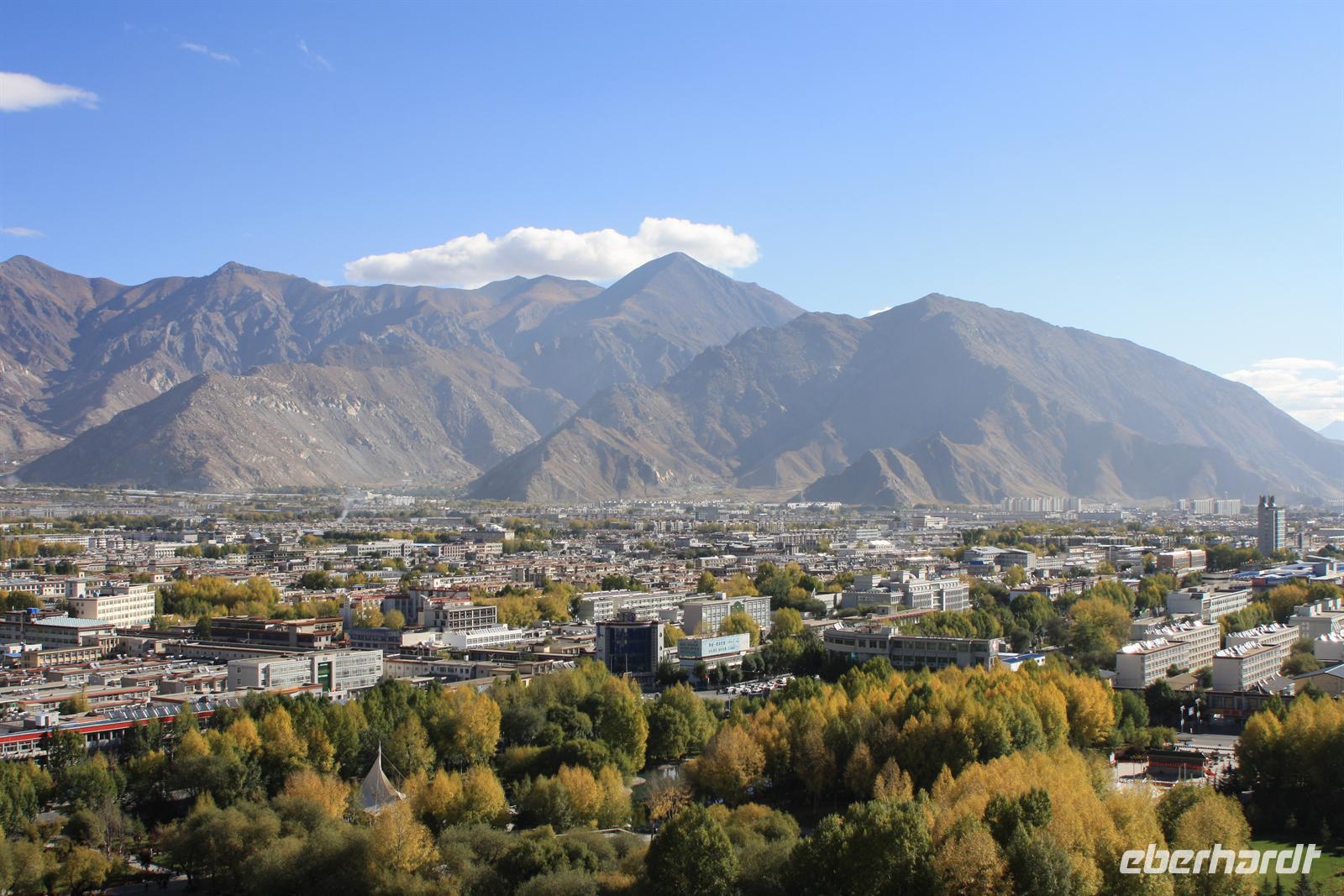 Der heutige Ausflug führt uns hinaus aus Lhasa zum Ganden Kloster - neben Drepung und Sera dem letzten der „Drei großen Klöster Tibets“. Wir verlassen Lhasa entlang des Flusses und der Blick zurück zeigt den prächtigen Potala Palast, wie er die ganze Stadt überragt! Wir durchfahren einige Ortschaften, wo geschäftiges Treiben herrscht. Die Bauern arbeiten auf ihren Feldern, denn es ist Erntezeit. Die Straße zum Kloster windet sich schließlich in zahlreichen Spitzkehren den steilen Hang hinauf - es ist eine etwas abenteuerliche Fahrt, aber das fantastische Panorama begeistert. Uns stellt sich die Frage, wie man vor 600 Jahren ohne diese Straße hier oben ein Kloster errichten konnte!? Bei der Besichtigung des liebevoll restaurierten Klosters sehen wir wiederum kunstvolle Wandmalereien, Gebetsmühlen sowie zahlreiche Pilger. Der Blick auf die umliegenden Berge ist einfach toll. Auf dem Gipfel wehen die bunten Gebetsfahnen und tragen die Wünsche nach Glück in die Welt. Die Blätter der Pappeln präsentieren sich schon in einem herbstlichen goldgelb und wir finden es ist unser „tibetischer Indian Summer“. Nach unserer Rückkehr zum Hotel bietet sich die Möglichkeit noch einmal zur Barkhor Straße zu fahren - per Taxi oder Fahrradrikscha - um nach Herzens Lust zu bummeln und zu handeln. Nach dem Abendessen ist die Gelegenheit für den Besuch der Tibet Oper. Ein Abstecher zum nächtlich beleuchteten Potala Palast beschließt den erlebnisreichen Tag.