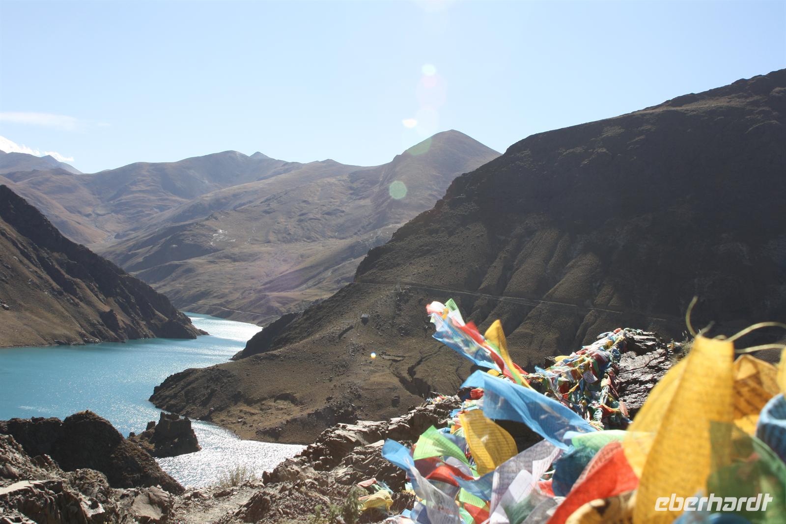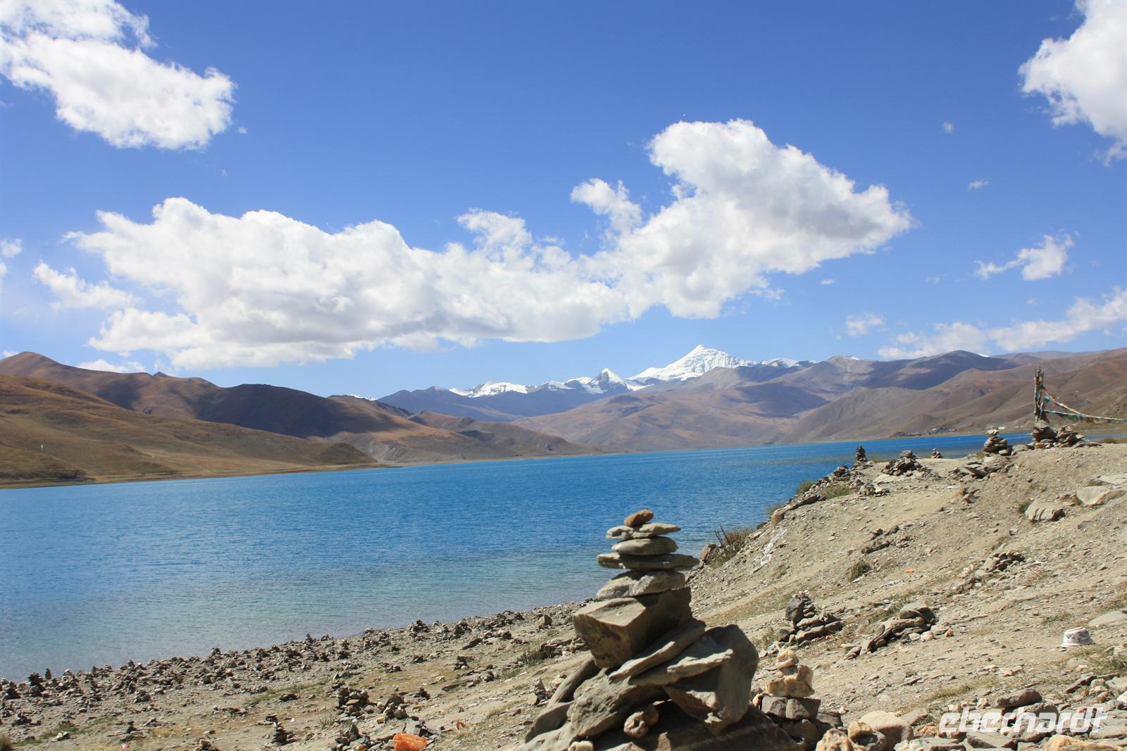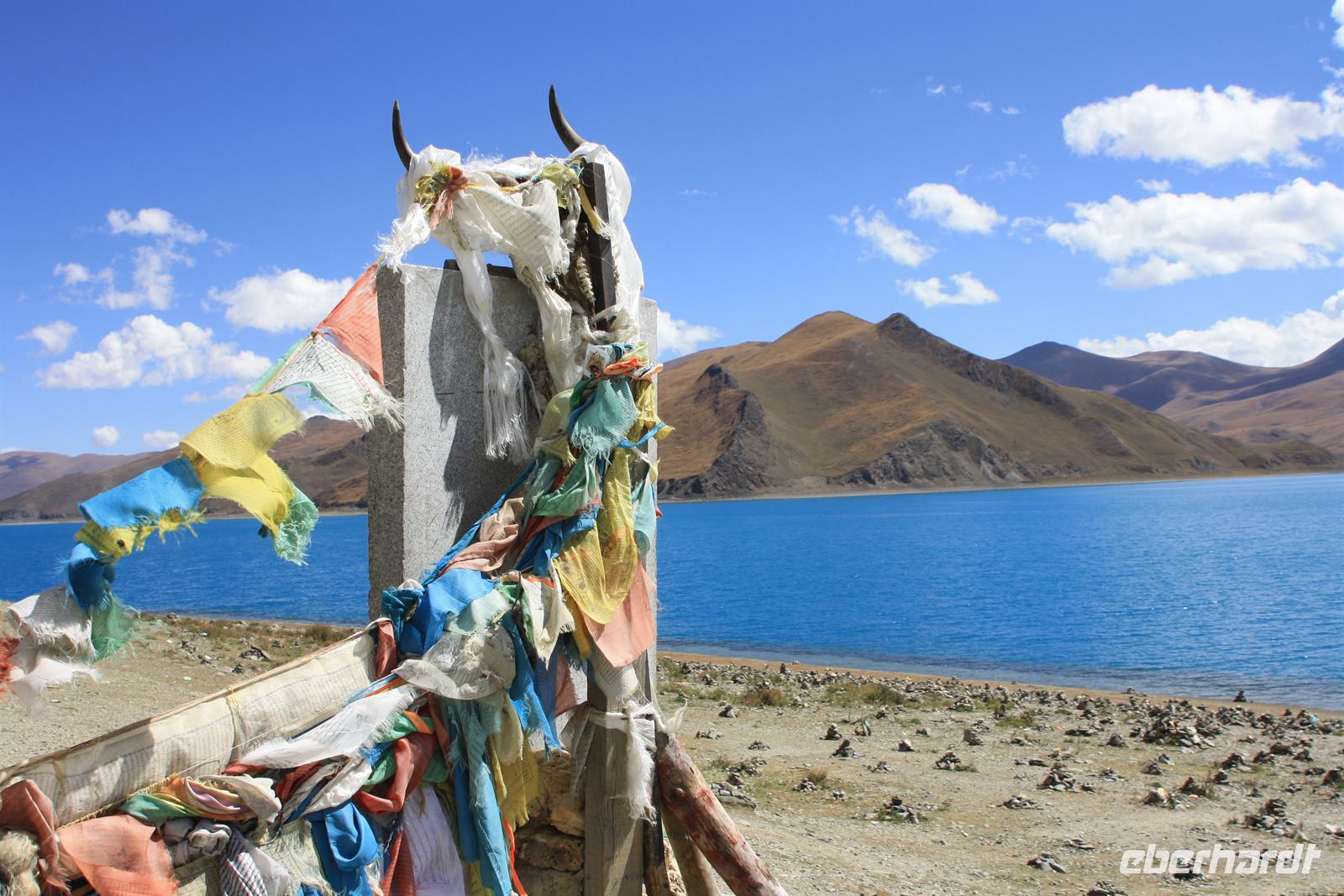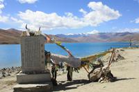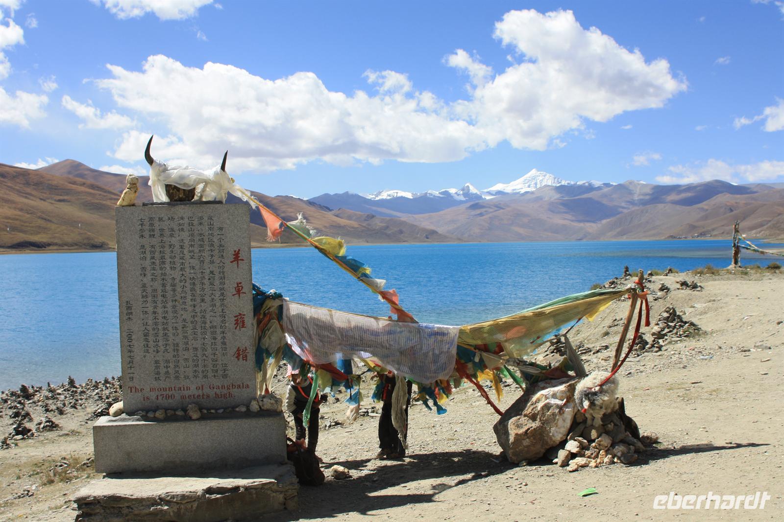Heute lassen wir den Trubel von Lhasa hinter uns und erleben die überwältigenden Landschaften von Tibet. Je weiter wir außerhalb der Stadt gelangen, desto ländlicher wird das Bild. Wo im Umkreis von Lhasa die Felder mit dem Traktor bestellt werden, so sehen wir hier öfter auch Bauern mit Yaks und Pferden. Am Zusammenfluss von Brahmaputra und Lhasa-Fluss lernen wir ein Stückchen tibetische Tradition kennen, die für uns doch sehr fremd ist. Hier ist eine Stelle für die Wasserbestattungen, die auch heute noch üblich ist (aus diesem Grund essen die Tibeter keinen Fisch). Anschließend windet sich die Straße in steilen Kurven den Berg hinauf - Respekt für unseren Bus-Chauffeur! Bald erreichen wir den Kampala-Pass auf 4.800 Meter Höhe! Es eröffnet sich der Blick auf den türkisblauen Yamdrok-See und die schneebedeckten Gipfel der 7.000er - einfach fantastisch! Die geschmückten Yaks bieten ein tolles Fotomotiv, allerdings nicht umsonst! Den nächsten Stopp legen wir direkt am Seeufer ein, wo zahlreiche Steinpyramiden das Bild prägen - der See ist den Tibetern heilig. Zum Bergfest gibt es ein kleines Picknick mit tibetischen Spezialitäten! Auf der Weiterfahrt passieren wir einige Yak- und Schafherden und wir fragen uns wie hart und entbehrlich wohl das Leben in dieser „Einöde“ sein muss. Wir sind jedenfalls ergriffen von der Erhabenheit der Natur. Bald erreichen wir den höchsten Punkt unserer Reise auf dem Kharola-Pass in sage und schreibe 5.040 Meter Höhe! Gut, dass wir uns inzwischen einigermaßen an die Höhe angepasst haben, aber dennoch muss man es langsam angehen lassen. Vor dem Kharola-Gletscher wehen unzählige Gebetsfahnen mit heiligen Sprüchen im Wind und auch hier bieten fliegende Händler ihre Waren feil. Aller guten Dinge sind drei und so stoppen wir noch am Semila-Pass in 4.300 Meter Höhe, der den Blick auf den leuchtend blauen Stausee frei gibt. Am späten Nachmittag erreichen wir unser Hotel in Gyantse. Mit einem „Gletscherwasser“ stoßen wir auf eine erlebnisreiche erste Hälfte und eine spannende zweite Hälfte unserer Reise an - es ist schließlich Bergfest… und das im wahrsten Sinne des Wortes!