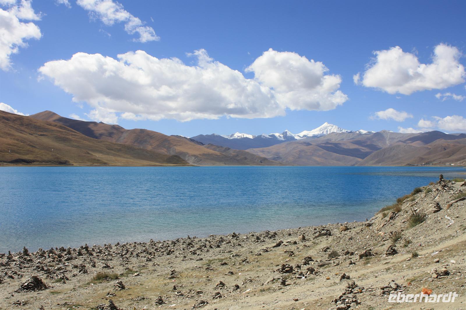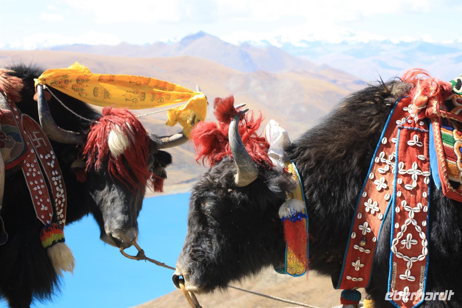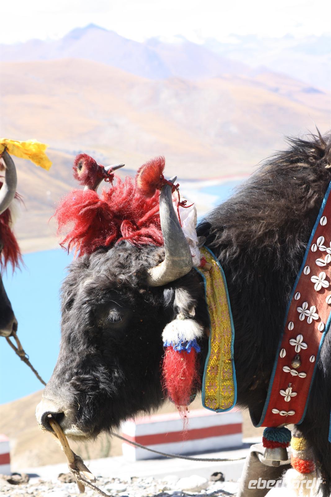 Heute lassen wir den Trubel von Lhasa hinter uns und erleben die überwältigenden Landschaften von Tibet. Je weiter wir außerhalb der Stadt gelangen, desto ländlicher wird das Bild. Wo im Umkreis von Lhasa die Felder mit dem Traktor bestellt werden, so sehen wir hier öfter auch Bauern mit Yaks und Pferden. Am Zusammenfluss von Brahmaputra und Lhasa-Fluss lernen wir ein Stückchen tibetische Tradition kennen, die für uns doch sehr fremd ist. Hier ist eine Stelle für die Wasserbestattungen, die auch heute noch üblich ist (aus diesem Grund essen die Tibeter keinen Fisch). Anschließend windet sich die Straße in steilen Kurven den Berg hinauf - Respekt für unseren Bus-Chauffeur! Bald erreichen wir den Kampala-Pass auf 4.800 Meter Höhe! Es eröffnet sich der Blick auf den türkisblauen Yamdrok-See und die schneebedeckten Gipfel der 7.000er - einfach fantastisch! Die geschmückten Yaks bieten ein tolles Fotomotiv, allerdings nicht umsonst! Den nächsten Stopp legen wir direkt am Seeufer ein, wo zahlreiche Steinpyramiden das Bild prägen - der See ist den Tibetern heilig. Zum Bergfest gibt es ein kleines Picknick mit tibetischen Spezialitäten! Auf der Weiterfahrt passieren wir einige Yak- und Schafherden und wir fragen uns wie hart und entbehrlich wohl das Leben in dieser „Einöde“ sein muss. Wir sind jedenfalls ergriffen von der Erhabenheit der Natur. Bald erreichen wir den höchsten Punkt unserer Reise auf dem Kharola-Pass in sage und schreibe 5.040 Meter Höhe! Gut, dass wir uns inzwischen einigermaßen an die Höhe angepasst haben, aber dennoch muss man es langsam angehen lassen. Vor dem Kharola-Gletscher wehen unzählige Gebetsfahnen mit heiligen Sprüchen im Wind und auch hier bieten fliegende Händler ihre Waren feil. Aller guten Dinge sind drei und so stoppen wir noch am Semila-Pass in 4.300 Meter Höhe, der den Blick auf den leuchtend blauen Stausee frei gibt. Am späten Nachmittag erreichen wir unser Hotel in Gyantse. Mit einem „Gletscherwasser“ stoßen wir auf eine erlebnisreiche erste Hälfte und eine spannende zweite Hälfte unserer Reise an - es ist schließlich Bergfest… und das im wahrsten Sinne des Wortes!