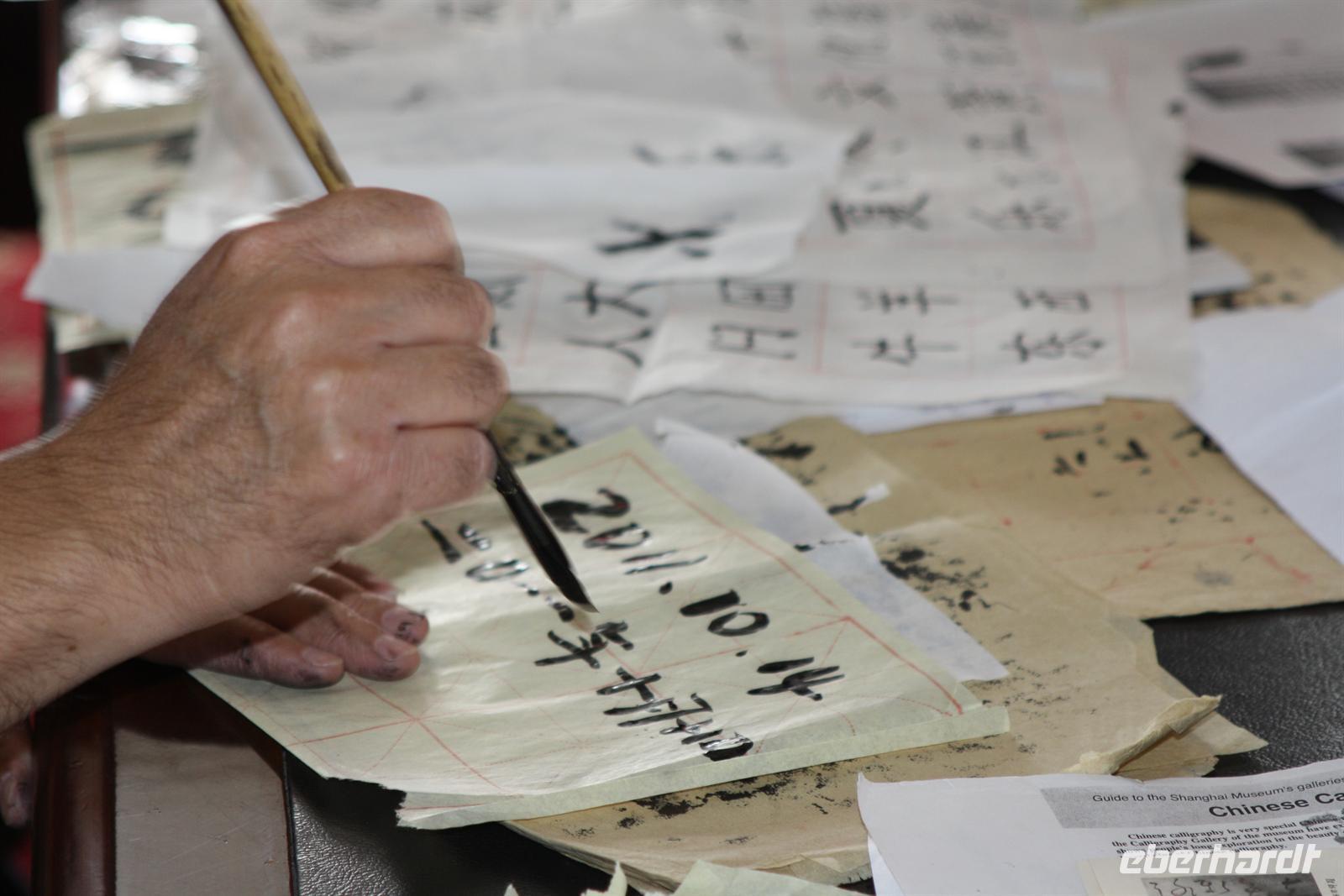 Einer der Höhepunkte der Reise ist zweifelsohne die Fahrt mit der Tibet-Bahn - auch wenn wir dies in umgekehrter Richtung von Lhasa nach Peking erleben. Bevor dieses Abenteuer uns erwartet, erfreut uns Josef noch mit einer Unterrichtsstunde in Kalligraphie. Die chinesischen Schriftzeichen haben etwas von Bilder-Rätsel . Bei der richtigen (oder falschen) Betonung kann ma ma ma ma heißen "Die Mutter sitzt mit eingeschlafenen Beinen auf dem Pferd und schimpft.". Gegen Mittag erreichen wir den Bahnhof von Lhasa und machen es uns in den Abteilen der ersten Klasse gemütlich. Je vier Personen teilen sich ein Abteil. Nach der pünktlichen Abfahrt, ziehen die abwechslungsreichen Landschaften an den Panoramafenstern des Zuges vorüber. Der ein oder andere übt sich in „interkultureller Kommunikation“ und es fühlt sich doch etwas wie Jugendherberge an. Im Laufe der Fahrt passieren wir hohe Gipfel, sehen Gletscher, Yak-Herden, einsame Siedlungen inmitten der „Einöde“, doch immer auch die verzinkten Strommasten, die selbst den hintersten Winkel des Landes mit Strom versorgen. Es muss ein entbehrungsreiches Leben sein, aber sicher ein glückliches. Die Etappe bis Golmud verläuft durchgehend über Permafrostboden, was einiger bautechnischer Rafinessen bedurfte. Die Zeit bis zum Abendessen vergeht schnell und wir erfreuen uns an der fantastischen Landschaft. Im Bordrestaurant wird ein hervorragendes Abendessen serviert - das tröstet uns über die Tatsache, dass wir den höchsten Bahnhof der Welt (Tanggula in 5.068 Meter Höhe) nur im Dunkeln passieren. Gegen 21.00 Uhr ist es soweit und wir stoßen mit einem Schlummertrunk „Tibetwasser“ darauf an. Prost!