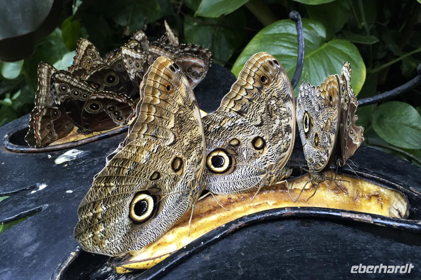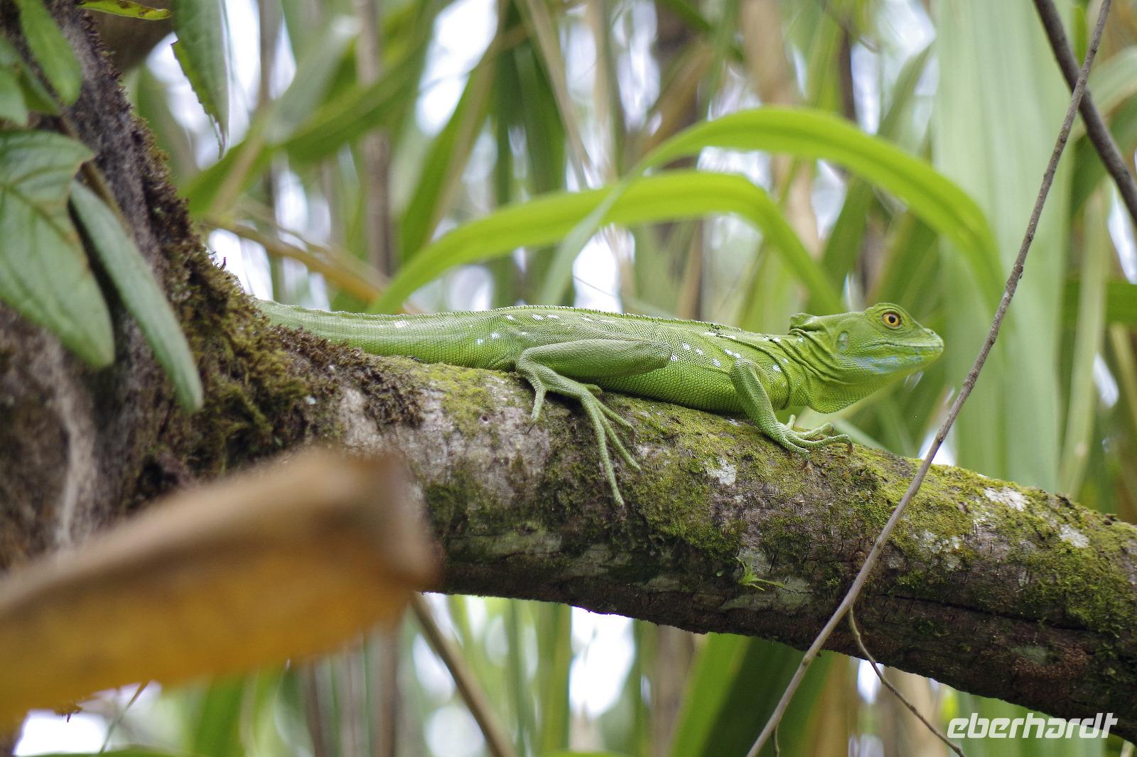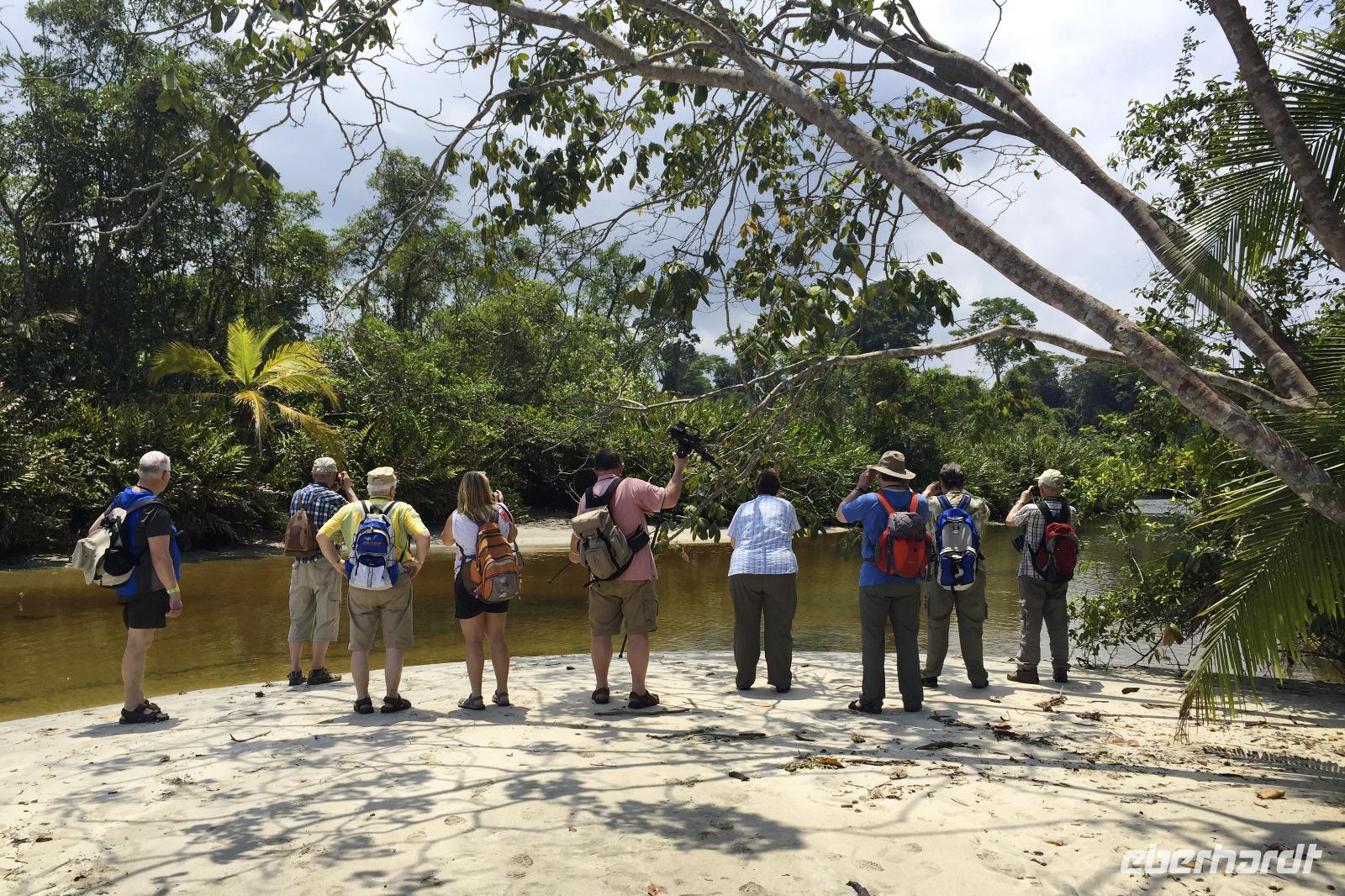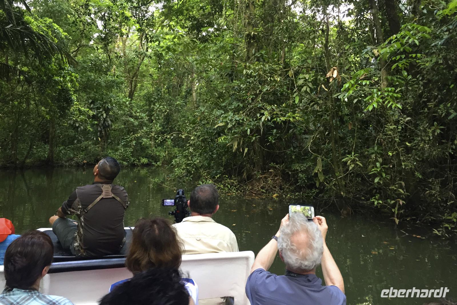 Wir starteten sehr zeitig zu unserer recht langen Fahrt in den Tortuguero-Nationalpark. Es gab einen Kaffee im Hotel, dann ging es mit Frühstückspaketen in den Bus. Da unser Reiseleiter Maurice einen Anruf bekam, dass wir doch nicht 11.00 Uhr am Bootssteg sein müssen, sondern noch eine Stunde Zeit haben, kam uns das sehr gelegen. Denn unterwegs fuhren wir vorbei an Ölpalmen- und Bananen-Plantagen - nun konnten wir auch anhalten und uns die verschiedenen Arbeitsschritte aus nächster Nähe anschauen: wie die Bananen geerntet, transportiert, gewaschen, sortiert und verpackt werden. Gegen 12.00 Uhr kamen wir in Pavona an und bestiegen ein Boot mit leichtem Gepäck. Die Koffer ließen wir im Bus zurück, so hatten wir weniger zu tragen. Bei der über zweistündigen Fahrt stoppten wir bei einigen Tieren und ließen uns dann wieder den Fahrtwind um die Nase wehen. Nach unserer Ankunft in der Mawamba Lodge, die zwischen Kanal und offenem Meer liegt, und einem Begrüßungsgetränk ging es gleich zum Mittagessen. Und nach einer Siesta trafen wir uns zu einem Spaziergang in der Hotelanlage. Hier allein entdeckten wir schon so viele Tiere und interessante Pflanzen, dass die Foto-Akkus bald wieder aufgeladen werden mussten. In der Anlage befinden sich auch mehrere Gehege mit Schmetterlingen, Fröschen und Schildkröten. Nach dem Abendessen vom Buffet gingen einige aus der Reisegruppe fakultativ auf die Suche nach eierlegenden Meeresschildkröten am Strand. Nach einem anstrengenden Fußmarsch durch den Sand waren wir leider nicht erfolgreich, sahen jedoch noch eine Schlange und hatten viel Spaß auf dem Rückweg ins Hotel.
