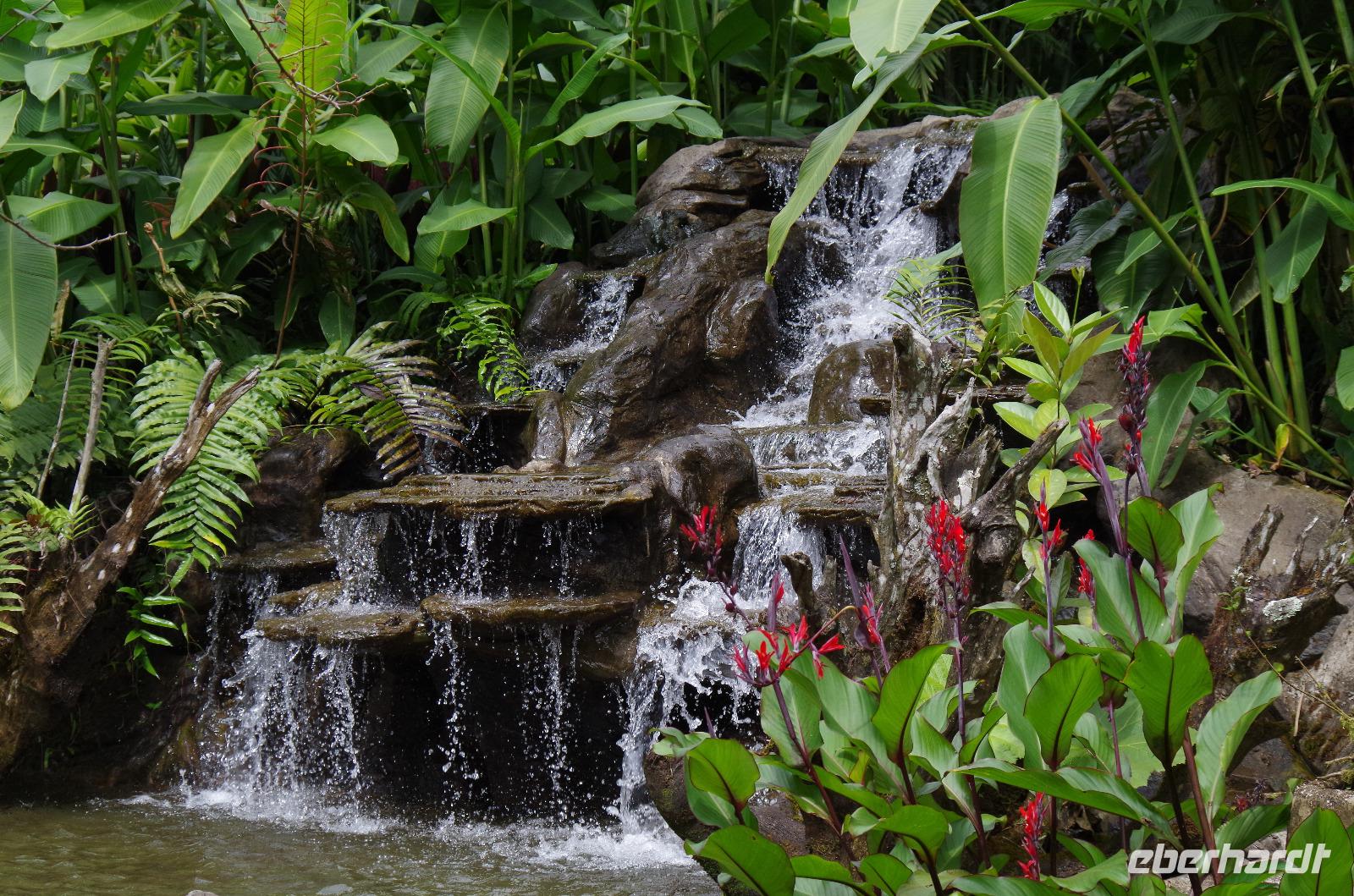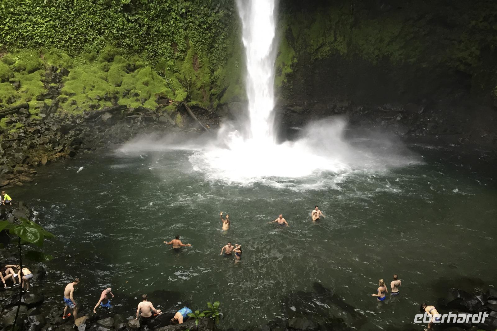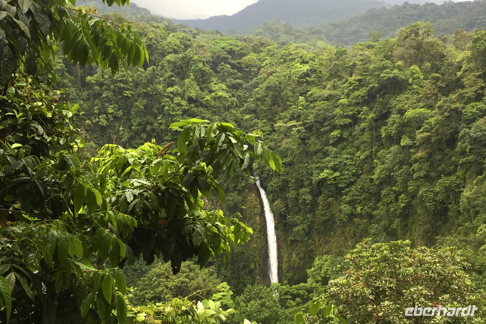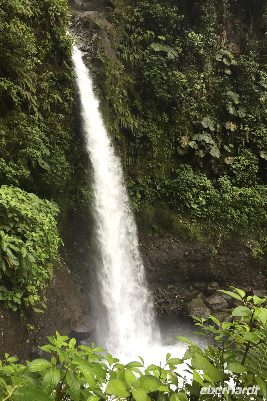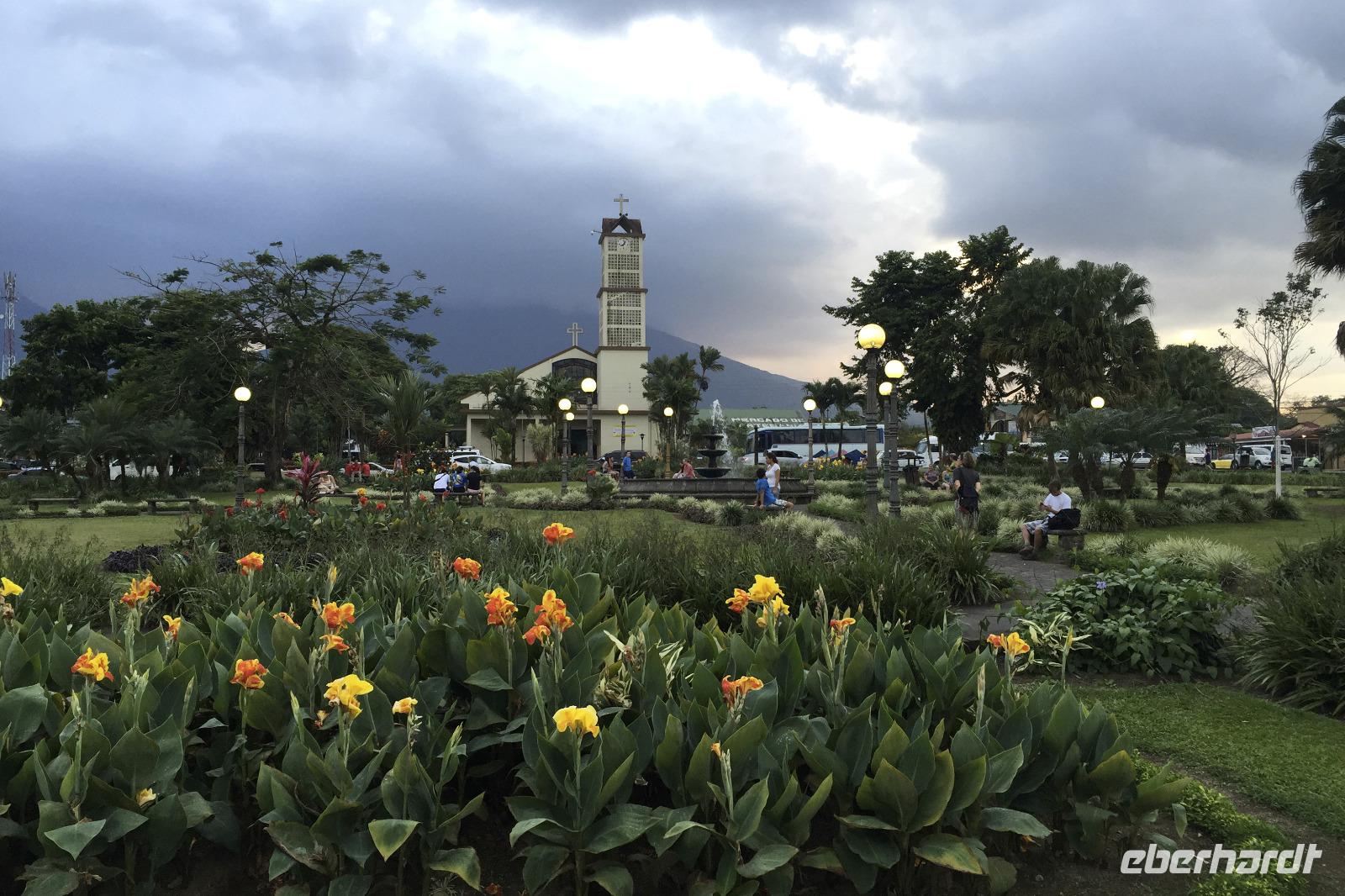Der heutige Tag stand ganz im Zeichen des Vulkans Arenal. Wolken versperrten uns immer wieder die Sicht. Auch ein paar Regenschauer waren dabei. Eine mehrstündige Wanderung zeigte uns aber wieder etliche Tiere und Vögel. Beim anschließenden Mittagessen im Restaurant La Choza de Laurel gab es verschiedene leckere Hauptspeisen zur Wahl. Frisch gebrühter Kaffee auf costa-ricanische Art gab es auch noch. Anschließend fuhren wir zum La Fortuna Wasserfall. Die über 400 Stufen hinunter und wieder hinauf liefen nicht alle mit, bei der Luftfeuchte war das aber auch niemandem zu verübeln. Alle die mit waren, klasse gemacht! :-) In der kleinen Stadt La Fortuna war unser letzter Stopp des heutigen Tages. Der Park mit Kirche und Springbrunnen und tollen Blumenbeeten gefiel allen. Die kleinen Lädchen im Umfeld wurden auch noch nach Souvenirs durchforstet. Abendessen wieder in dem Restaurant vom Vortag, aber viele waren noch vom reichlichen Mittagsmenü satt.