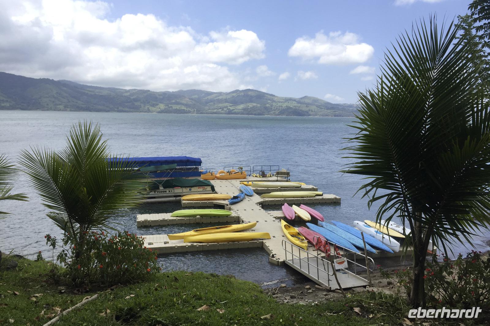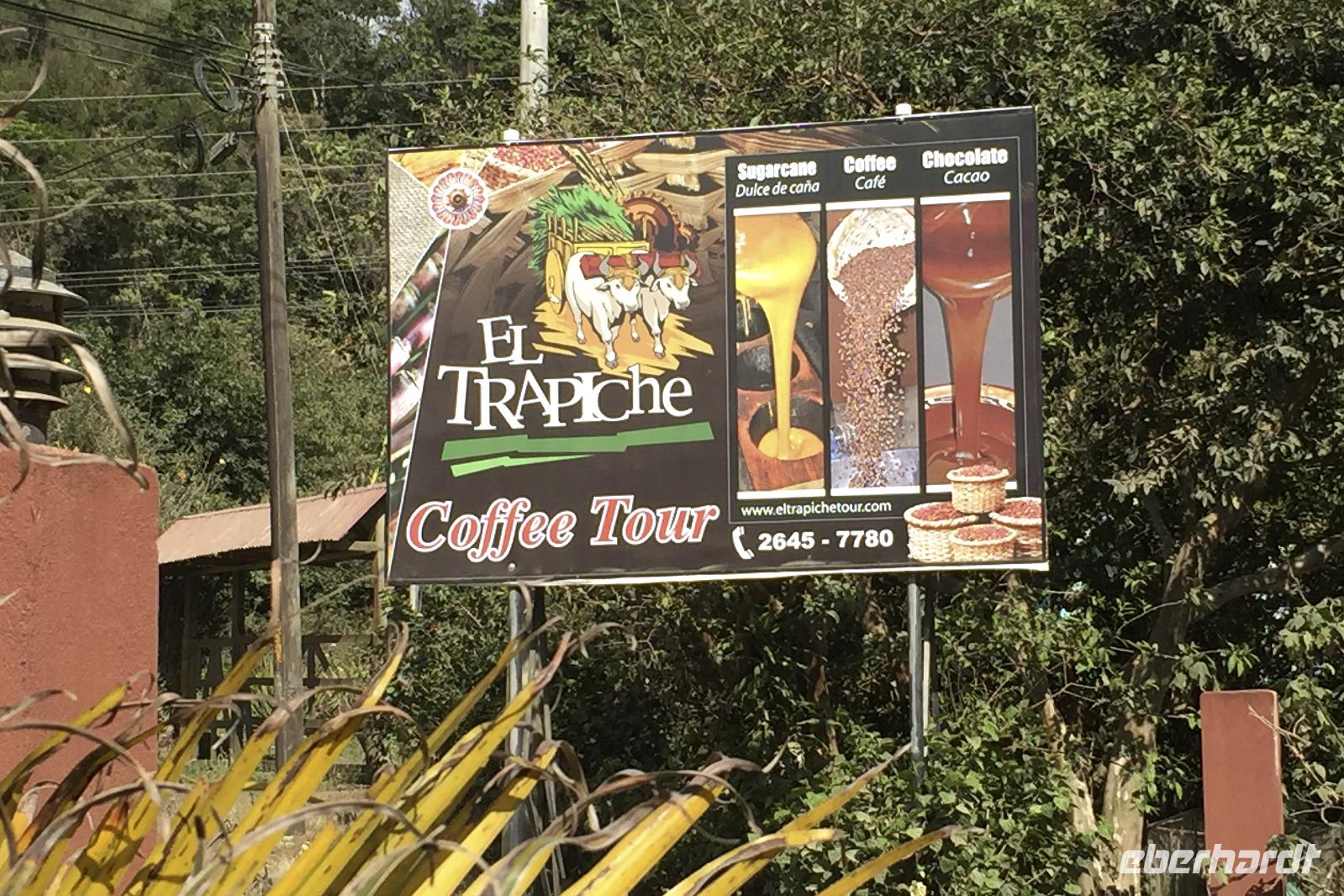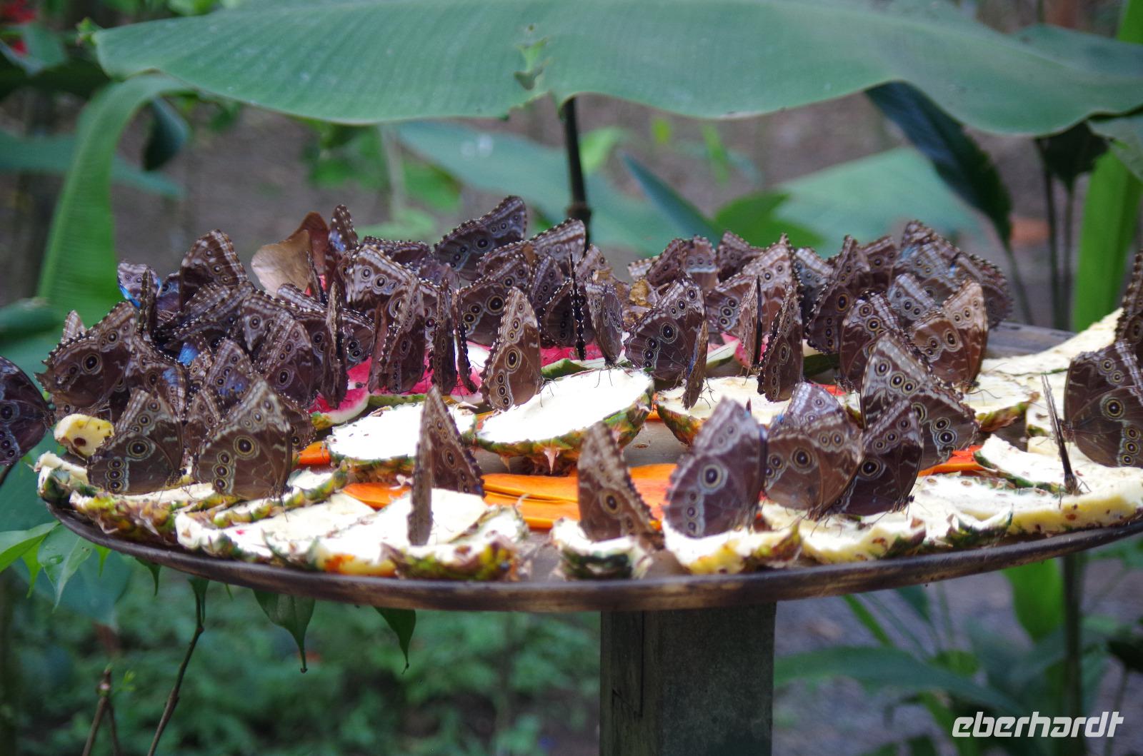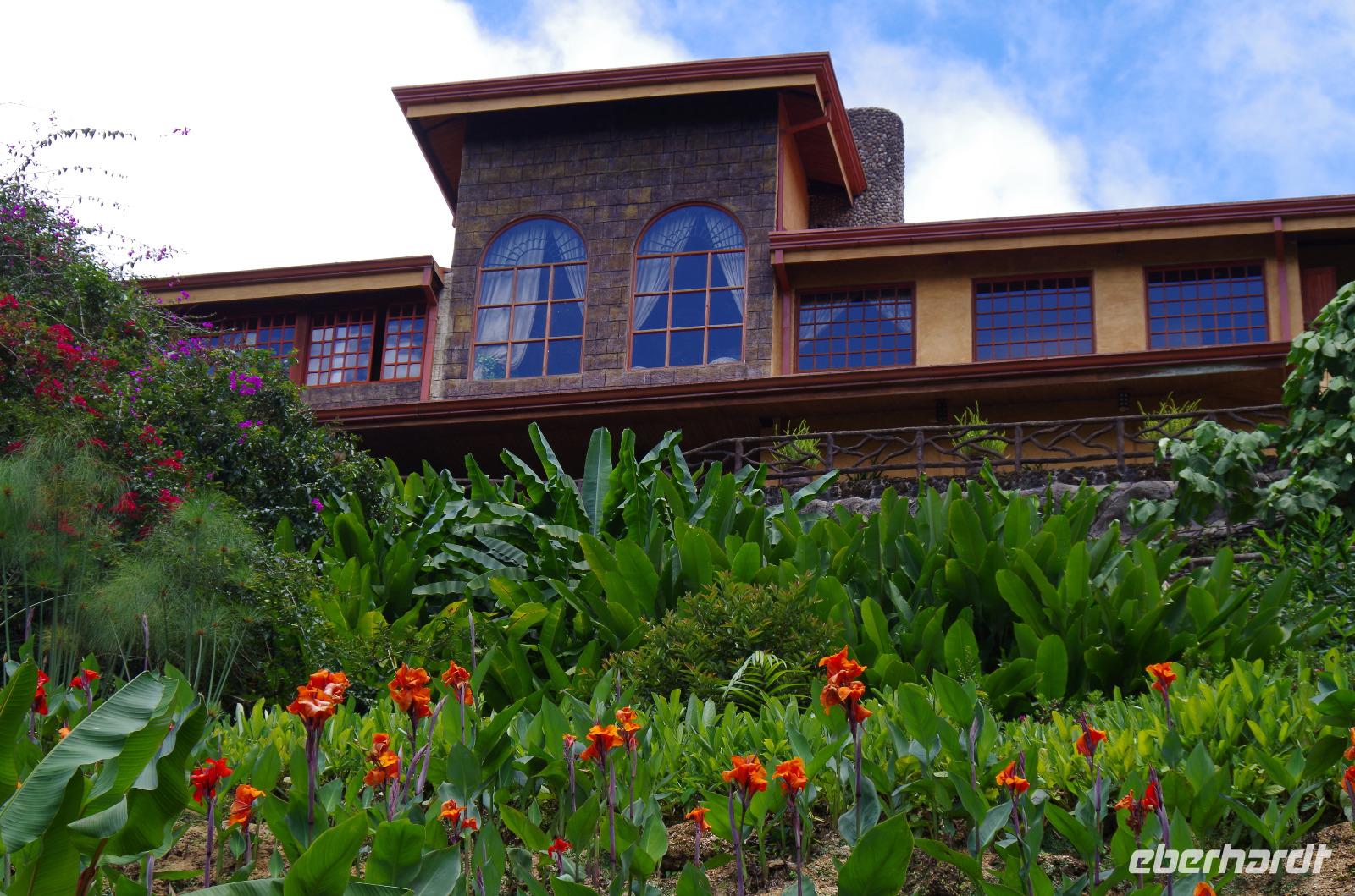 7.30 Uhr ging es los, wir hatten wieder viel vor heute. Und wieder einmal gut durchschütteln bitte! Es gibt einige schlechte Pisten in Costa Rica, man kann auch nicht an allen Stellen von Straßen sprechen. Außer die Fahrten auf der Panamericana waren immer 1A. Unser erster Stopp war das Danaus Eco Center, ein liebevoll angelegter Park, durch den uns Maurice gewohnt kompetent führte. Eine derartige Artenvielfalt ließ uns einfach nur staunen. Immer wieder entdeckten wir neue Tiere in der gepflegten Anlage: im Schmetterlingsgarten, an einem Natursee ... und auch ein Faultier wartete schlafend auf einem Baum am Parkplatz auf uns und rundete auch dieses Tiererlebnis mal wieder ab. Wir fuhren weiter zum Arenal-See. Dort erwartete uns ein Eisvogel zum „Foto-Shooting" und ein Boot zu einer einstündigen Tour auf dem See. Der Nachmittag hielt dann ein paar Leckereien bereit. Bei einer fakultativen Kaffee-, Kakao- und Zuckerrohr-Tour, an der alle teilnahmen, erfuhren wir wichtige Details zu Anbau, Weiterverarbeitung und Zubereitung. Ein Rinderkarren fuhr uns anfangs den Berg hinauf, während kleiner Spaziergänge durch das Areal genossen wir etliche Kostproben von Kakao, Karamell, Schnaps und Kaffee. Natürlich konnte man auch Kaffee in fünf verschiedenen Röstungen kaufen. Weiter ging es in das Mountain Hotel El Establo - es umfasst ein sehr großes Gelände mit vielen Gebäuden, die alle einen zauberhaften Blick auf die Berge und das Tal bieten und mitten im Nebelwald liegt. Das Wetter war hier nun deutlich anders als die letzten Tage. Es nieselte, war sehr viel kühler und es fühlte sich ein wenig an wie in der Waschküche. Die Wege gingen steil bergauf und ein Shuttle brachte uns wieder hinunter zu unserem Reisebus, der uns dann zum Abendessen fuhr, ins Restaurant Tramonti in Monte Verde. Vor- und Nachspeise konnten wir wieder aus verschiedenen leckeren Angeboten wählen, zum Nachtisch gab es Eis. Das geht immer :-)