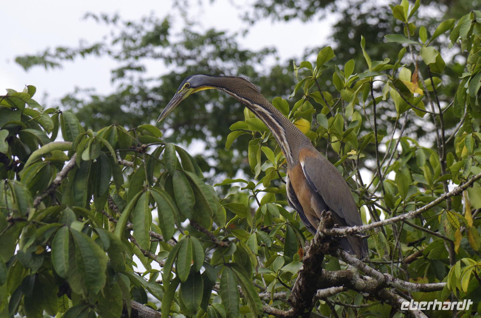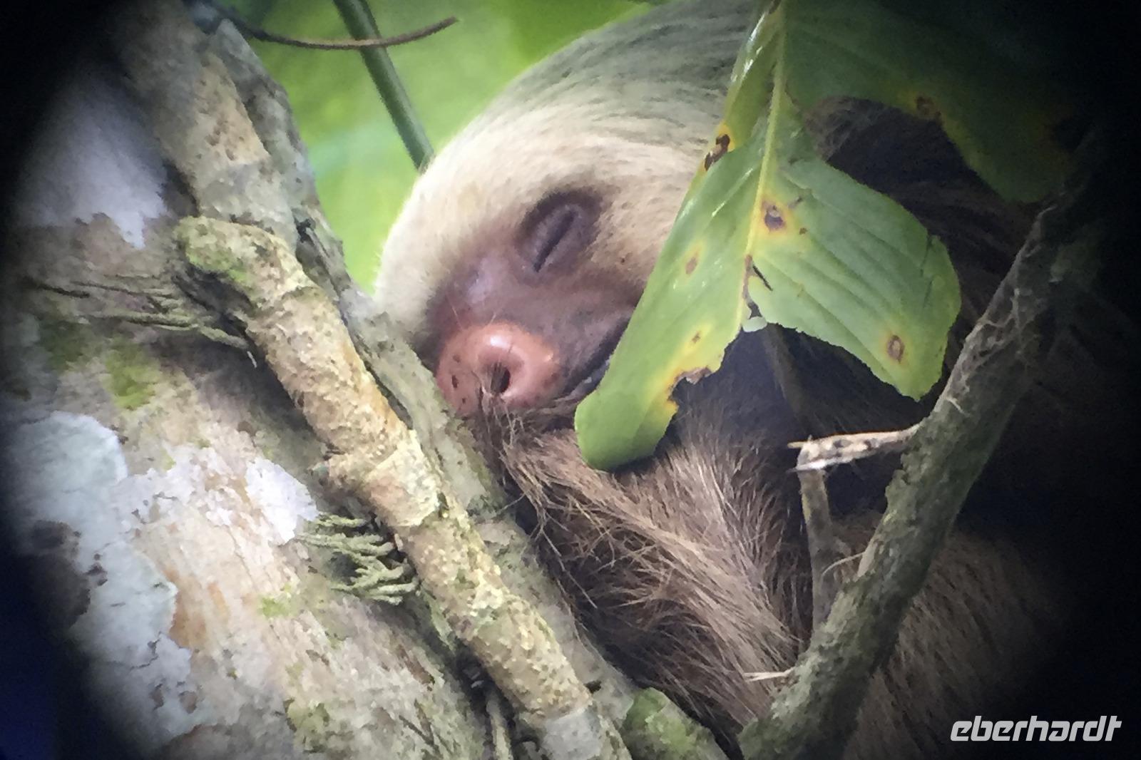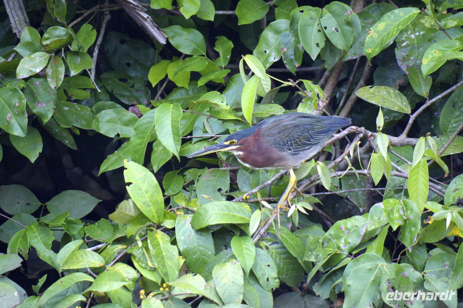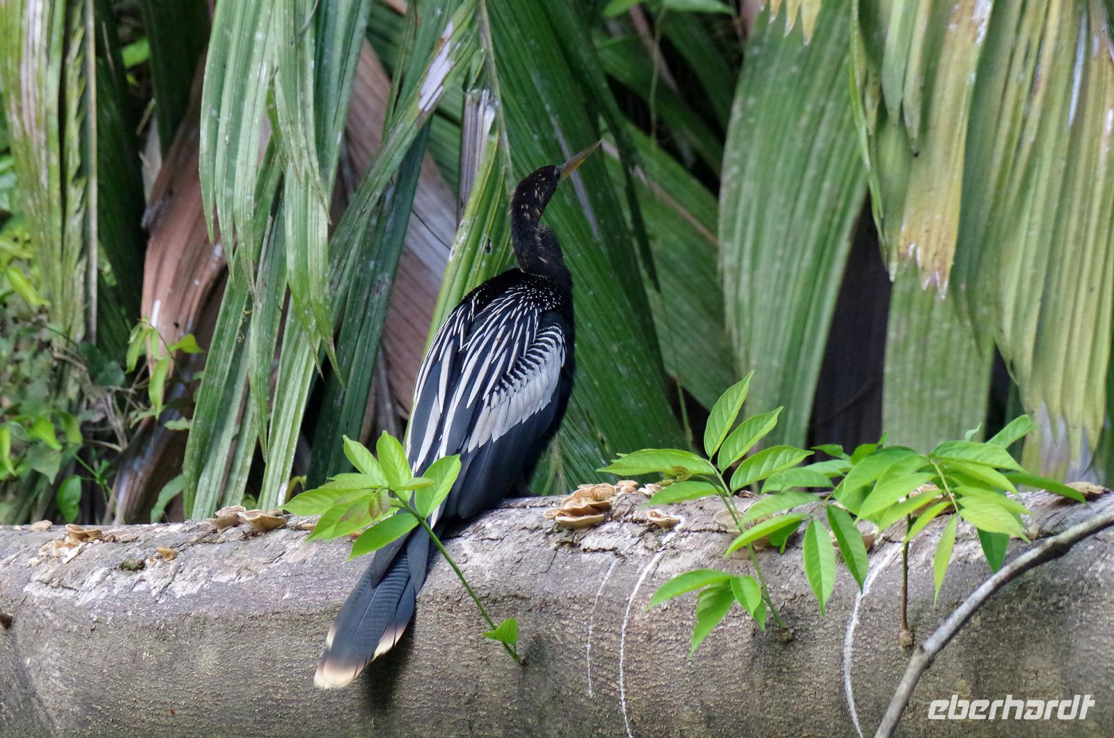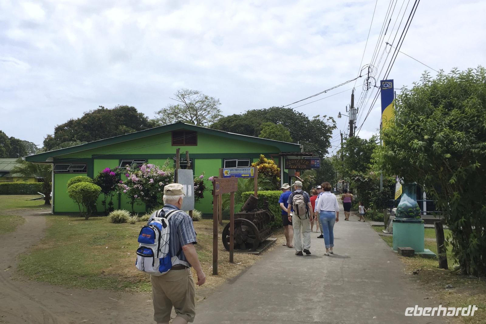 Heute ging es zur Pirsch im Tortuguero-Nationalpark! Nach einem schnellen Kaffee an der Rezeption ging es 6.00 Uhr zur ersten Bootstour. Anschließend gab es Frühstück. Und weiter ging es per Boot in das nahegelegene Dorf Tortuguero. 1400 Menschen leben hier, viele vom Tourismus: Ein kleines buntes Dörfchen mit tollen Souvenirshops, Kokosnüssen zum Trinken und netten Menschen! Zu Fuß ging es zurück in unsere Hotel-Anlage. Dort gab es bald Mittagessen und eine kurze Siesta, bevor es 14.30 Uhr erneut aufs Boot ging, um weitere Tiere, vor allem Vögel, zu entdecken. Dank der guten Augen und dem erfahrenen Blick von Maurice und unserem Bootsführer sahen wir ... > die lange Liste kommt weiter unten :-) Der weitere Nachmittag stand dann ganz im Zeichen von Müßiggang und Entspannung: am Strand, am Fluss, nochmals im Schmetterlings- oder Froschgarten oder einfach in der Hängematte vor dem eigenen Bungalow. Nach dem Abendessen gab es einen zweiten Versuch, Eier legende Schildkröten zu sehen. Es wurde dann ein nachtaktiver Wickelbär, den sieht man ja auch nicht alle Tage. Es war einfach zu trocken, dadurch war es ziemlich heiß am Abend. Beim Einschlafen hörte man dann sogar das Meeresrauschen.