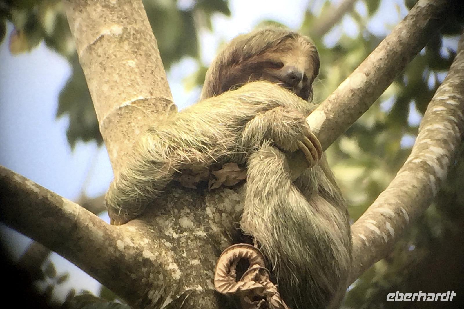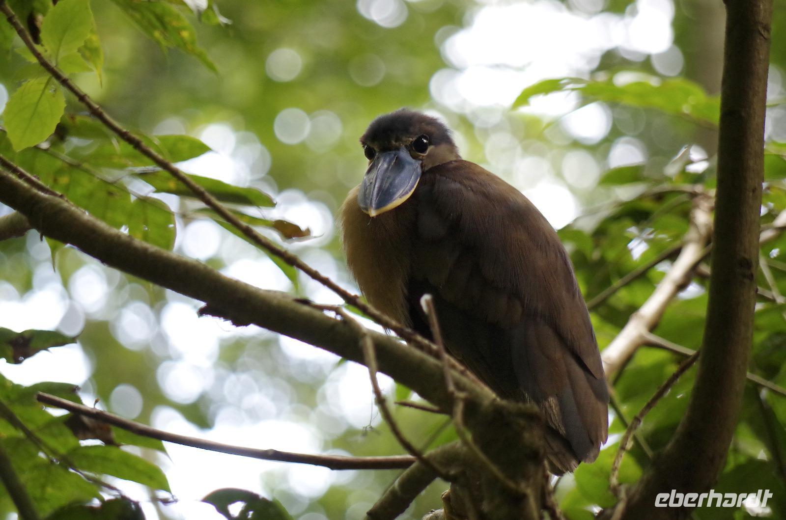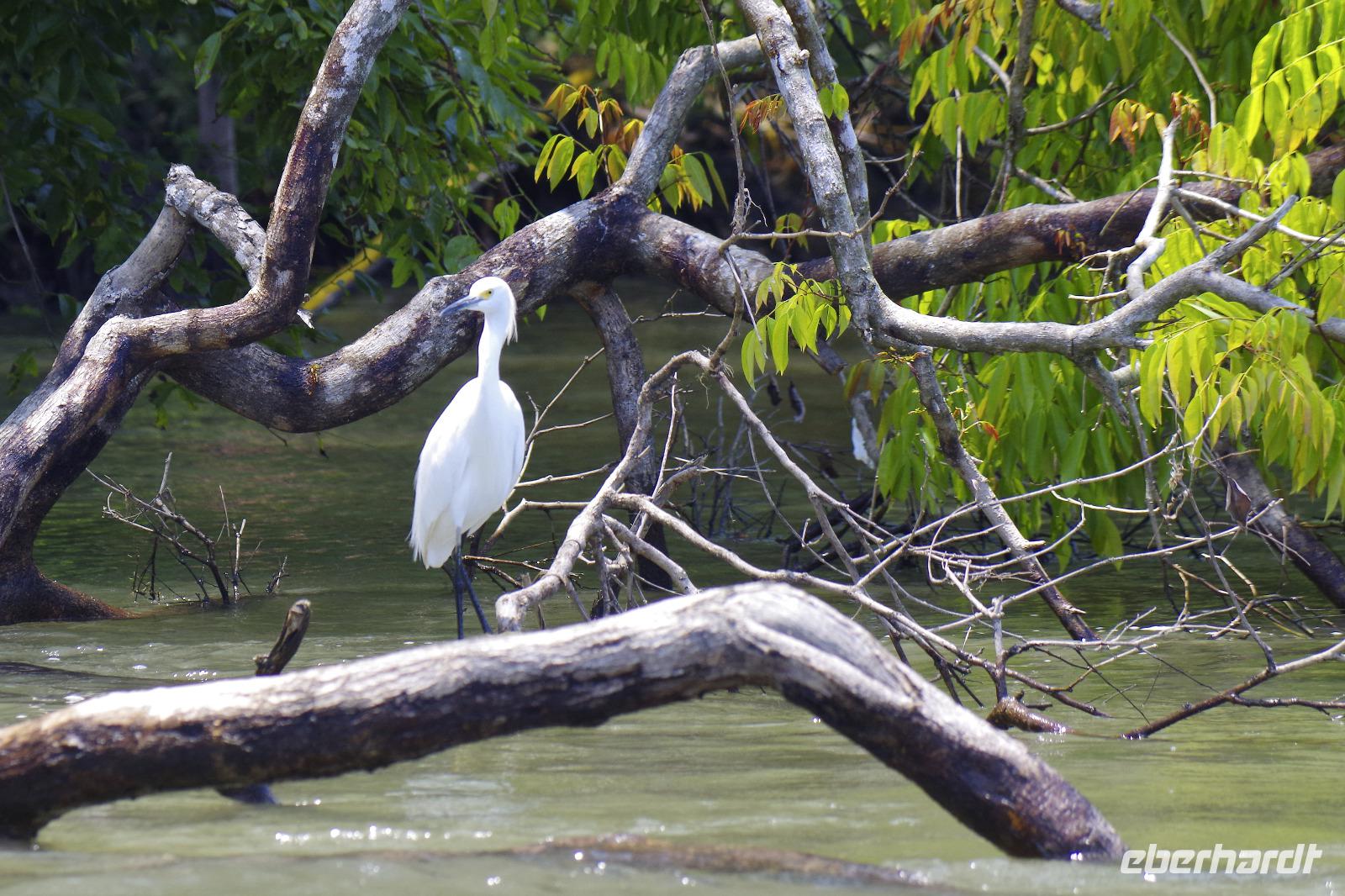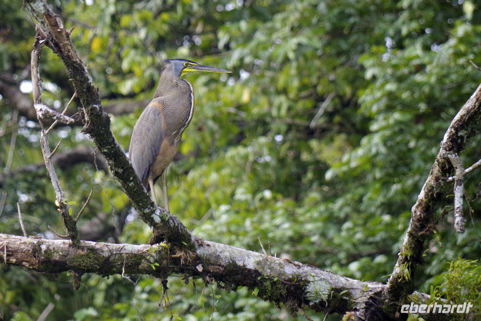 Heute ging es zur Pirsch im Tortuguero-Nationalpark! Nach einem schnellen Kaffee an der Rezeption ging es 6.00 Uhr zur ersten Bootstour. Anschließend gab es Frühstück. Und weiter ging es per Boot in das nahegelegene Dorf Tortuguero. 1400 Menschen leben hier, viele vom Tourismus: Ein kleines buntes Dörfchen mit tollen Souvenirshops, Kokosnüssen zum Trinken und netten Menschen! Zu Fuß ging es zurück in unsere Hotel-Anlage. Dort gab es bald Mittagessen und eine kurze Siesta, bevor es 14.30 Uhr erneut aufs Boot ging, um weitere Tiere, vor allem Vögel, zu entdecken. Dank der guten Augen und dem erfahrenen Blick von Maurice und unserem Bootsführer sahen wir ... > die lange Liste kommt weiter unten :-) Der weitere Nachmittag stand dann ganz im Zeichen von Müßiggang und Entspannung: am Strand, am Fluss, nochmals im Schmetterlings- oder Froschgarten oder einfach in der Hängematte vor dem eigenen Bungalow. Nach dem Abendessen gab es einen zweiten Versuch, Eier legende Schildkröten zu sehen. Es wurde dann ein nachtaktiver Wickelbär, den sieht man ja auch nicht alle Tage. Es war einfach zu trocken, dadurch war es ziemlich heiß am Abend. Beim Einschlafen hörte man dann sogar das Meeresrauschen.