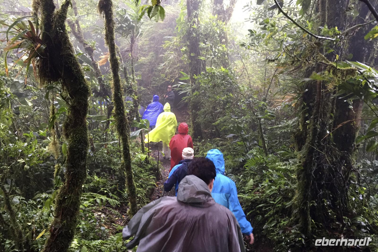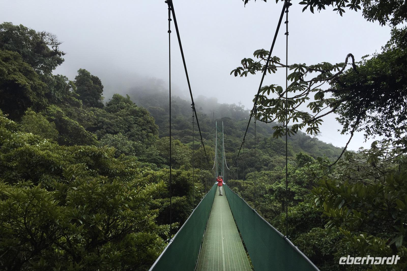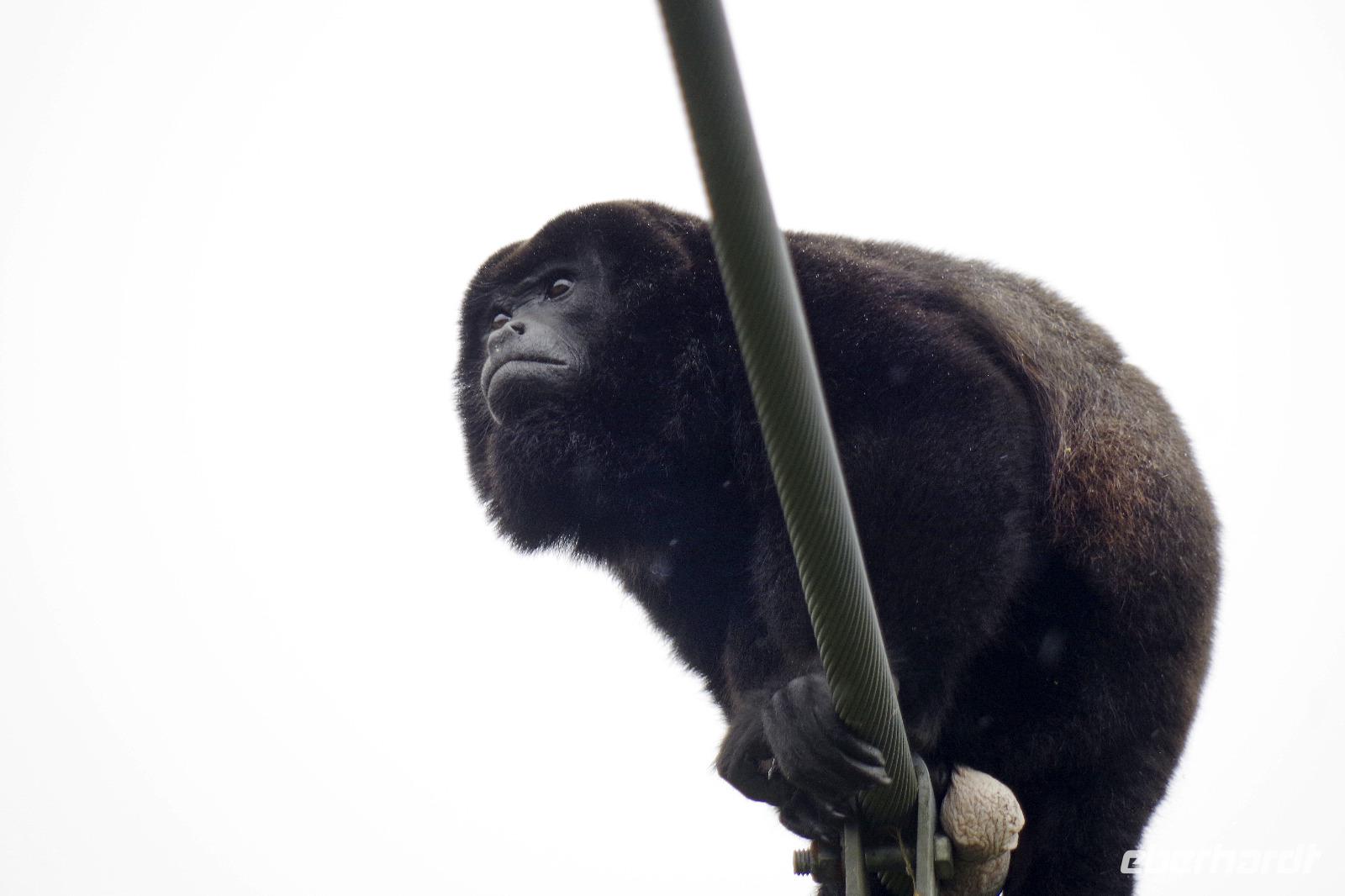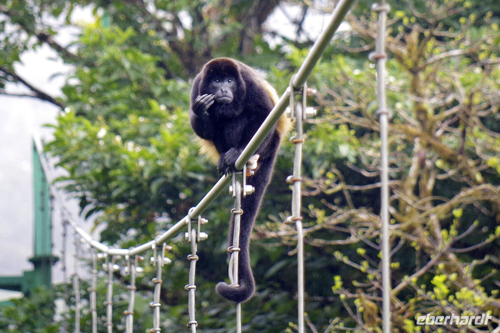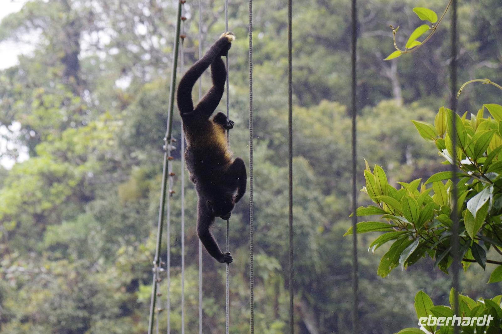 8.30 Uhr ging es heute, deutlich wärmer und wasserdichter angezogen als beim Rest der Reise, in das Naturschutzgebiet Santa Elena in 1.800 Metern Höhe. Wir befanden uns mitten im Nebelwald und durch Nebelschwaden und viel Wasserdunst wirkte alles sehr mystisch. Allzu viele Tiere konnten wir nicht entdecken. Aber die Pflanzenwelt barg ein paar neue Exemplare, die wir zuvor noch nicht gesehen hatten. Weiter ging unsere holprige Fahrt zum sogenannten Skywalk. Über sieben Hängebrücken führte ein ebenso mystischer Wanderweg durch Flora und Fauna. Eigentlich dürfen nur zehn Personen eine Brücke zeitgleich überqueren, aber eine Horde Brüllaffen hielt sich nicht daran, als wir schon fotografierend auf dieser standen :-) Sie turnten und kletterten die Seile entlang ... so nah und frei von Blättern, Ästen und Zweigen hatten wir sie nie gesehen und fotografiert. In diesem Areal versuchten wir auch den Quetzal, einen ganz besonderen Vogel, zu sichten. Reiseleiter Maurice ahmte ihre Rufe nach und höre da, es antwortete jemand, schnell in die Richtung gelaufen ... tja, blöderweise hatte ein anderer Reiseleiter „geantwortet". :-) So sahen wir leider nur die Brutlöcher der seltenen Vögel. Dafür hörten wir den Glockenvogel!