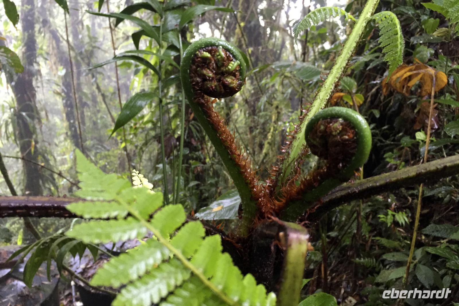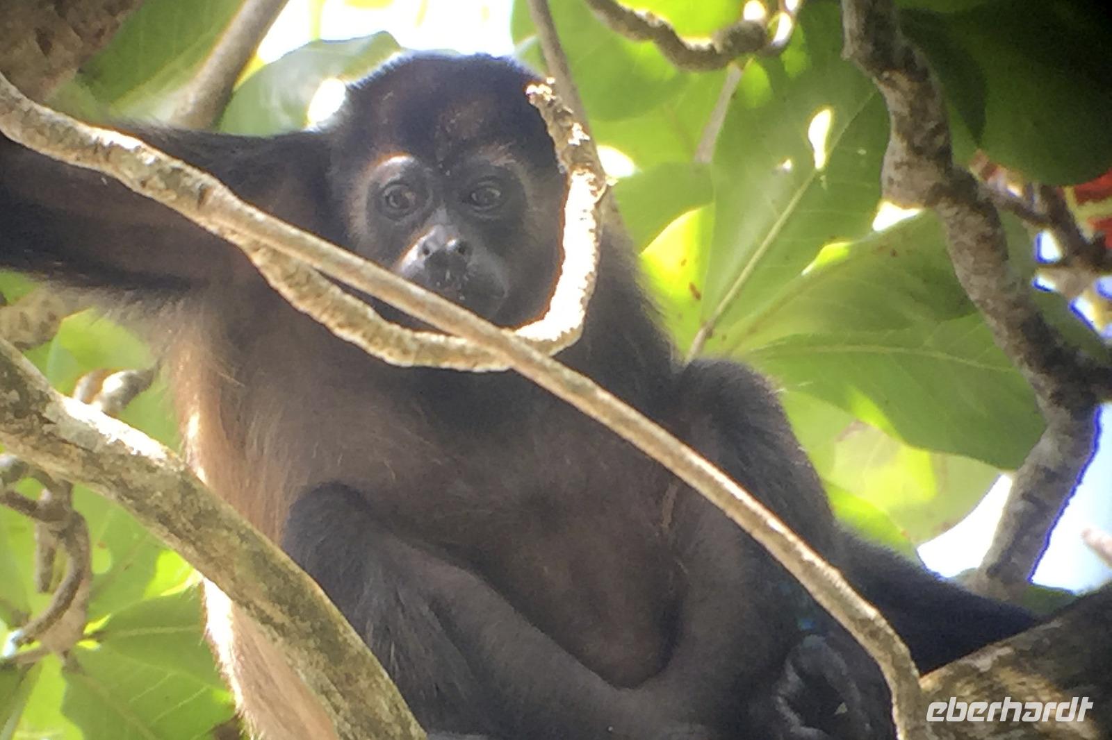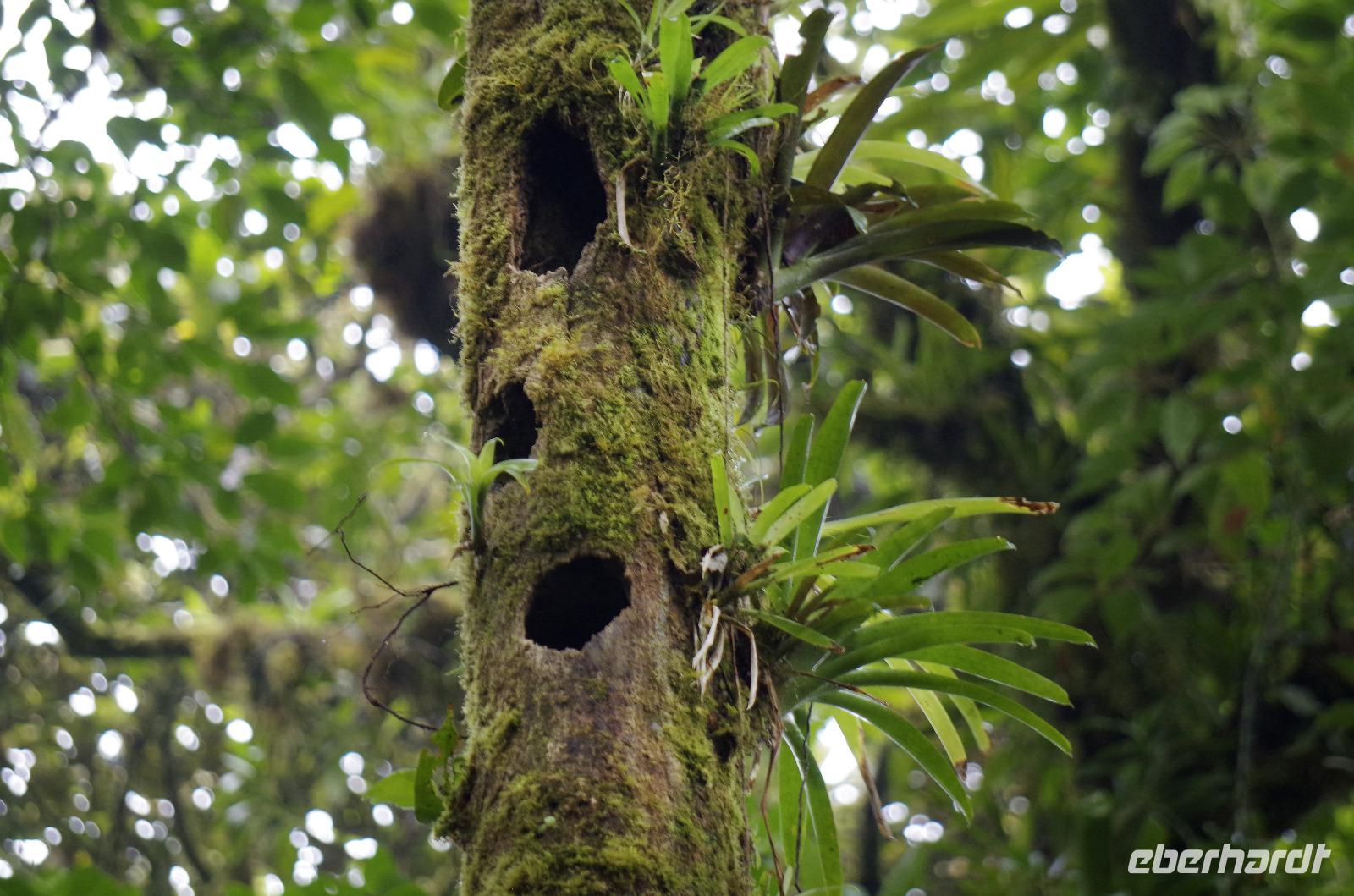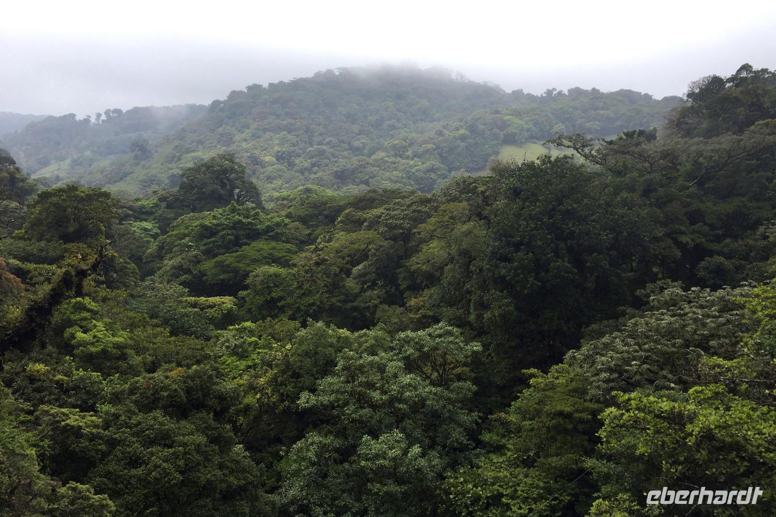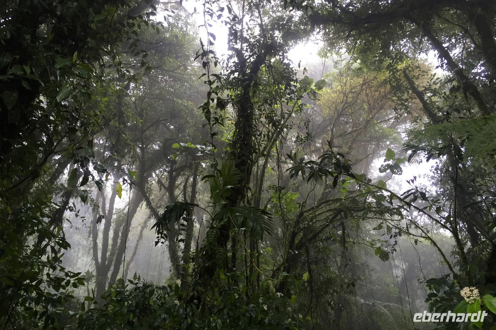 8.30 Uhr ging es heute, deutlich wärmer und wasserdichter angezogen als beim Rest der Reise, in das Naturschutzgebiet Santa Elena in 1.800 Metern Höhe. Wir befanden uns mitten im Nebelwald und durch Nebelschwaden und viel Wasserdunst wirkte alles sehr mystisch. Allzu viele Tiere konnten wir nicht entdecken. Aber die Pflanzenwelt barg ein paar neue Exemplare, die wir zuvor noch nicht gesehen hatten. Weiter ging unsere holprige Fahrt zum sogenannten Skywalk. Über sieben Hängebrücken führte ein ebenso mystischer Wanderweg durch Flora und Fauna. Eigentlich dürfen nur zehn Personen eine Brücke zeitgleich überqueren, aber eine Horde Brüllaffen hielt sich nicht daran, als wir schon fotografierend auf dieser standen :-) Sie turnten und kletterten die Seile entlang ... so nah und frei von Blättern, Ästen und Zweigen hatten wir sie nie gesehen und fotografiert. In diesem Areal versuchten wir auch den Quetzal, einen ganz besonderen Vogel, zu sichten. Reiseleiter Maurice ahmte ihre Rufe nach und höre da, es antwortete jemand, schnell in die Richtung gelaufen ... tja, blöderweise hatte ein anderer Reiseleiter „geantwortet". :-) So sahen wir leider nur die Brutlöcher der seltenen Vögel. Dafür hörten wir den Glockenvogel!