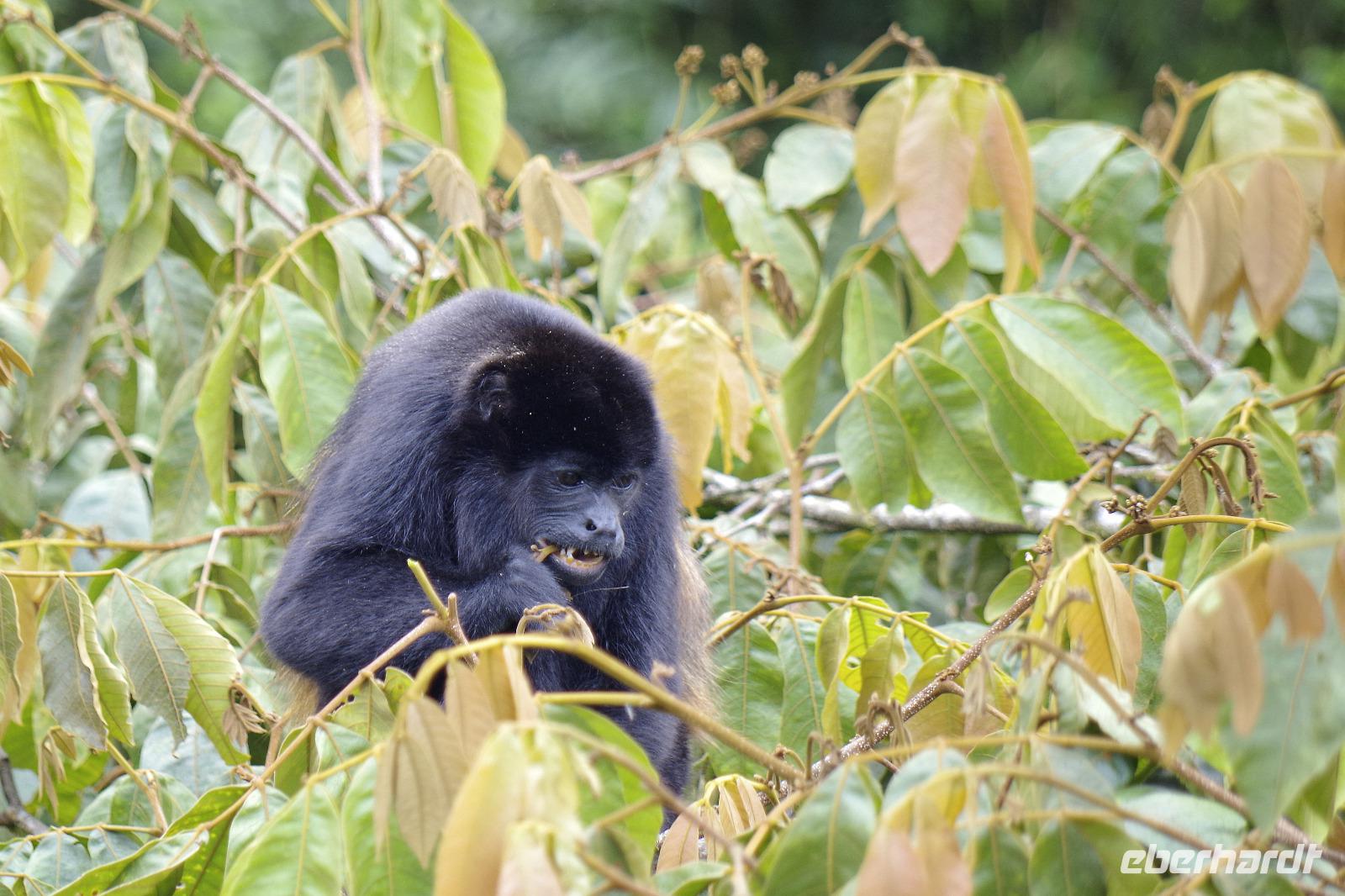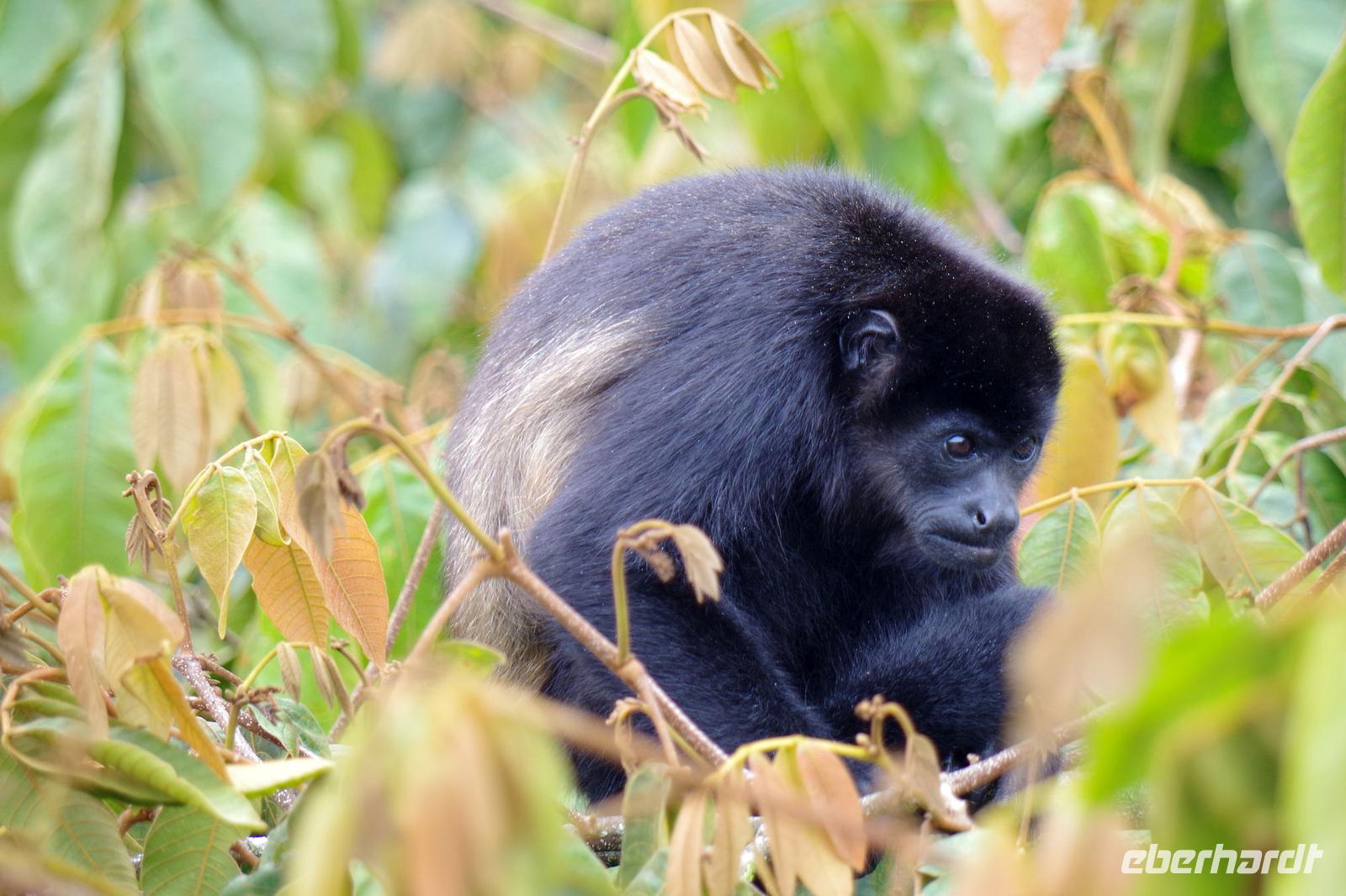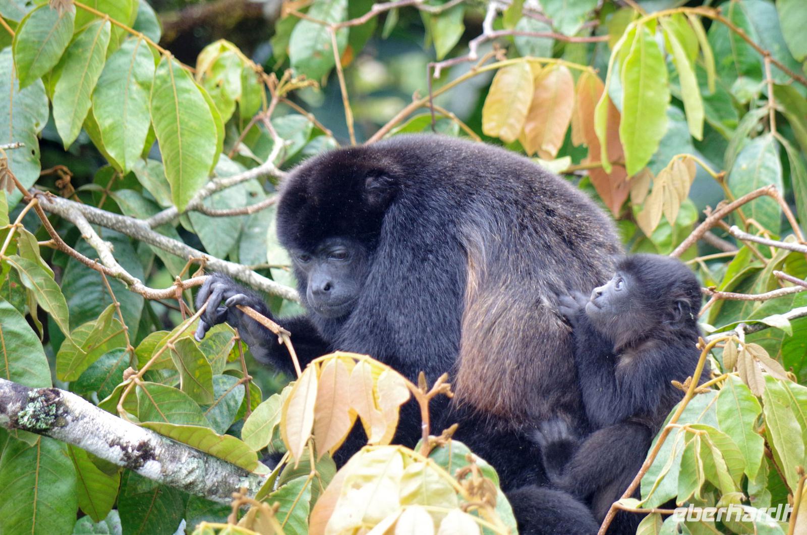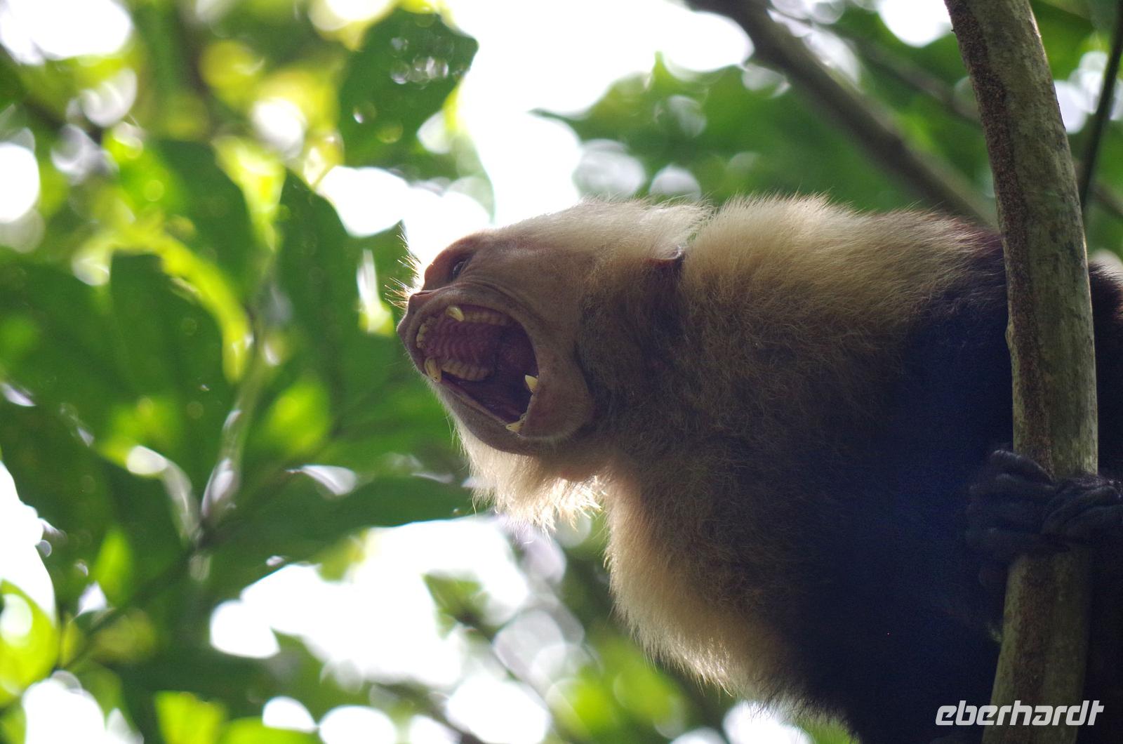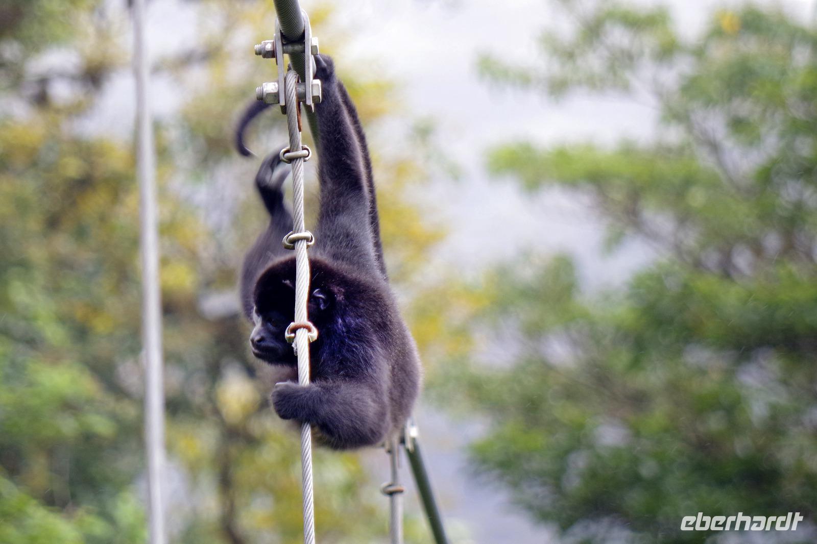 8.30 Uhr ging es heute, deutlich wärmer und wasserdichter angezogen als beim Rest der Reise, in das Naturschutzgebiet Santa Elena in 1.800 Metern Höhe. Wir befanden uns mitten im Nebelwald und durch Nebelschwaden und viel Wasserdunst wirkte alles sehr mystisch. Allzu viele Tiere konnten wir nicht entdecken. Aber die Pflanzenwelt barg ein paar neue Exemplare, die wir zuvor noch nicht gesehen hatten. Weiter ging unsere holprige Fahrt zum sogenannten Skywalk. Über sieben Hängebrücken führte ein ebenso mystischer Wanderweg durch Flora und Fauna. Eigentlich dürfen nur zehn Personen eine Brücke zeitgleich überqueren, aber eine Horde Brüllaffen hielt sich nicht daran, als wir schon fotografierend auf dieser standen :-) Sie turnten und kletterten die Seile entlang ... so nah und frei von Blättern, Ästen und Zweigen hatten wir sie nie gesehen und fotografiert. In diesem Areal versuchten wir auch den Quetzal, einen ganz besonderen Vogel, zu sichten. Reiseleiter Maurice ahmte ihre Rufe nach und höre da, es antwortete jemand, schnell in die Richtung gelaufen ... tja, blöderweise hatte ein anderer Reiseleiter „geantwortet". :-) So sahen wir leider nur die Brutlöcher der seltenen Vögel. Dafür hörten wir den Glockenvogel!