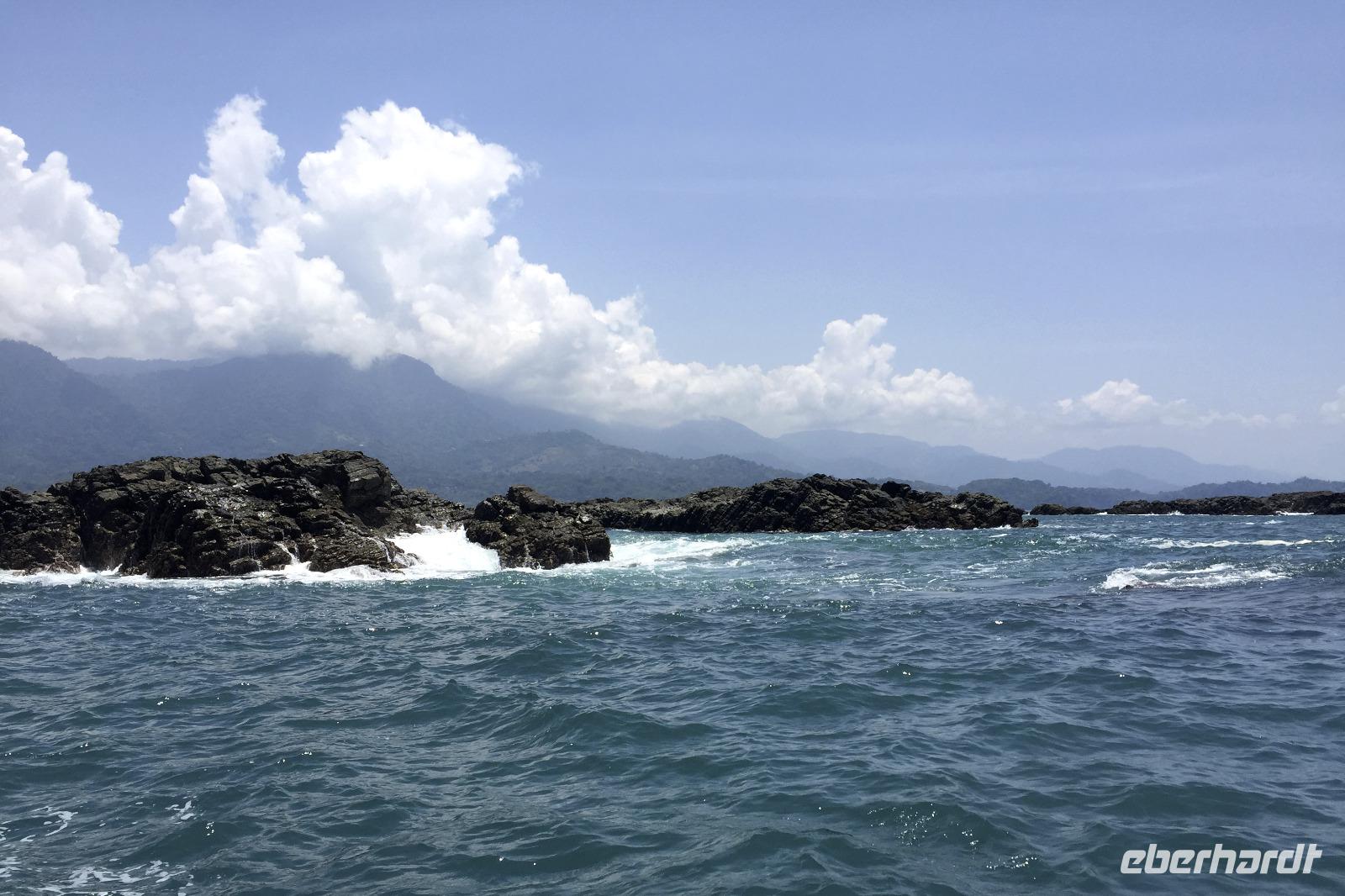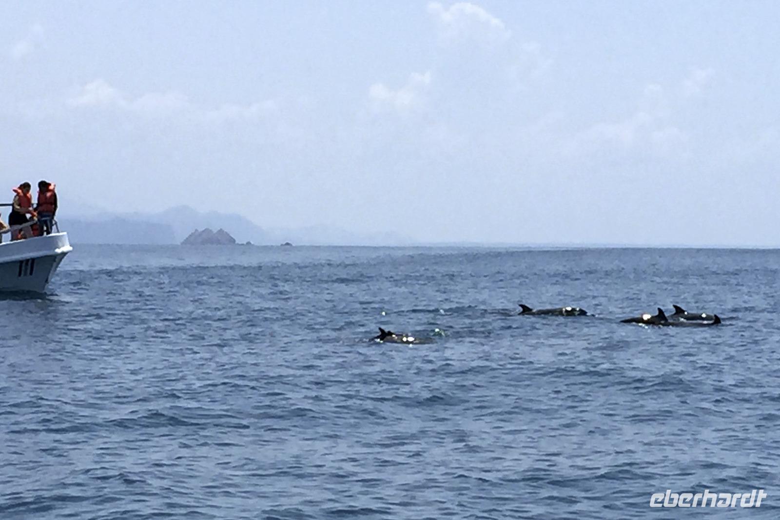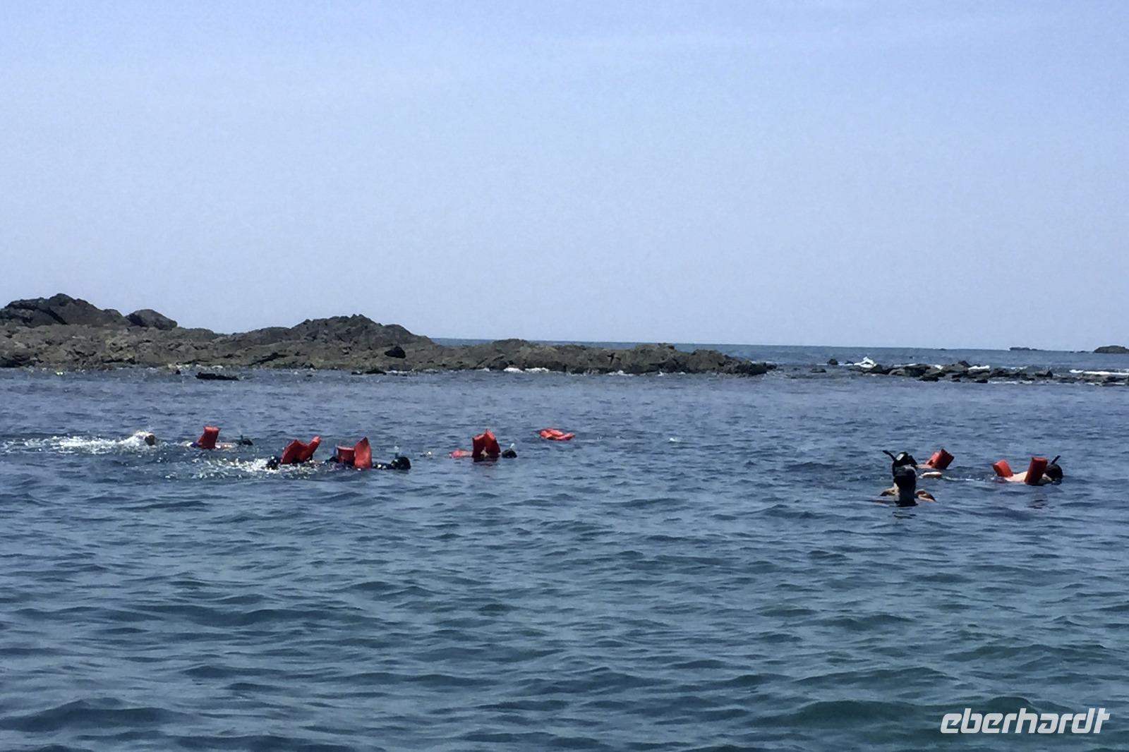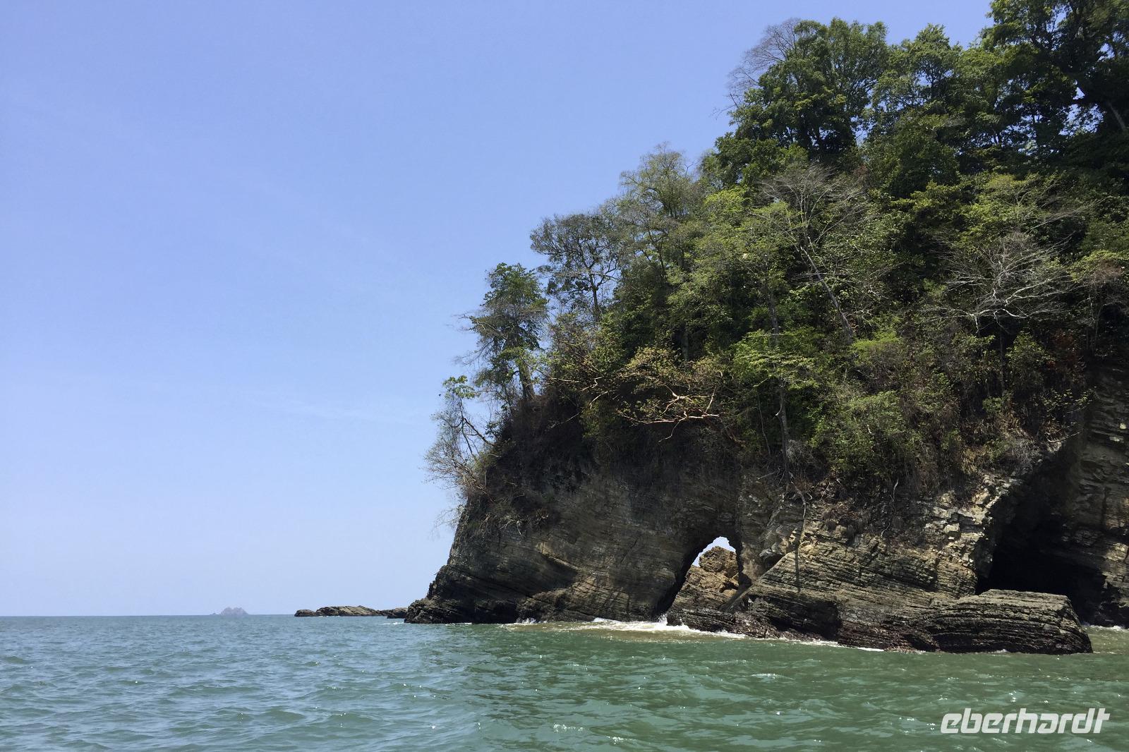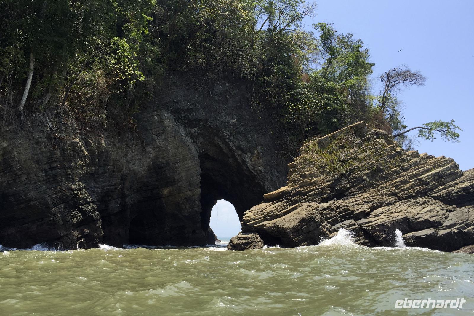 Erster Schreck am Morgen, die Auffahrt zum Hotel mochte unseren Bus nicht besonders, er hat aufgesessen. Zum Glück hielt gleich ein 3500er Dodge und zog uns frei. Das Boot am Pazifik wartete auf uns. Barfuß ging es ans Meer und rauf aufs Boot. Mit umgeschnallten Schwimmwesten düsten wir aufs offene Meer hinaus, entdeckten Delfine, die unser Boot begleiteten, und eine Meeresschildkröte. Am Strand spazierten wir dann ein wenig umher, hier gab es natürliche Löcher und Höhlen in den Felsen. Es gab Obst und durch Wetter und Optik fühlte man sich ein wenig wie im Paradies.