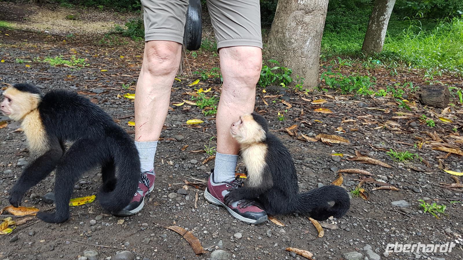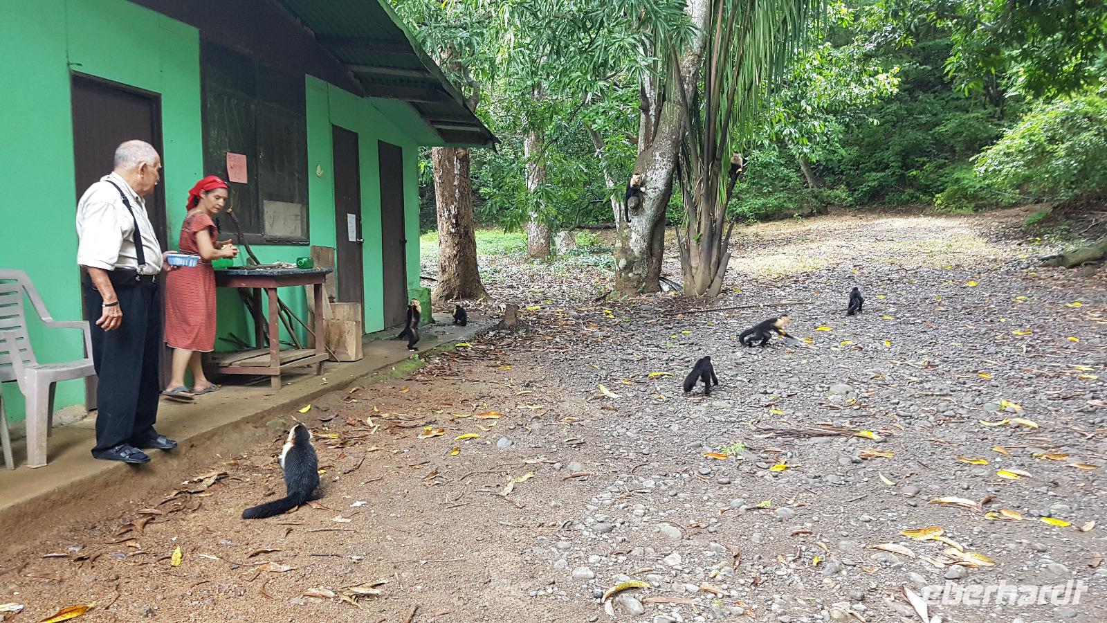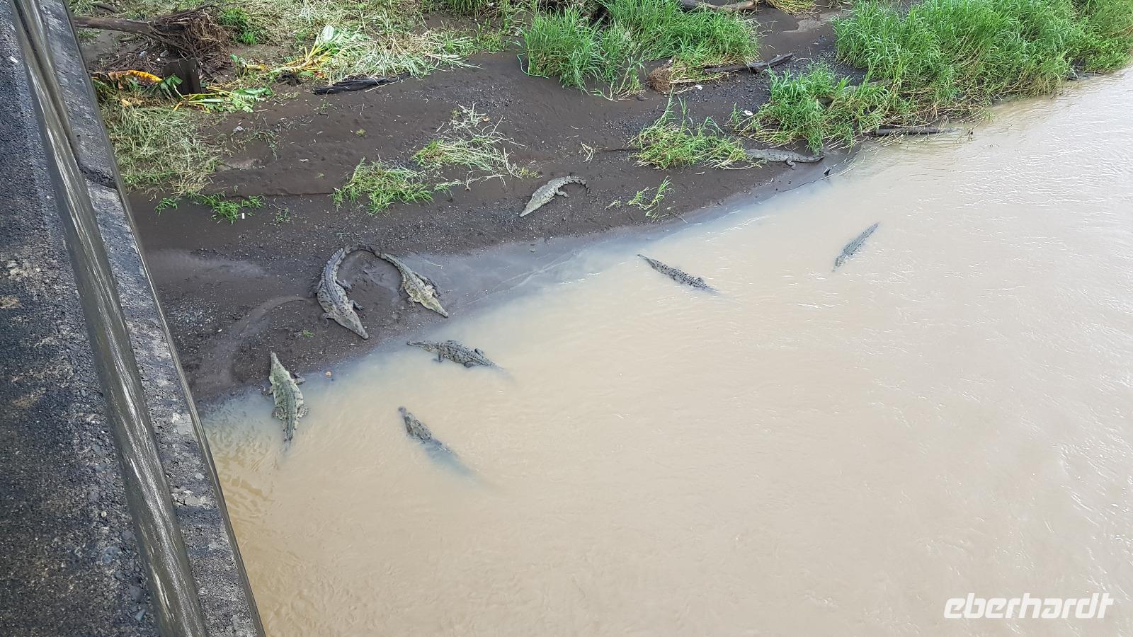 Mit unserem Bus fuhren wir hinunter zur Hauptstrasse und dort machten wir einen kurzen Abstecher zu einer Familie, die sich liebevoll um Kapuzineraffen kümmerte. Wir kamen den Tieren ganz nahe, durften sie füttern und die Affen kletterten auch gern auf unsere Schultern. Unzählige Fotos wurden geschossen und wir hatten Tiere "hautnah" erleben dürfen. Auf der Weiterfahrt an der Südküste legten wir einen Stopp beim Tacoles Fluss ein, wo unten an einer Brücke viele Krokodile lagen. Die Tiere finden dort alles was sie brauchen und bei grosser Hitze flüchten sie in den Schatten unter der Brücke. Am Abend erreichten wir bei Dunkelheit und Regen unser Hotel Karahe nahe dem Manuel Antonio Nationalpark. Das Abendessen gab es im Beachrestaurant und hier konnten wir leicht bekleidet aber mit Schirm zum Essen gehen. Das Erkunden des Strandes verlegten wir auf den Folgetag.