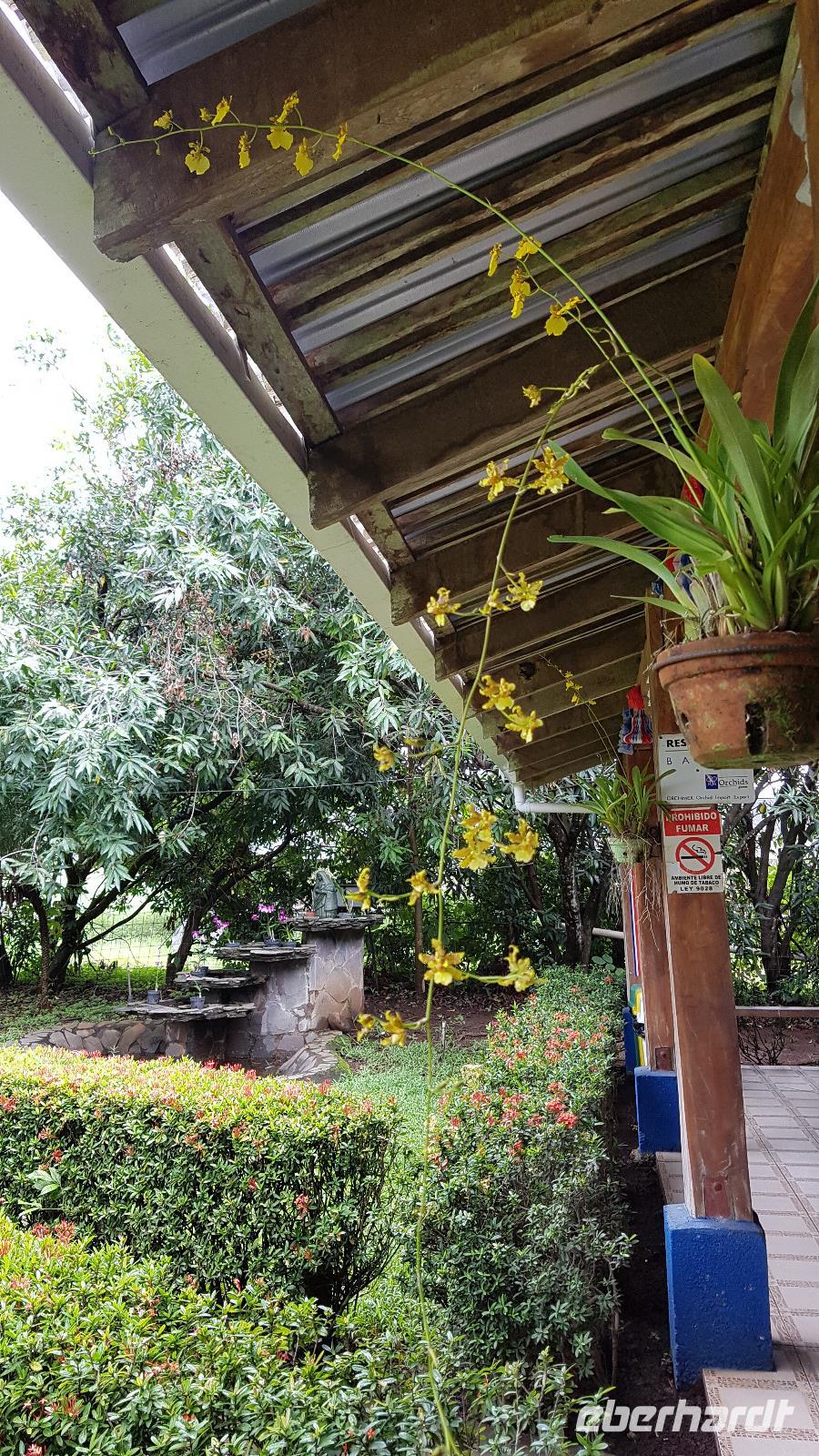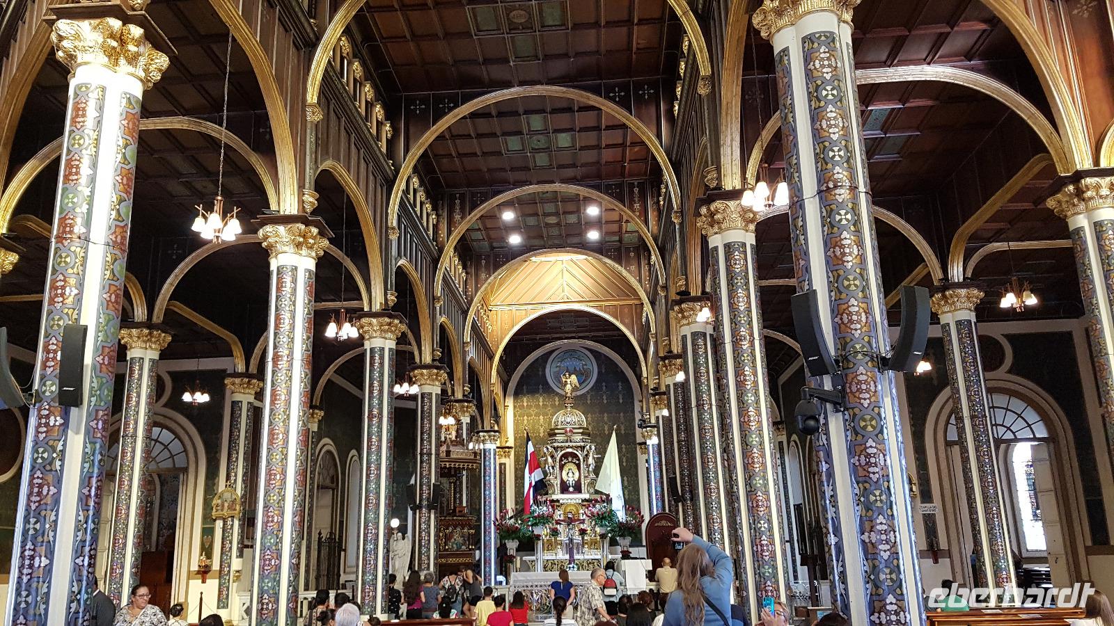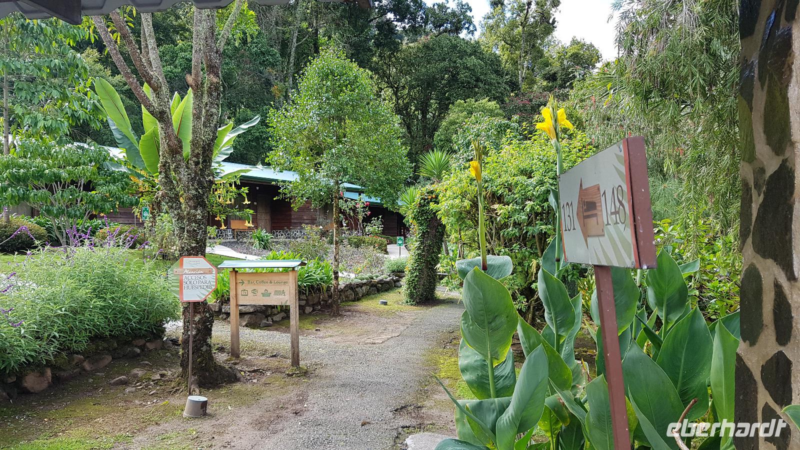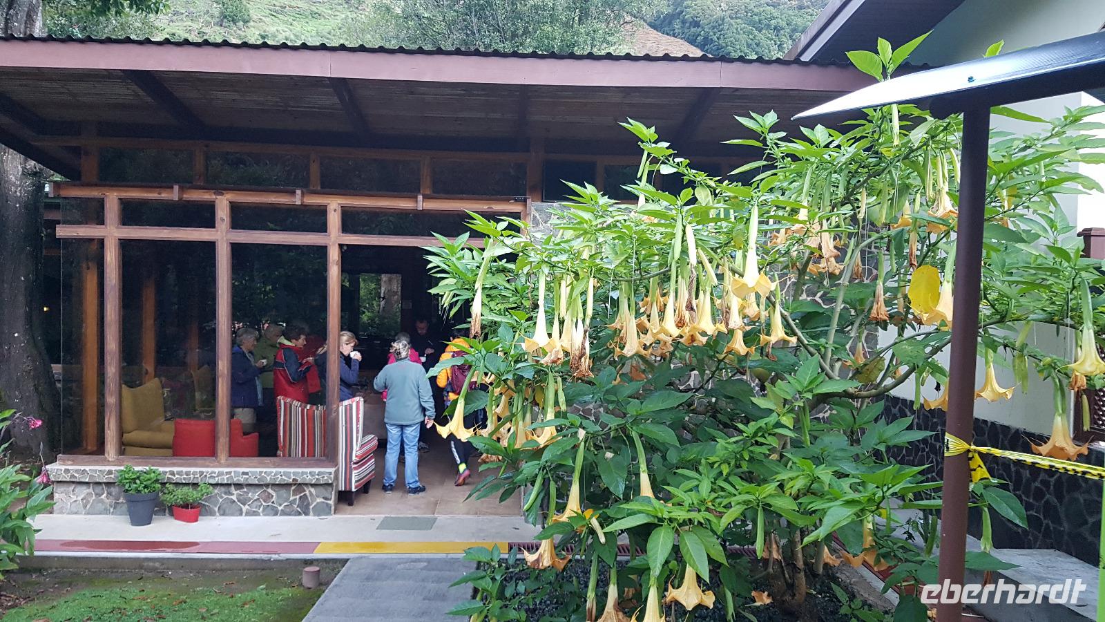 An einer Raststätte legten wir eine kurze Mittagspause ein und beschlossen dann ganz spontan, in der alten Hauptstadt Cartago, Costa Ricas wichtigste Kirche zu besuchen. Nico stimmte uns schon im Bus mit der Geschichte über den Fund der schwarzen kleinen Madonna auf die Kirche ein. Der heutige Bau stammt allerdings von 1912, da die ursprüngliche Kirche bei einem Erdbeben 1910 zerstört wurde. Wir besuchten zunächst das Untergeschoss, wo der Stein mit der Fundstelle der Madonna gezeigt wird. Dann besichtigten wir die Anlagen der heiligen Quelle, wo man Wasser abfüllen kann und schliesslich das prächtige Innere der Basilika Nuestra Senora de los Angeles. Jährlich am 2.August pilgern tausende Menschen von San Jose hierher nach Cartago, um die Madonna zu ehren. Unsere Fahrt ging danach weiter in das Gebiet der Vulkane. Unterwegs kaufte ich in einer Käserei den Käse für unser morgiges Picknick und unsere nächste Unterkunft am unteren Hang des Turrialba war ganz besonders schön. Eine sehr naturbelassene "Strasse" führte zur Guayabo Lodge mit dem grossen, gepfegten Garten. Ein gutes und schmackhaftes Abendessen beschloss diesen erlebnisreichen Tag.