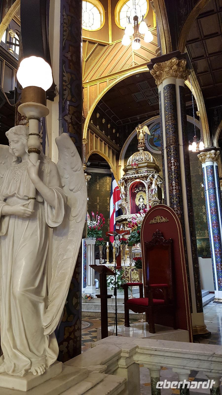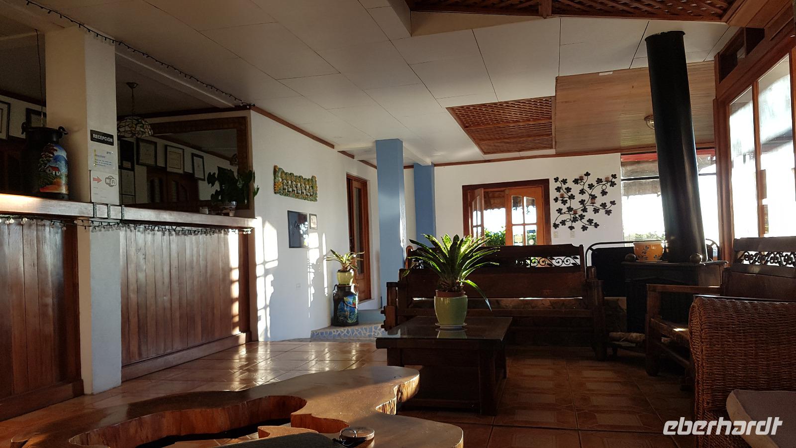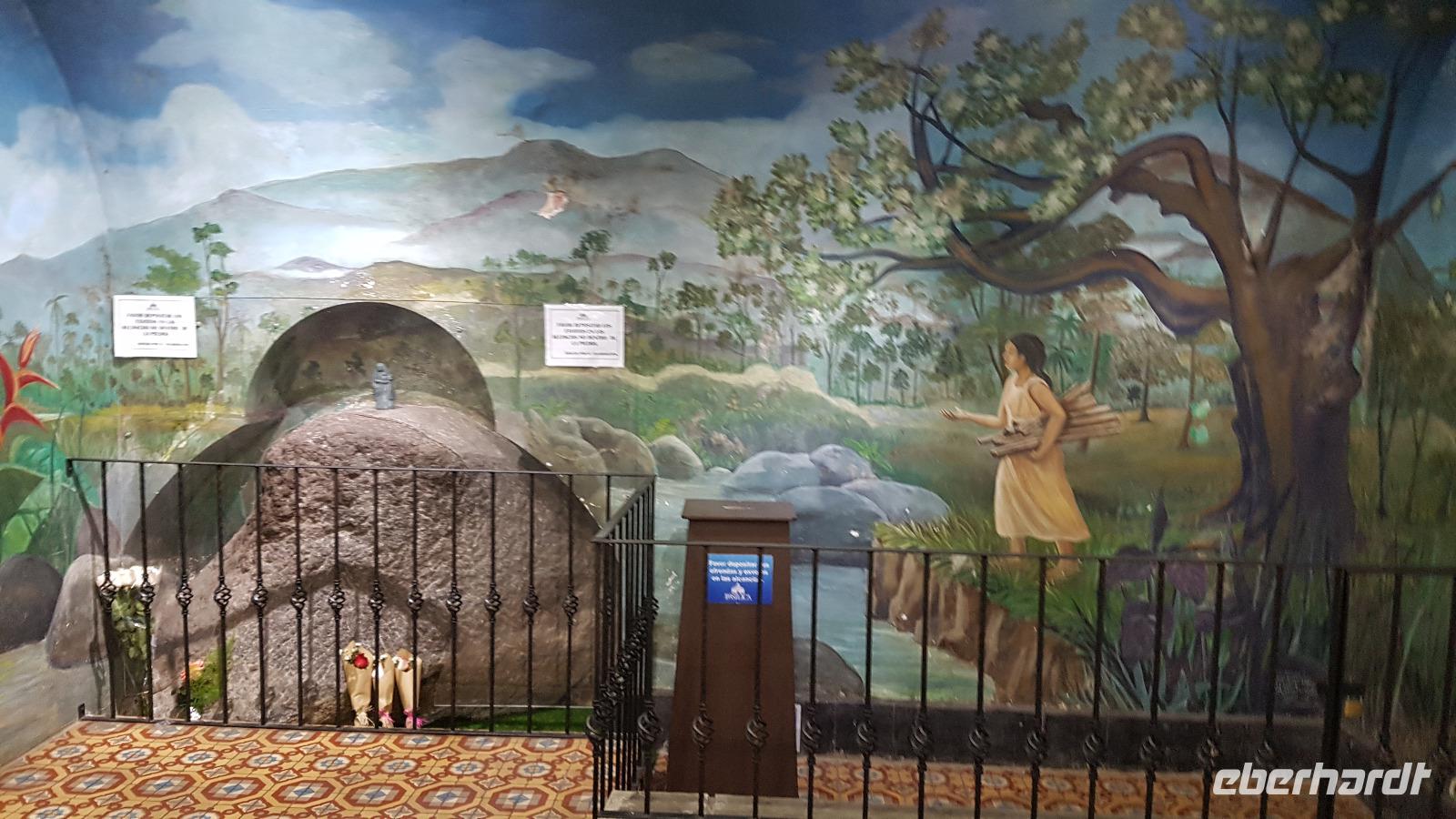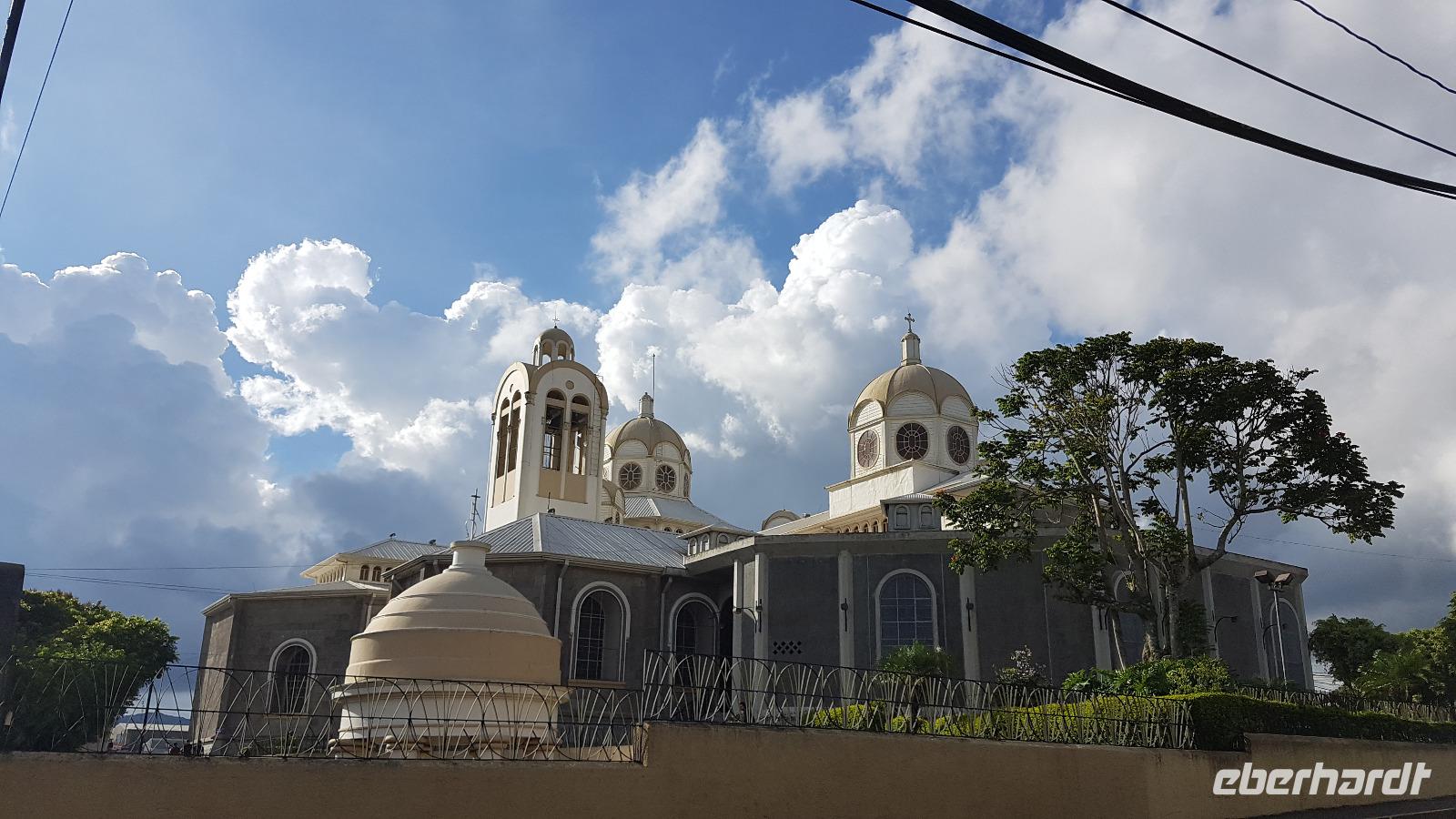 An einer Raststätte legten wir eine kurze Mittagspause ein und beschlossen dann ganz spontan, in der alten Hauptstadt Cartago, Costa Ricas wichtigste Kirche zu besuchen. Nico stimmte uns schon im Bus mit der Geschichte über den Fund der schwarzen kleinen Madonna auf die Kirche ein. Der heutige Bau stammt allerdings von 1912, da die ursprüngliche Kirche bei einem Erdbeben 1910 zerstört wurde. Wir besuchten zunächst das Untergeschoss, wo der Stein mit der Fundstelle der Madonna gezeigt wird. Dann besichtigten wir die Anlagen der heiligen Quelle, wo man Wasser abfüllen kann und schliesslich das prächtige Innere der Basilika Nuestra Senora de los Angeles. Jährlich am 2.August pilgern tausende Menschen von San Jose hierher nach Cartago, um die Madonna zu ehren. Unsere Fahrt ging danach weiter in das Gebiet der Vulkane. Unterwegs kaufte ich in einer Käserei den Käse für unser morgiges Picknick und unsere nächste Unterkunft am unteren Hang des Turrialba war ganz besonders schön. Eine sehr naturbelassene "Strasse" führte zur Guayabo Lodge mit dem grossen, gepfegten Garten. Ein gutes und schmackhaftes Abendessen beschloss diesen erlebnisreichen Tag.