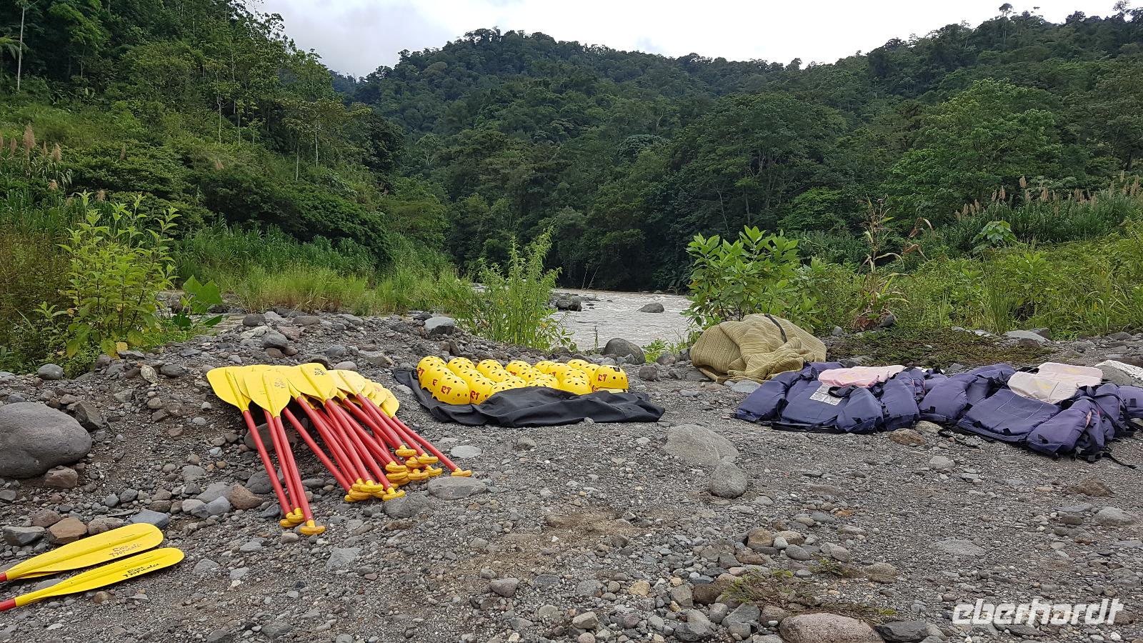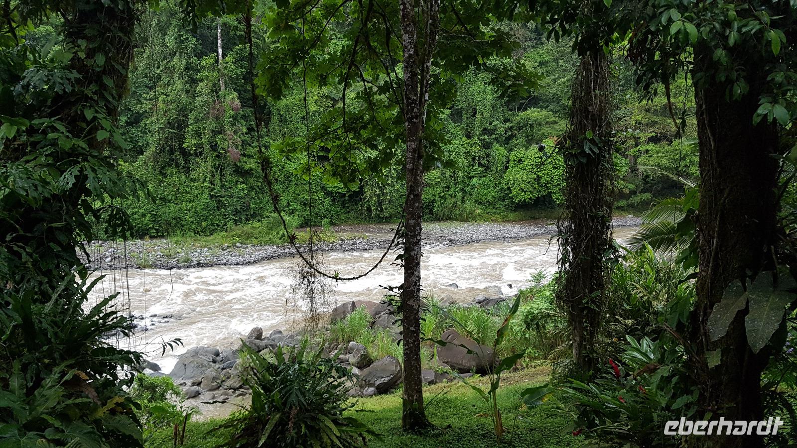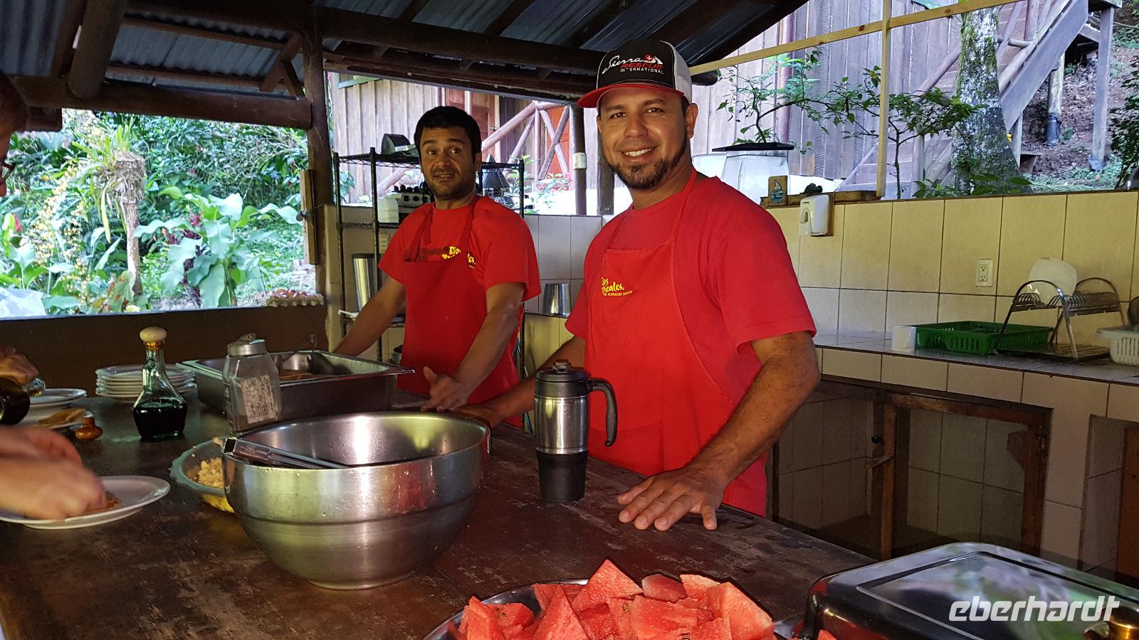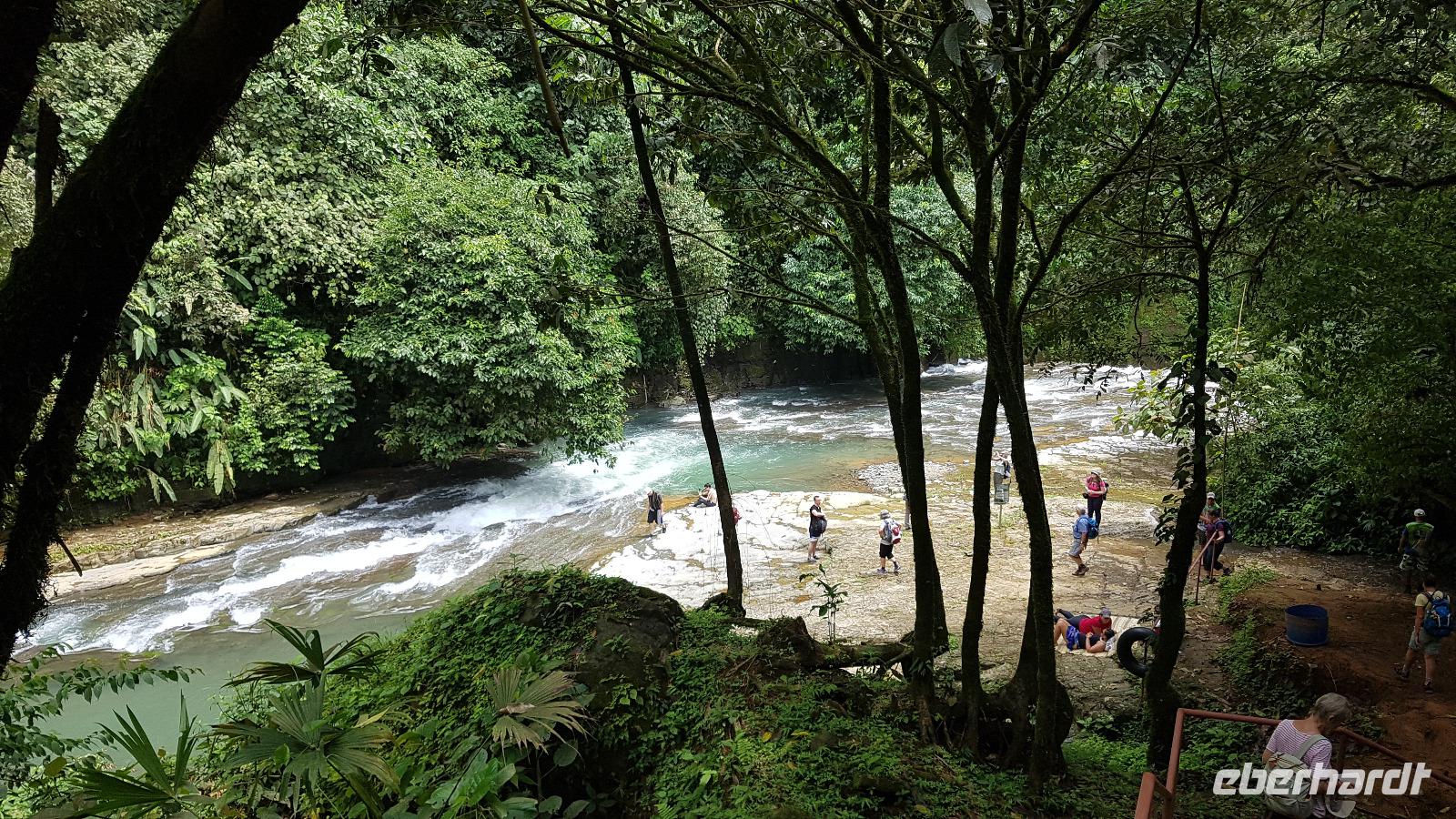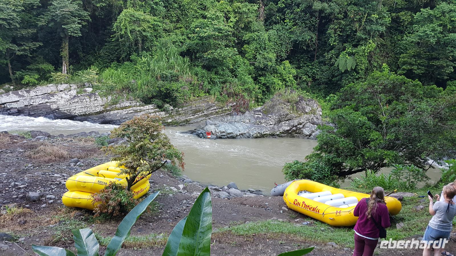 Neben den wilden Stellen im Paguare Fluss gab es auch ruhige und an einer solchen ruhigen Sandbank gingen wir an Land. Ein Boot wurde umgedreht und diente als Tisch. Während Ivan und Walter für uns das Picknick herrichteten, ging Jorge mit uns zu einem kleinen Fluss, erklärte uns das farbige Sedimentsgestein und weiter oben in einem kleinen Becken konnten wir schwimmen. Wieder zurück, liessen wir uns das Picknick schmecken, denn Rafting macht hungrig. Danach wurde alles zusammen gepackt und wir befuhren weiter den Paguare Fluss bis zu unserer Rios Tropicales Lodge. Dort gingen wir an Land, hingen die Helme und Rettungswesten auf eine schon vorbereitete Leine und nahmen die Schlüssel für unsere Unterkunft entgegen. Die Lodge lag direkt am Fluss und die hübschen Zimmer in dieser Wildnis waren eine echte Überraschung. Wir brachten nur das Gepäck in die Zimmer und wer noch Lust und Laune hatte, nahm an einer Regenwaldwanderung mit Ziel Wasserfall teil. Es war wieder sehr interessant und im Wassenfall konnten wir auch schwimmen. Beim Abfluss eines zweiten Wasserfalls war ein kleiner Generator installiert, der den Strom für die gesamte Lodge erzeugte. Wir zogen uns trockene Sachen an und trafen uns dann auf einen Welcome Drink auf der überdachten Terrasse. Dort blieben wir dann auch sitzen bis zum Abendessen und sahen unseren Bootsführern zu, wie sie unser Essen vorbereiteten. Einfach genial - diese Männer !