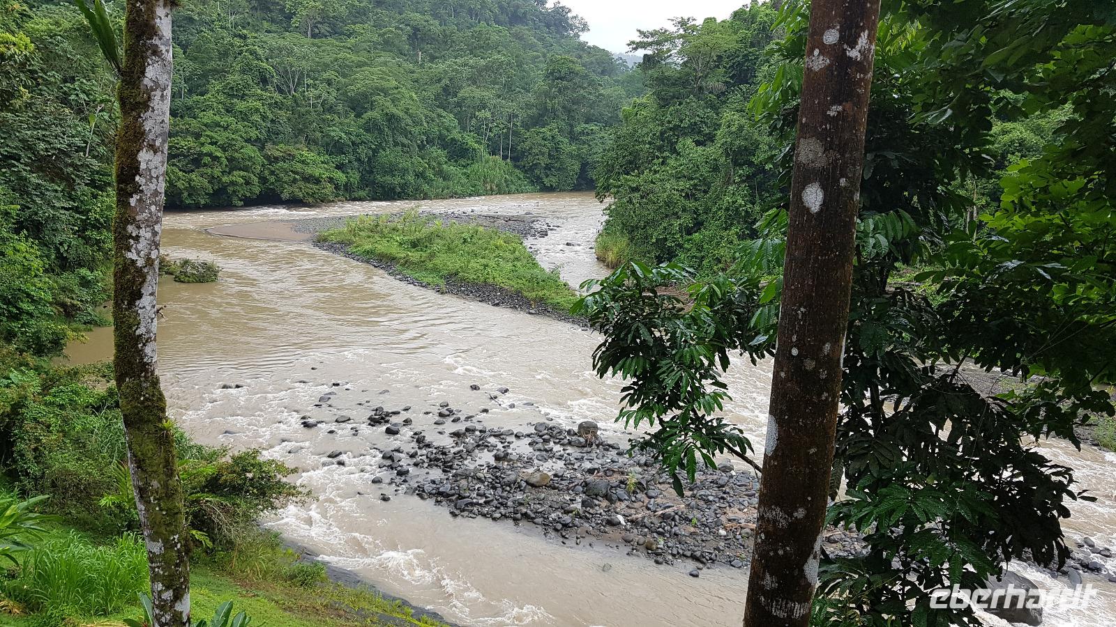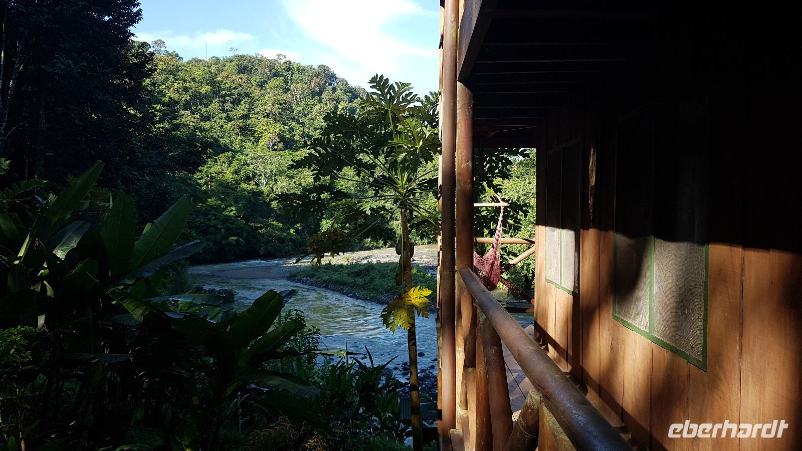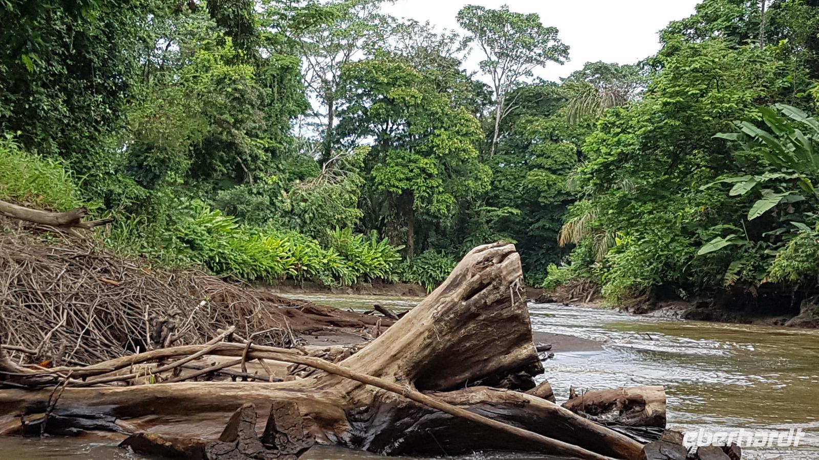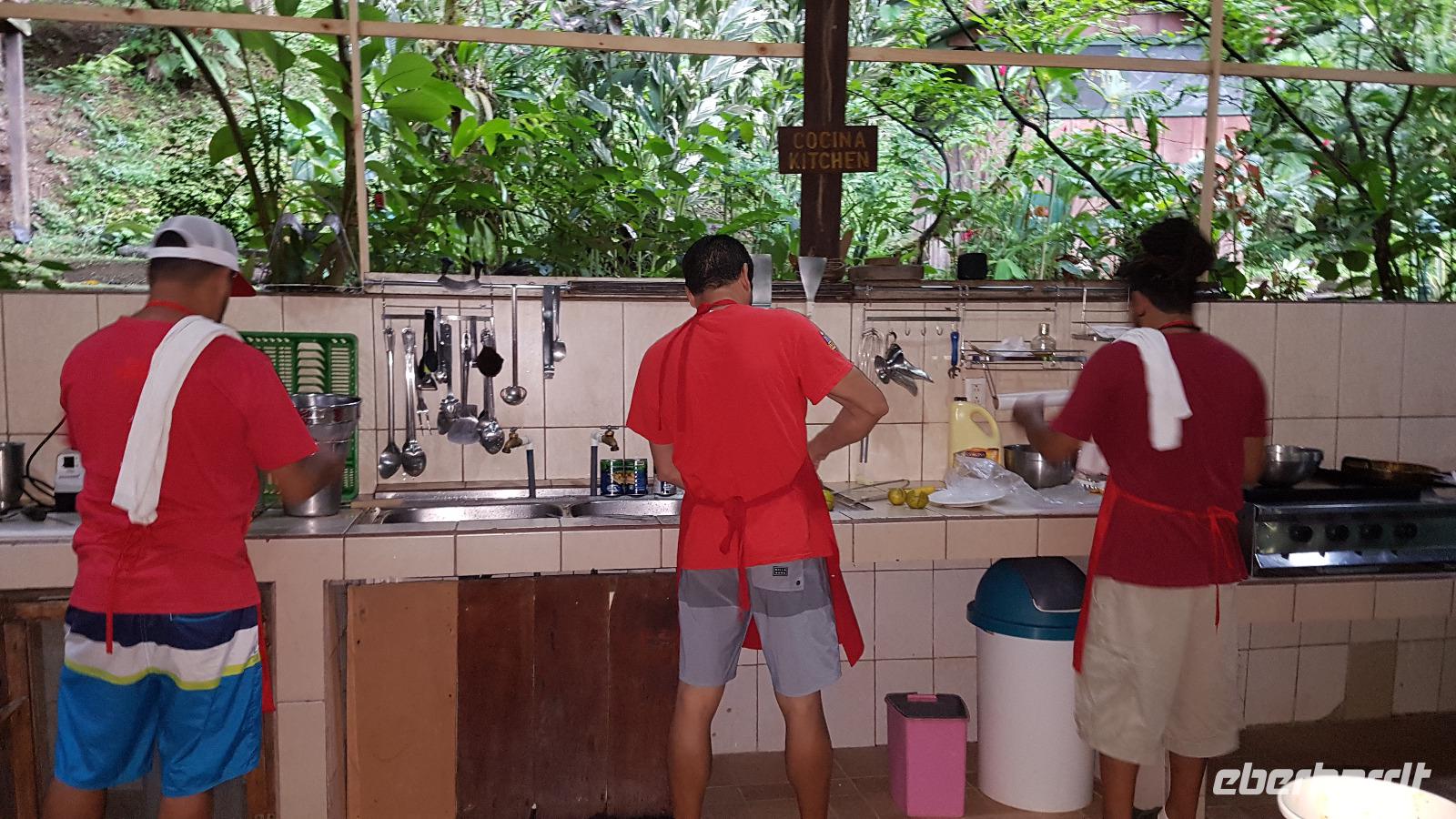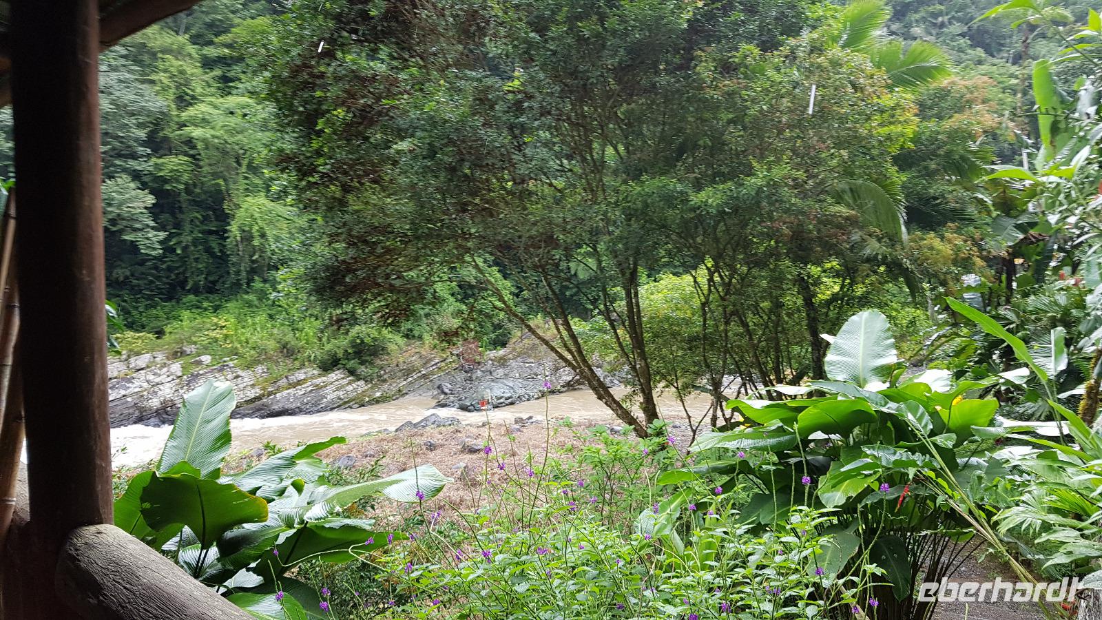 Neben den wilden Stellen im Paguare Fluss gab es auch ruhige und an einer solchen ruhigen Sandbank gingen wir an Land. Ein Boot wurde umgedreht und diente als Tisch. Während Ivan und Walter für uns das Picknick herrichteten, ging Jorge mit uns zu einem kleinen Fluss, erklärte uns das farbige Sedimentsgestein und weiter oben in einem kleinen Becken konnten wir schwimmen. Wieder zurück, liessen wir uns das Picknick schmecken, denn Rafting macht hungrig. Danach wurde alles zusammen gepackt und wir befuhren weiter den Paguare Fluss bis zu unserer Rios Tropicales Lodge. Dort gingen wir an Land, hingen die Helme und Rettungswesten auf eine schon vorbereitete Leine und nahmen die Schlüssel für unsere Unterkunft entgegen. Die Lodge lag direkt am Fluss und die hübschen Zimmer in dieser Wildnis waren eine echte Überraschung. Wir brachten nur das Gepäck in die Zimmer und wer noch Lust und Laune hatte, nahm an einer Regenwaldwanderung mit Ziel Wasserfall teil. Es war wieder sehr interessant und im Wassenfall konnten wir auch schwimmen. Beim Abfluss eines zweiten Wasserfalls war ein kleiner Generator installiert, der den Strom für die gesamte Lodge erzeugte. Wir zogen uns trockene Sachen an und trafen uns dann auf einen Welcome Drink auf der überdachten Terrasse. Dort blieben wir dann auch sitzen bis zum Abendessen und sahen unseren Bootsführern zu, wie sie unser Essen vorbereiteten. Einfach genial - diese Männer !