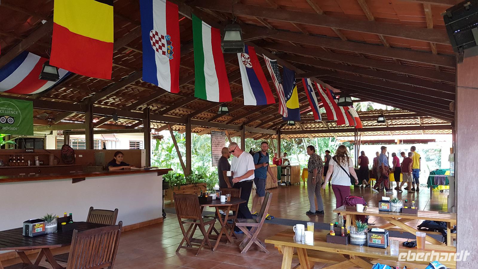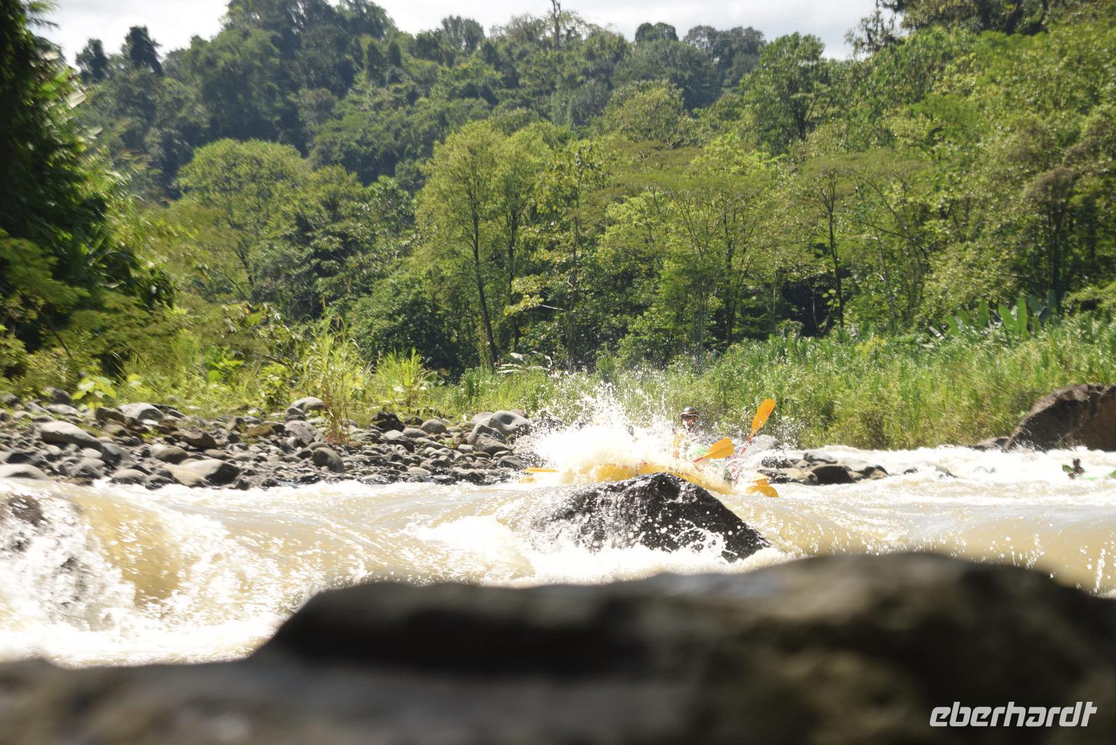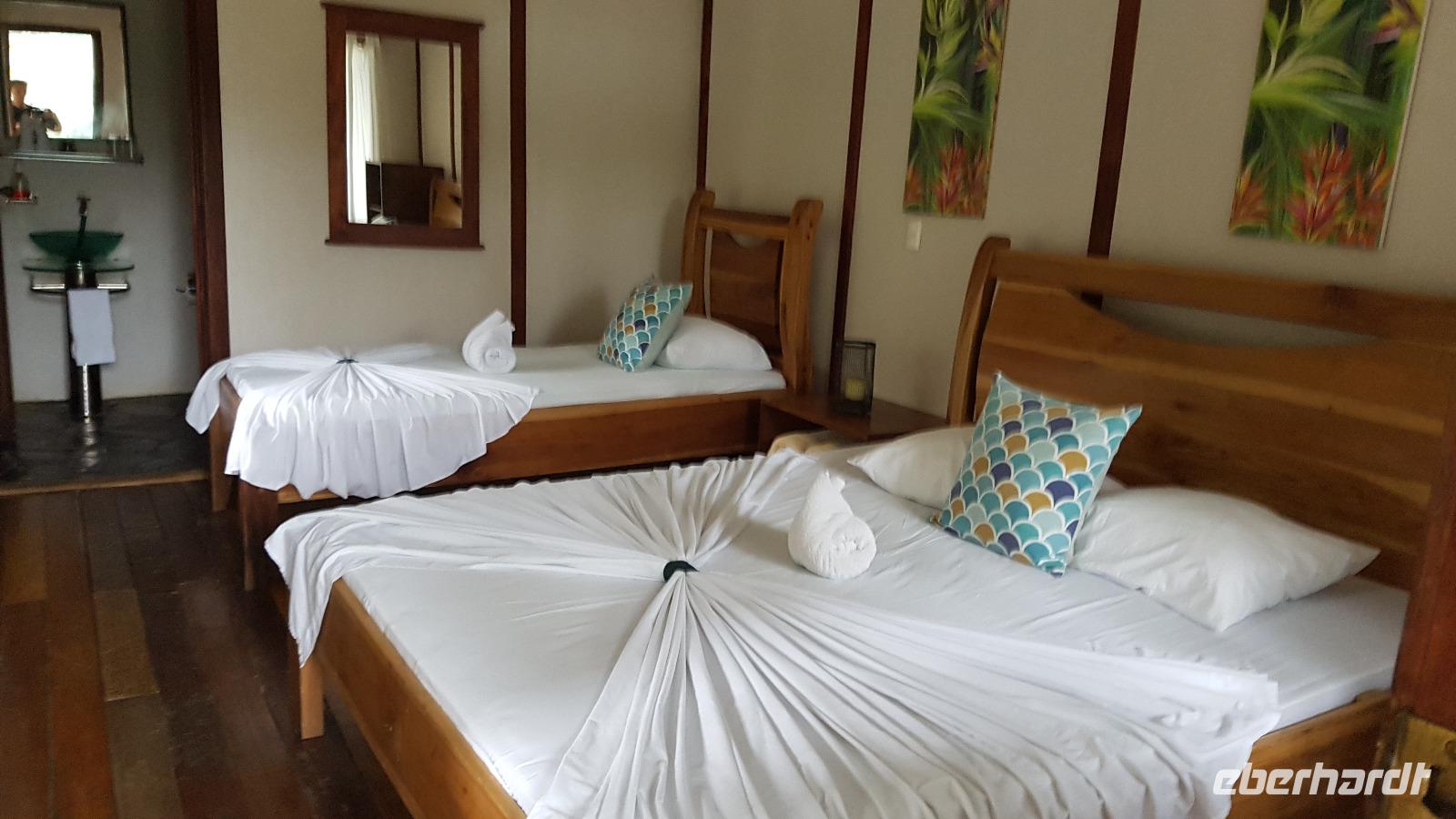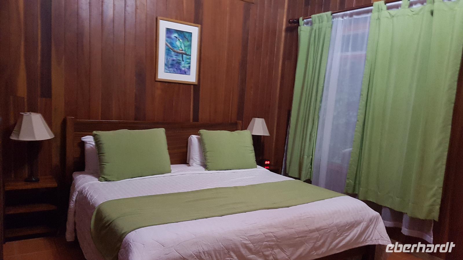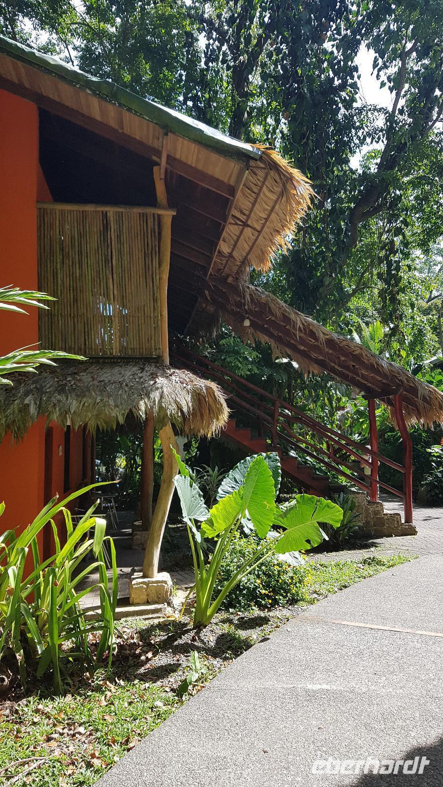 Neben den wilden Stellen im Paguare Fluss gab es auch ruhige und an einer solchen ruhigen Sandbank gingen wir an Land. Ein Boot wurde umgedreht und diente als Tisch. Während Ivan und Walter für uns das Picknick herrichteten, ging Jorge mit uns zu einem kleinen Fluss, erklärte uns das farbige Sedimentsgestein und weiter oben in einem kleinen Becken konnten wir schwimmen. Wieder zurück, liessen wir uns das Picknick schmecken, denn Rafting macht hungrig. Danach wurde alles zusammen gepackt und wir befuhren weiter den Paguare Fluss bis zu unserer Rios Tropicales Lodge. Dort gingen wir an Land, hingen die Helme und Rettungswesten auf eine schon vorbereitete Leine und nahmen die Schlüssel für unsere Unterkunft entgegen. Die Lodge lag direkt am Fluss und die hübschen Zimmer in dieser Wildnis waren eine echte Überraschung. Wir brachten nur das Gepäck in die Zimmer und wer noch Lust und Laune hatte, nahm an einer Regenwaldwanderung mit Ziel Wasserfall teil. Es war wieder sehr interessant und im Wassenfall konnten wir auch schwimmen. Beim Abfluss eines zweiten Wasserfalls war ein kleiner Generator installiert, der den Strom für die gesamte Lodge erzeugte. Wir zogen uns trockene Sachen an und trafen uns dann auf einen Welcome Drink auf der überdachten Terrasse. Dort blieben wir dann auch sitzen bis zum Abendessen und sahen unseren Bootsführern zu, wie sie unser Essen vorbereiteten. Einfach genial - diese Männer !
