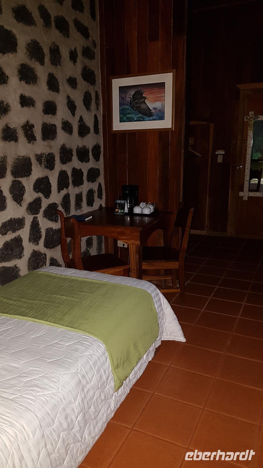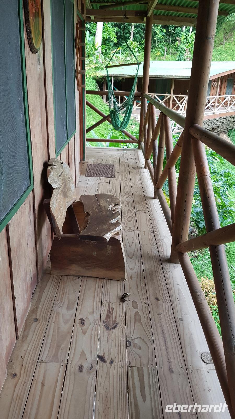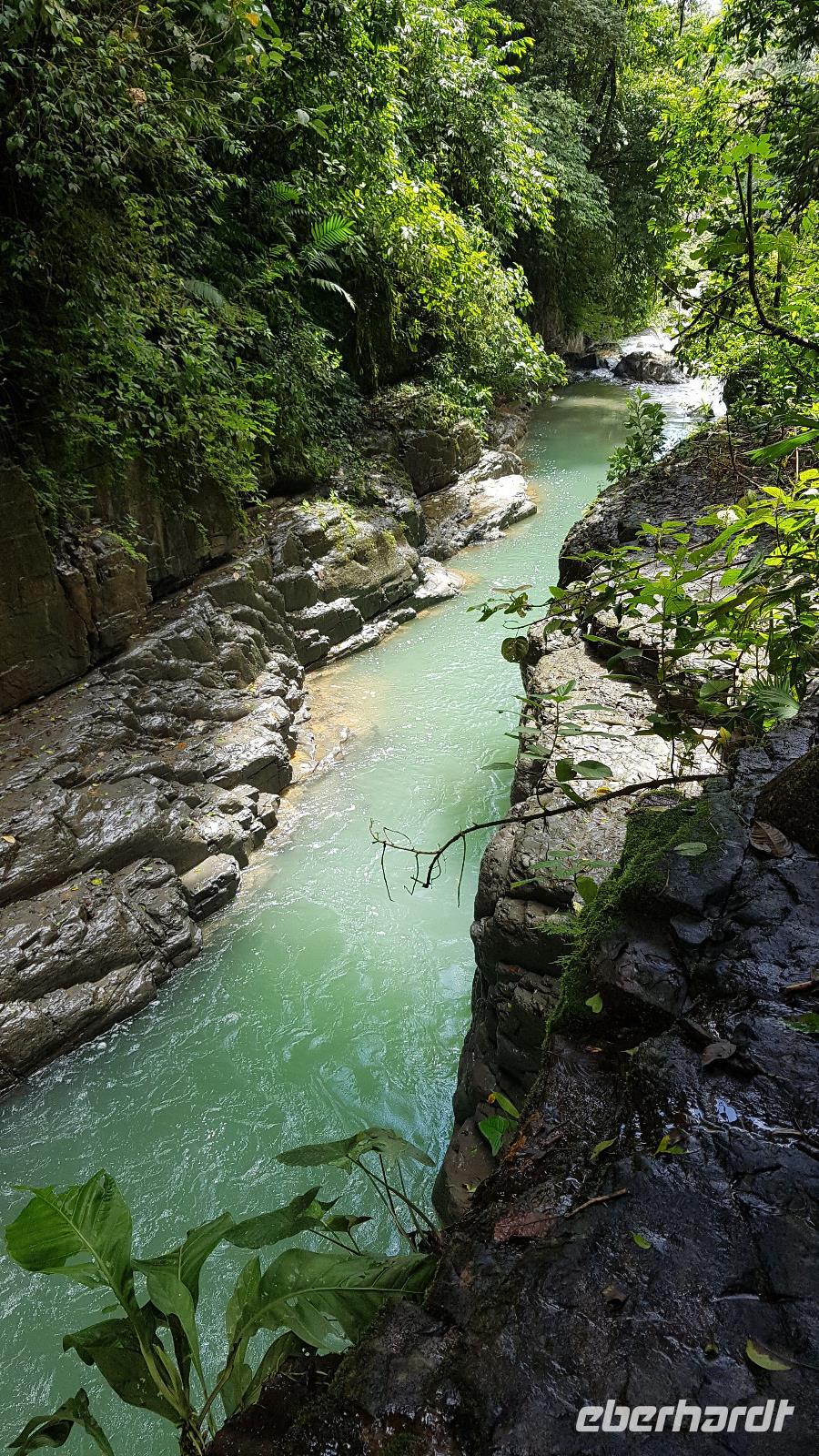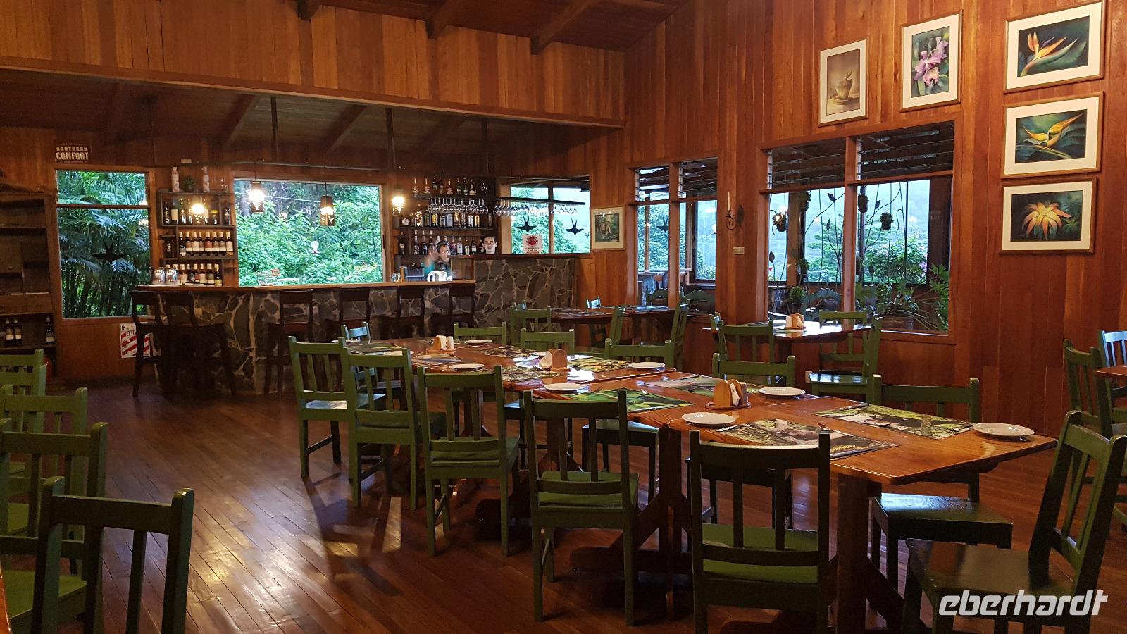 Neben den wilden Stellen im Paguare Fluss gab es auch ruhige und an einer solchen ruhigen Sandbank gingen wir an Land. Ein Boot wurde umgedreht und diente als Tisch. Während Ivan und Walter für uns das Picknick herrichteten, ging Jorge mit uns zu einem kleinen Fluss, erklärte uns das farbige Sedimentsgestein und weiter oben in einem kleinen Becken konnten wir schwimmen. Wieder zurück, liessen wir uns das Picknick schmecken, denn Rafting macht hungrig. Danach wurde alles zusammen gepackt und wir befuhren weiter den Paguare Fluss bis zu unserer Rios Tropicales Lodge. Dort gingen wir an Land, hingen die Helme und Rettungswesten auf eine schon vorbereitete Leine und nahmen die Schlüssel für unsere Unterkunft entgegen. Die Lodge lag direkt am Fluss und die hübschen Zimmer in dieser Wildnis waren eine echte Überraschung. Wir brachten nur das Gepäck in die Zimmer und wer noch Lust und Laune hatte, nahm an einer Regenwaldwanderung mit Ziel Wasserfall teil. Es war wieder sehr interessant und im Wassenfall konnten wir auch schwimmen. Beim Abfluss eines zweiten Wasserfalls war ein kleiner Generator installiert, der den Strom für die gesamte Lodge erzeugte. Wir zogen uns trockene Sachen an und trafen uns dann auf einen Welcome Drink auf der überdachten Terrasse. Dort blieben wir dann auch sitzen bis zum Abendessen und sahen unseren Bootsführern zu, wie sie unser Essen vorbereiteten. Einfach genial - diese Männer !