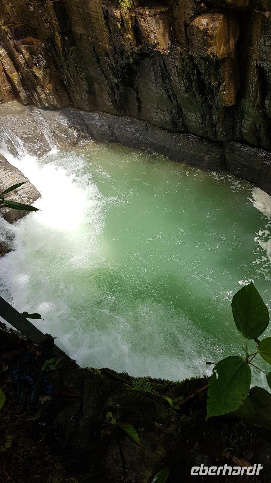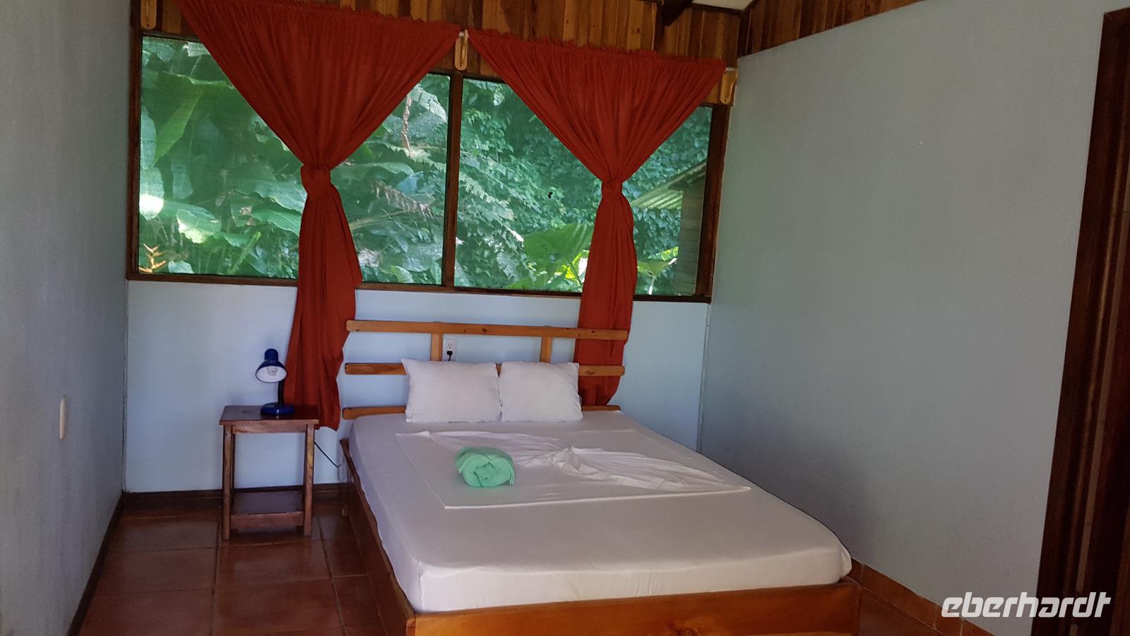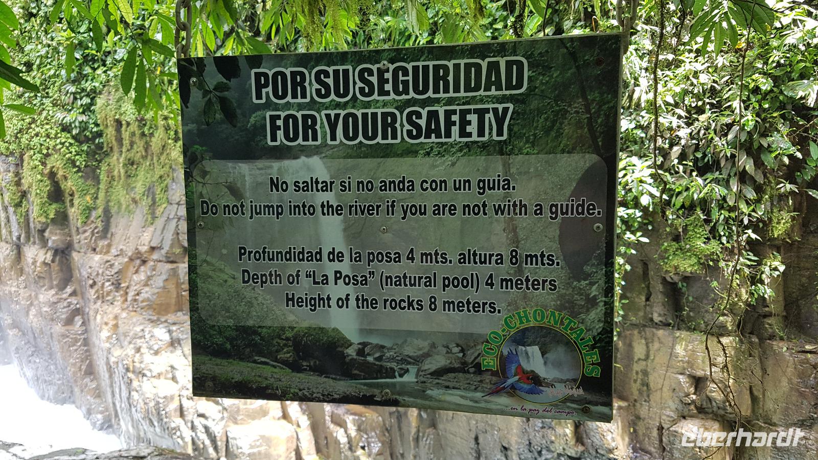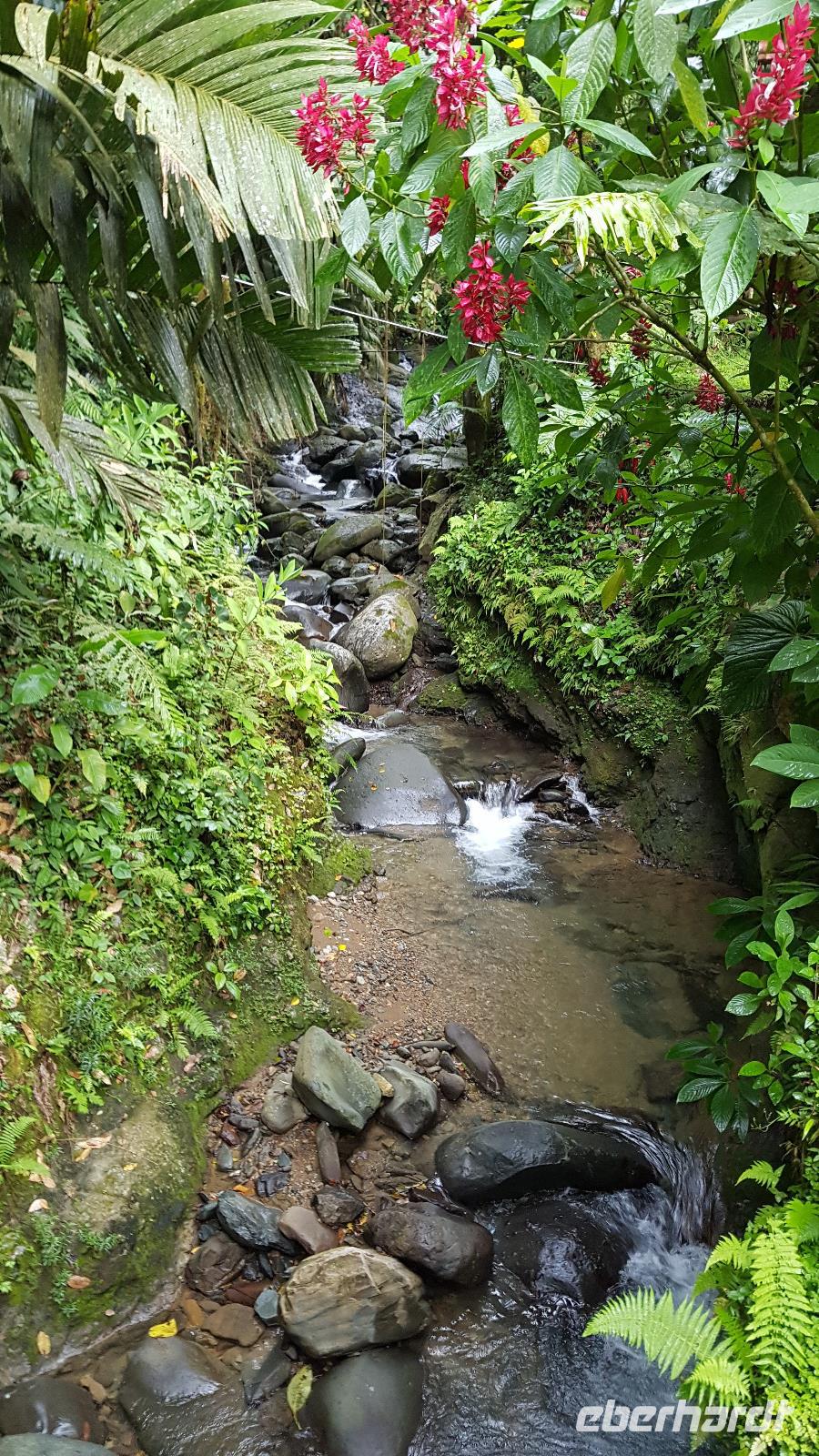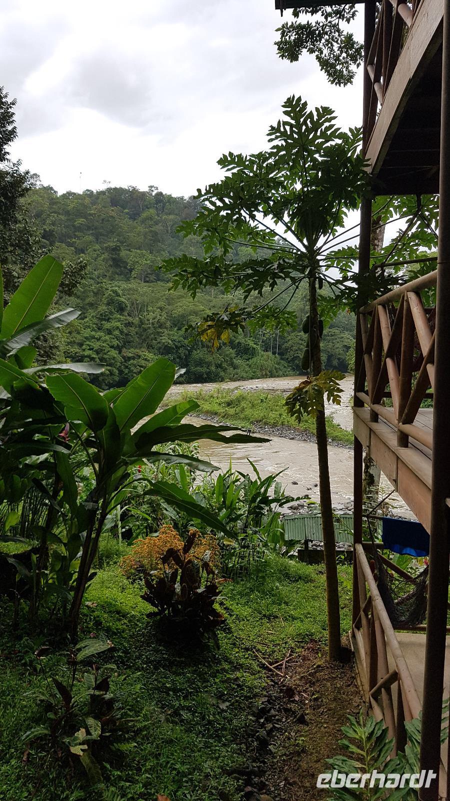 Neben den wilden Stellen im Paguare Fluss gab es auch ruhige und an einer solchen ruhigen Sandbank gingen wir an Land. Ein Boot wurde umgedreht und diente als Tisch. Während Ivan und Walter für uns das Picknick herrichteten, ging Jorge mit uns zu einem kleinen Fluss, erklärte uns das farbige Sedimentsgestein und weiter oben in einem kleinen Becken konnten wir schwimmen. Wieder zurück, liessen wir uns das Picknick schmecken, denn Rafting macht hungrig. Danach wurde alles zusammen gepackt und wir befuhren weiter den Paguare Fluss bis zu unserer Rios Tropicales Lodge. Dort gingen wir an Land, hingen die Helme und Rettungswesten auf eine schon vorbereitete Leine und nahmen die Schlüssel für unsere Unterkunft entgegen. Die Lodge lag direkt am Fluss und die hübschen Zimmer in dieser Wildnis waren eine echte Überraschung. Wir brachten nur das Gepäck in die Zimmer und wer noch Lust und Laune hatte, nahm an einer Regenwaldwanderung mit Ziel Wasserfall teil. Es war wieder sehr interessant und im Wassenfall konnten wir auch schwimmen. Beim Abfluss eines zweiten Wasserfalls war ein kleiner Generator installiert, der den Strom für die gesamte Lodge erzeugte. Wir zogen uns trockene Sachen an und trafen uns dann auf einen Welcome Drink auf der überdachten Terrasse. Dort blieben wir dann auch sitzen bis zum Abendessen und sahen unseren Bootsführern zu, wie sie unser Essen vorbereiteten. Einfach genial - diese Männer !